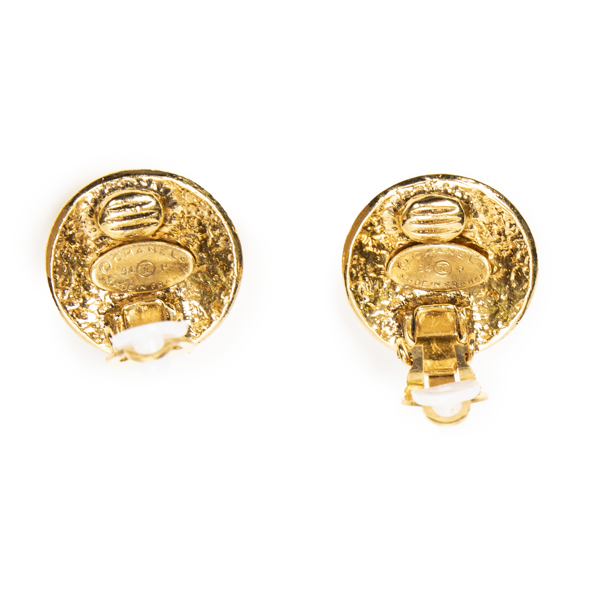 Chanel boucles d’oreilles CC Round Clip On Earrings en or et plaqué or. Le produit est en Excellent état (A).