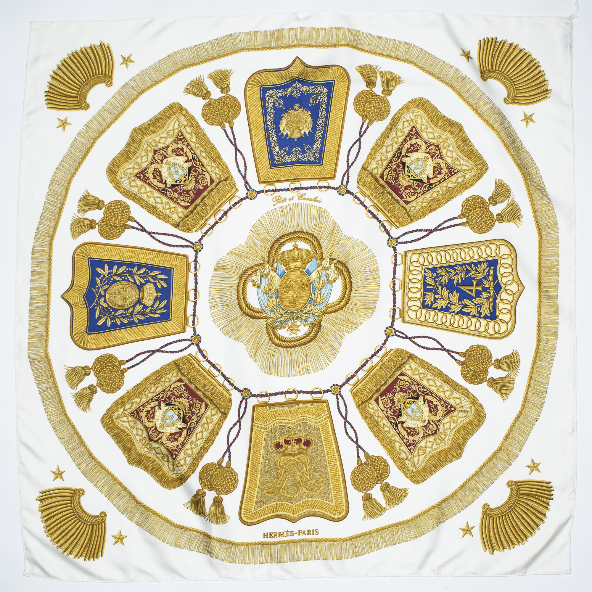 Hermès Écharpe Scarf Poste et Cavalerie by Joachim Metz en Blanc/Or/Bleu marine et . Le produit est en Parfait état (AA).