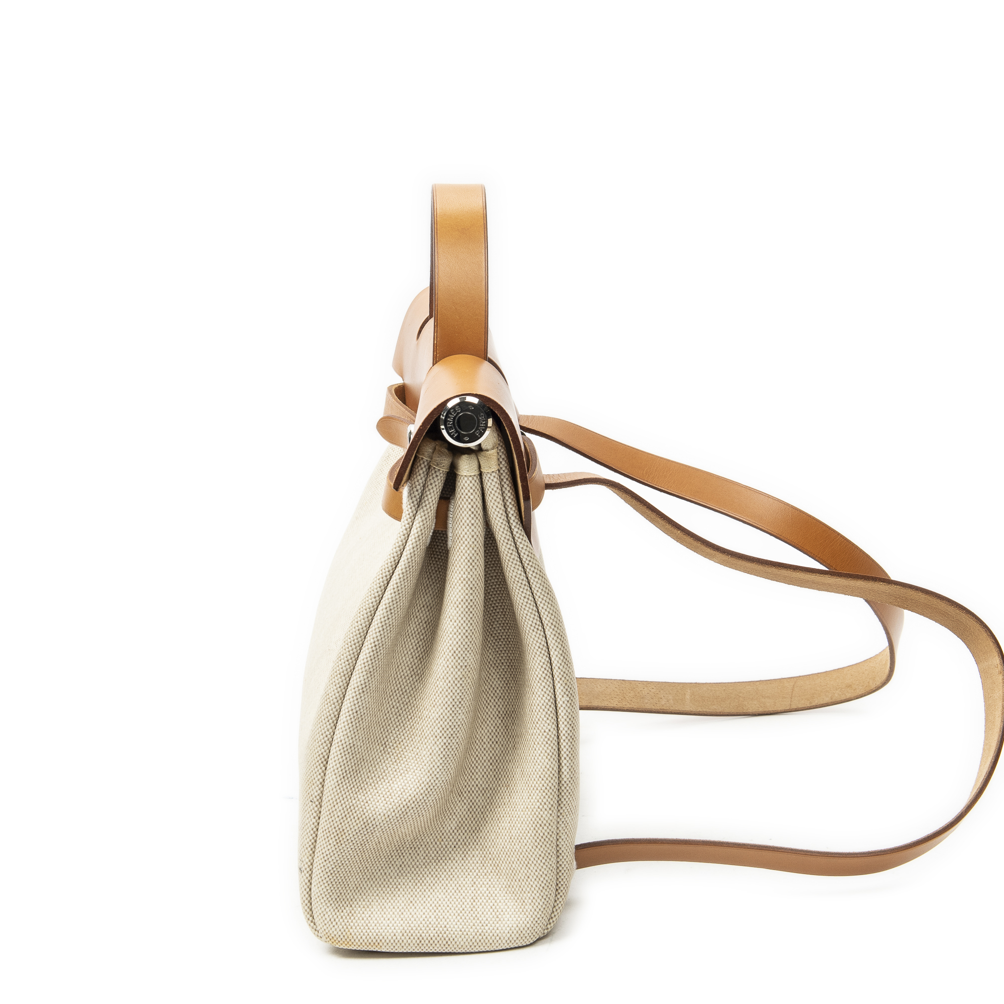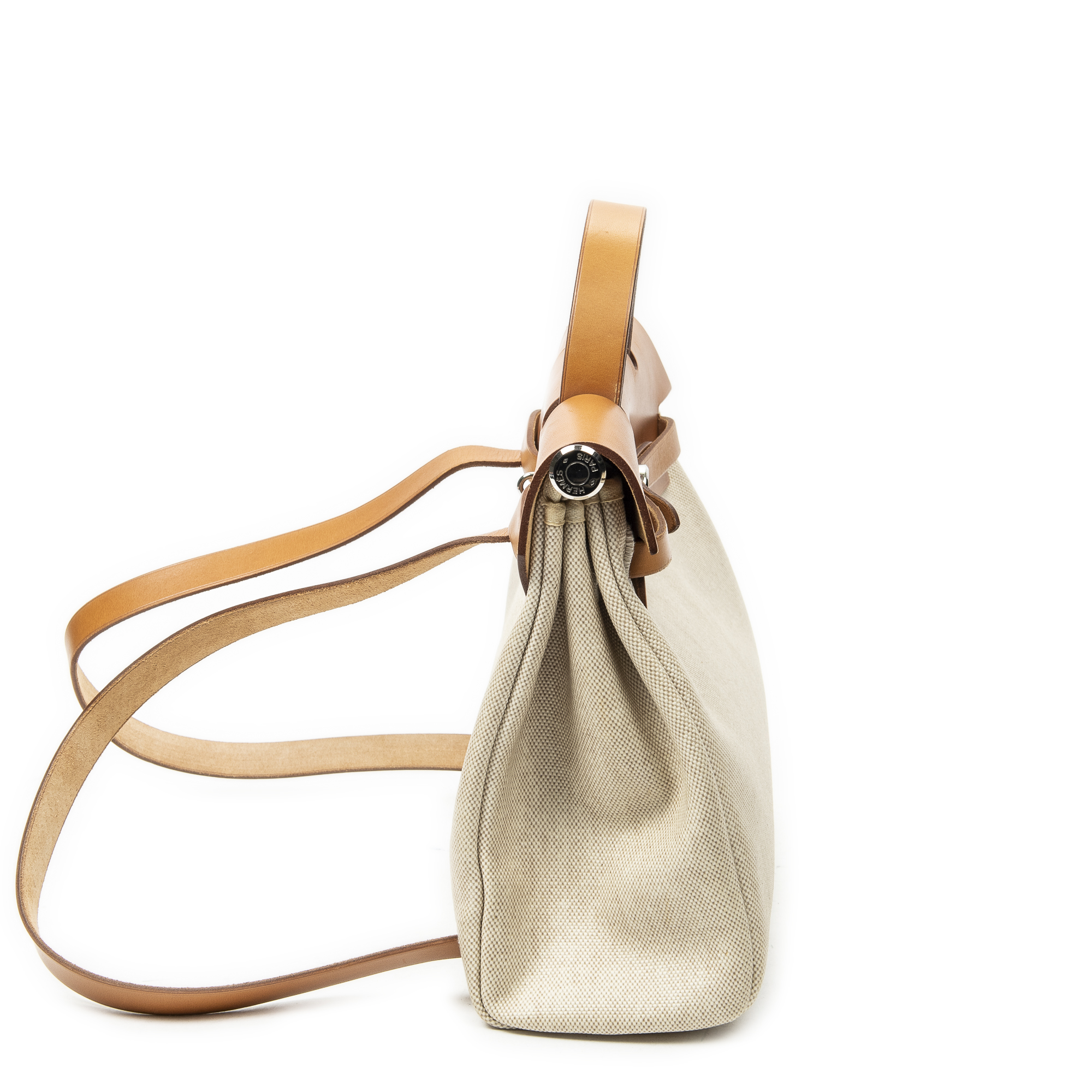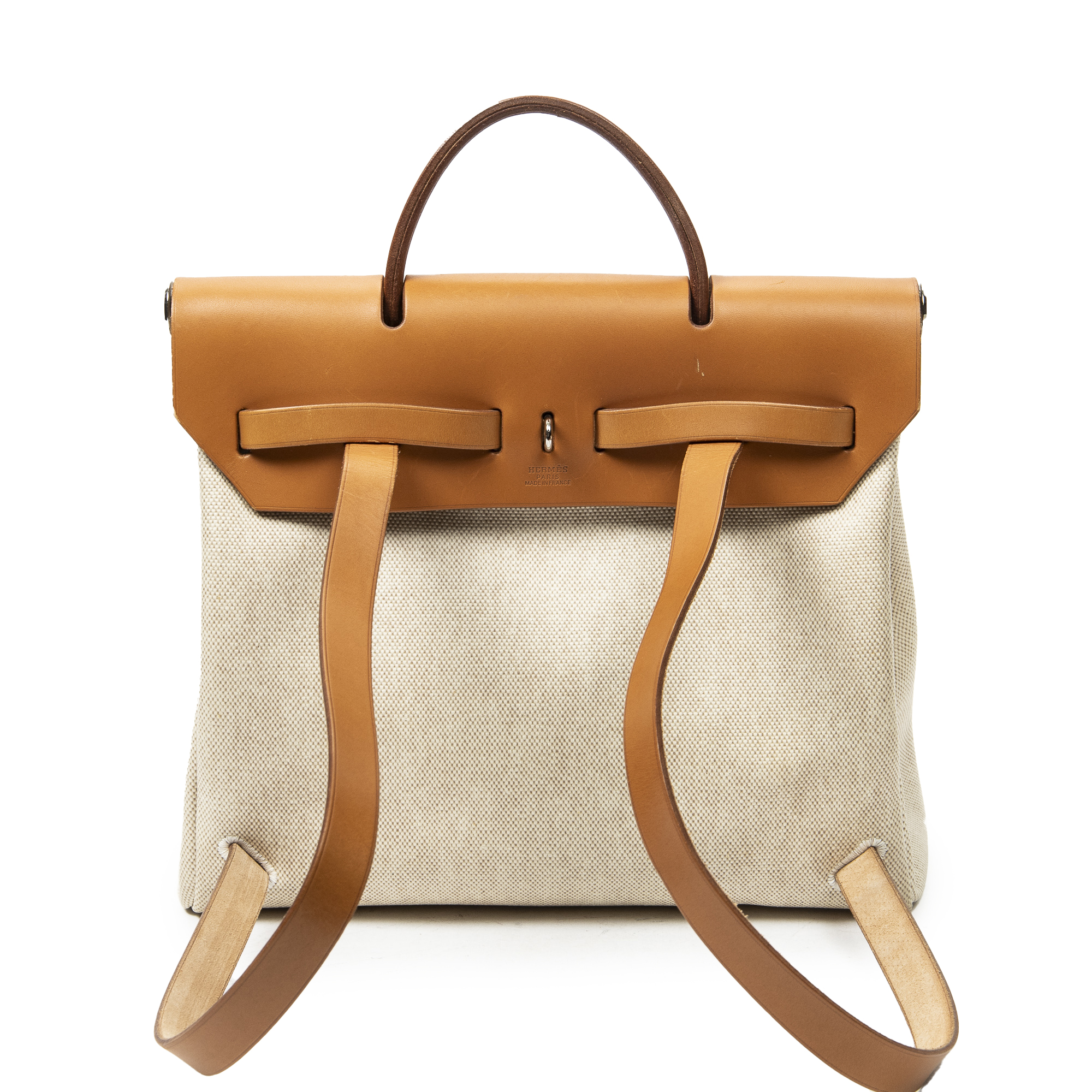 Hermès sac à dos Herbag a Dos PM en Tan et Pallade. Le produit est en Excellent état (A).