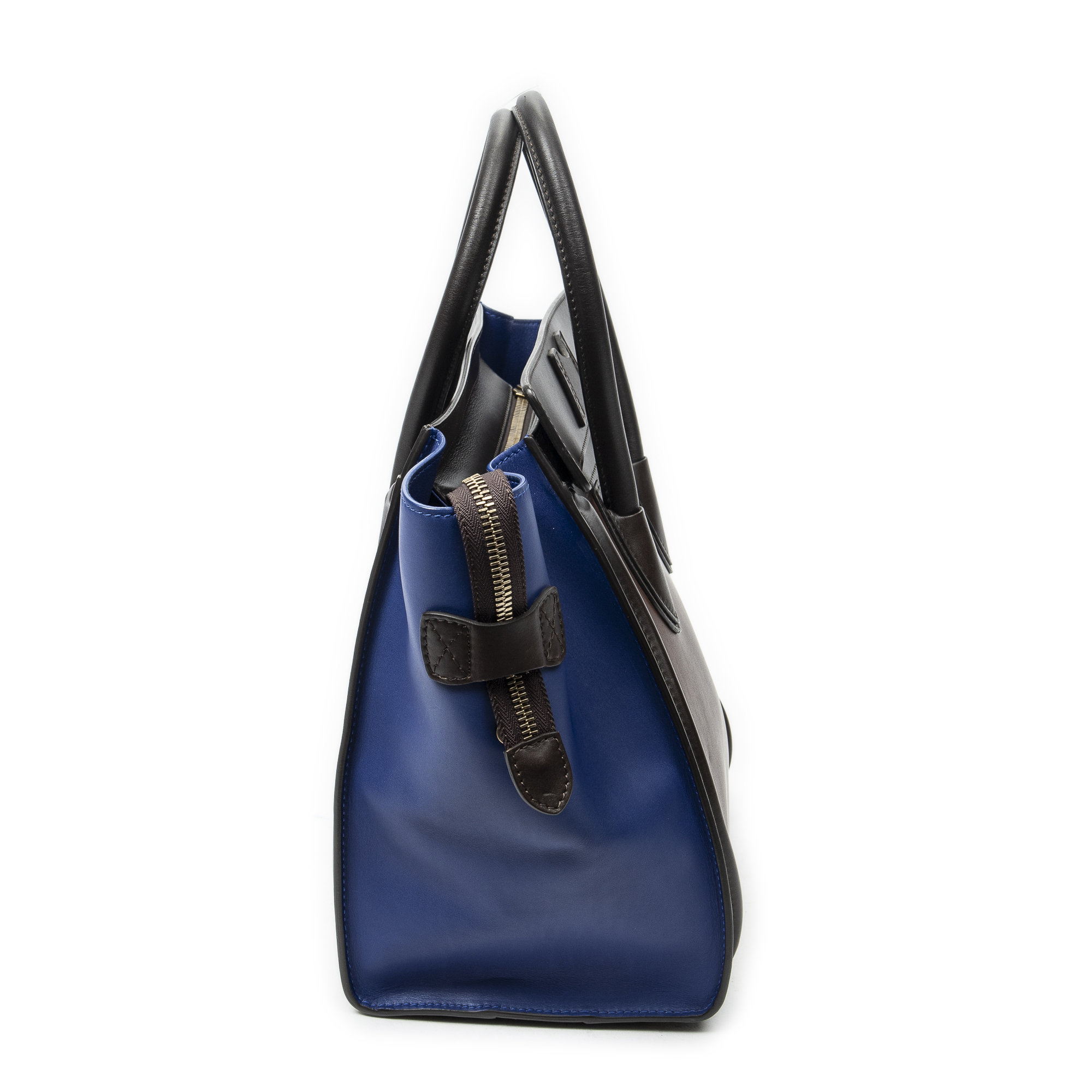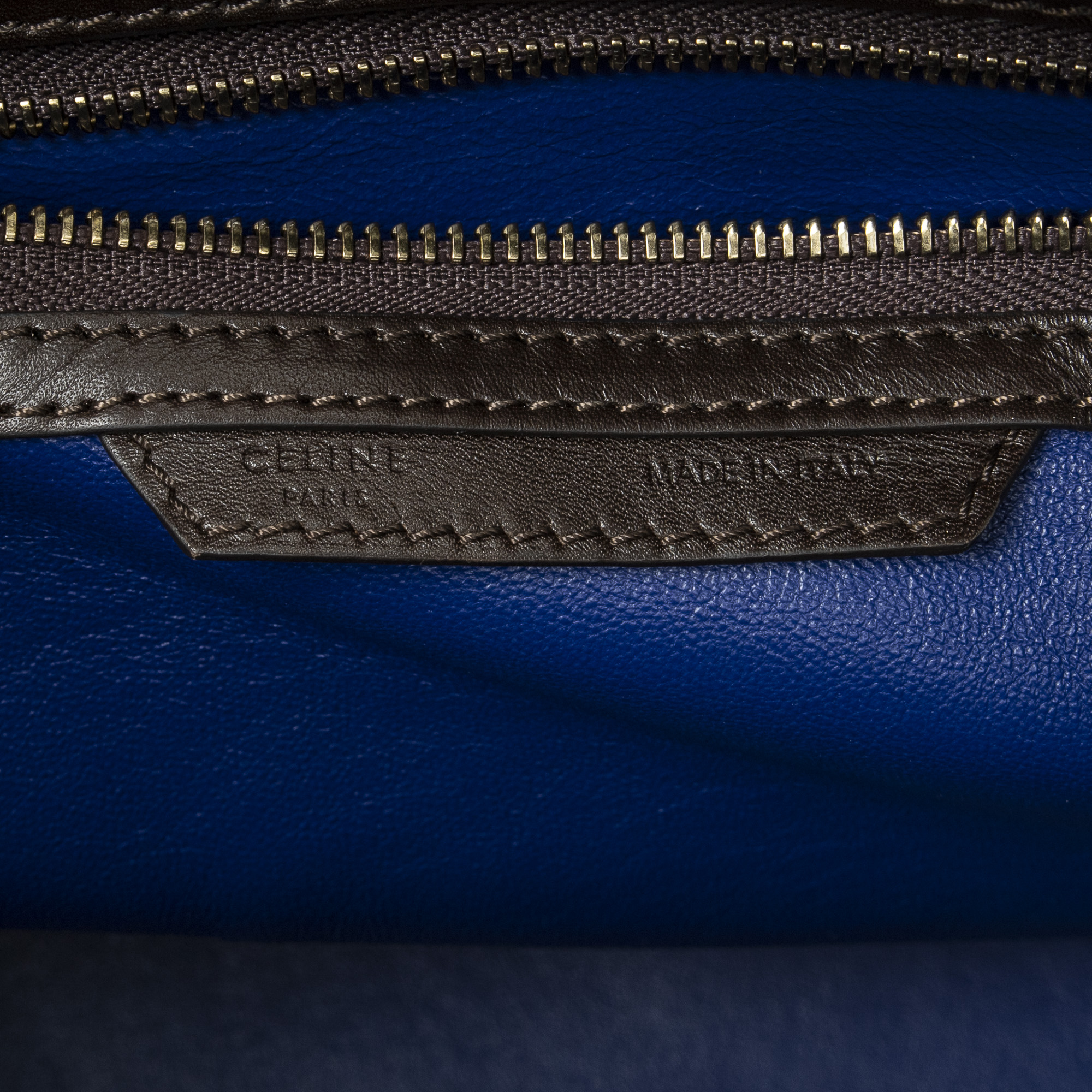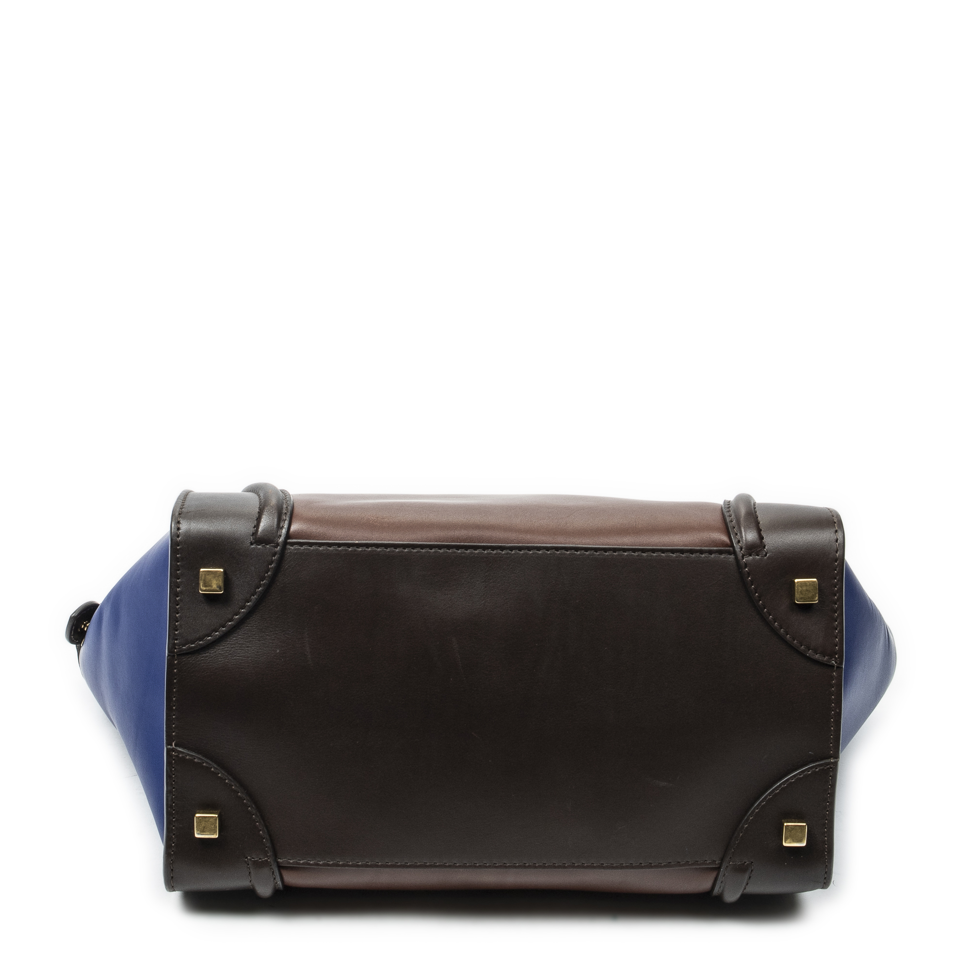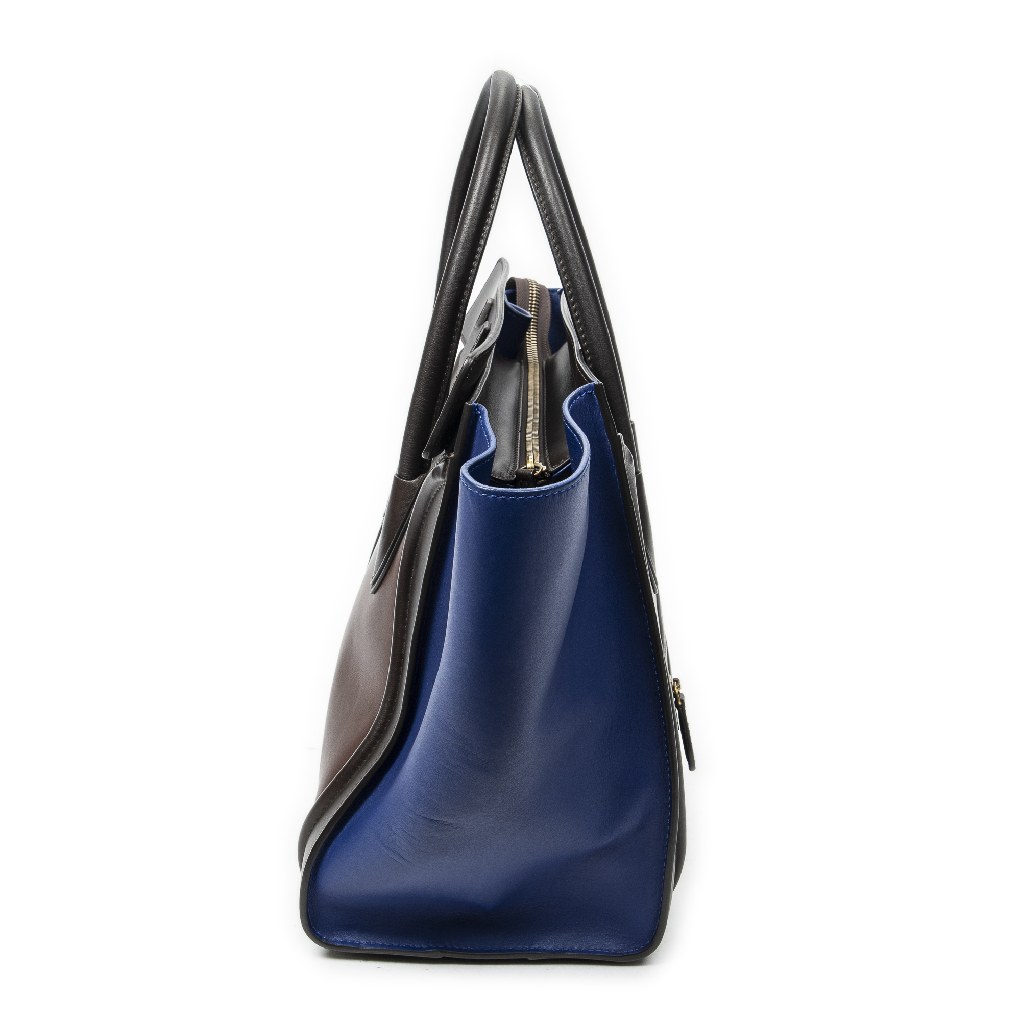 Celine Sac à main Medium Tricolor Luggage en Du cuir de veau brun et or. Le produit est en Excellent état (A).