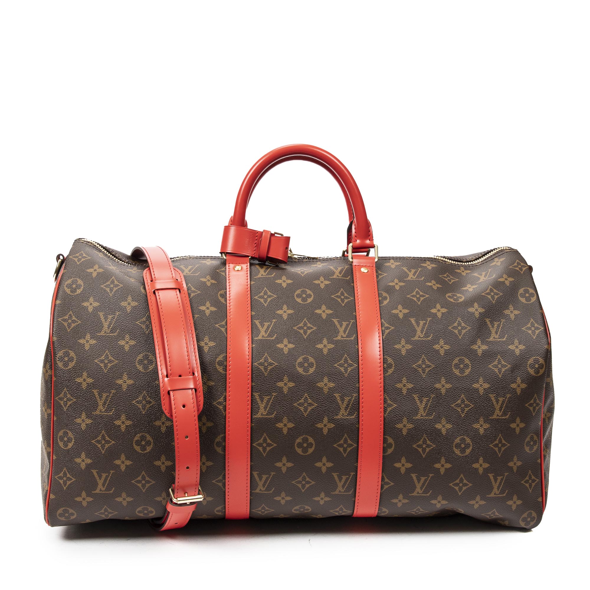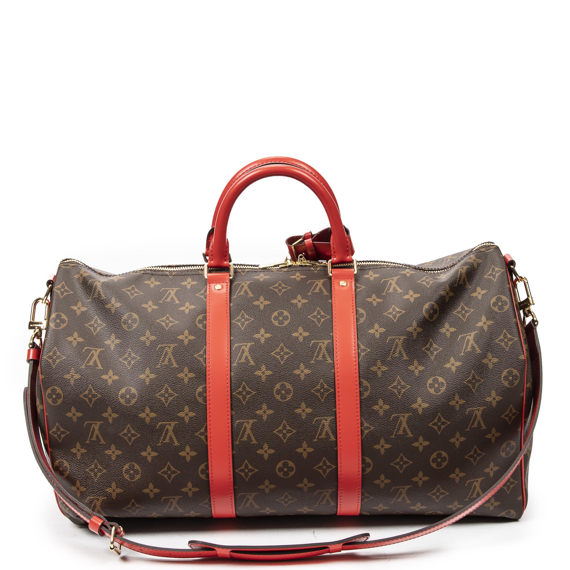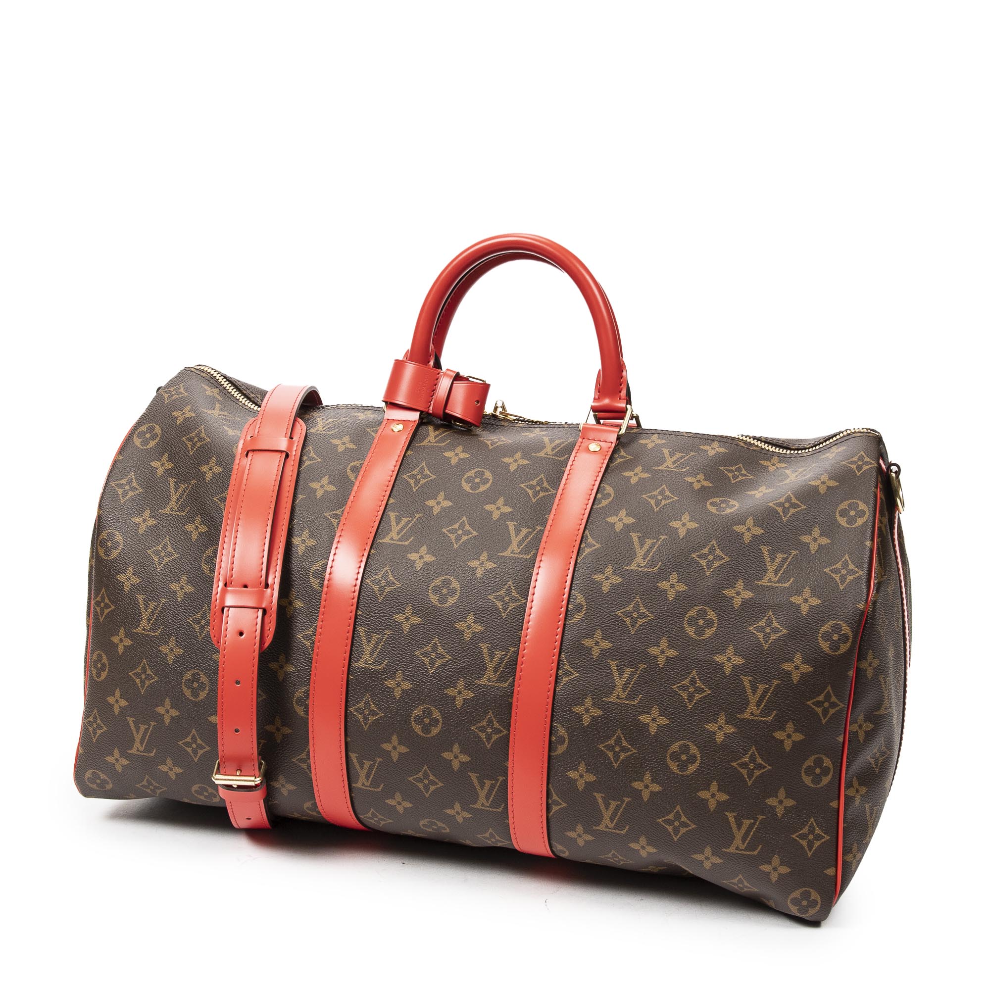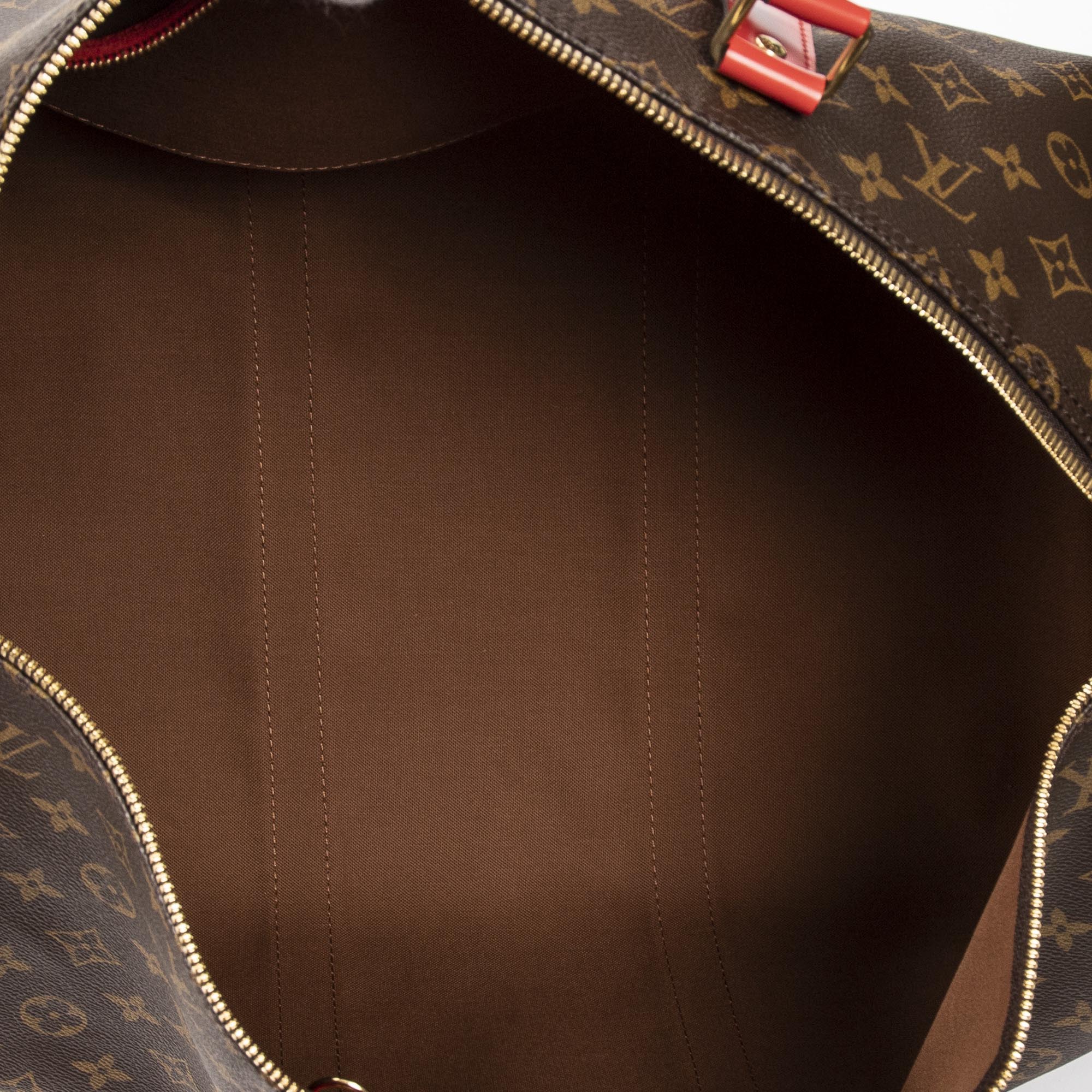 Louis Vuitton Sac de voyage Ltd. Ed. Summer Edition Keepall Bandouliere 50 en Marron/Rouge et Cuivre d’Or. Le produit est en Parfait état (AA).