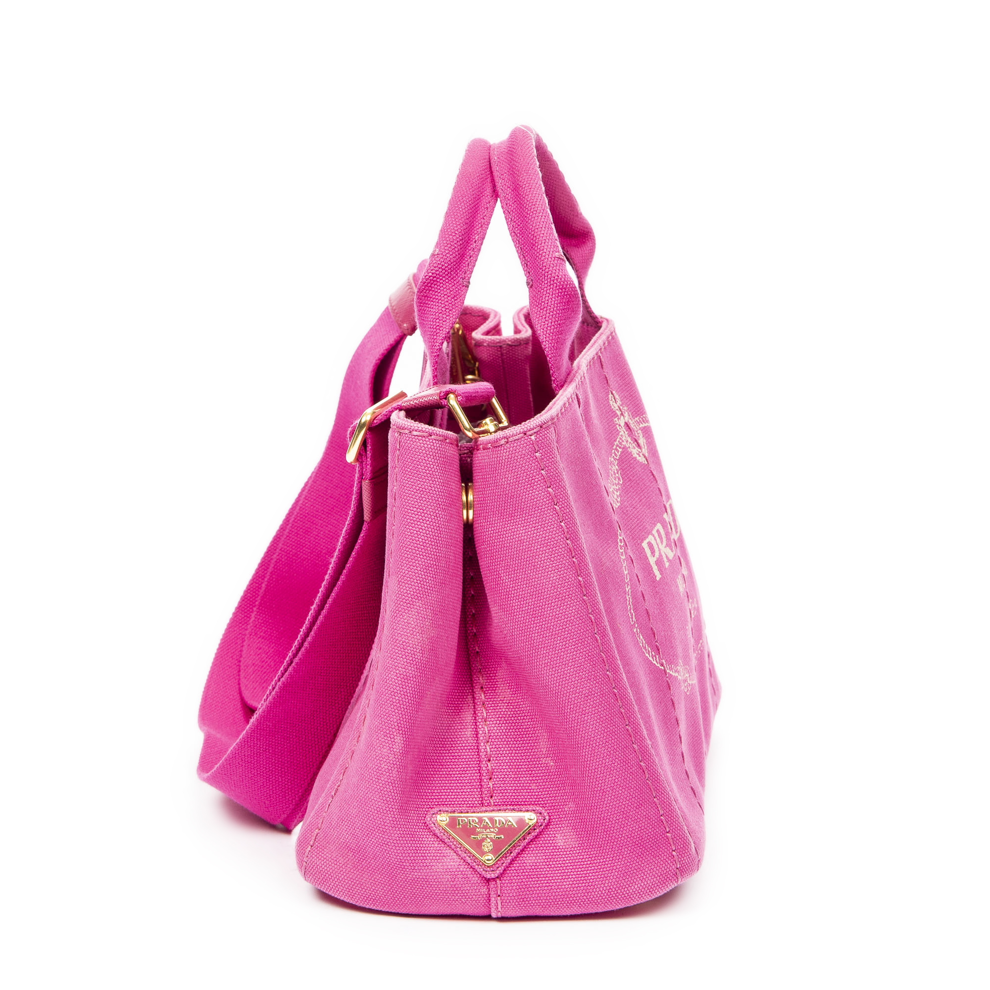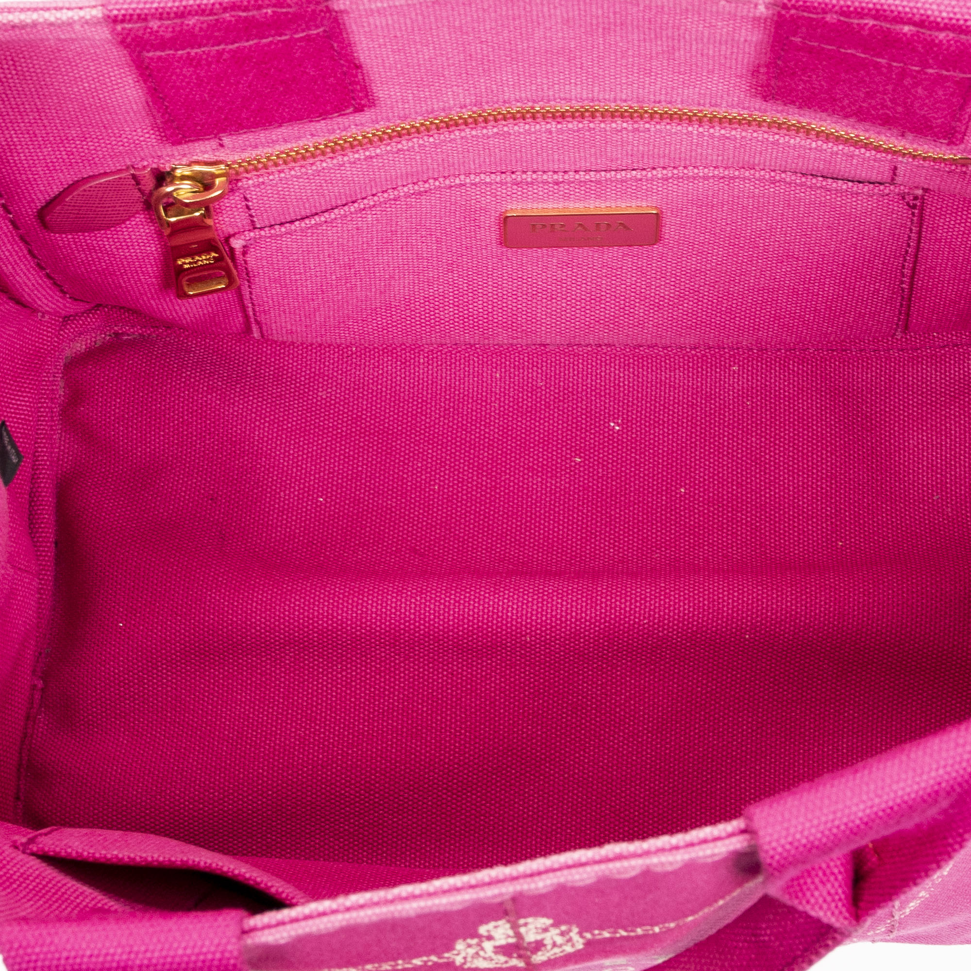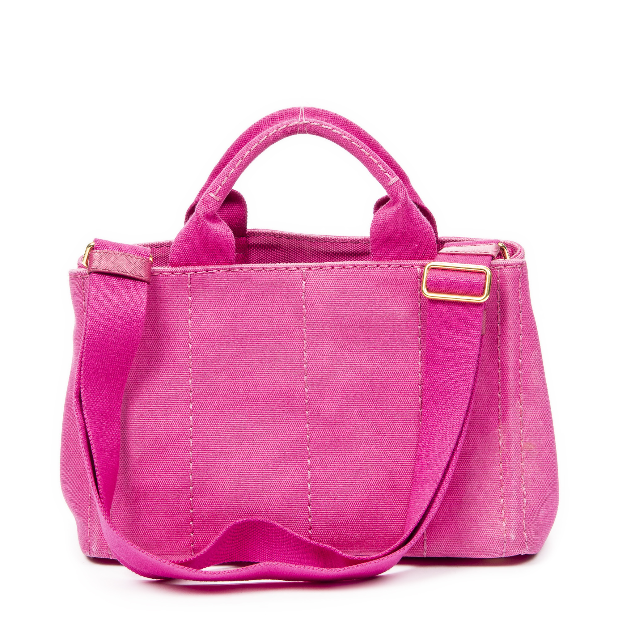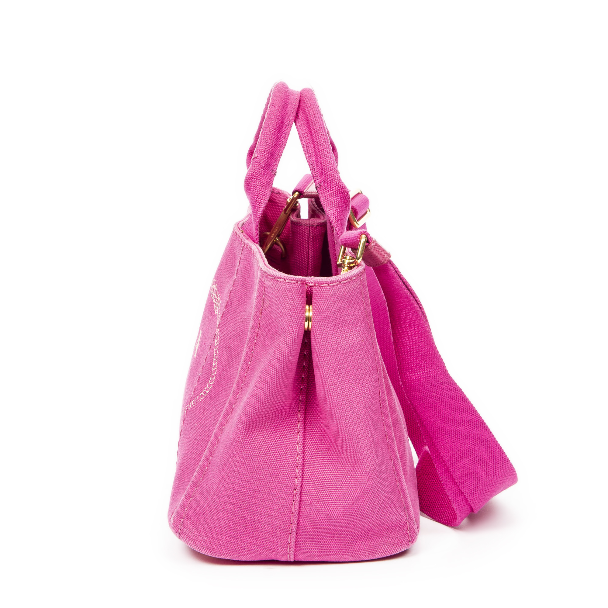 Prada Sac à main Small Canapa Tote en Fuchsia Pink et Gold. Le produit est en Excellent état (A).