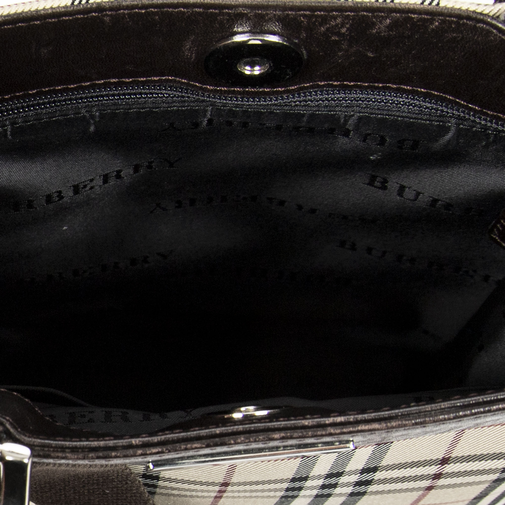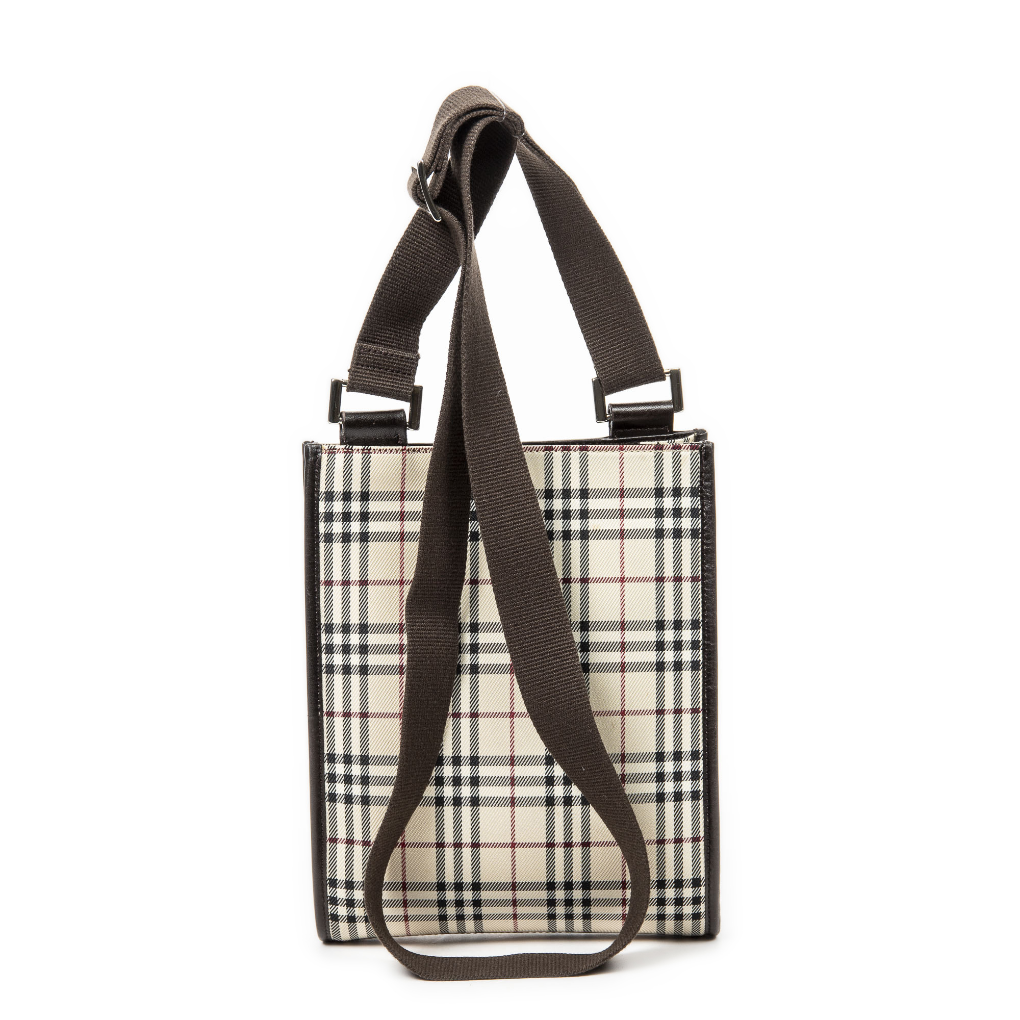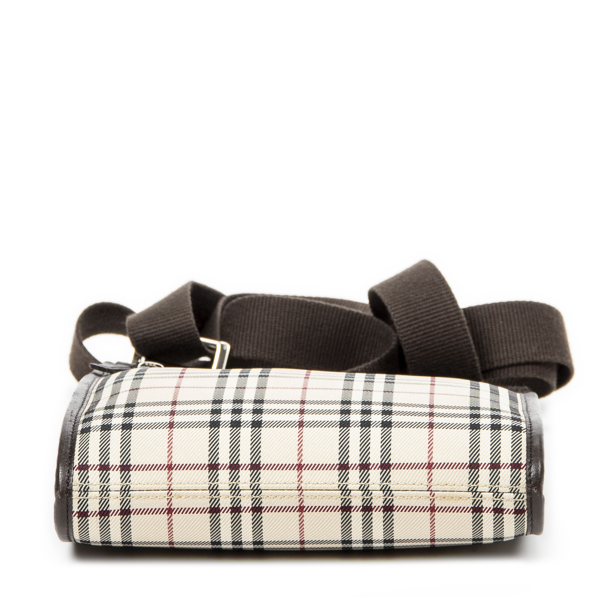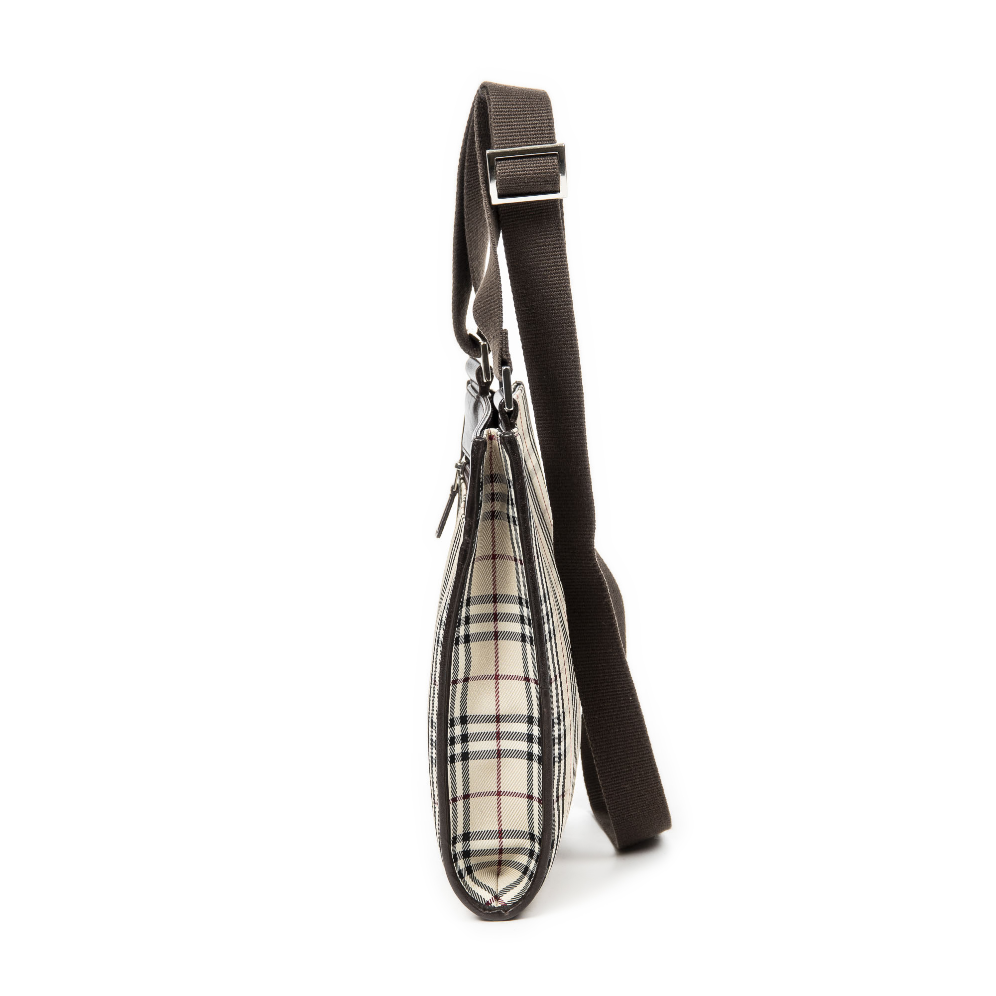 Burberry Sac à bandoulière Vertical Crossbody en Beige/Marron foncé et Argent. Le produit est en Très Bon état (AB).