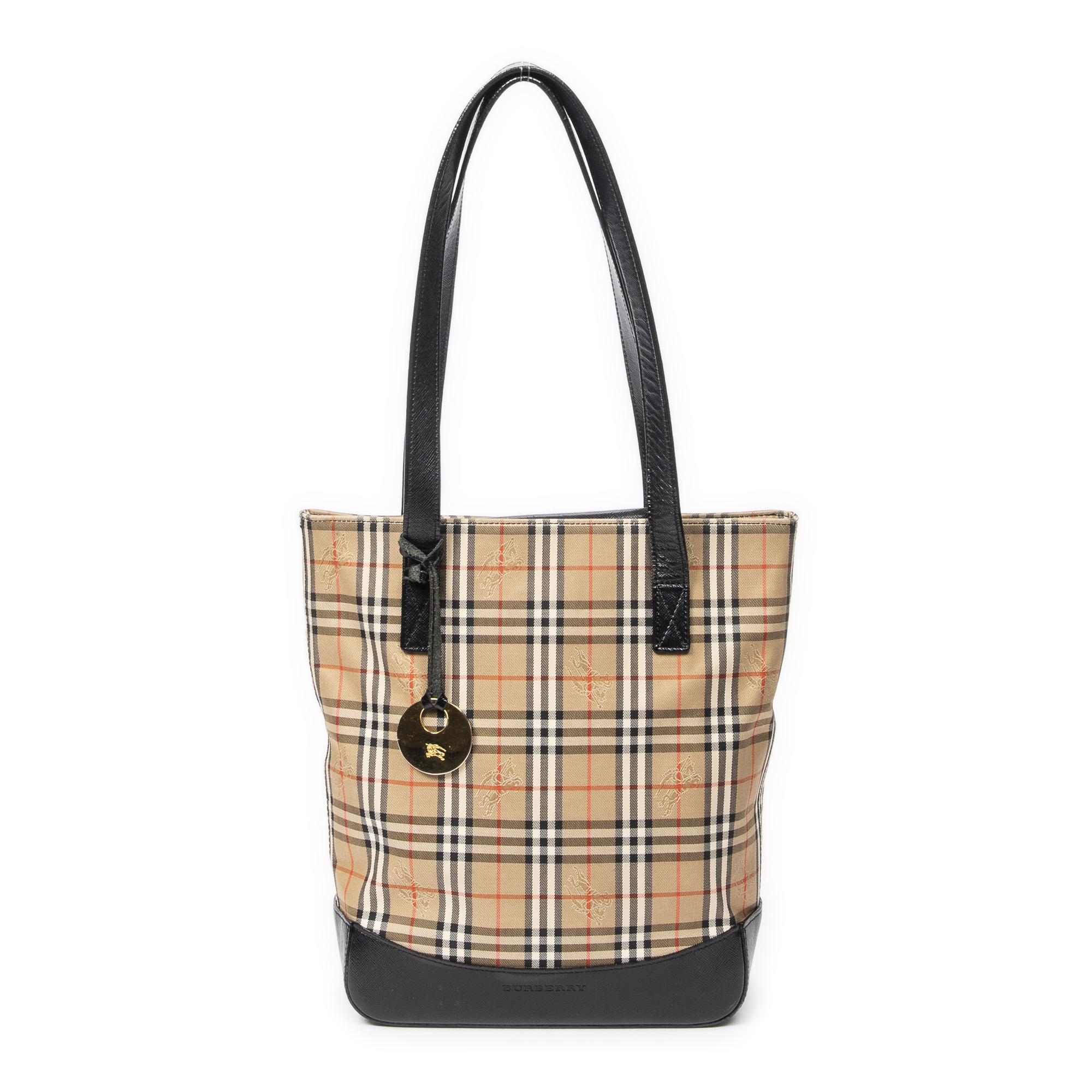 Burberry Sac à bandoulière Vertical Tote en Beige/Noir et Gold. Le produit est en Excellent état (A).
