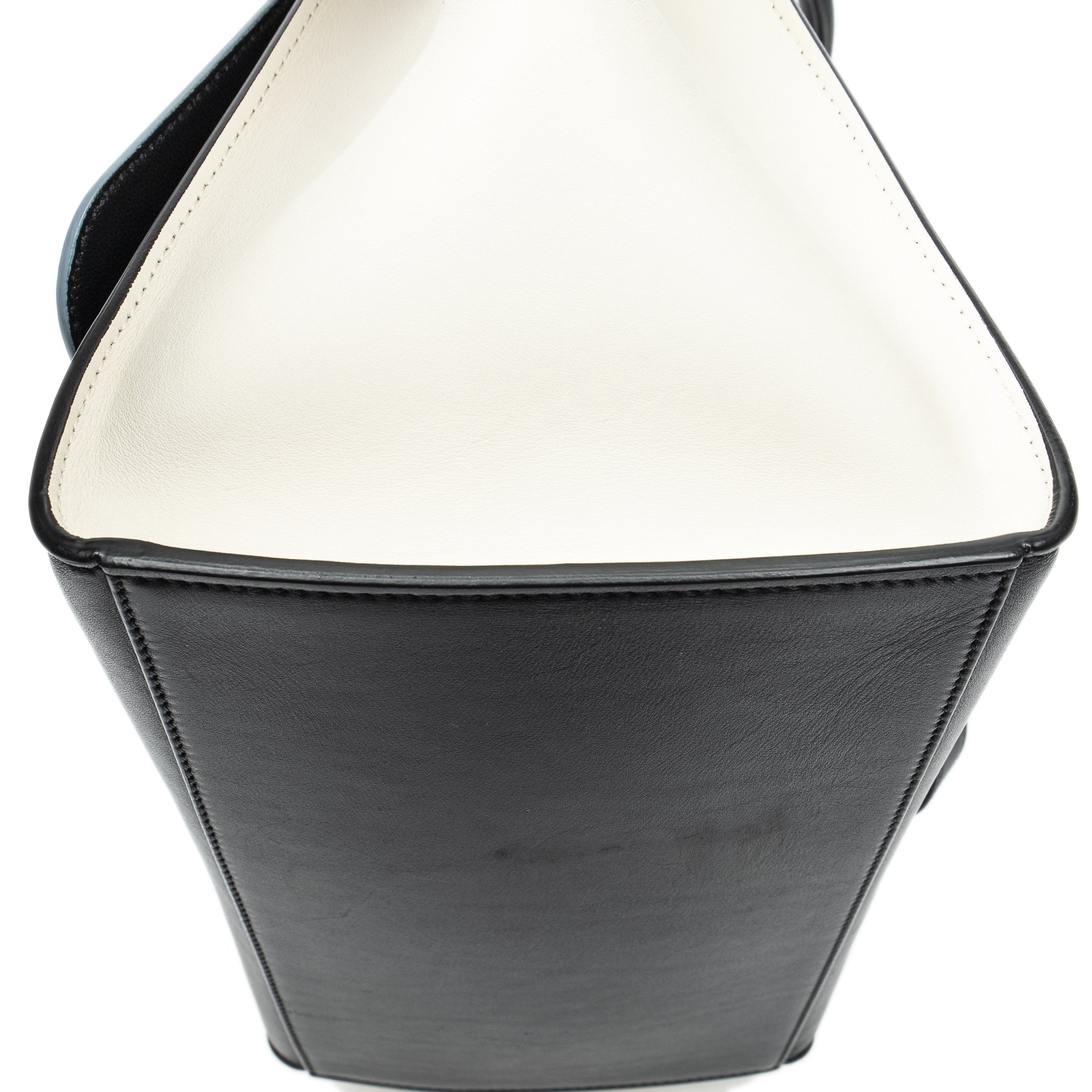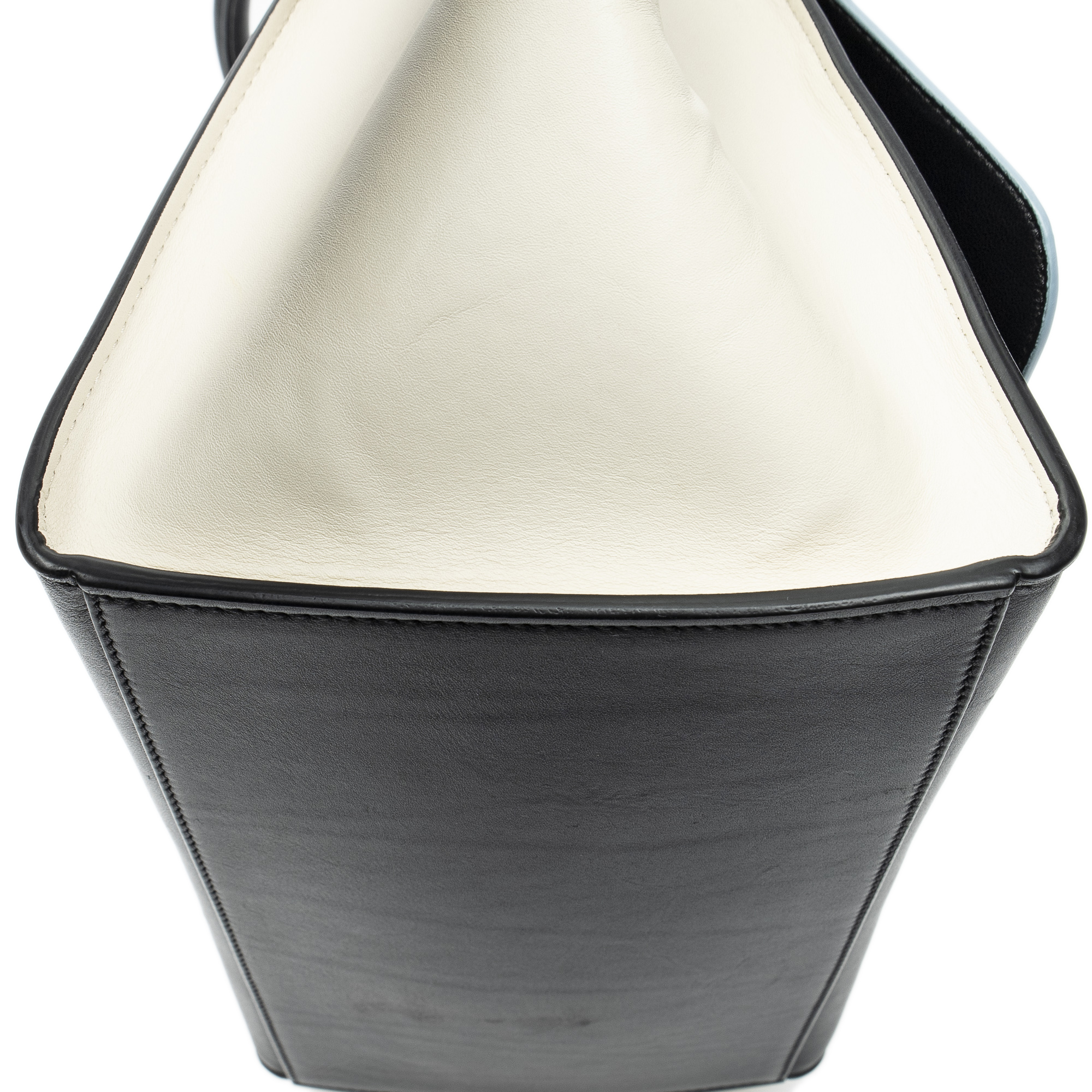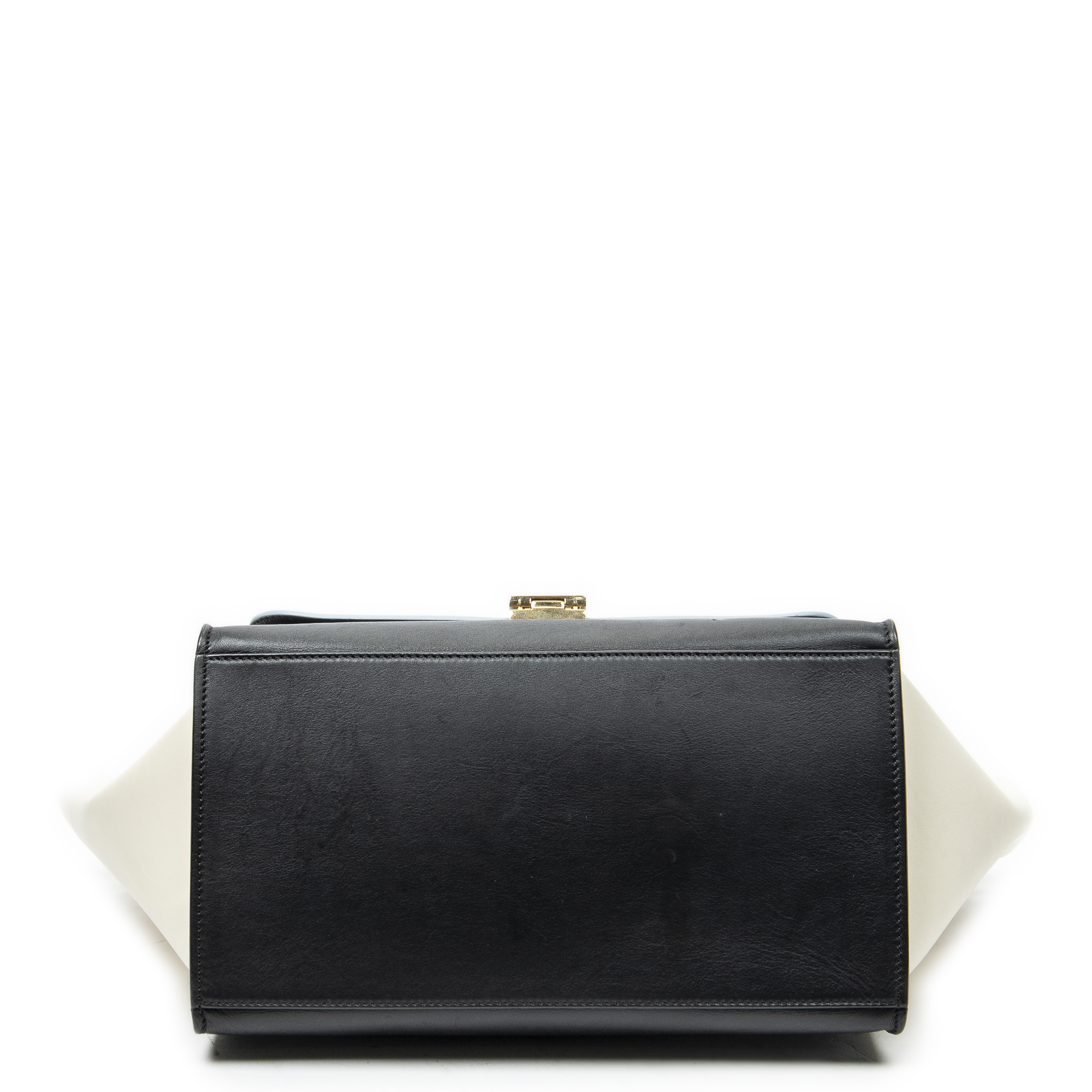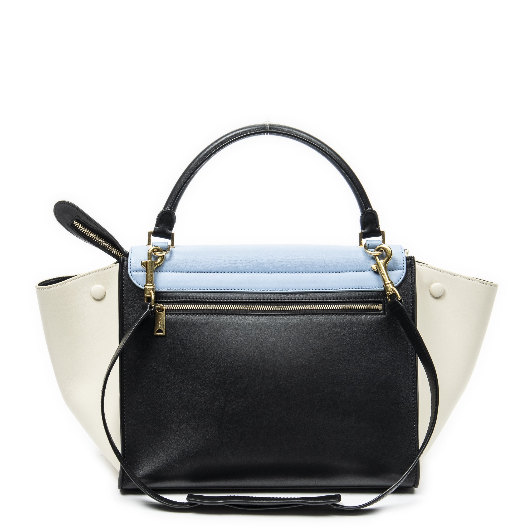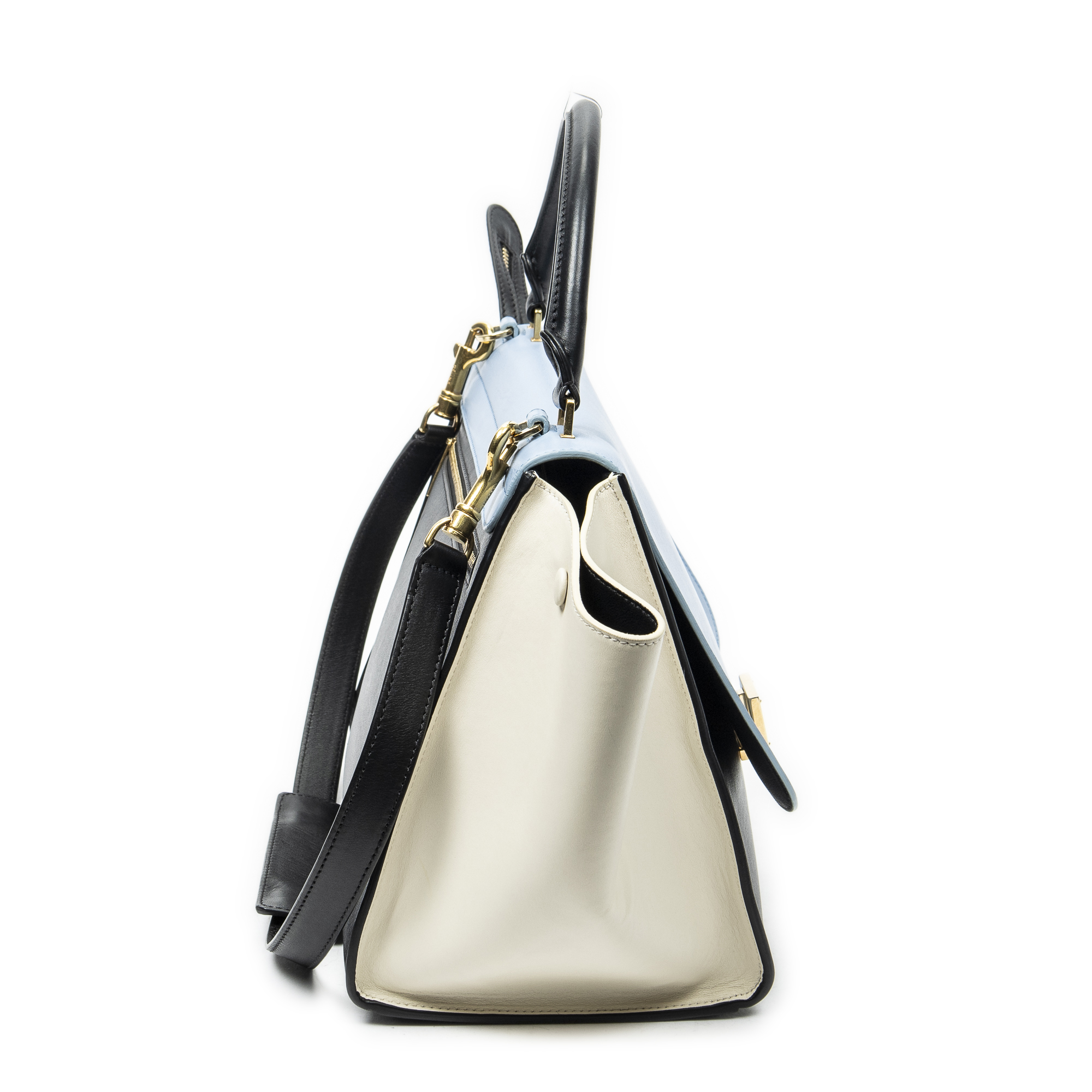 Celine Sac à bandoulière Medium Tricolor Trapeze en Du cuir de veau Bleu clair/Ivoire/Noir et Gold. Le produit est en Excellent état (A).