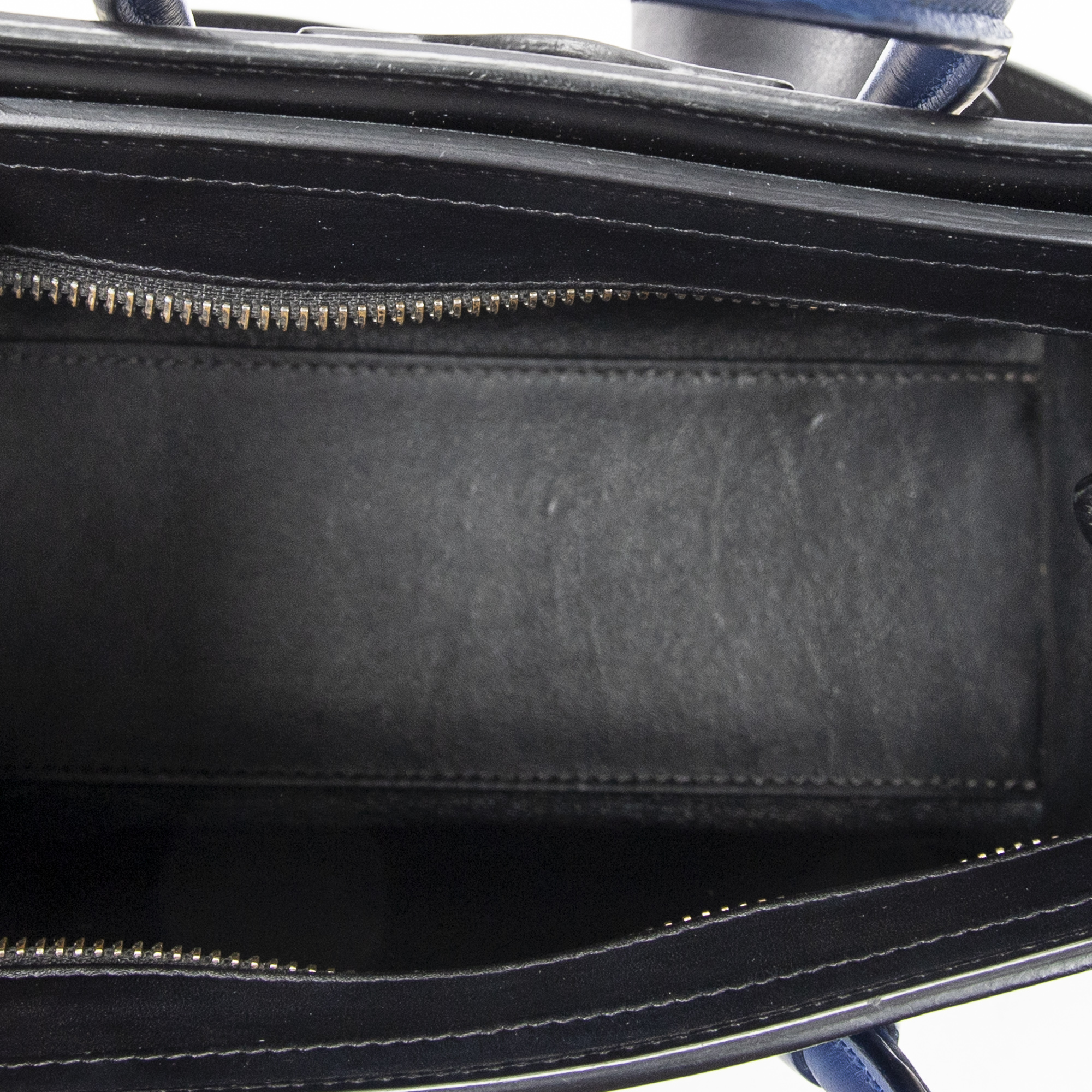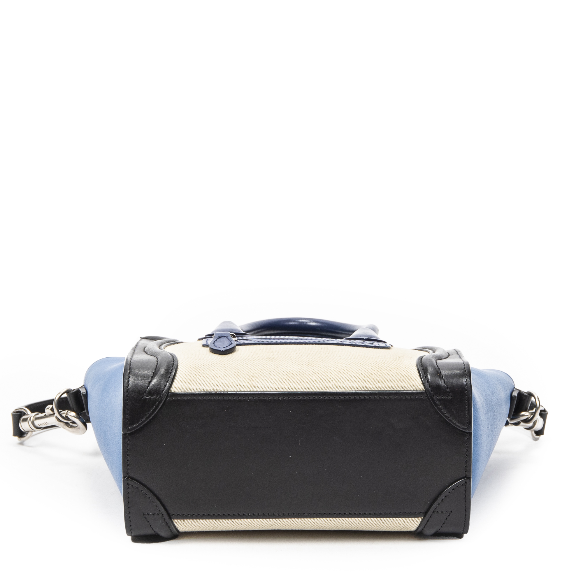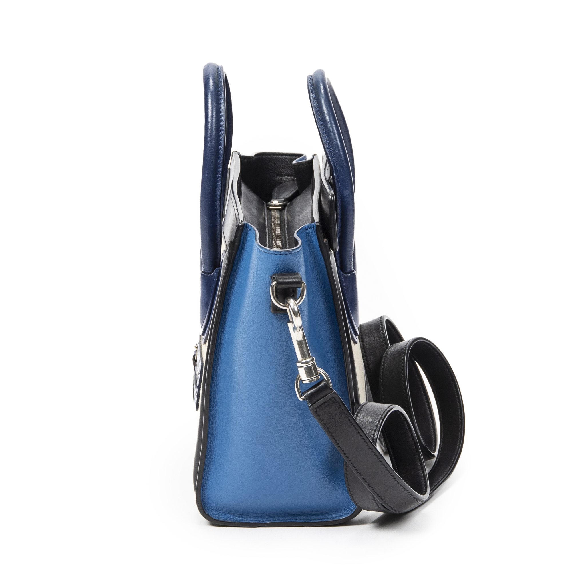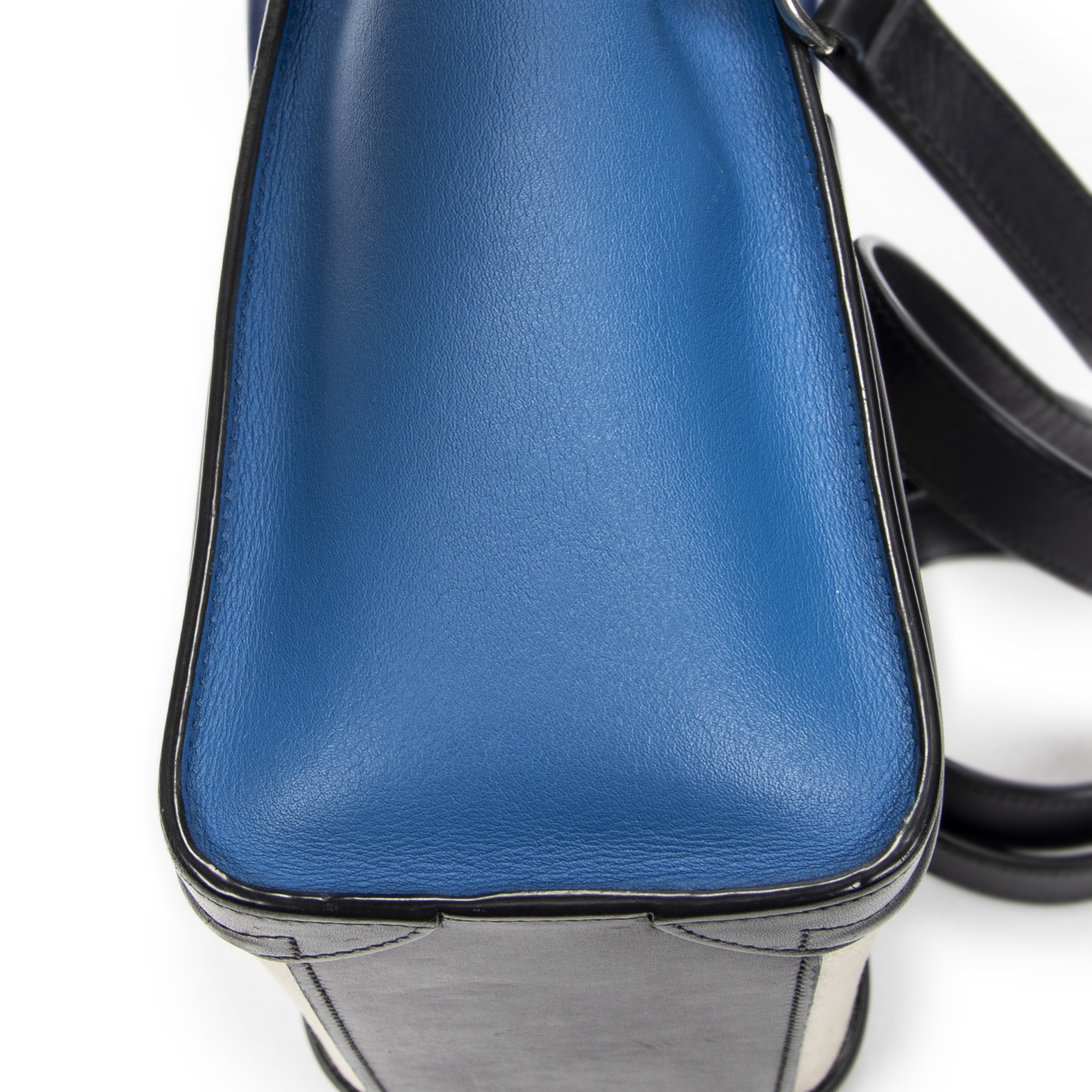 Celine Sac à bandoulière Nano Tricolor Luggage en Du cuir de veau Bleu/Noir/Beige et Argent. Le produit est en Excellent état (A).