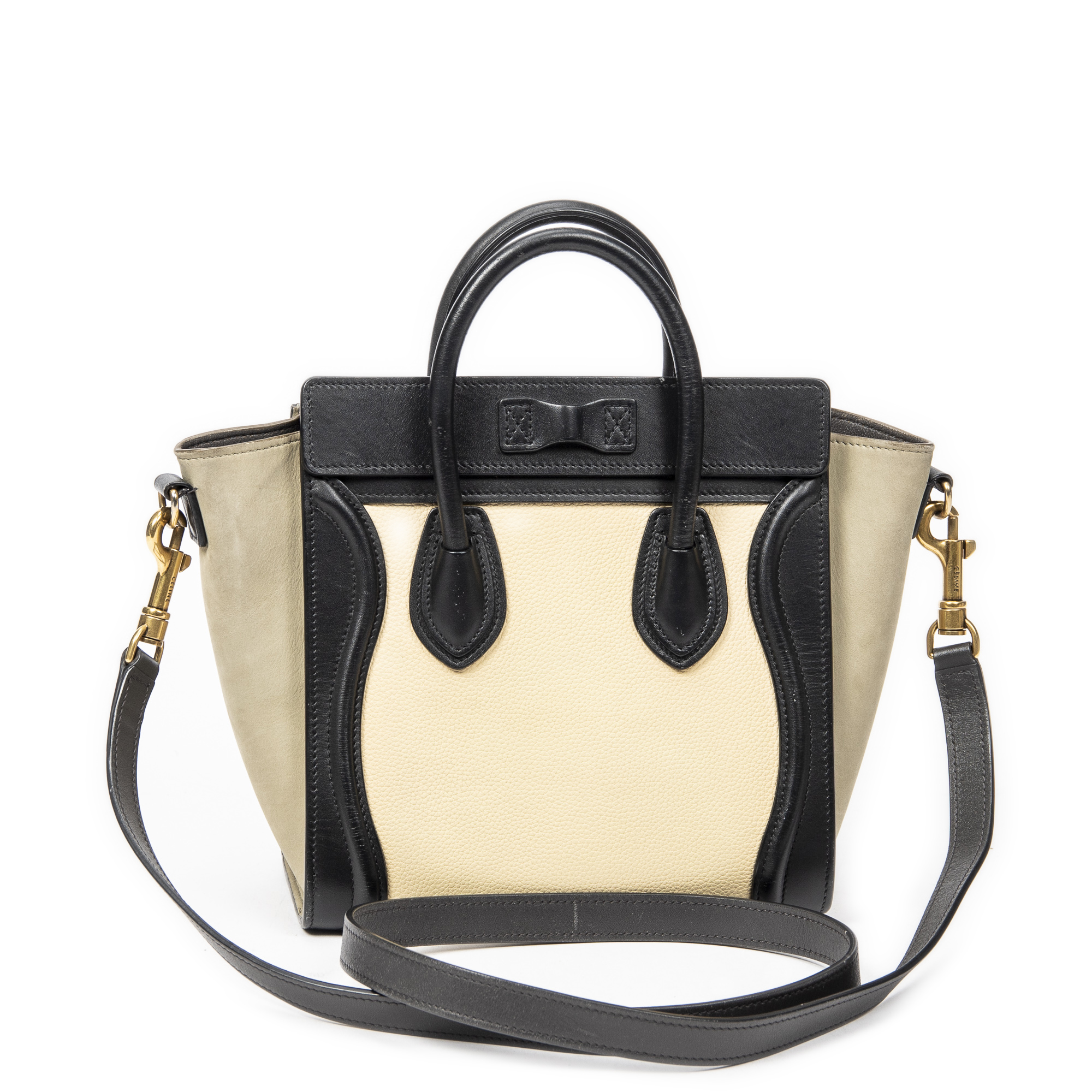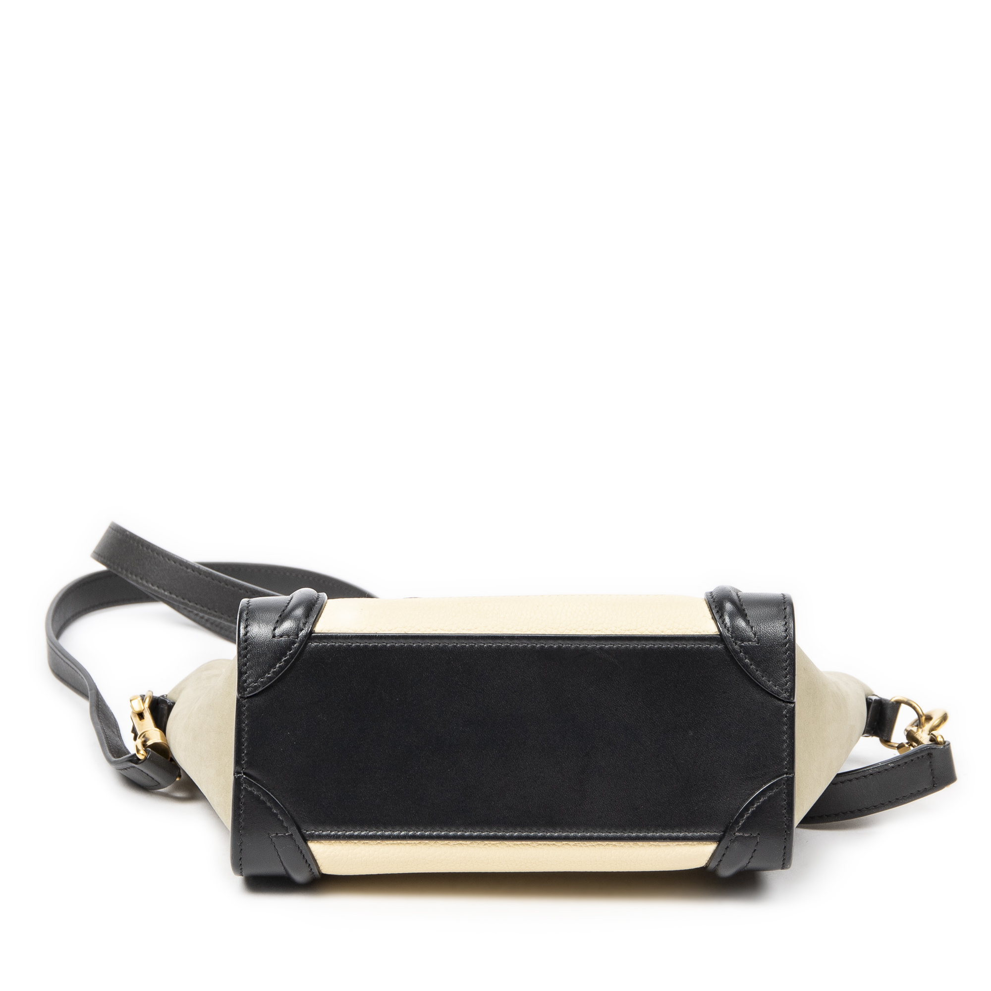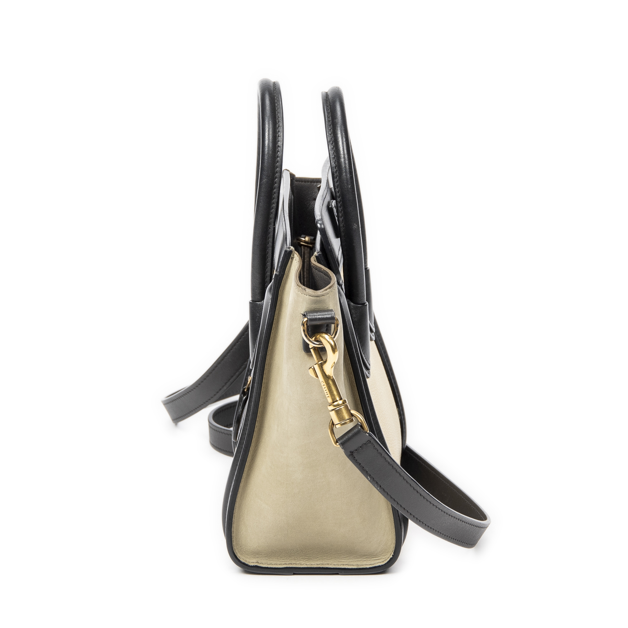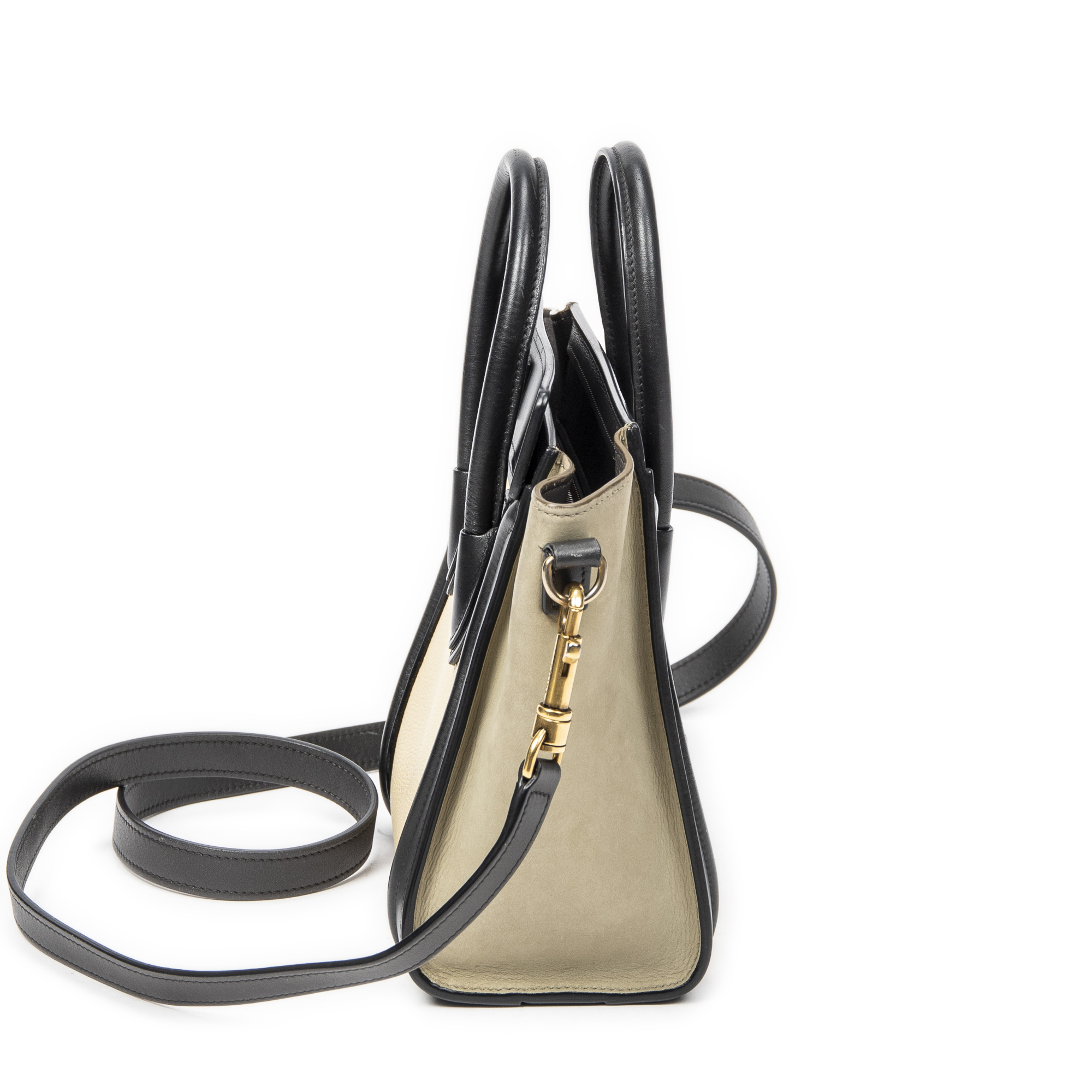 Celine Sac à bandoulière Nano Tricolor Luggage en Du cuir de veau Noir/Beige/Vert clair et Gold. Le produit est en Excellent état (A).