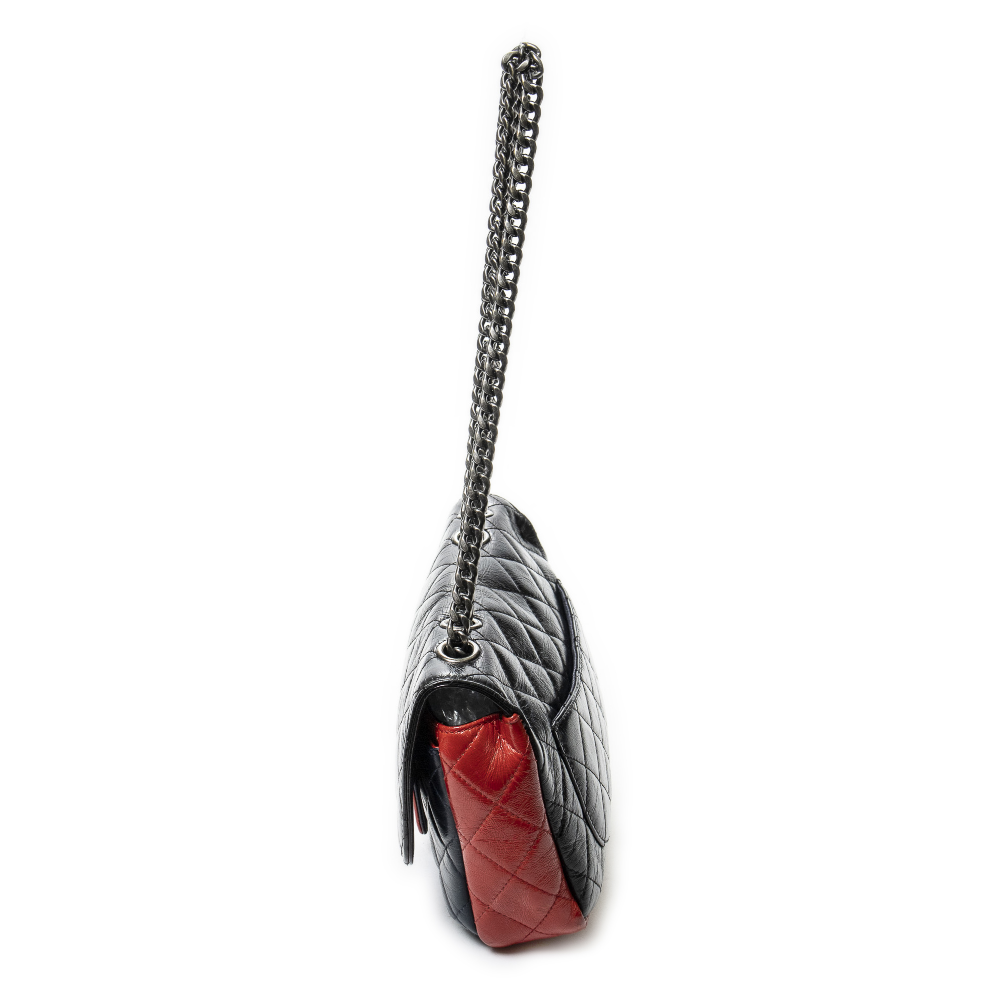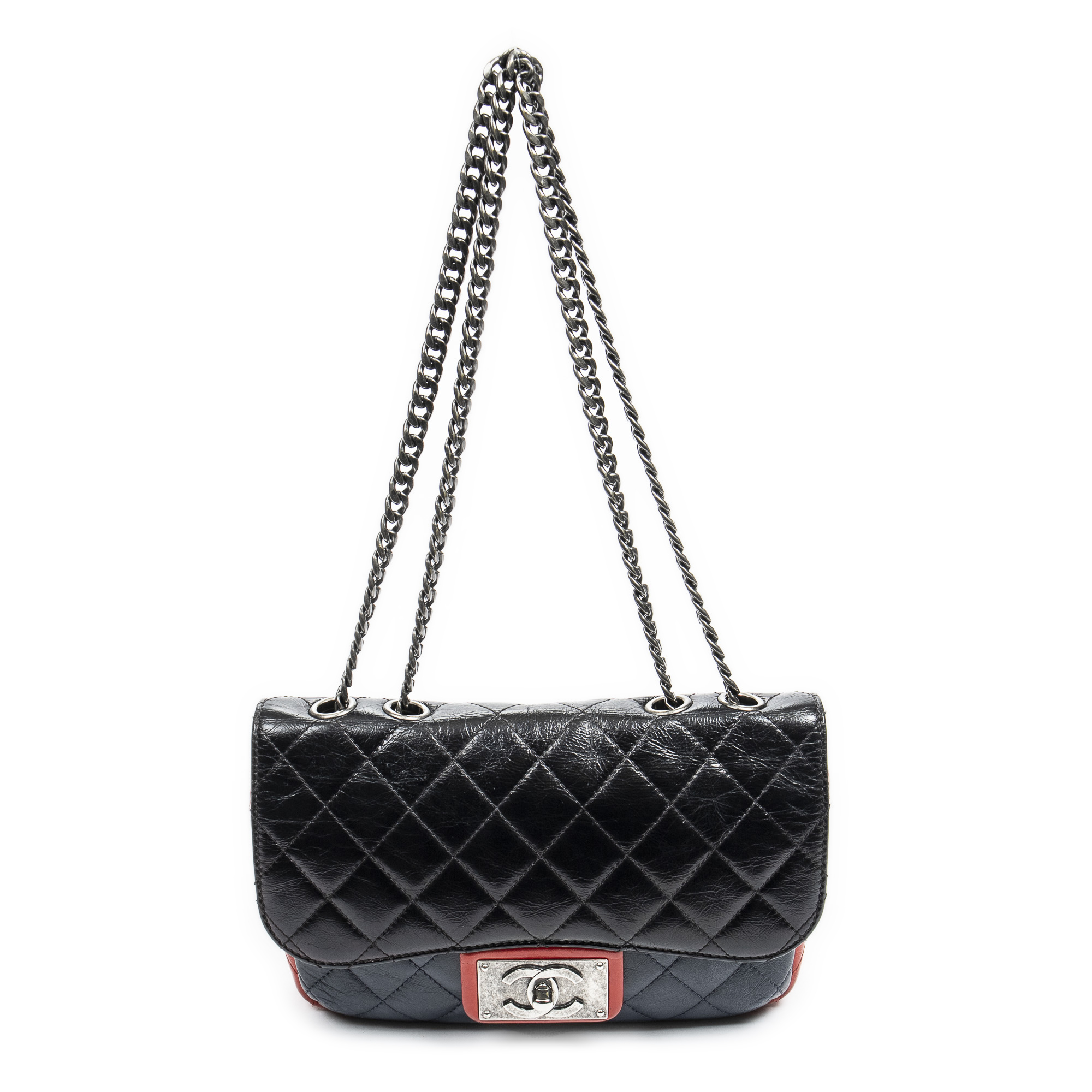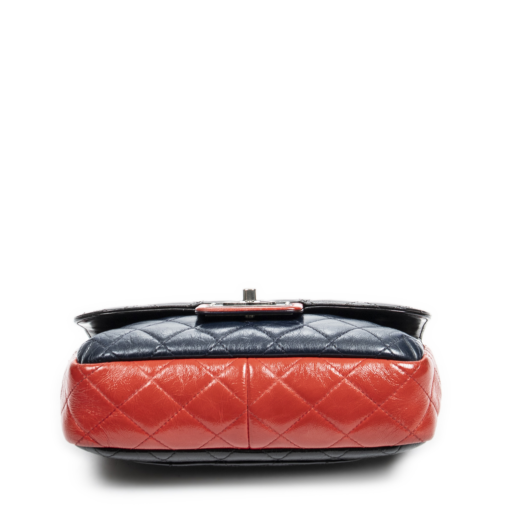 Chanel Sac à bandoulière CC Tricolor Plate Flap en Noir/Rouge/Bleu marine et Argent. Le produit est en Excellent état (A).