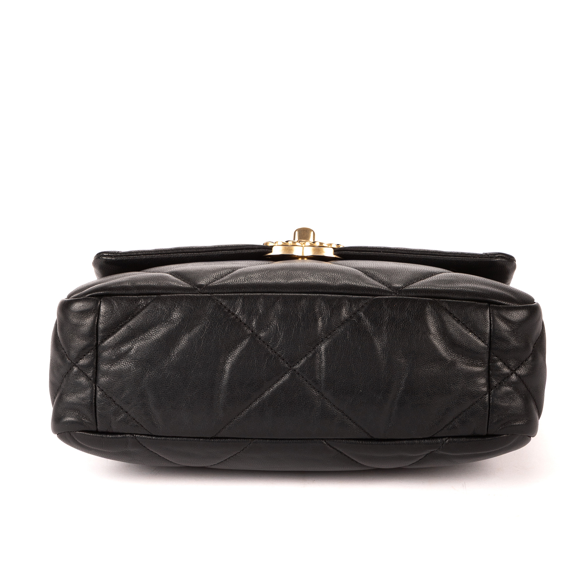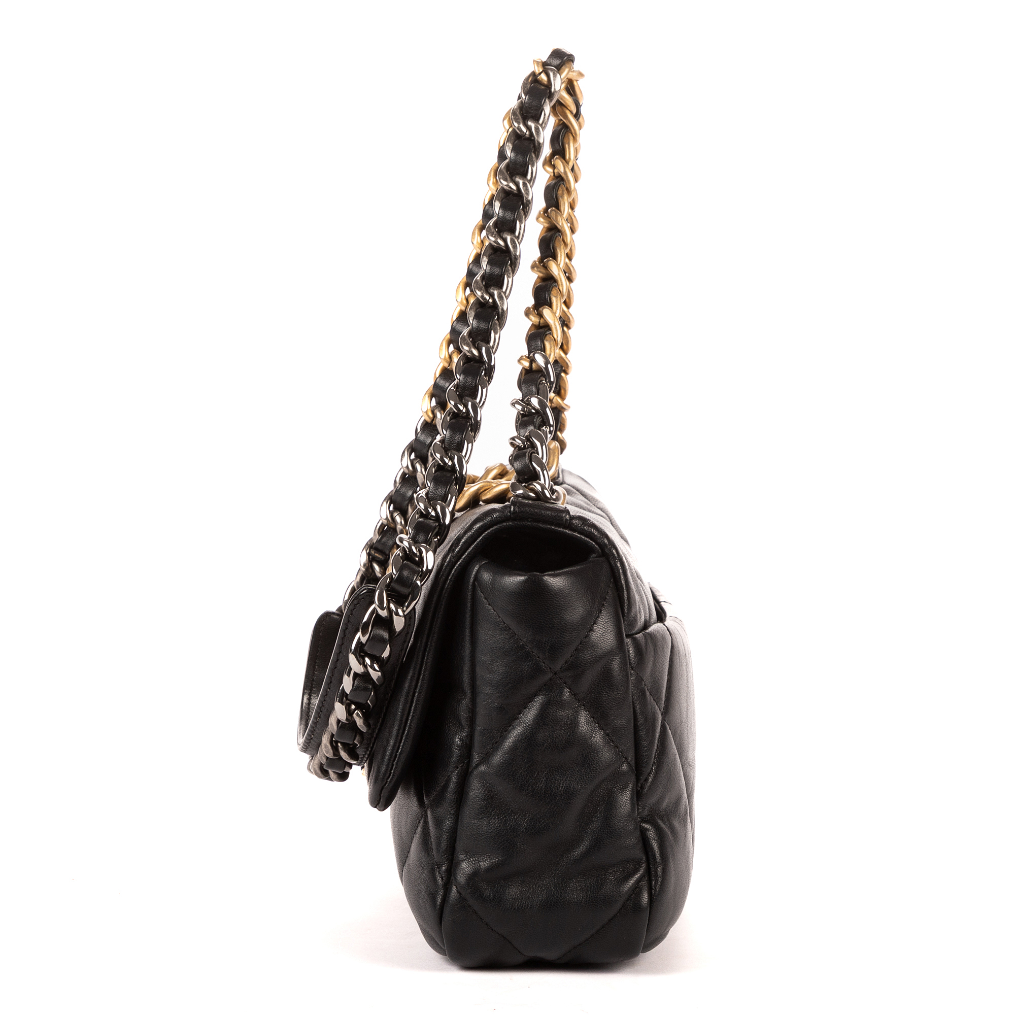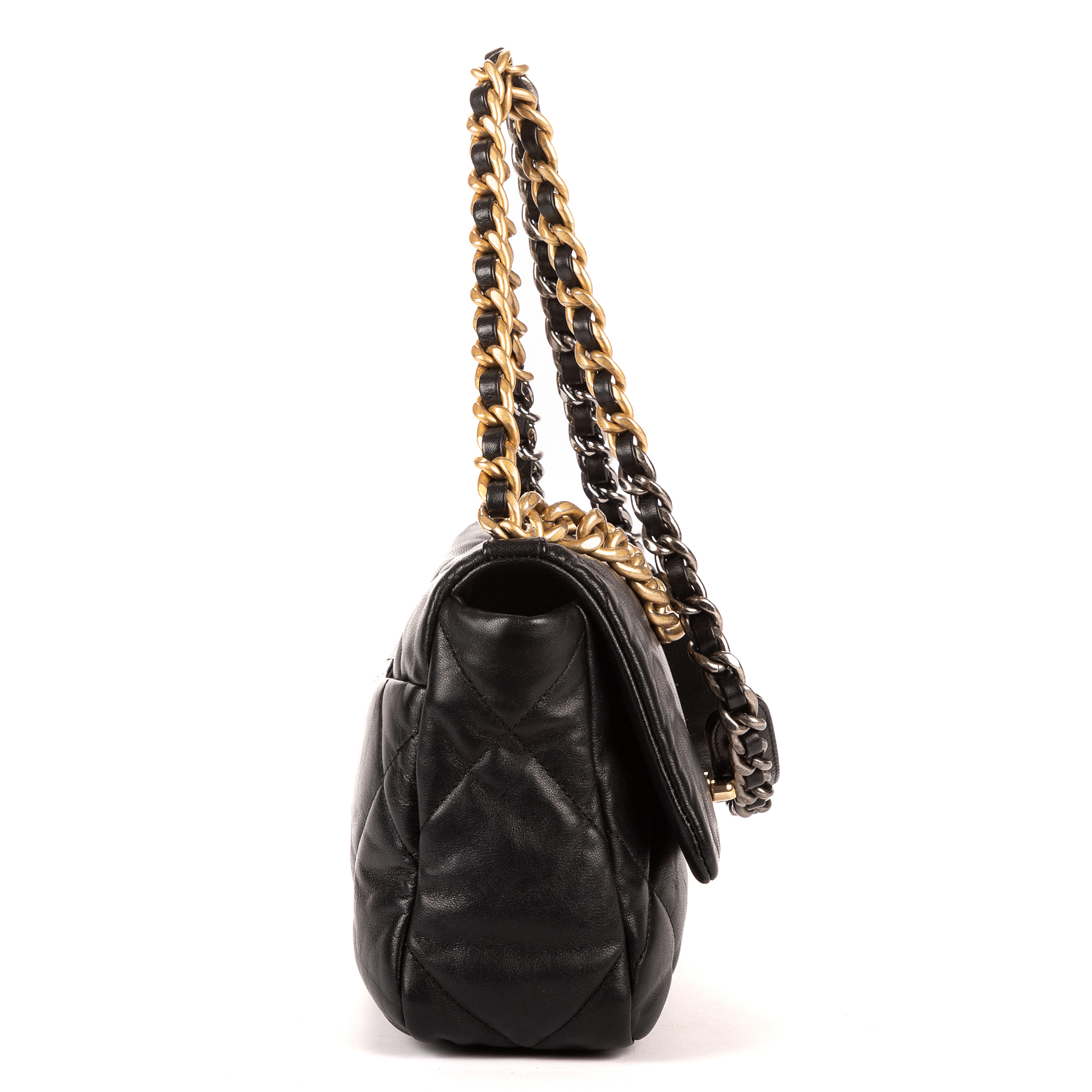 Chanel Sac à bandoulière Classic 19 Flap en Noir et Or/Métal à canons. Le produit est en Excellent état (A).