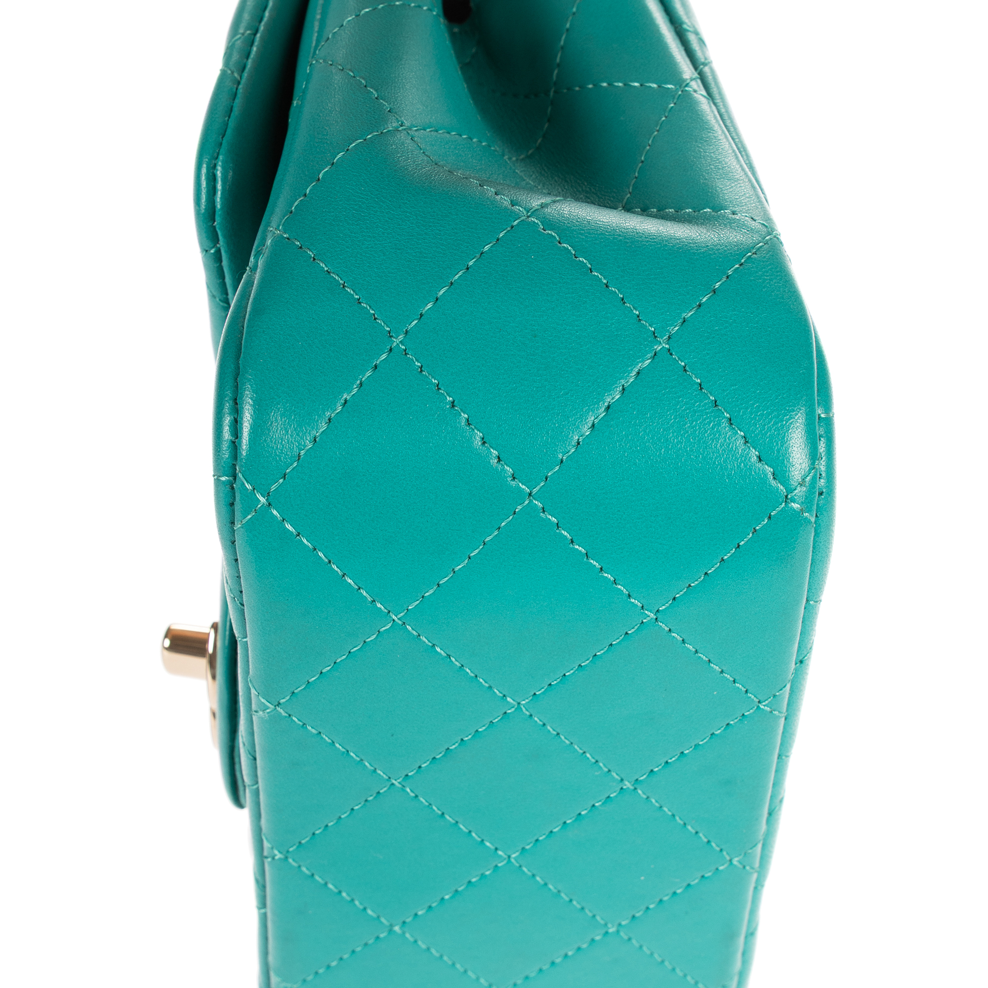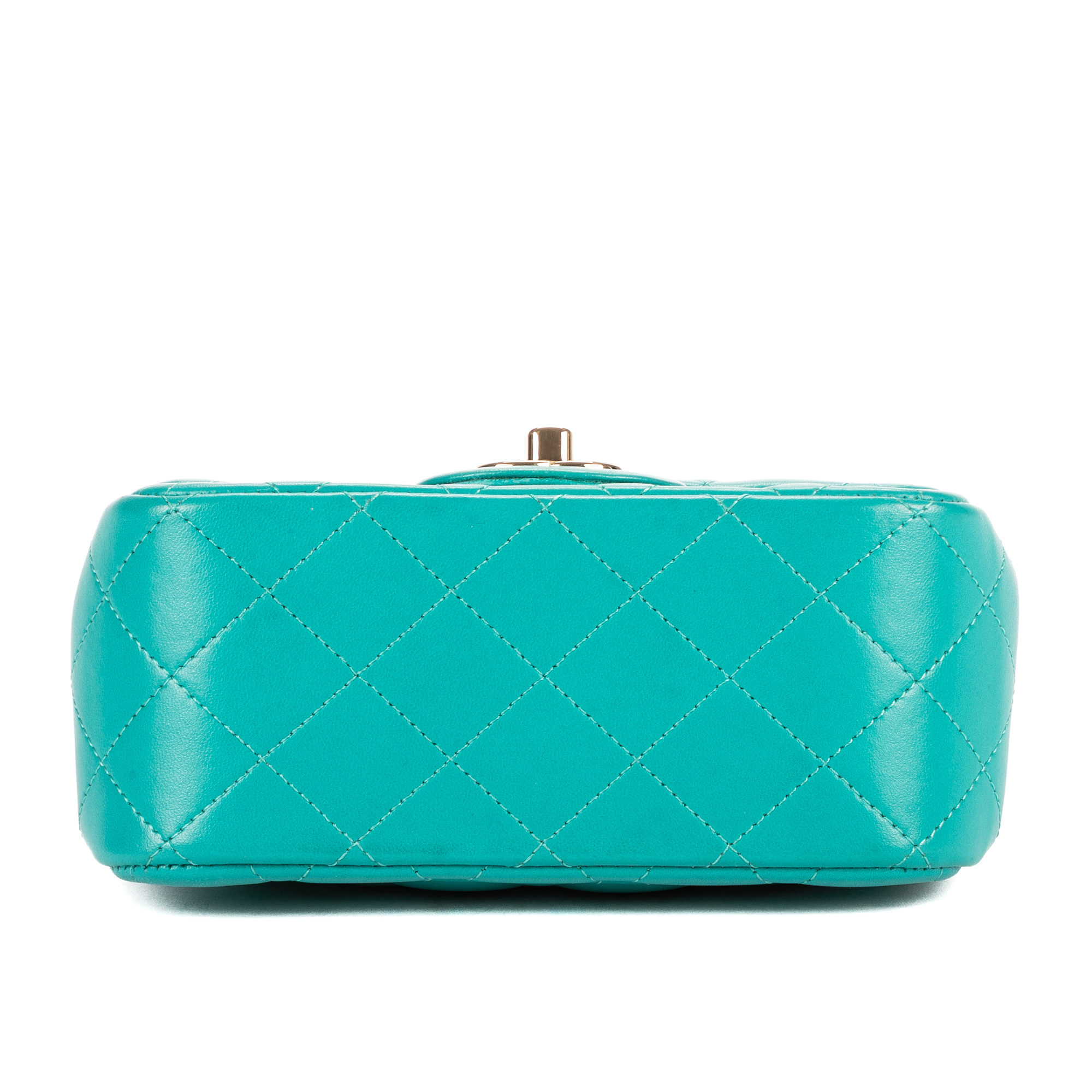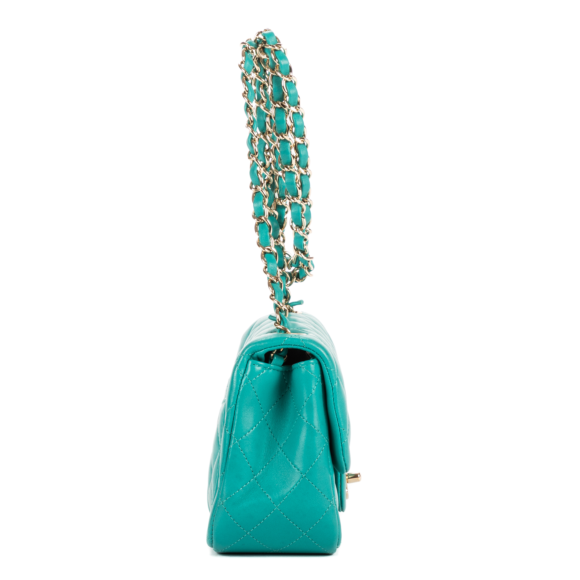 Chanel Sac à bandoulière Classic Mini Flap 17 en Bleu turquoise et Champagne Gold. Le produit est en Parfait état (AA).