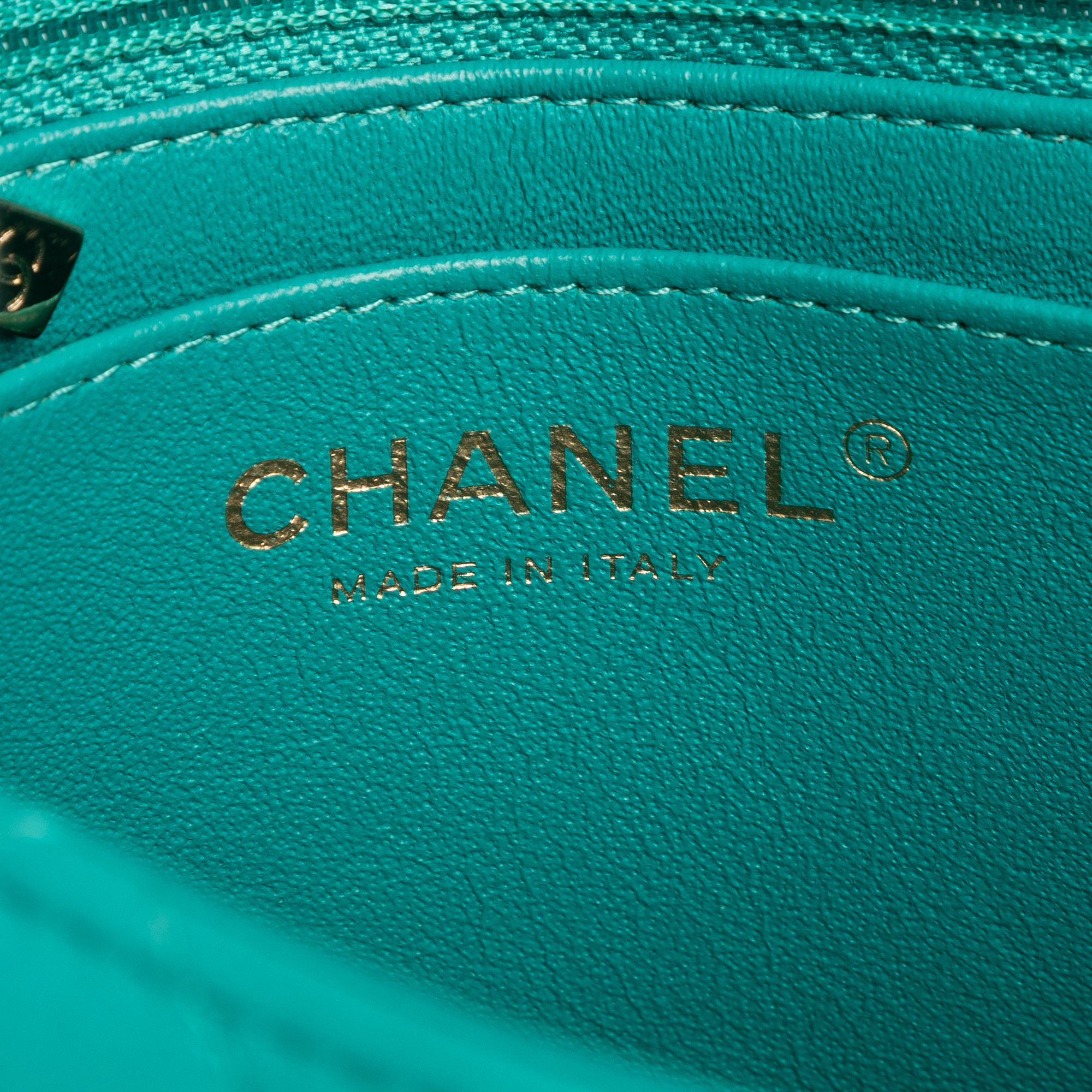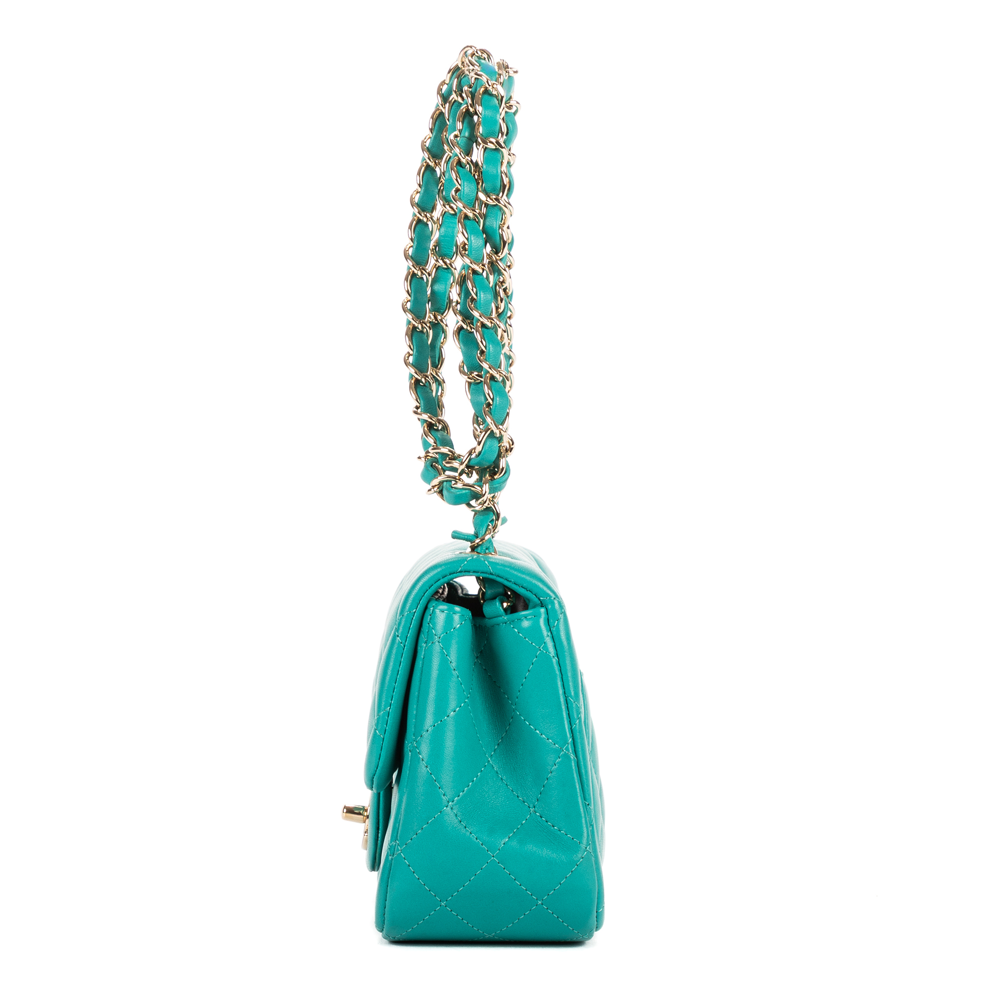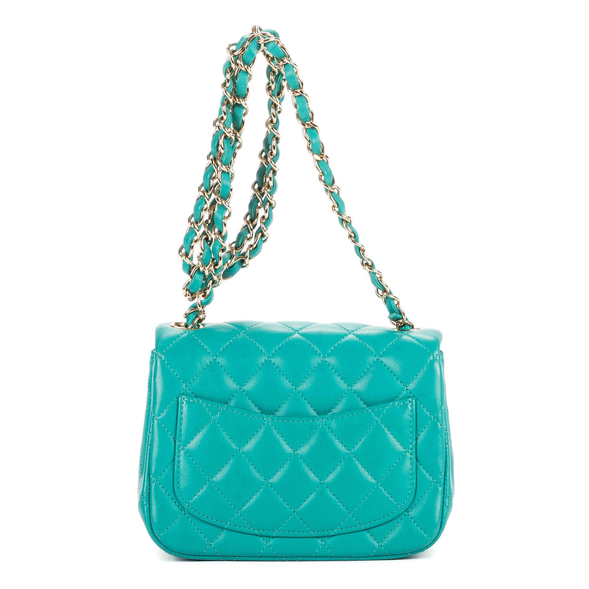 Chanel Sac à bandoulière Classic Mini Flap 17 en Bleu turquoise et Champagne Gold. Le produit est en Parfait état (AA).
