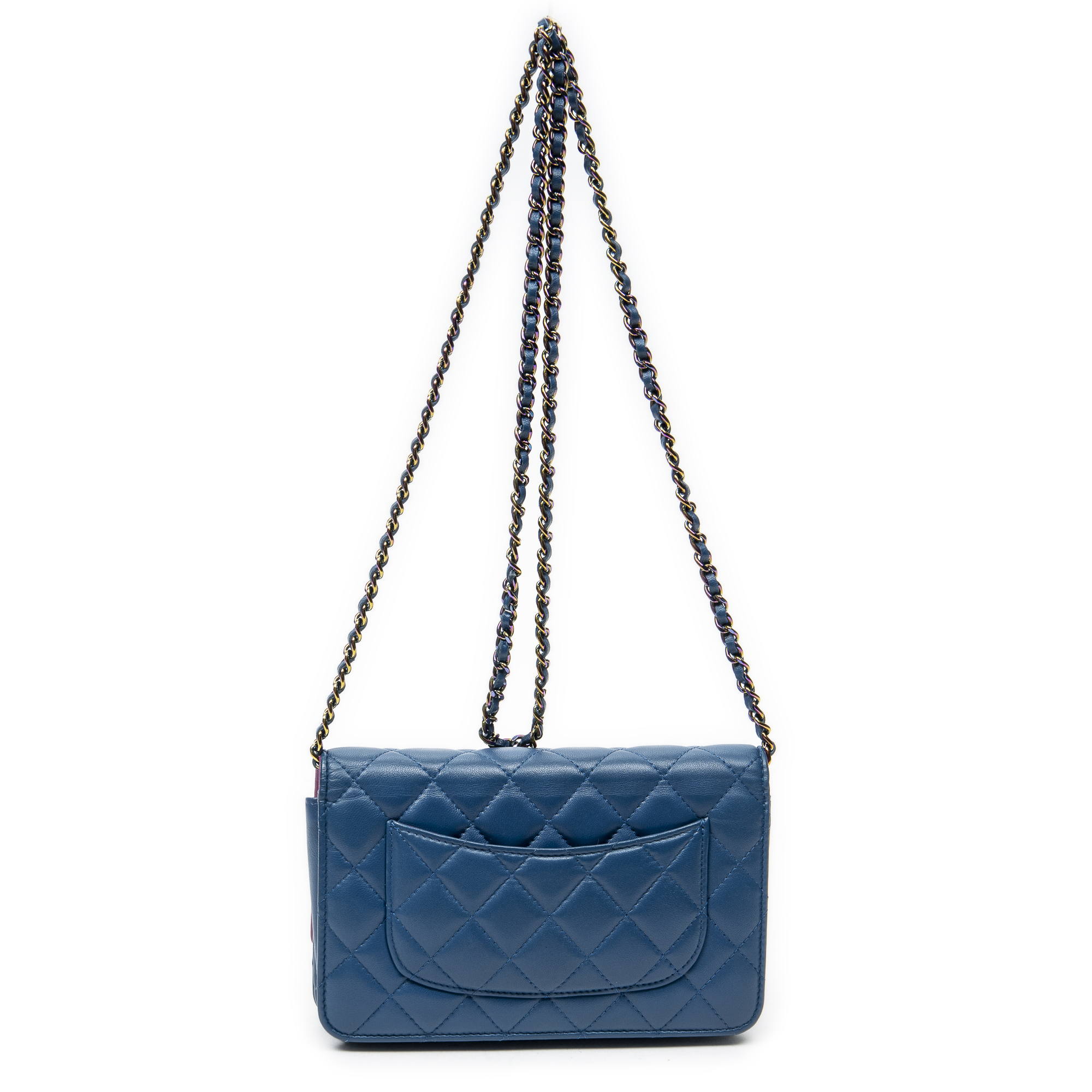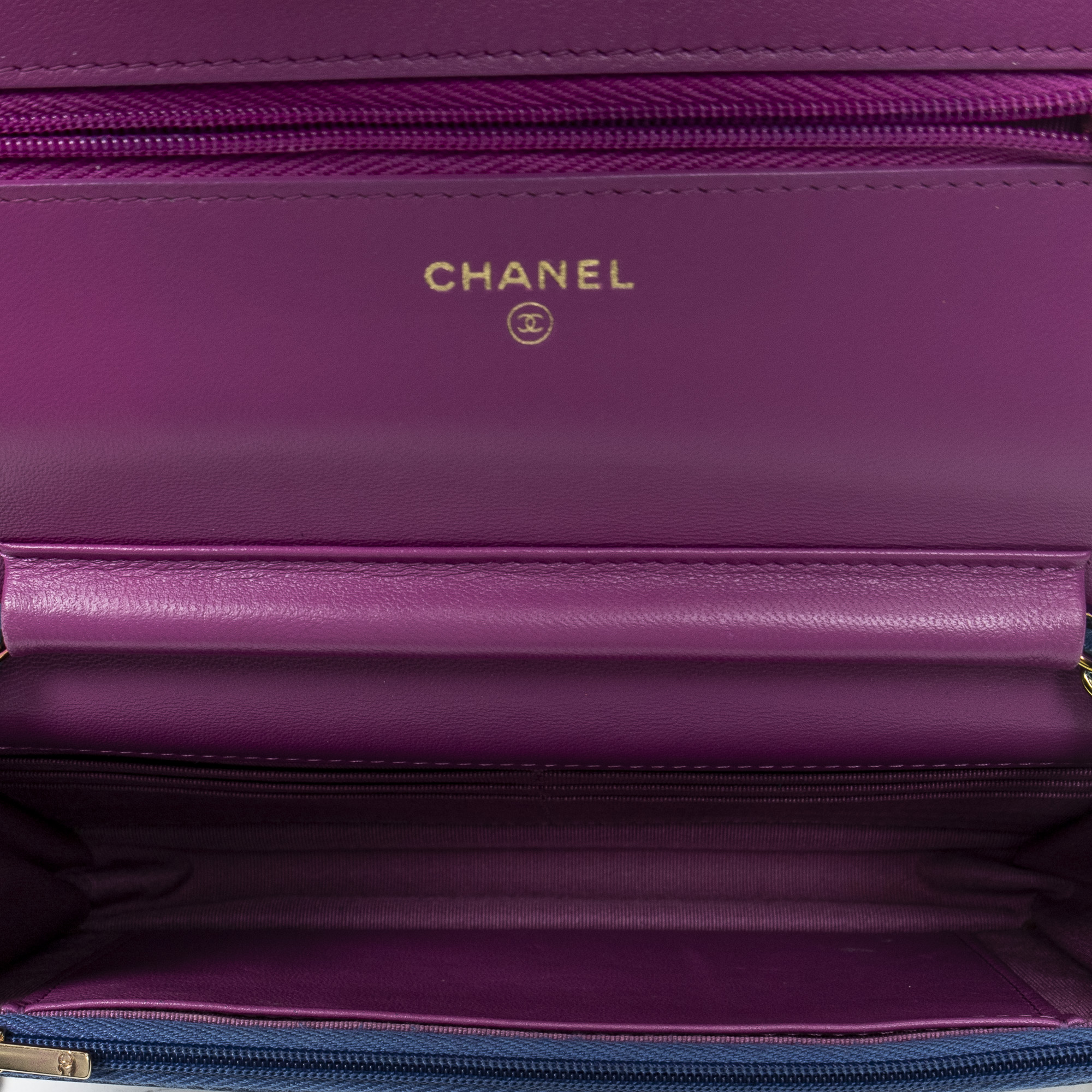 Chanel Sac à bandoulière Classic Wallet on Chain en Bleu/Violet et Gold. Le produit est en Parfait état (AA).