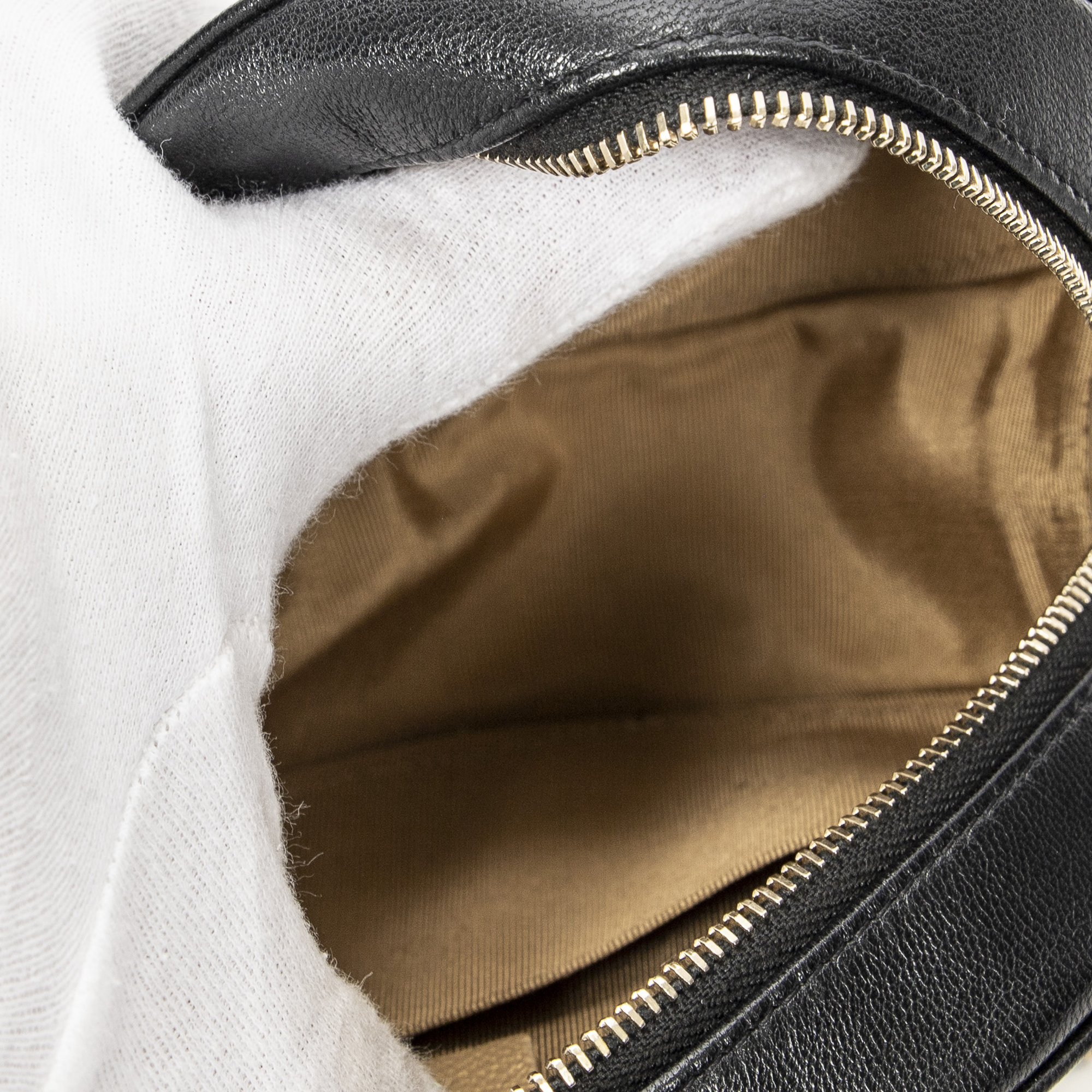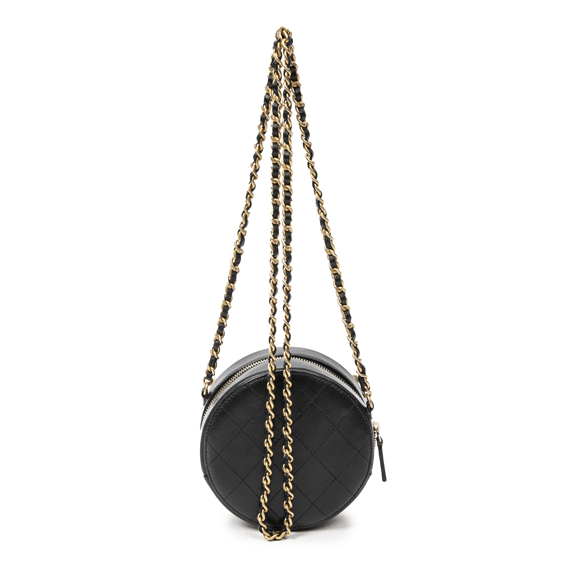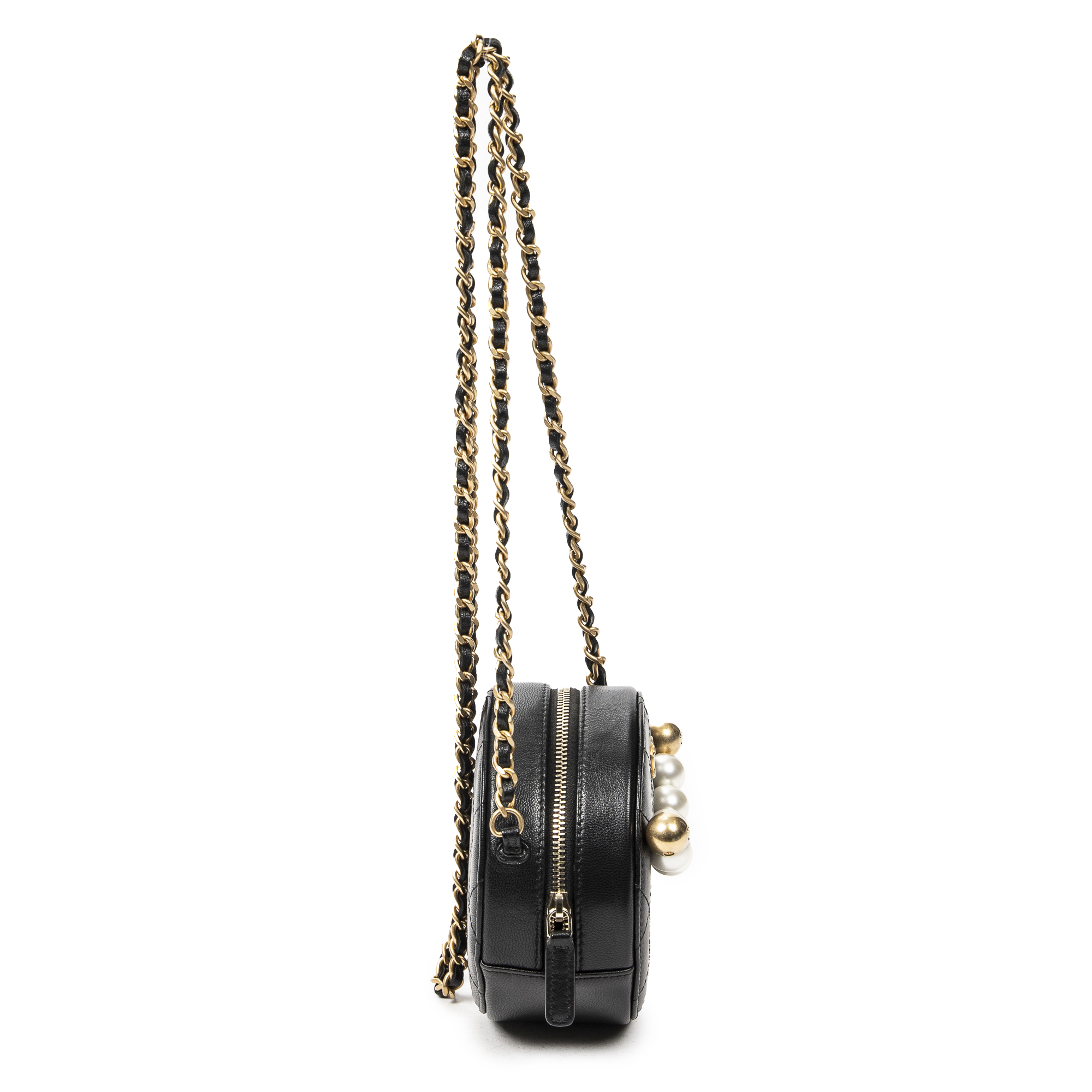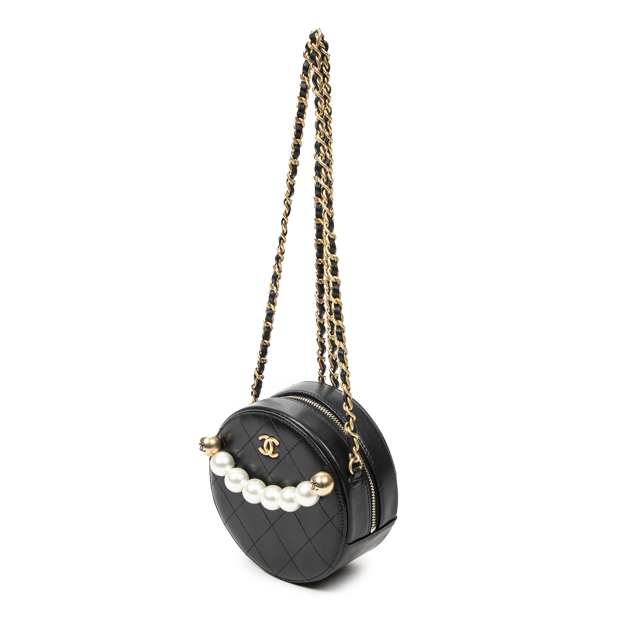 Chanel Sac à bandoulière Front Pearl Round Chain Clutch en Noir et Gold. Le produit est en Parfait état (AA).