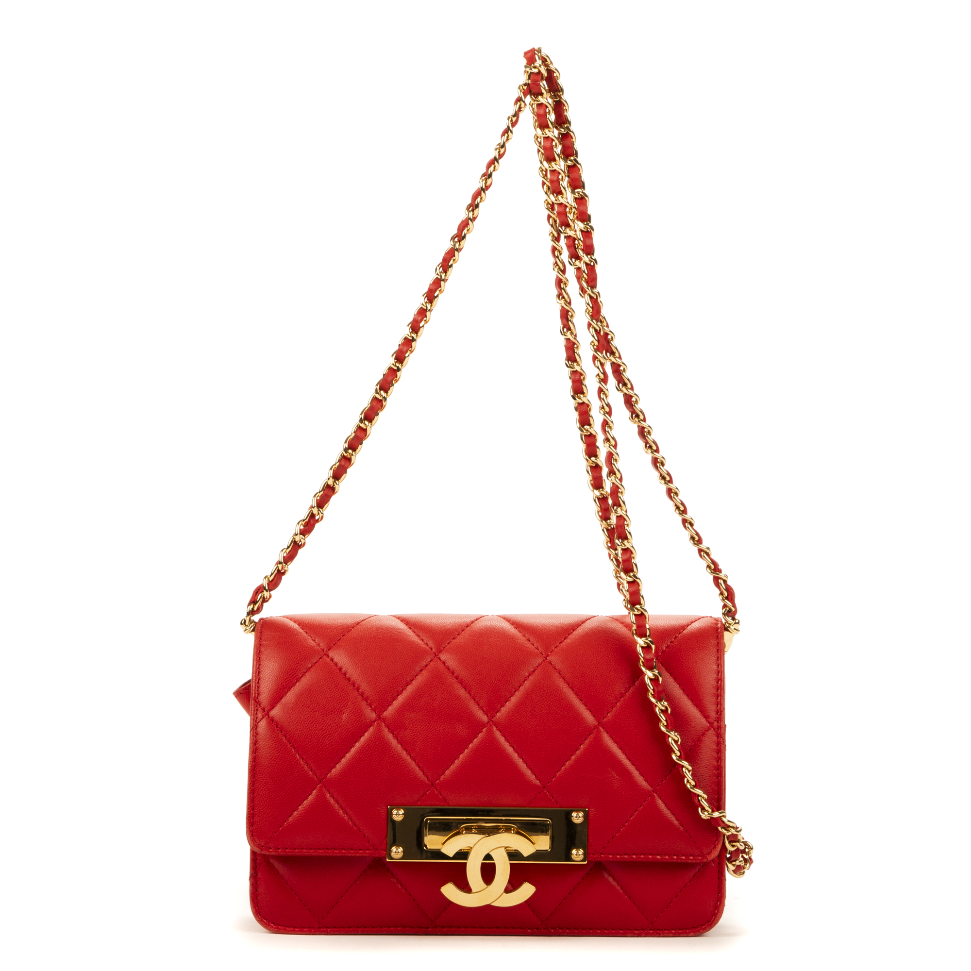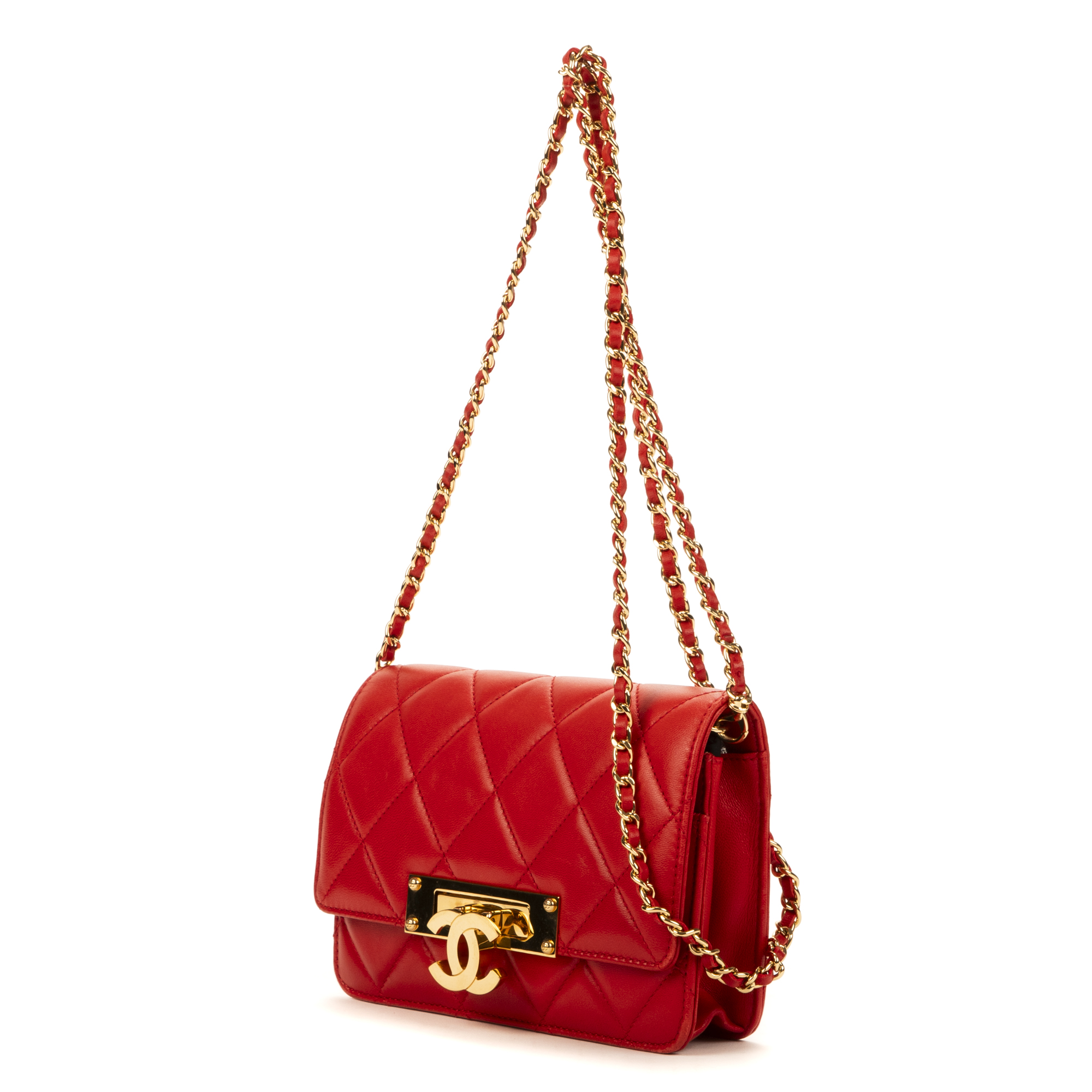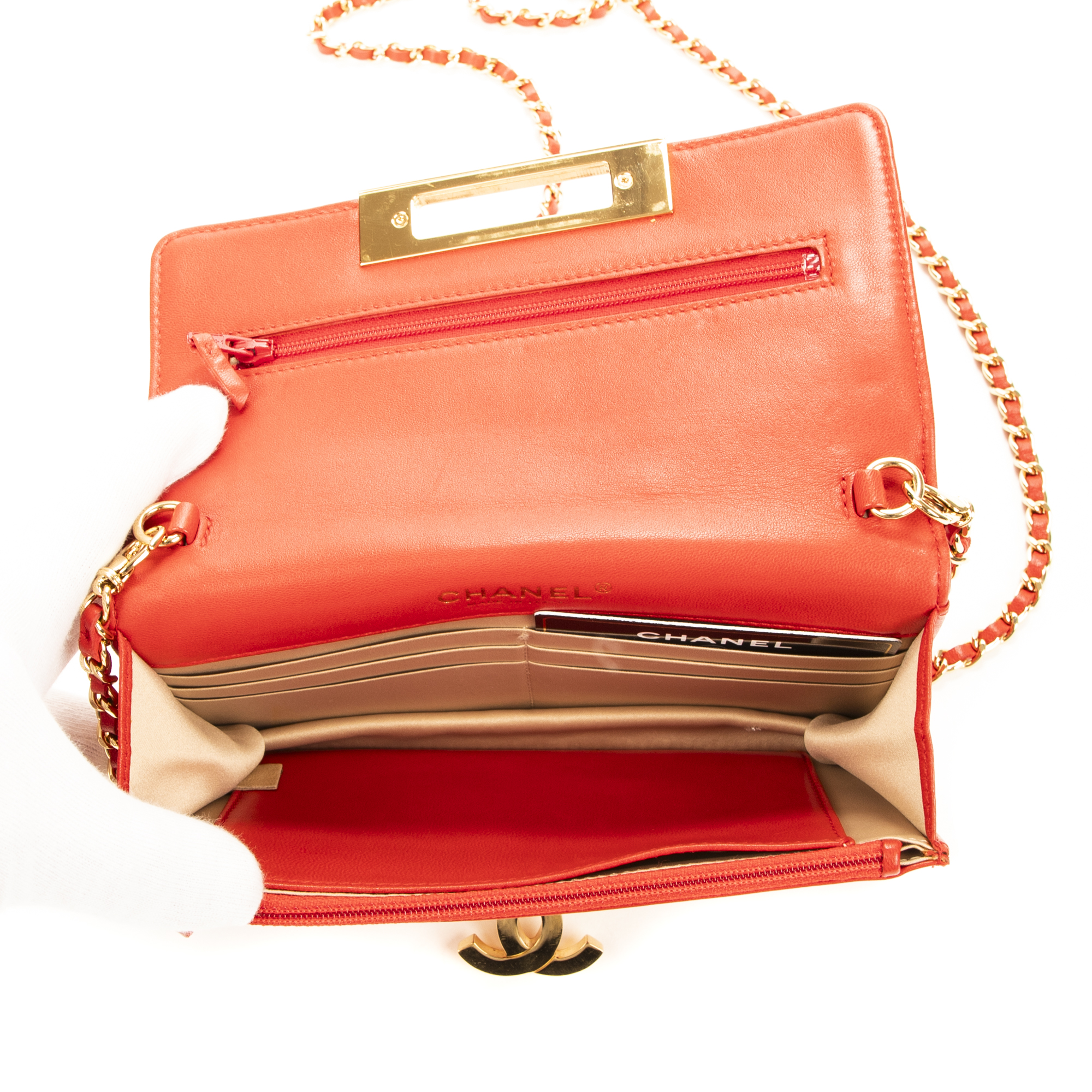 Chanel sac à bandoulière WOC CC en Du cuir de veau Red et or. Le produit est en Excellent état (A).