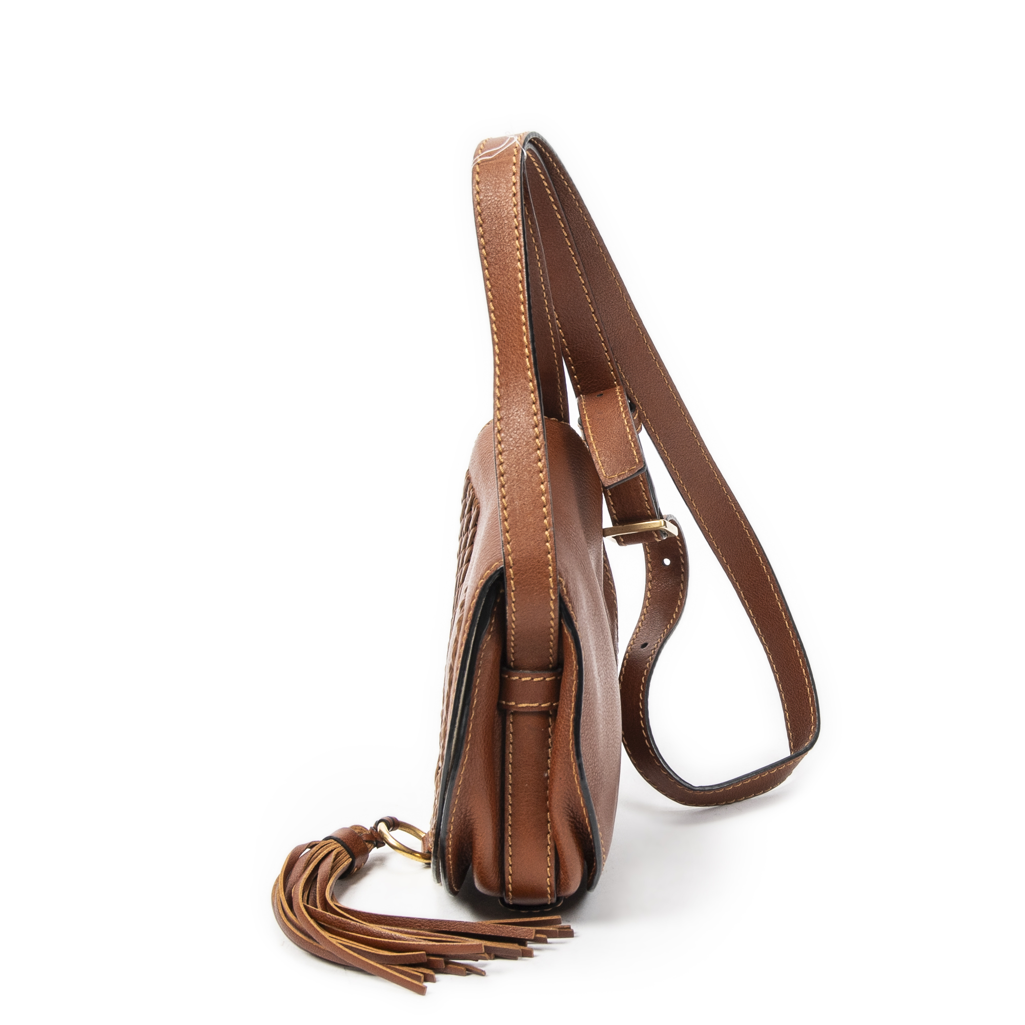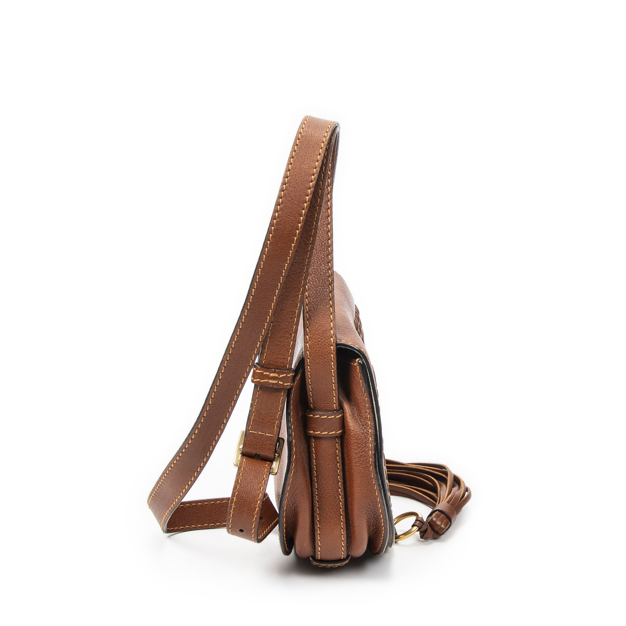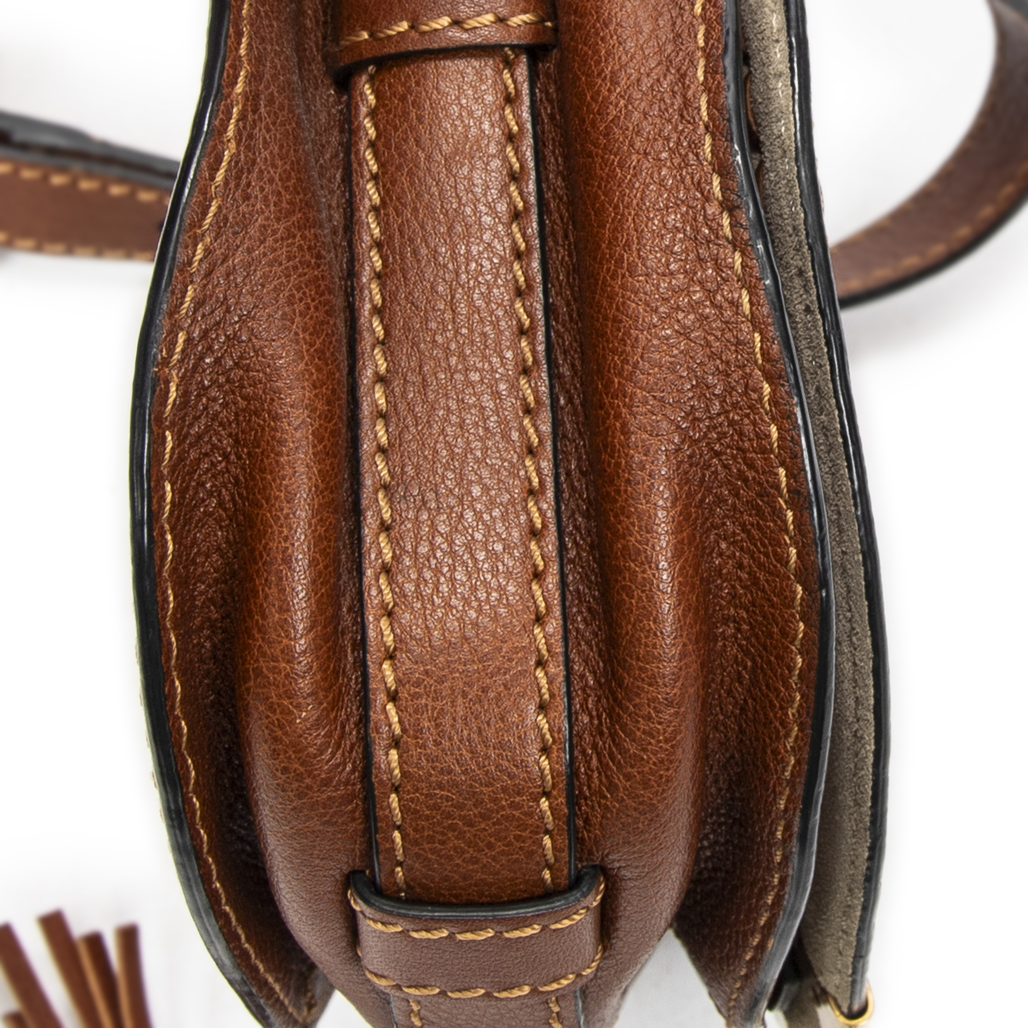 Chloé Sac à bandoulière Mini Marcie Saddle Tassel Crossbody en Tan et Gold. Le produit est en Excellent état (A).