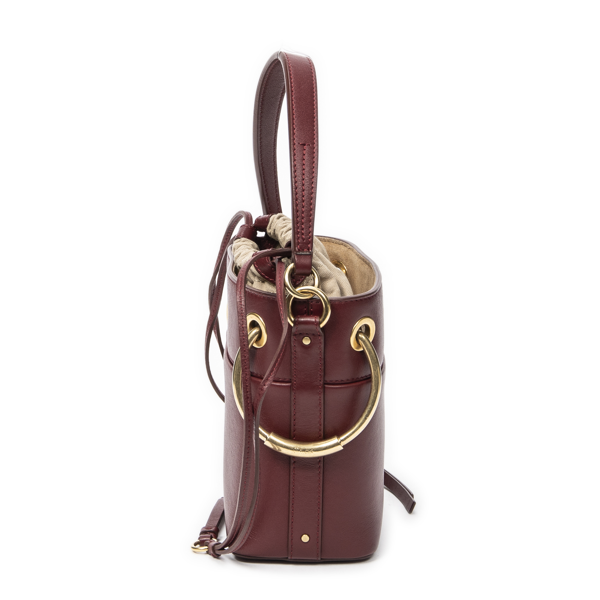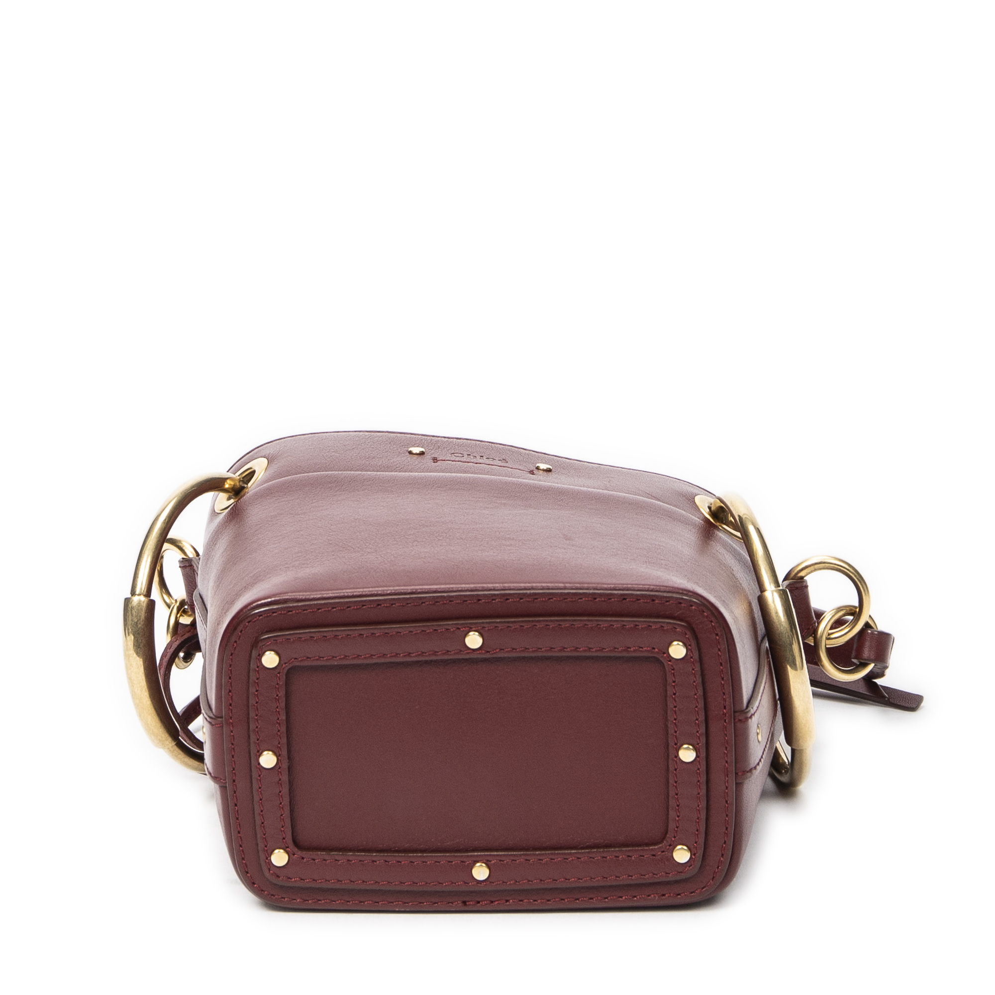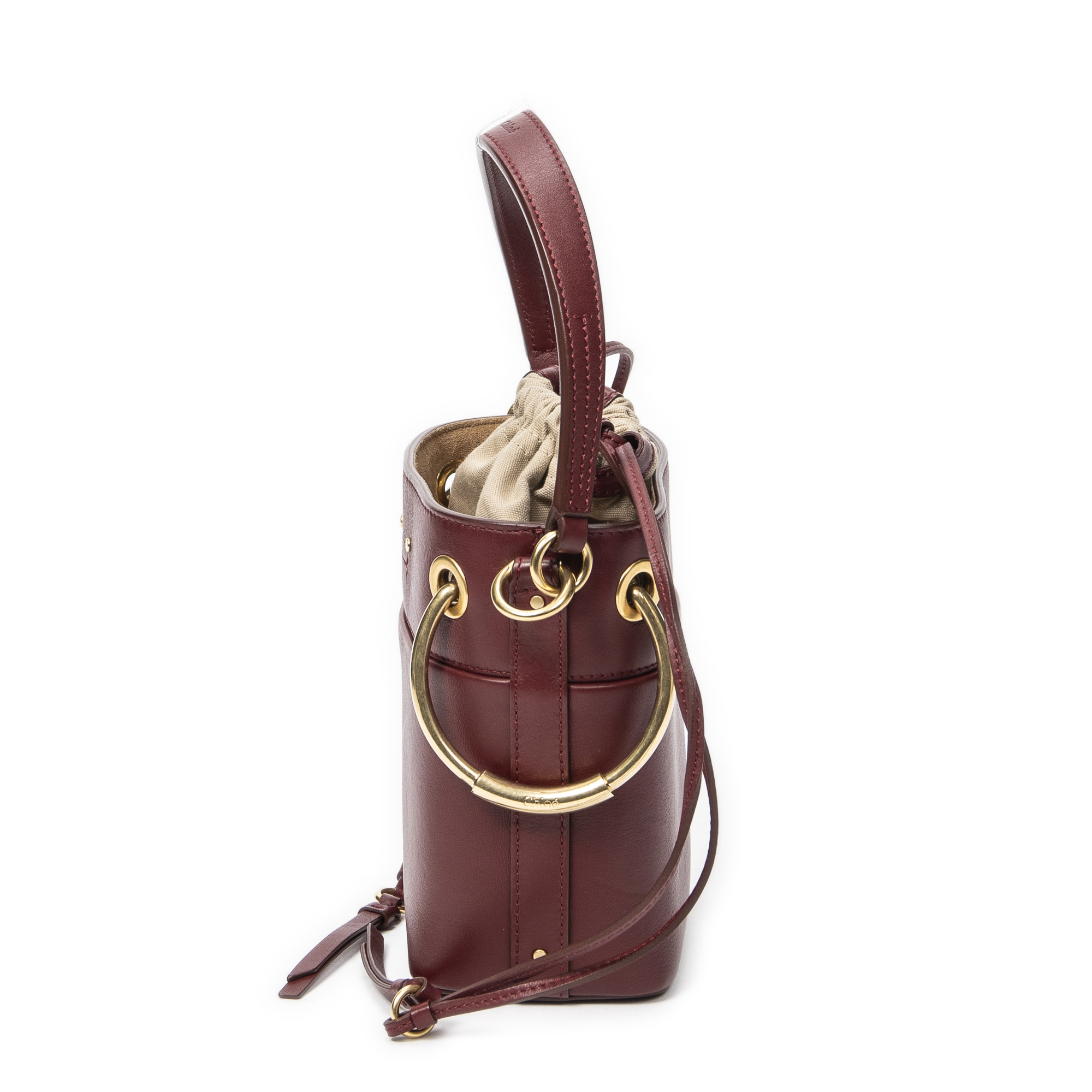 Chloé Sac à bandoulière Mini Roy Bucket en Du cuir de veau Bourgogne et Gold. Le produit est en Excellent état (A).