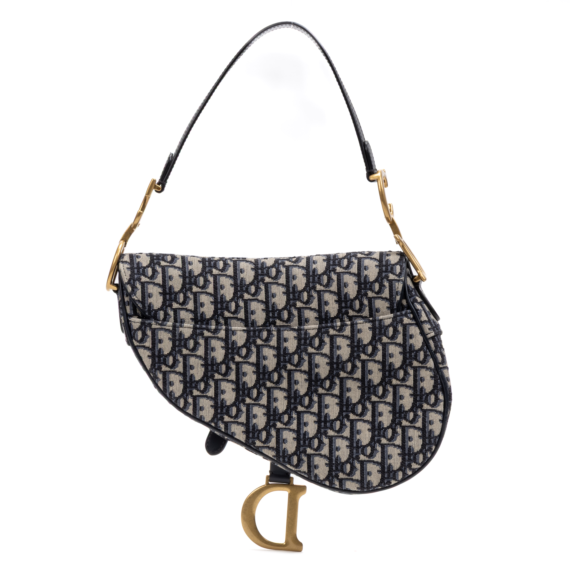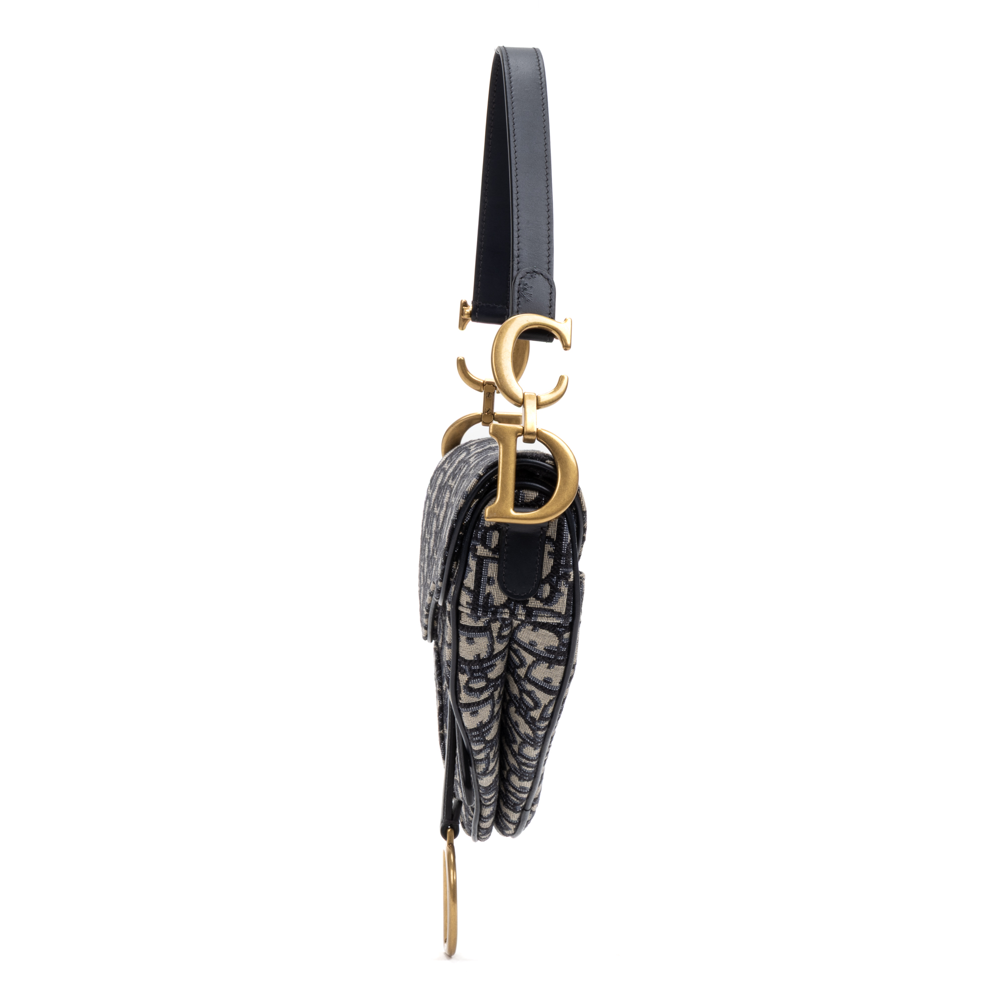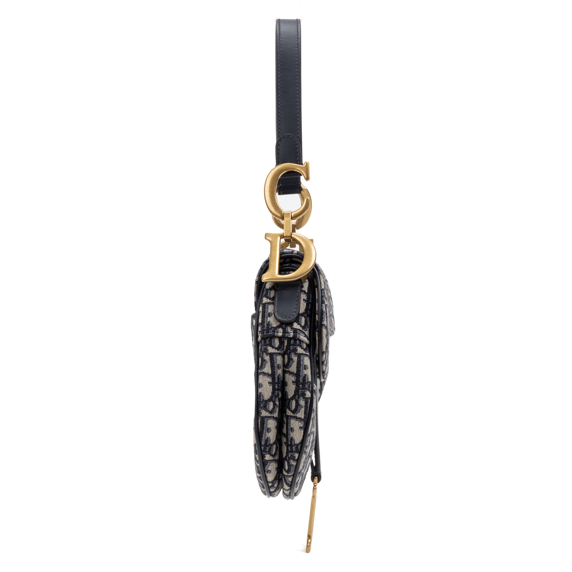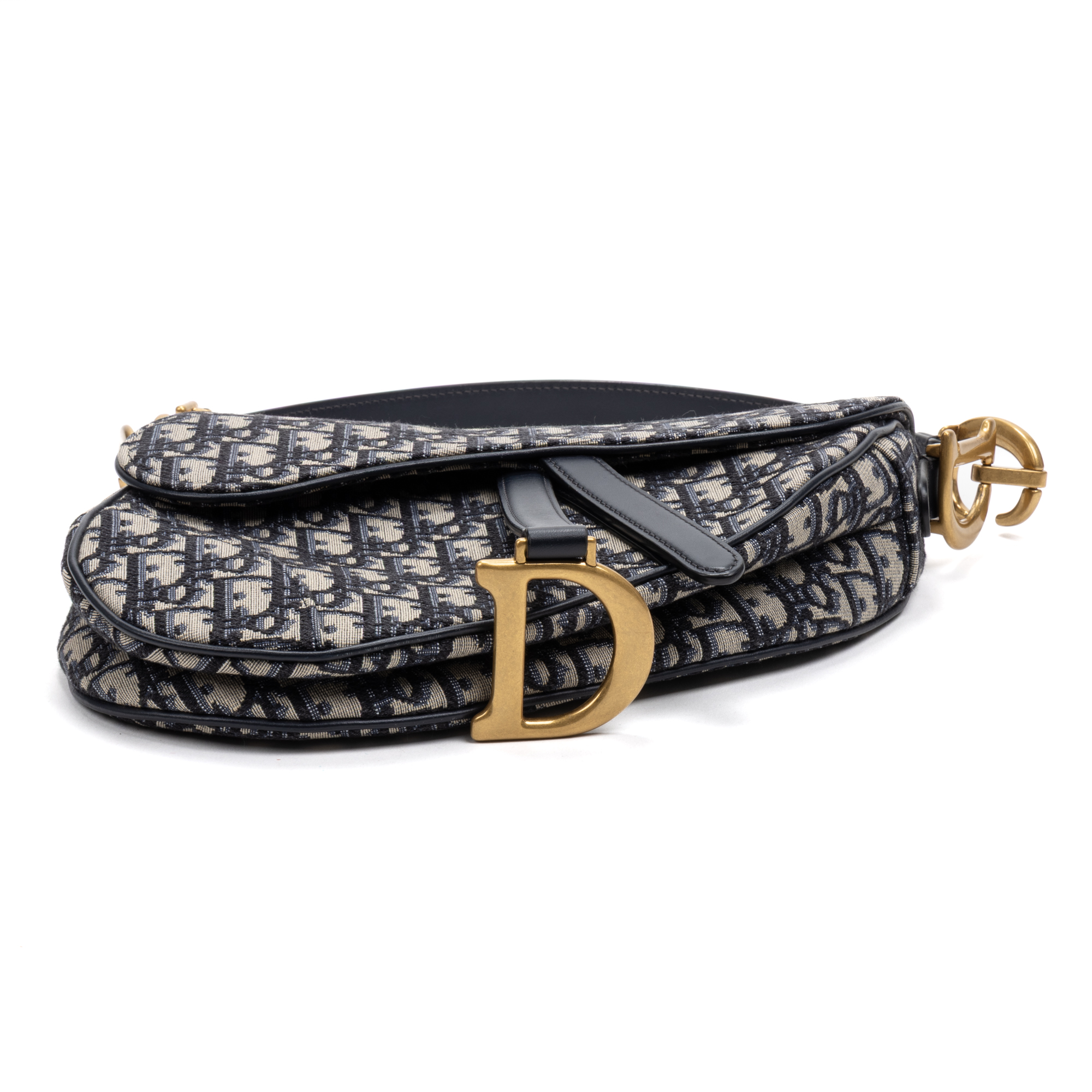 Dior Sac à bandoulière Classic Saddle Bag en Bleu marine/Beige et Gold. Le produit est en Parfait état (AA).