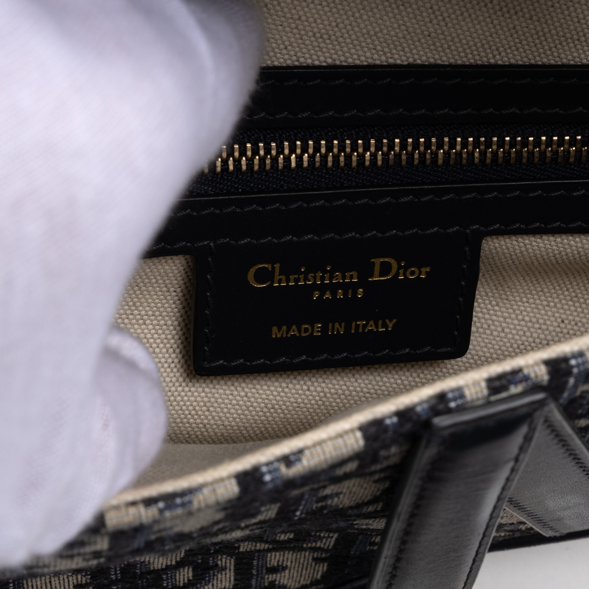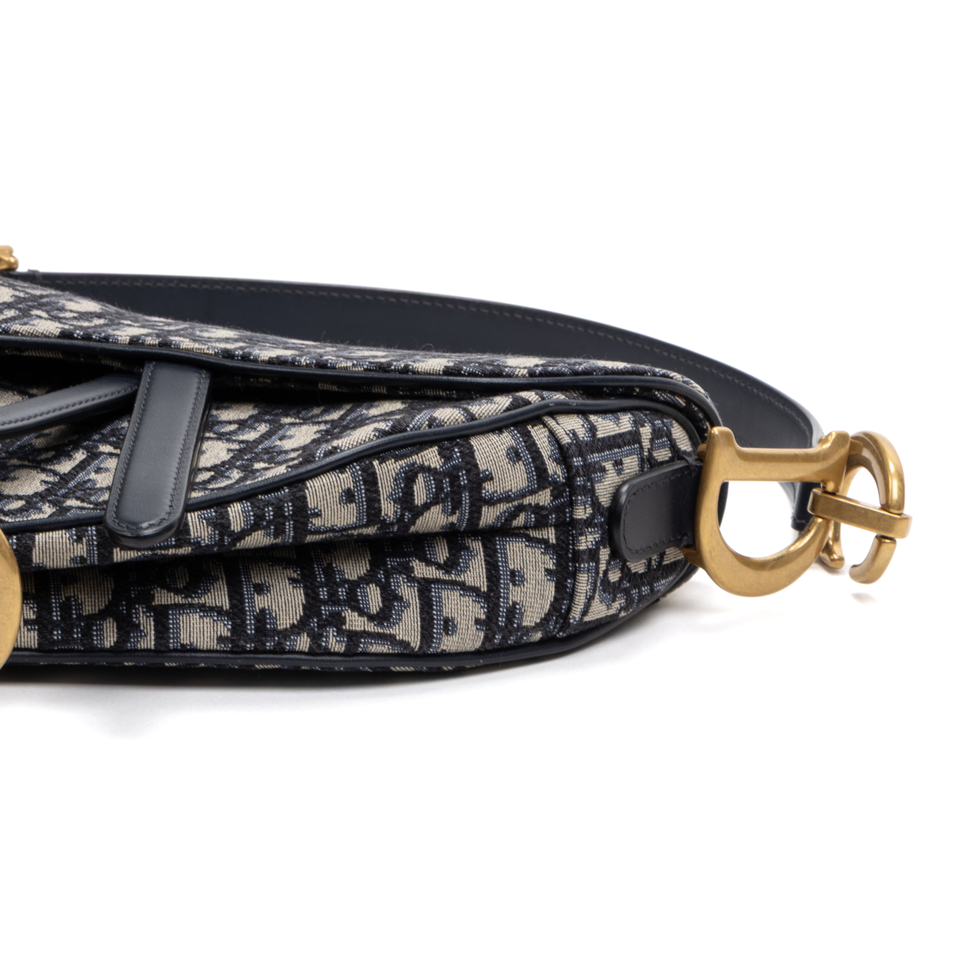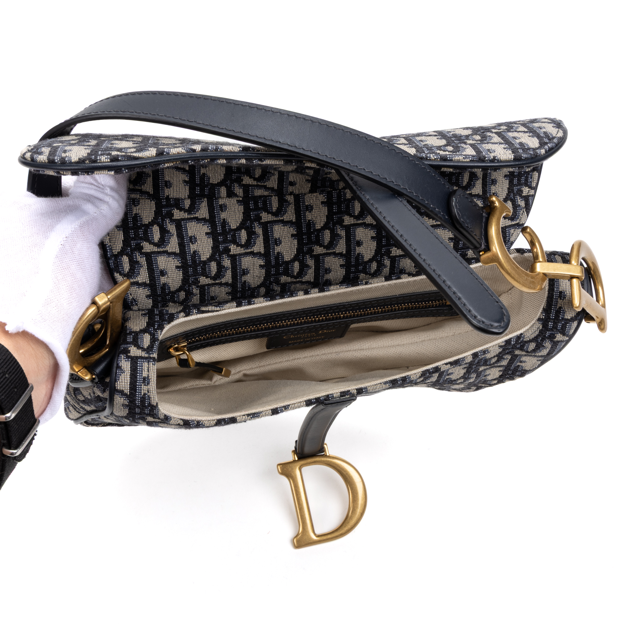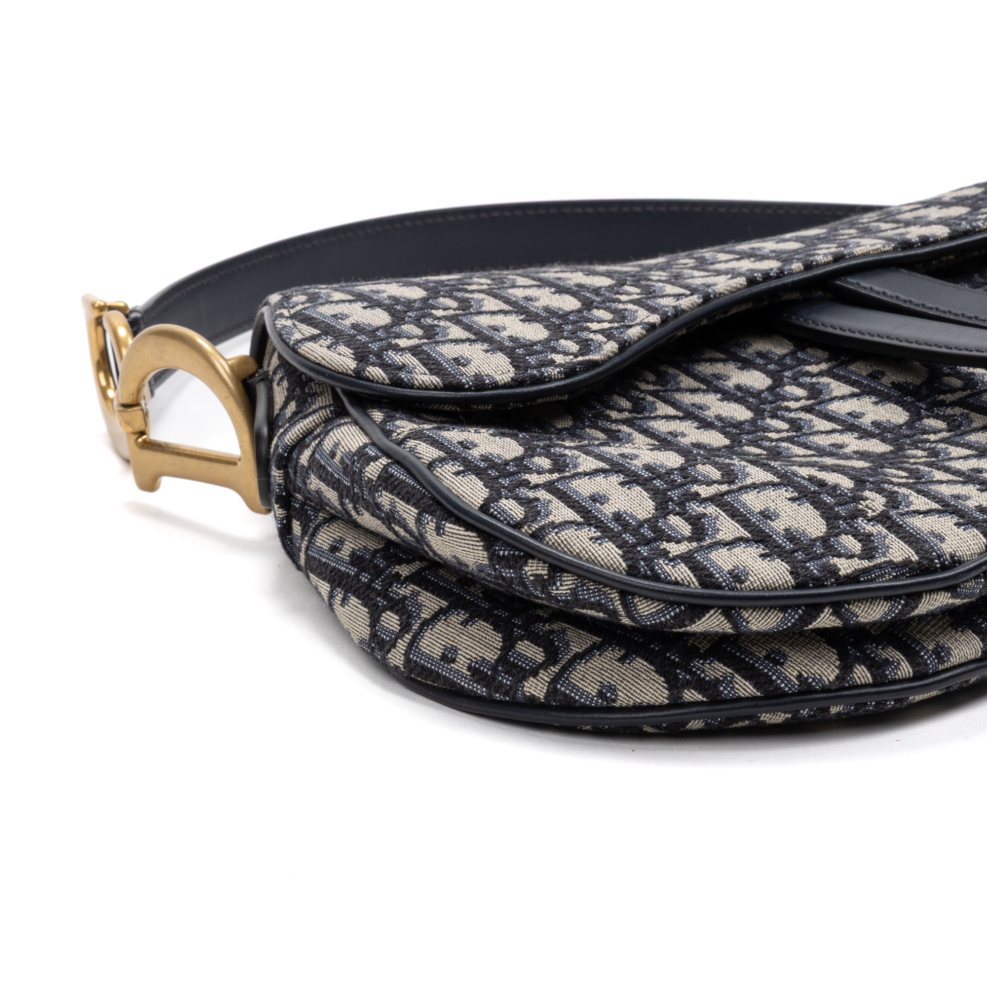 Dior Sac à bandoulière Classic Saddle Bag en Bleu marine/Beige et Gold. Le produit est en Parfait état (AA).