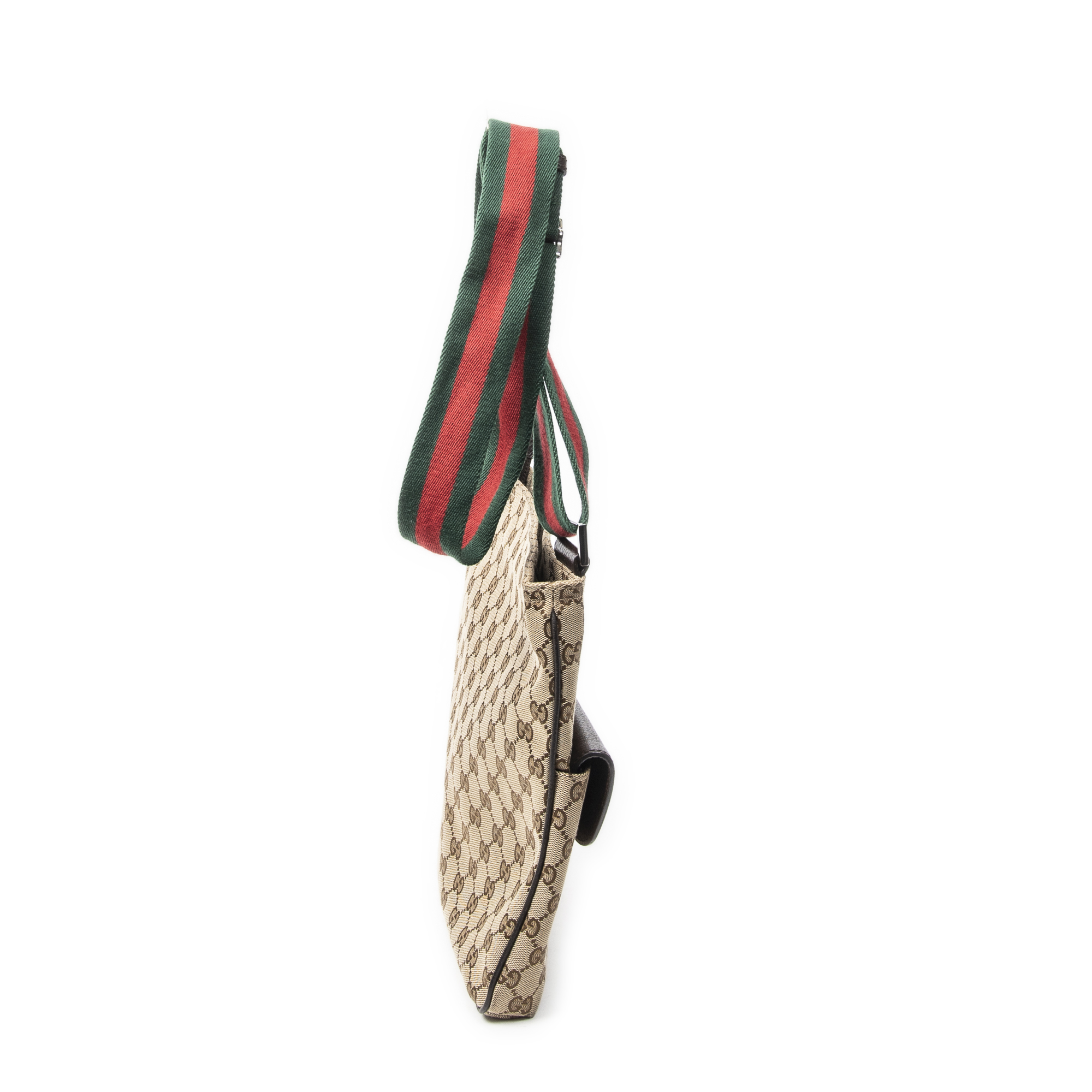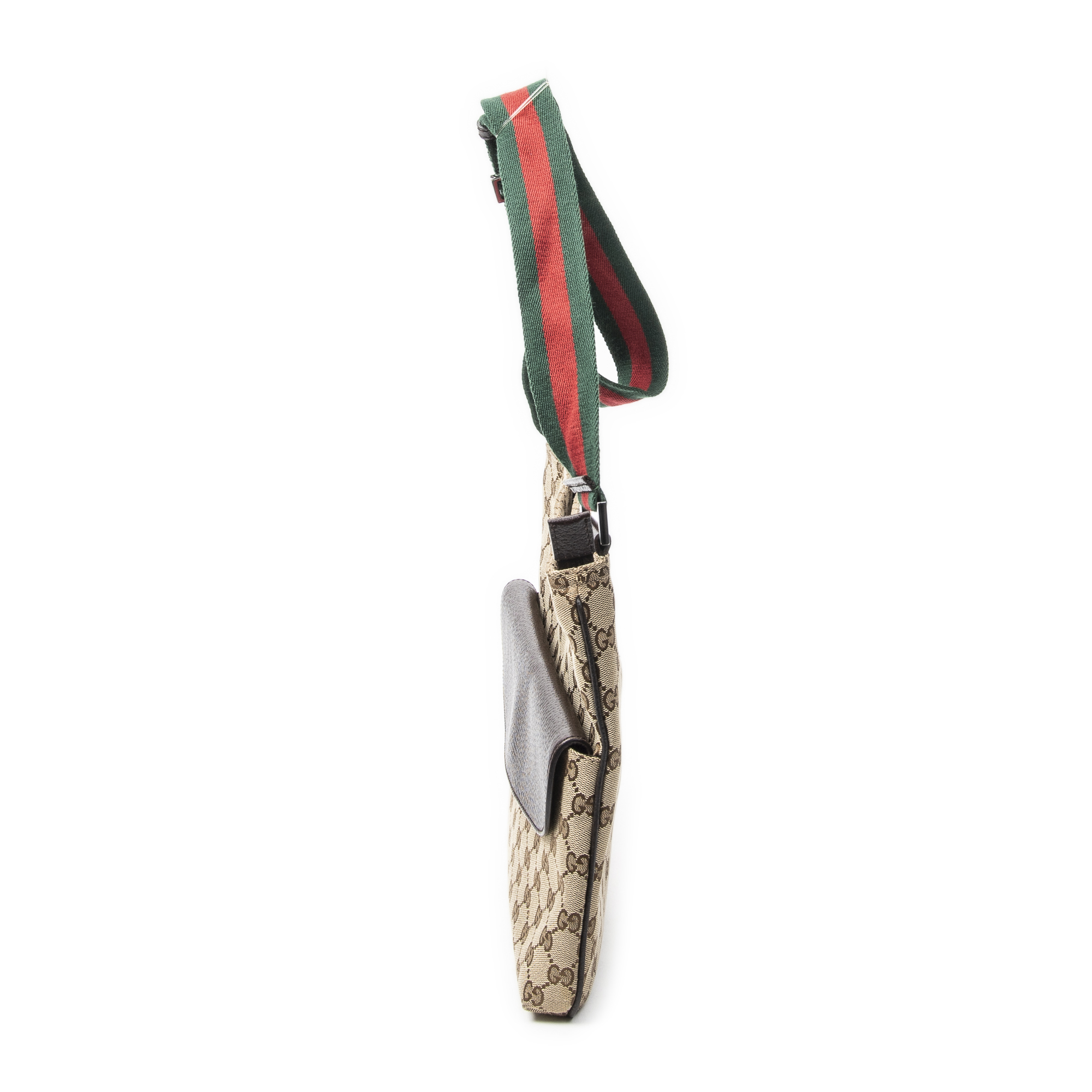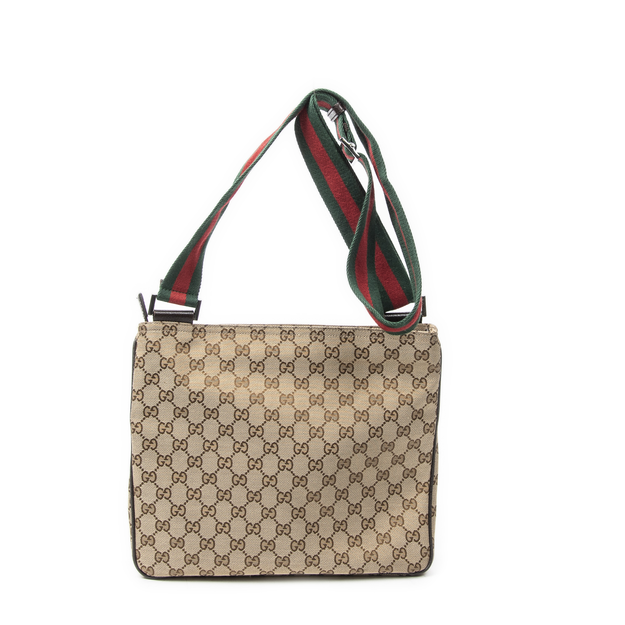 Gucci Sac à bandoulière Front Pocket Web Messenger en Beige/Marron et Argent. Le produit est en Parfait état (AA).