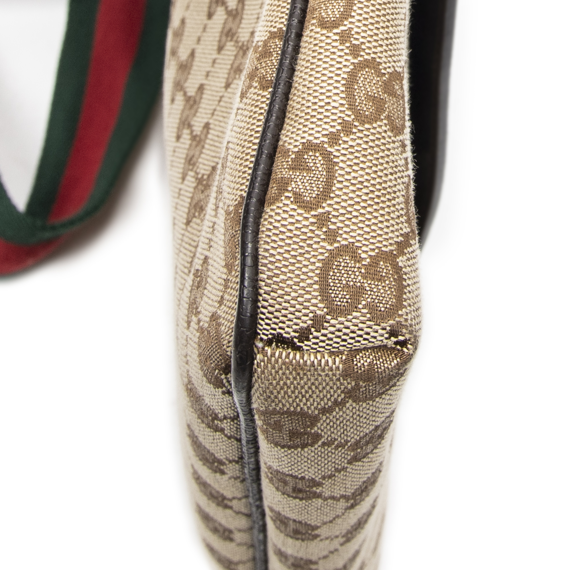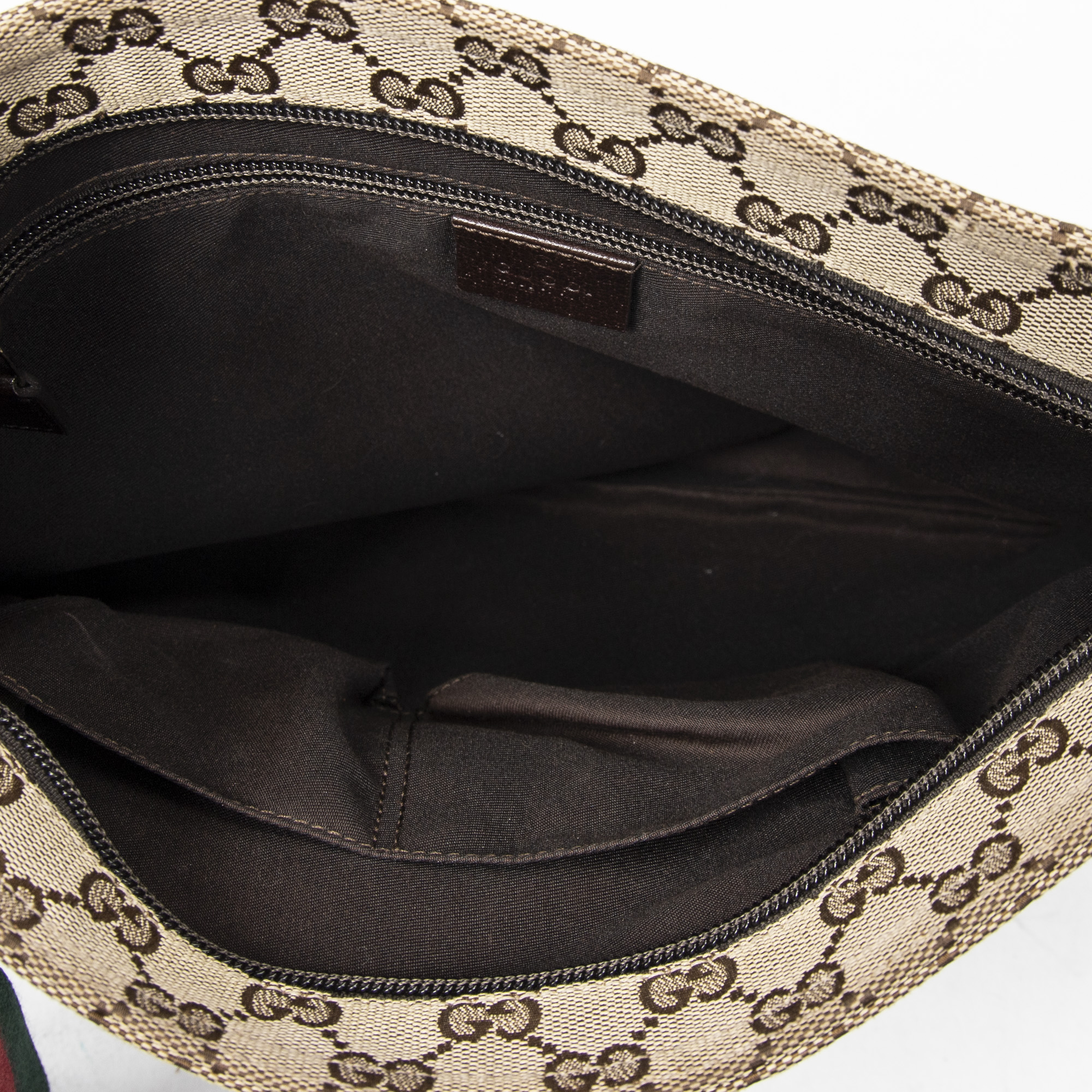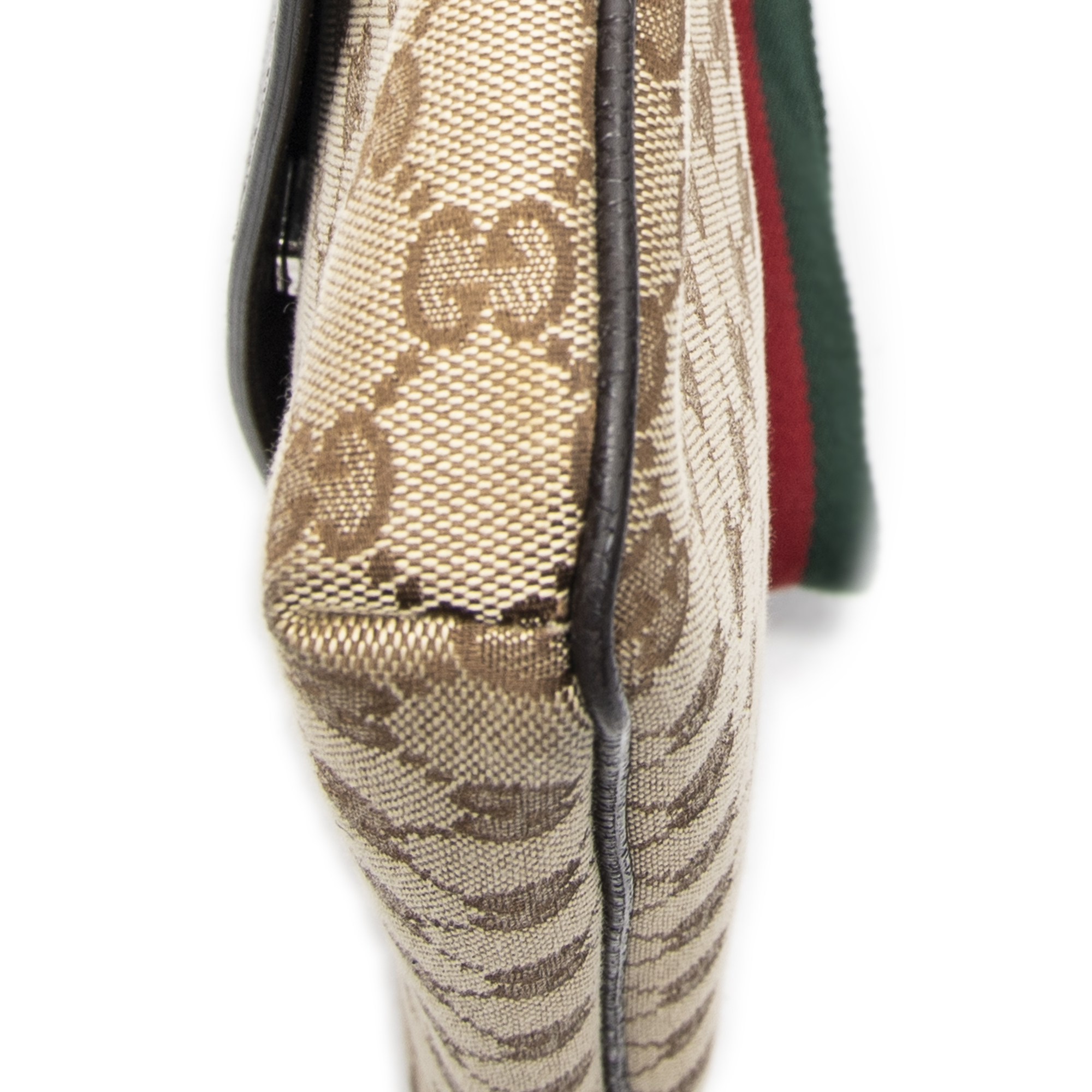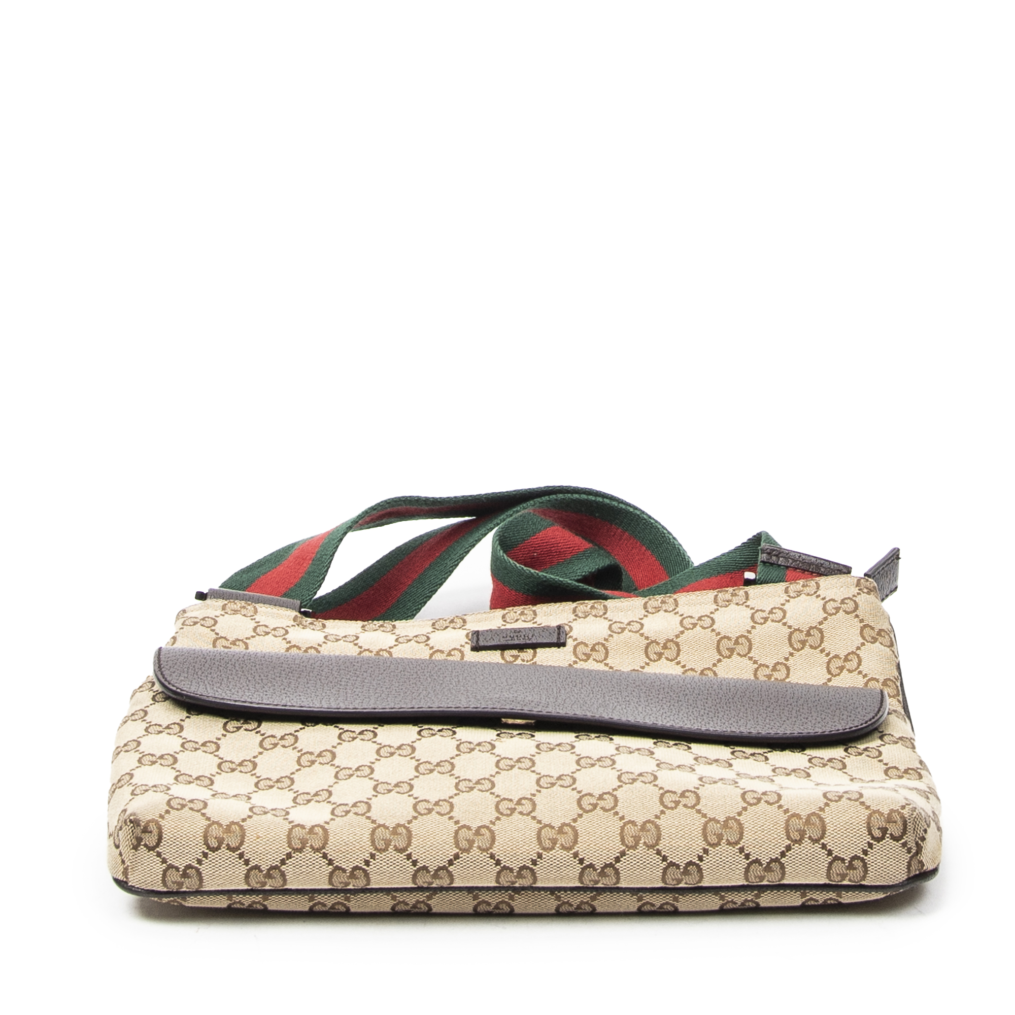 Gucci Sac à bandoulière Front Pocket Web Messenger en Beige/Marron et Argent. Le produit est en Parfait état (AA).