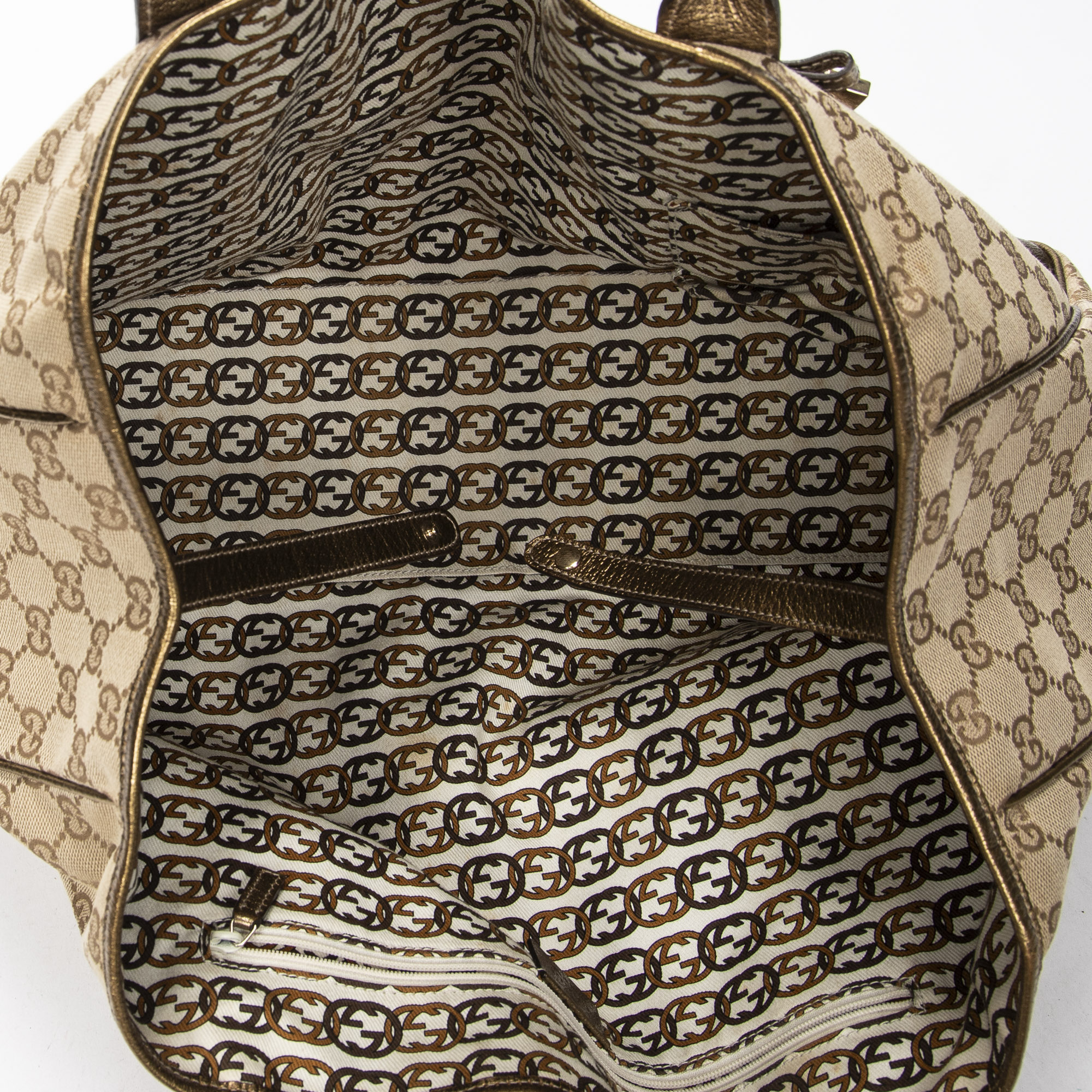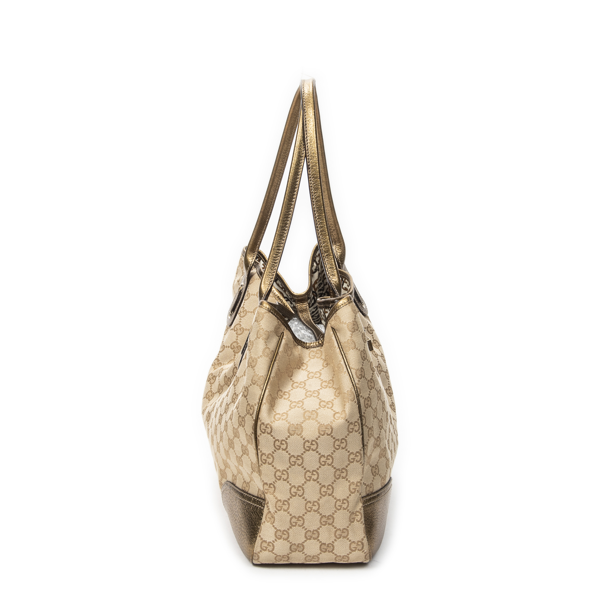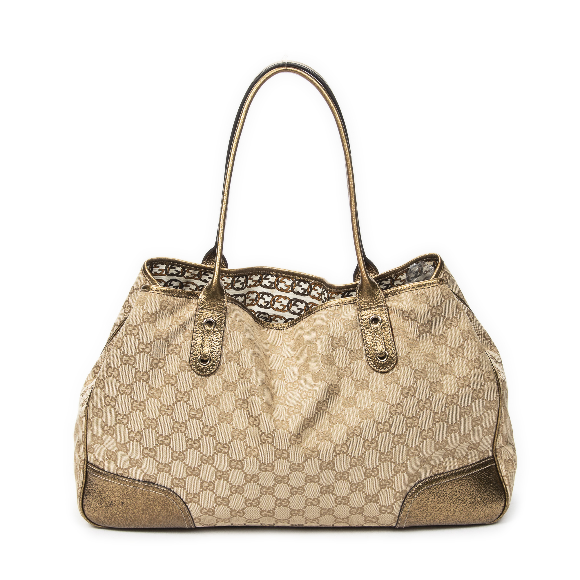 Gucci Sac à bandoulière Large Web Princy Tote en Beige et Gold. Le produit est en Excellent état (A).