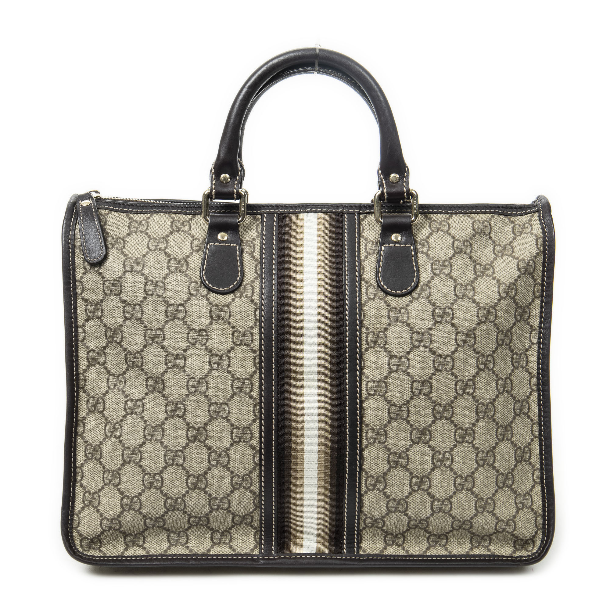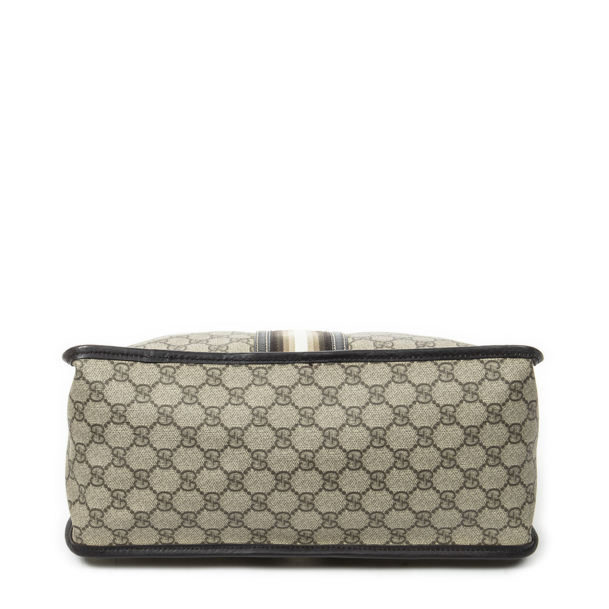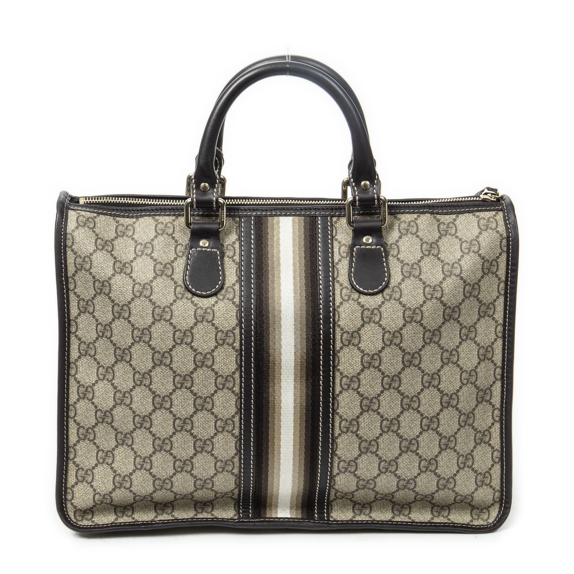 Gucci Sac à bandoulière Vintage Web Zip Tote en Beige/Marron foncé et Or. Le produit est en Parfait état (AA).