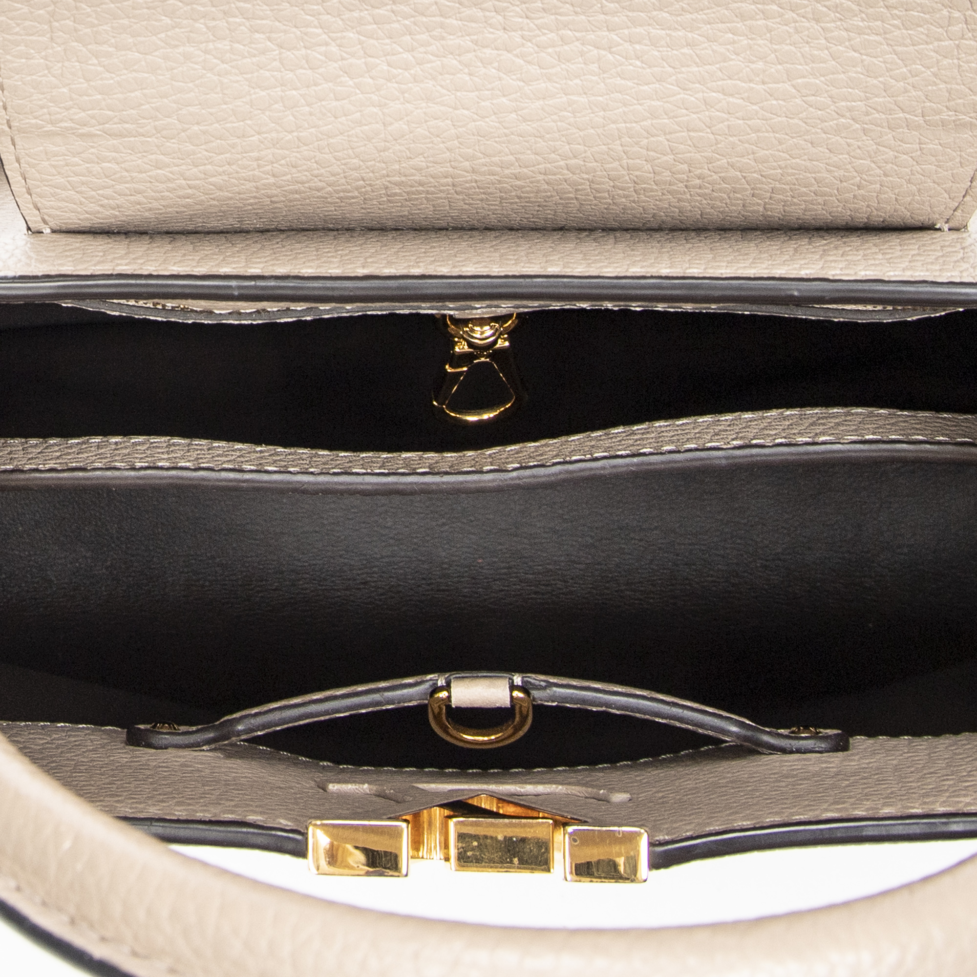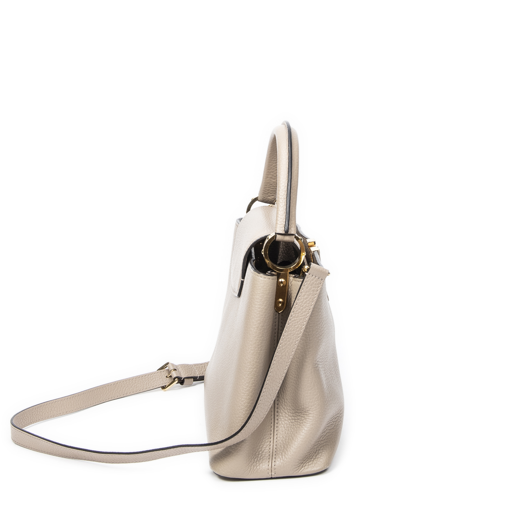 Louis Vuitton Sac à bandoulière Capucines MM en Taupe et Cuivre d’Or. Le produit est en Excellent état (A).