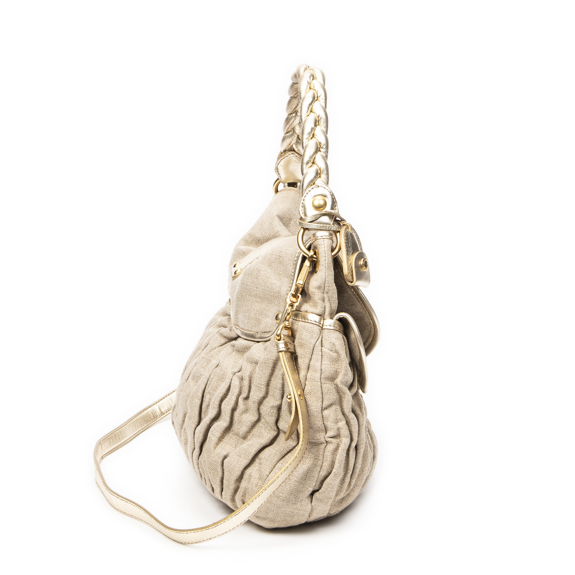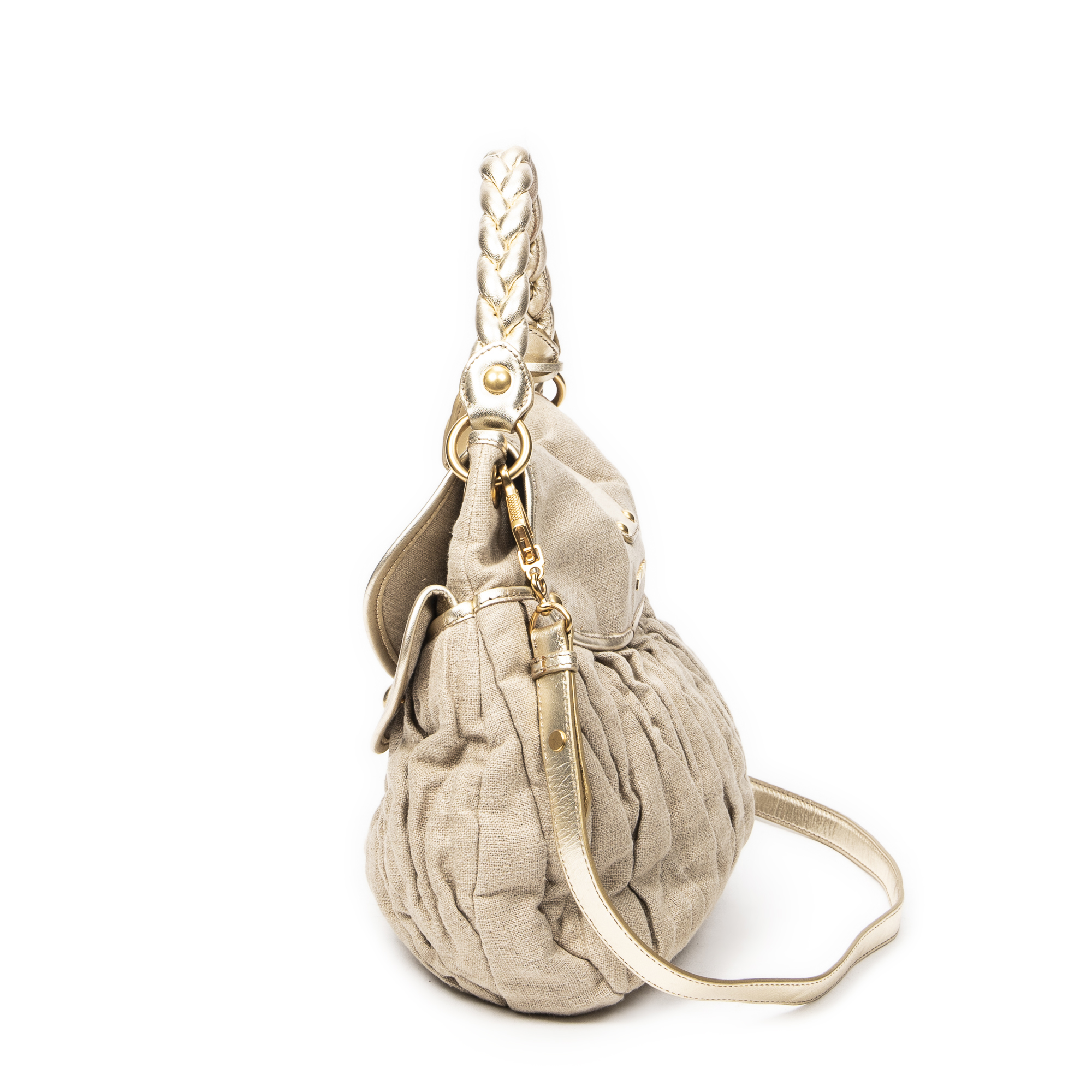 Miu Miu Sac à bandoulière Coffer Double Pocket Hobo en Beige/Or et Or. Le produit est en Excellent état (A).
