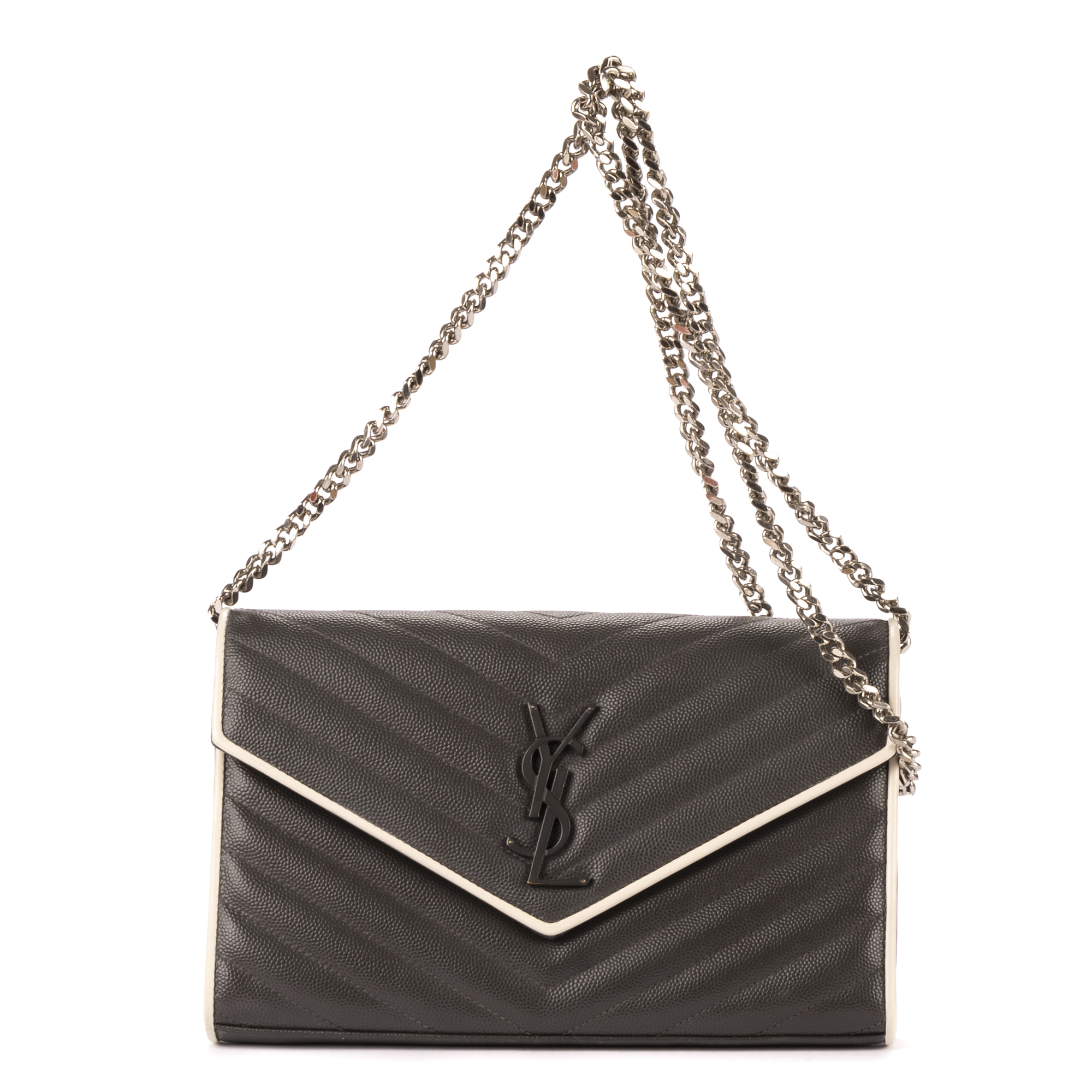 Yves Saint Laurent Sac à bandoulière Cassandre Enveloppe Chain Wallet en Gris/Blanc et Argent. Le produit est en Parfait état (AA).