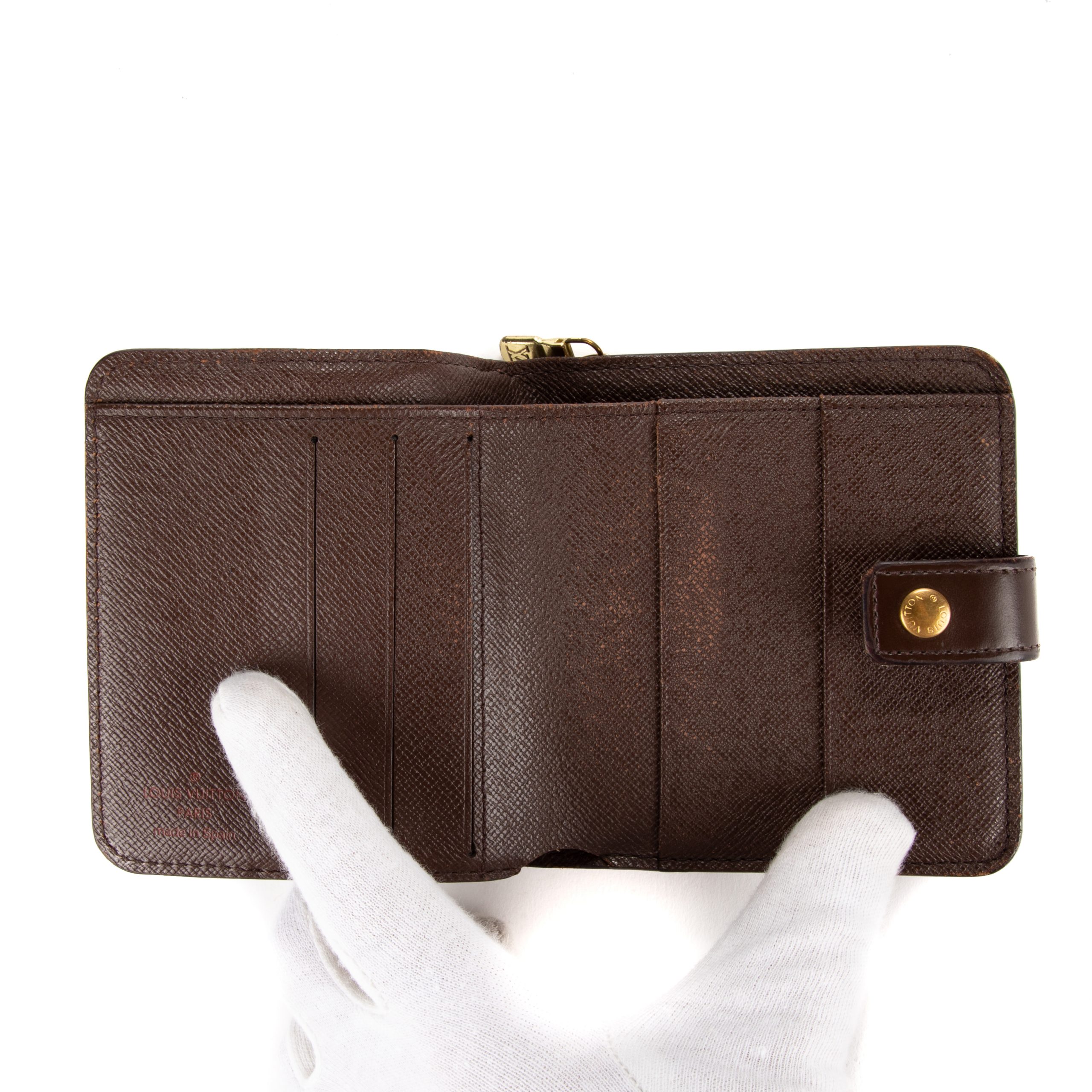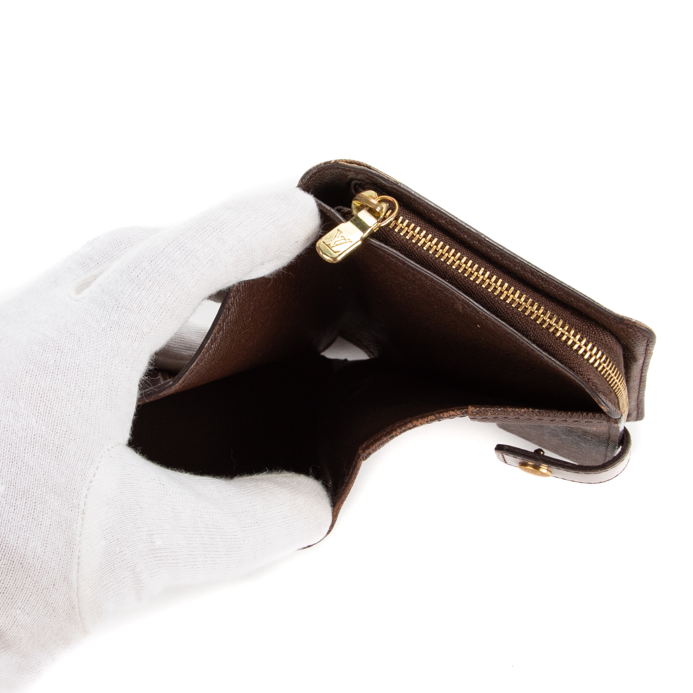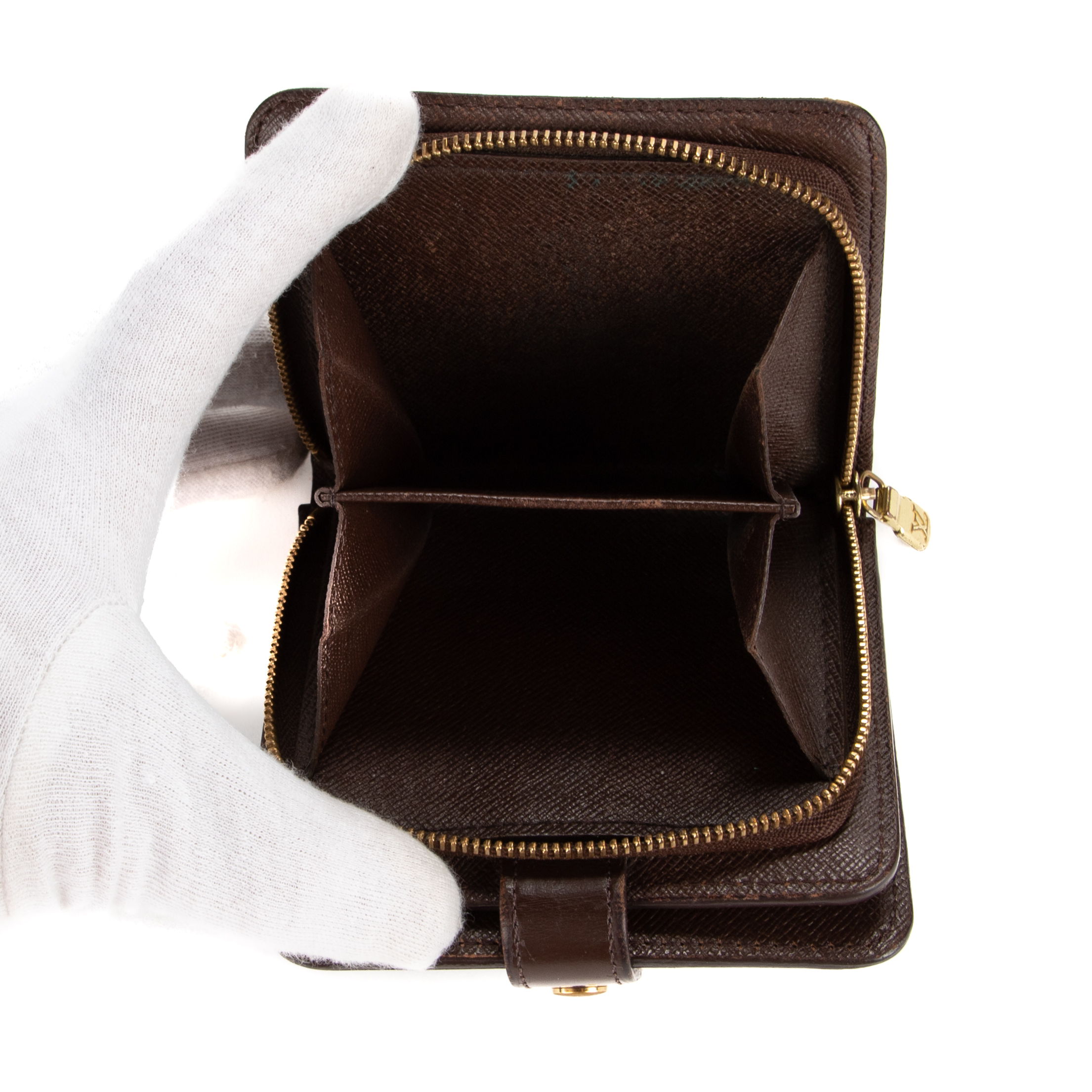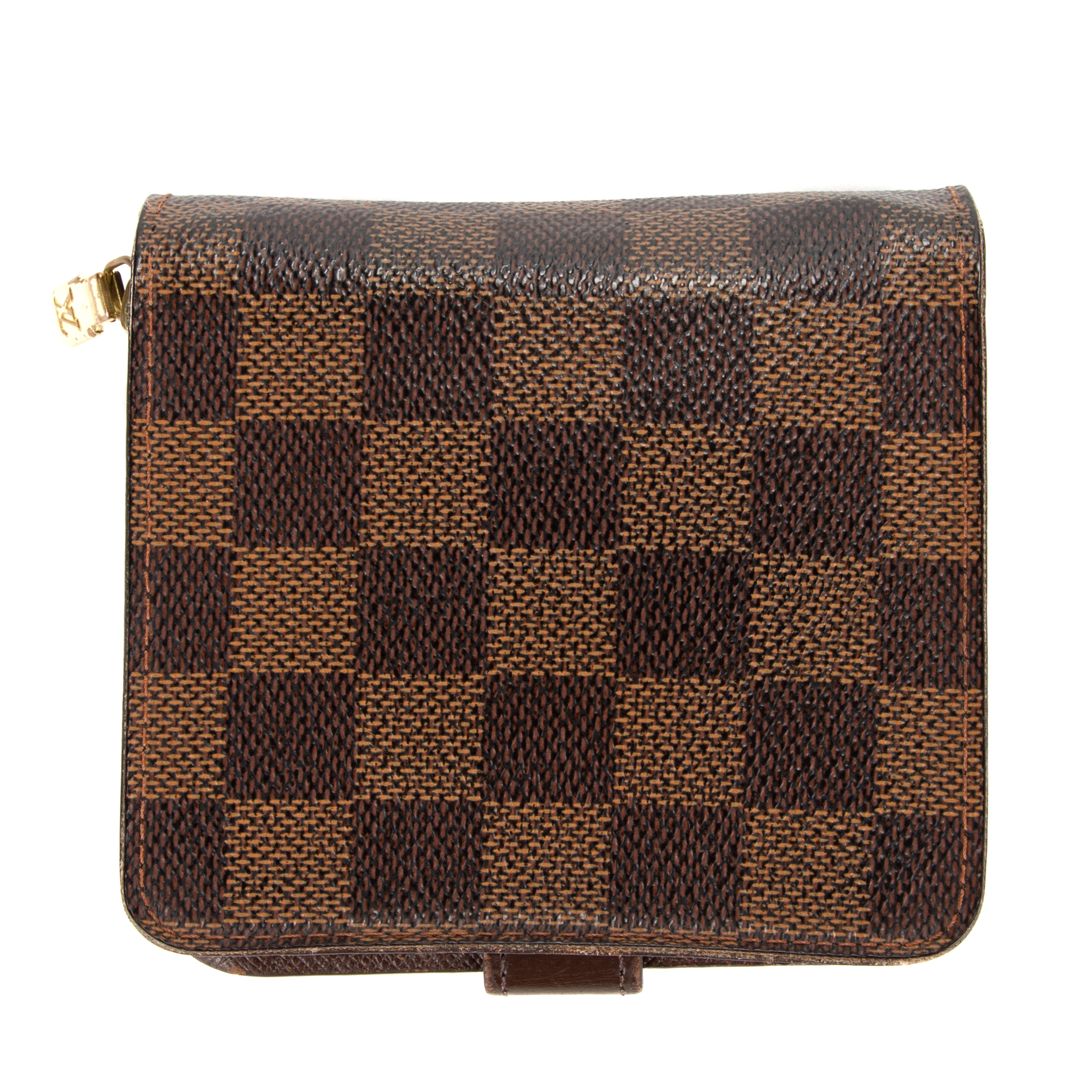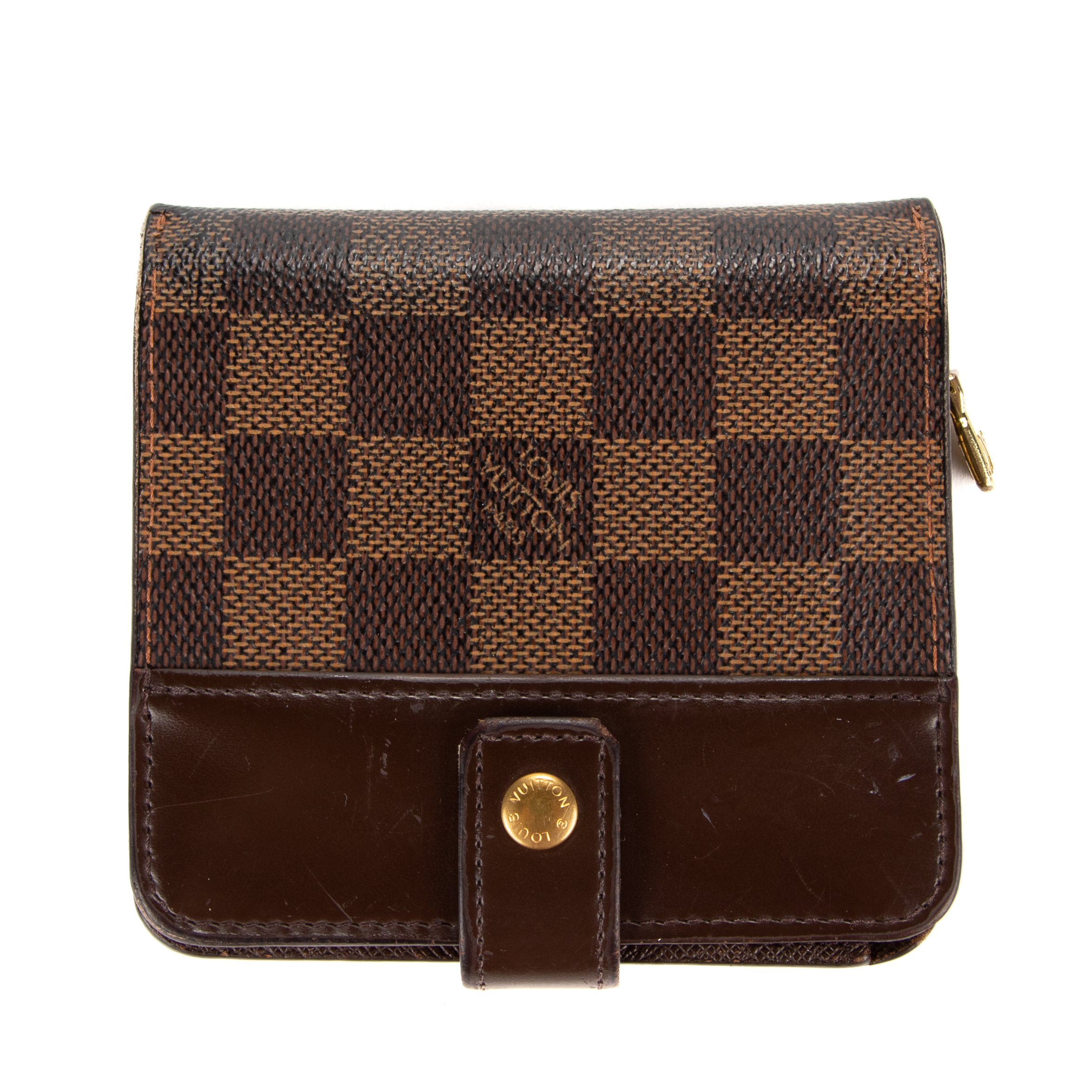 Louis Vuitton Portefeuille Compact Zip Wallet PM en Marron et Laiton doré. Le produit est en Très Bon état (AB).