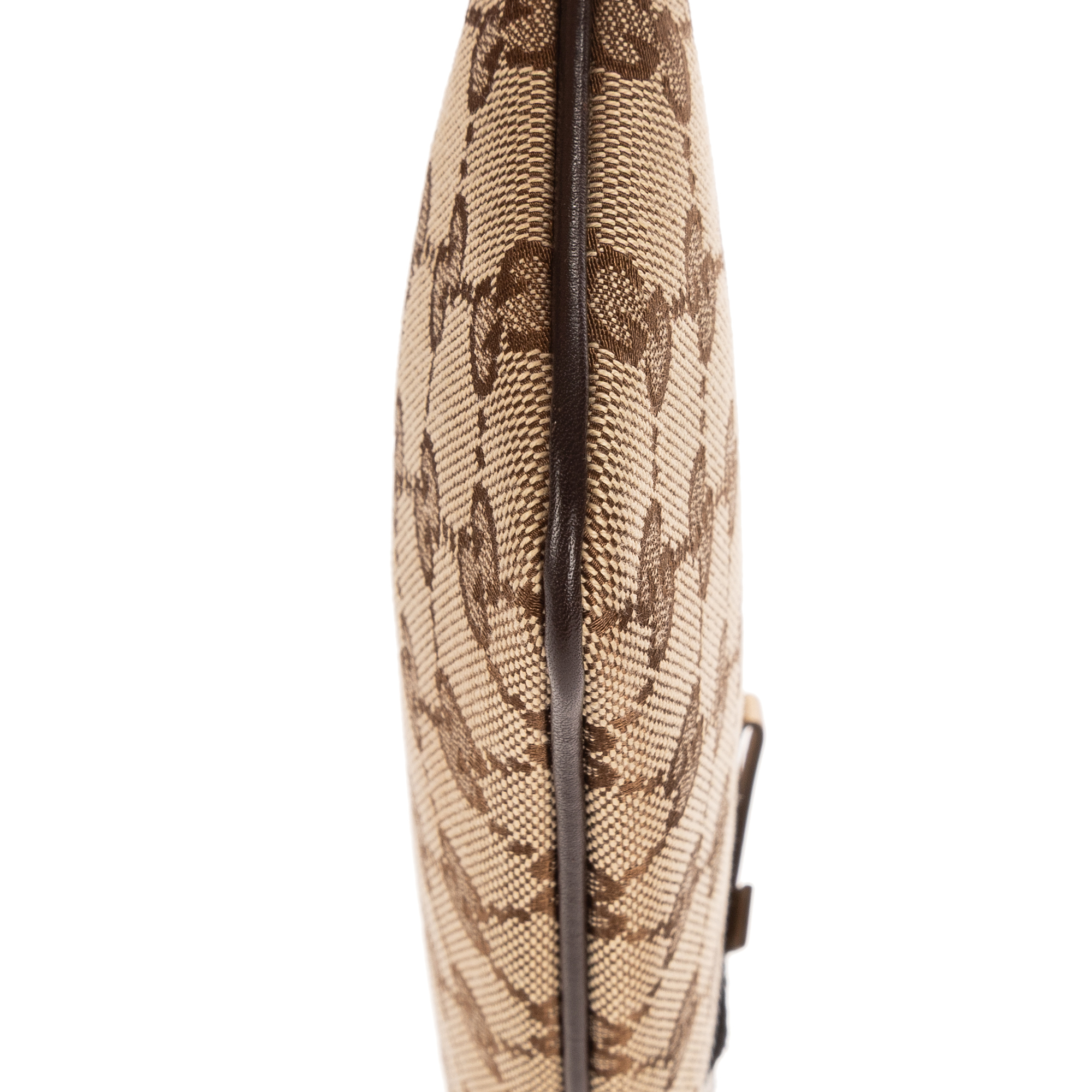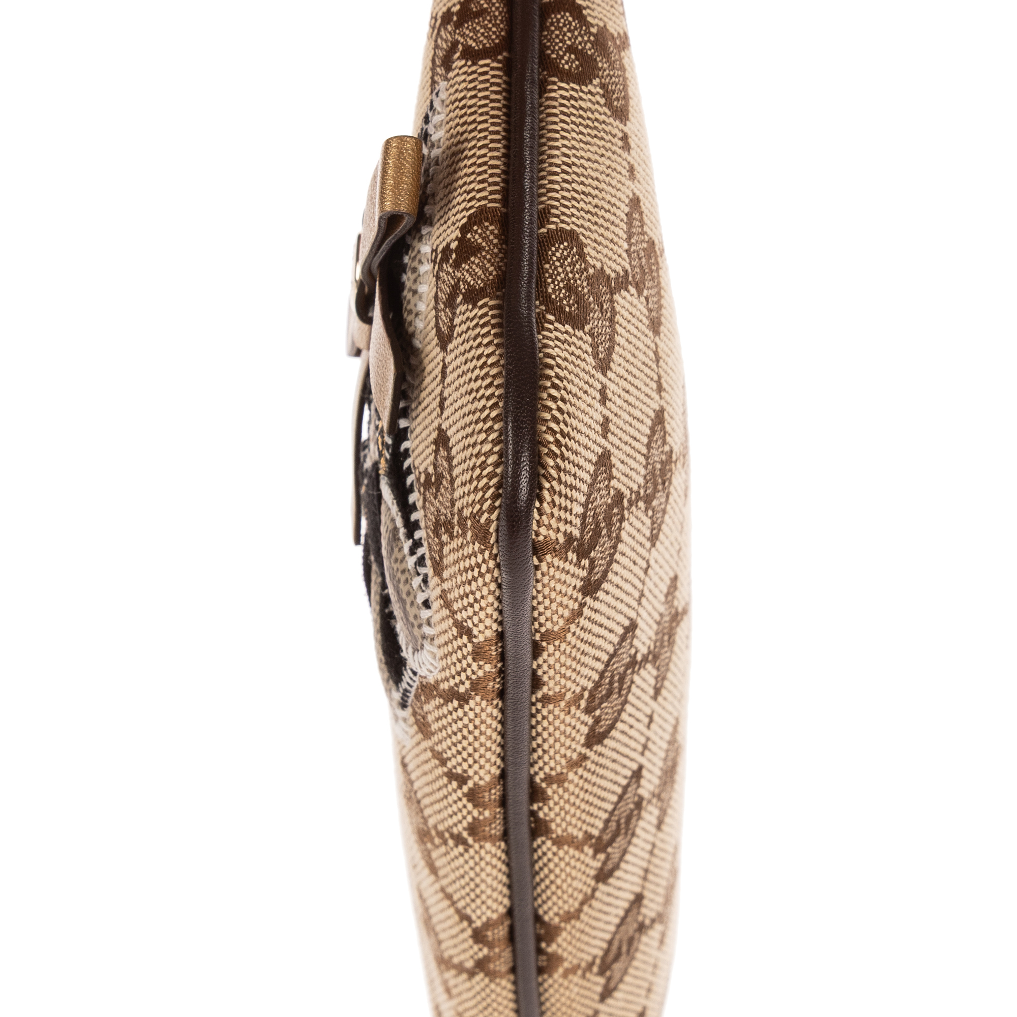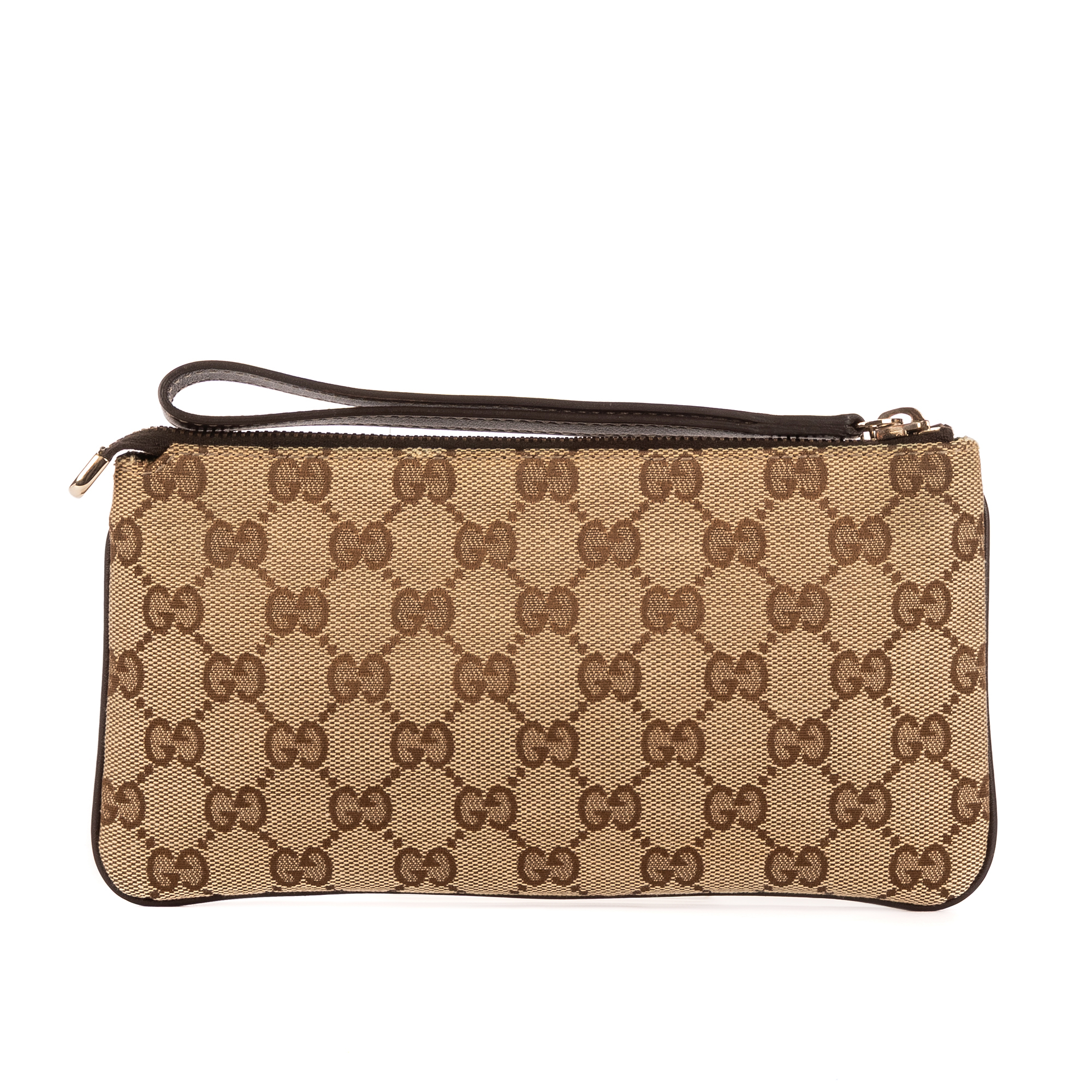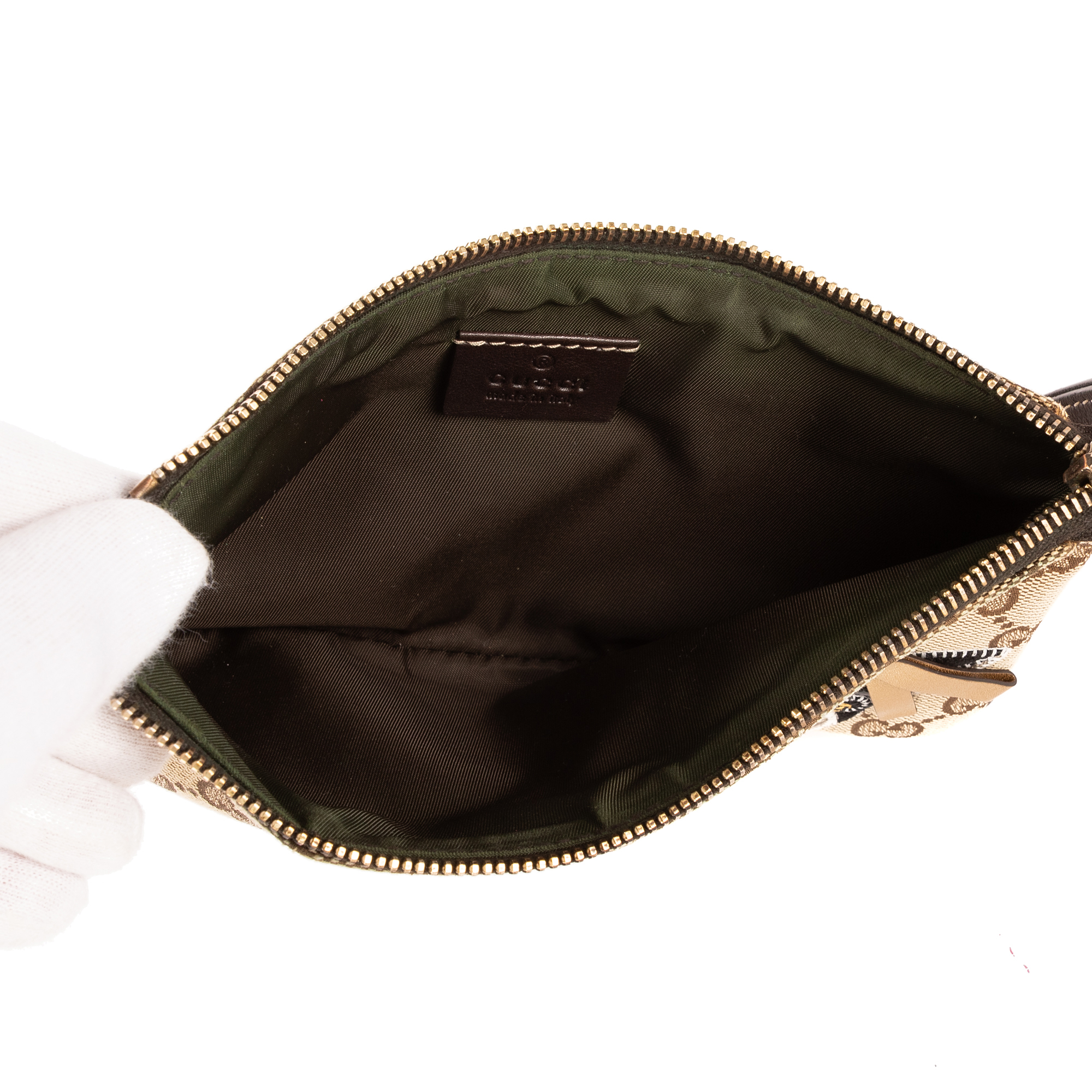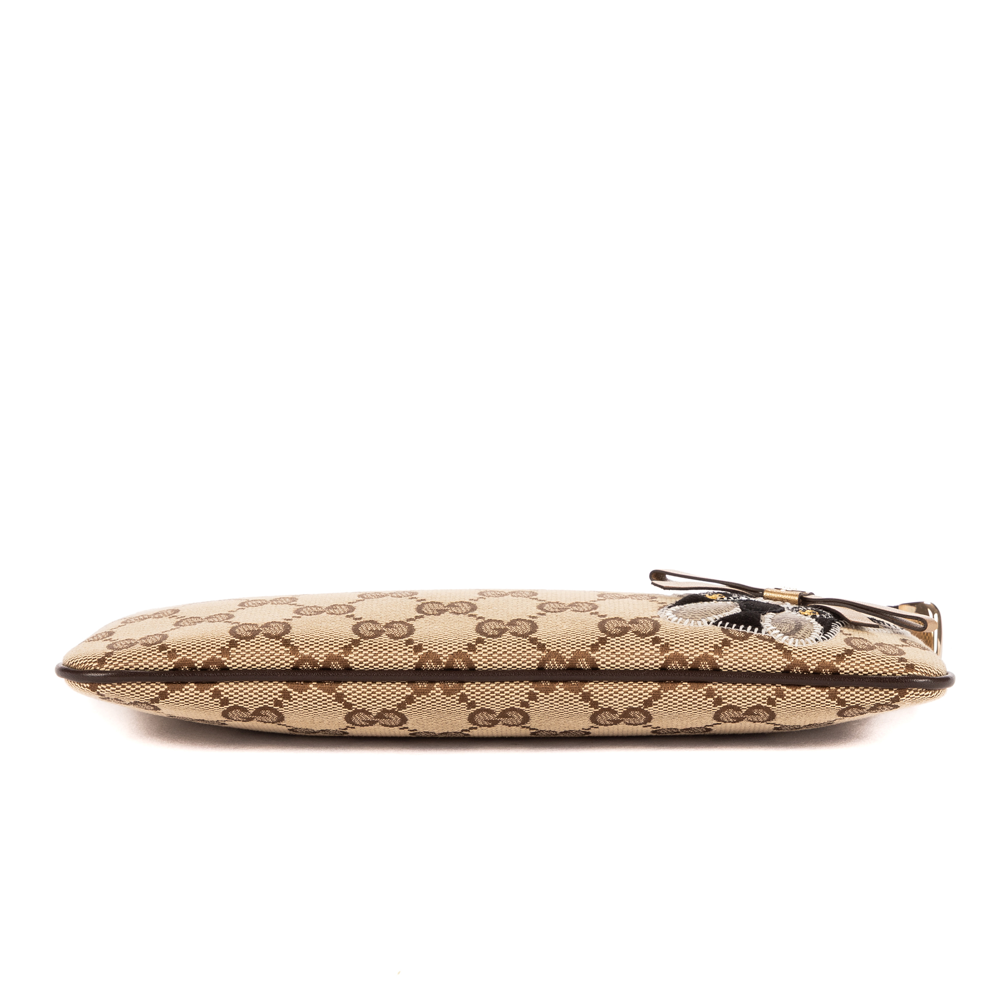 Gucci Pouch Guccioli French Bulldog Wristlet Pouch in Beige Monogram Canvas with Leather trim and Champagne Gold hardware. The product is in Perfect Condition (AA).