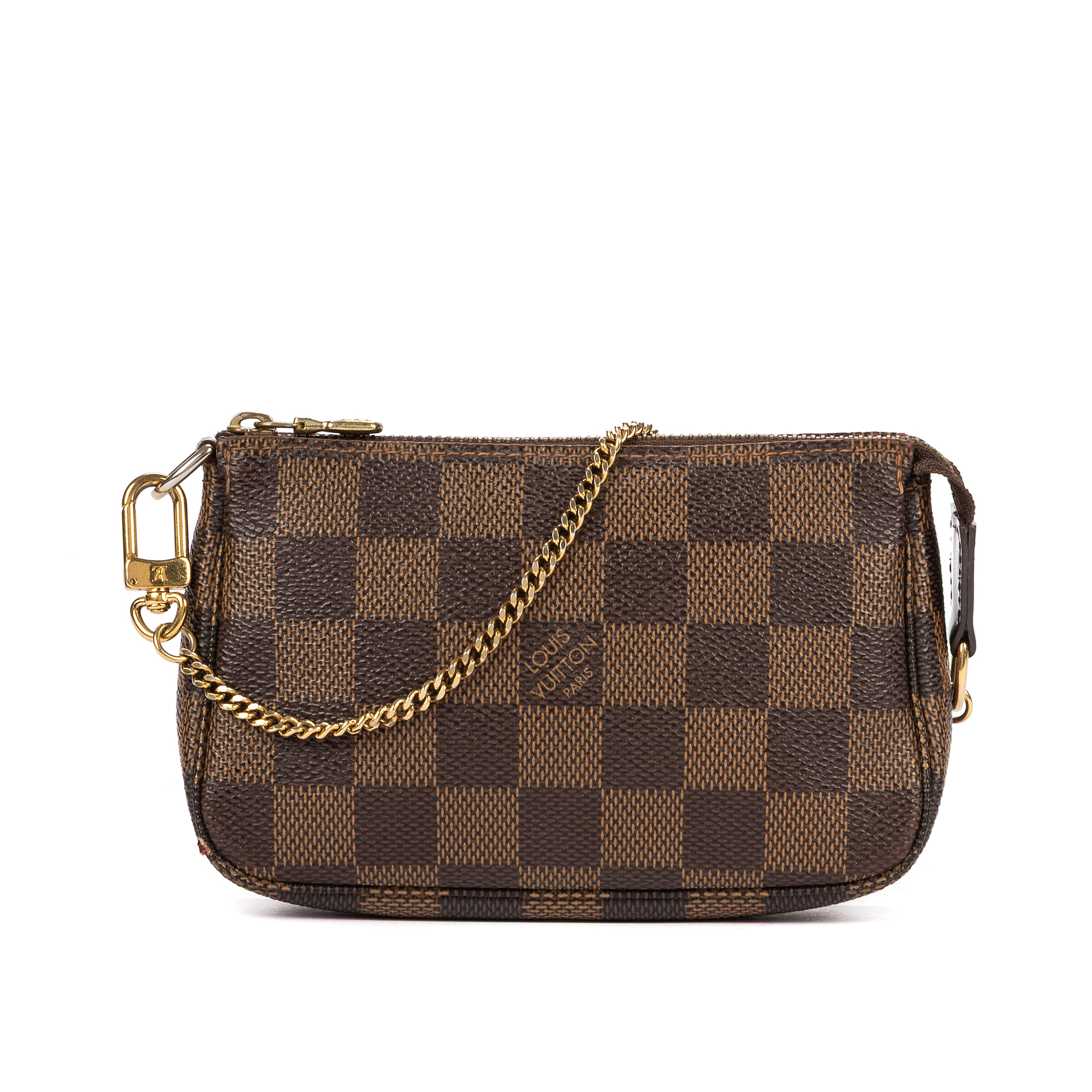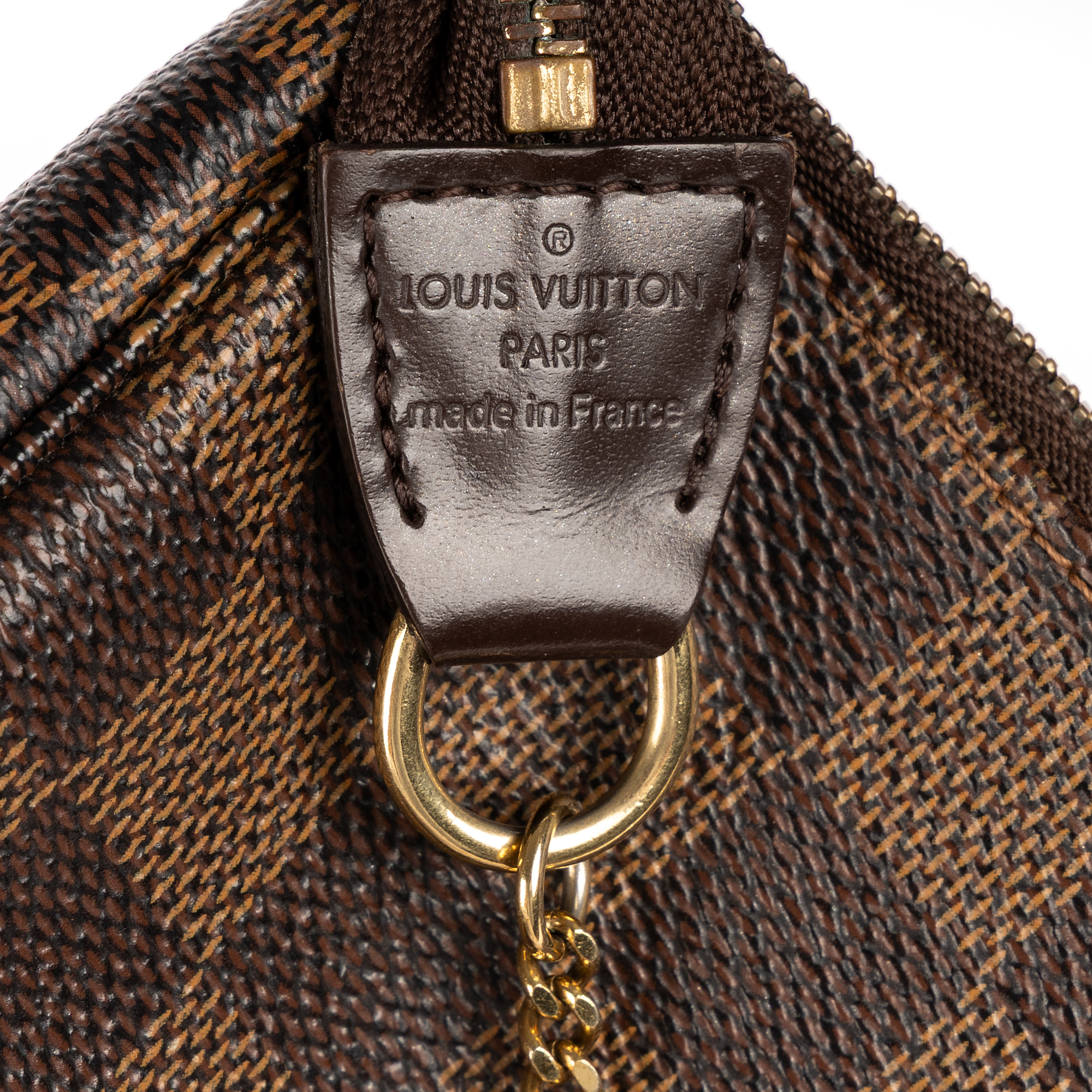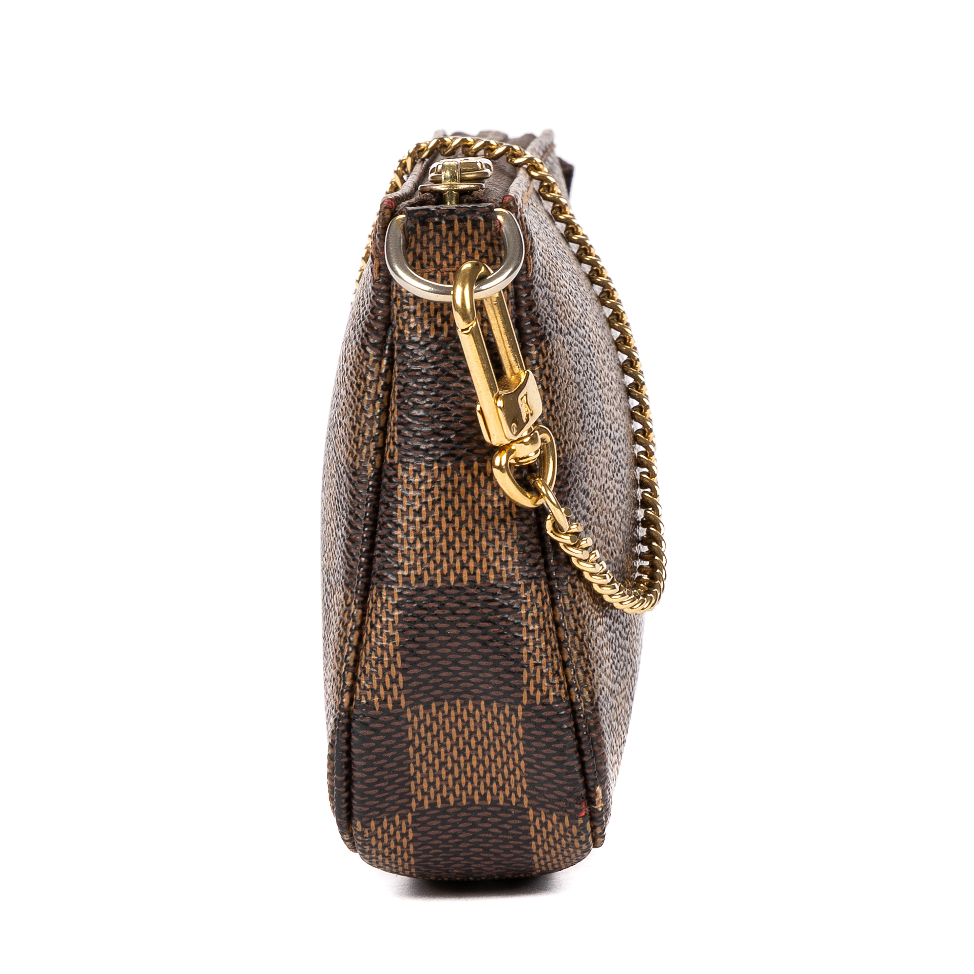 Louis Vuitton Pouch Mini Pochette Mini in Dark Brown Damier Ebene and Golden Brass hardware. The product is in Very Good Condition (AB).