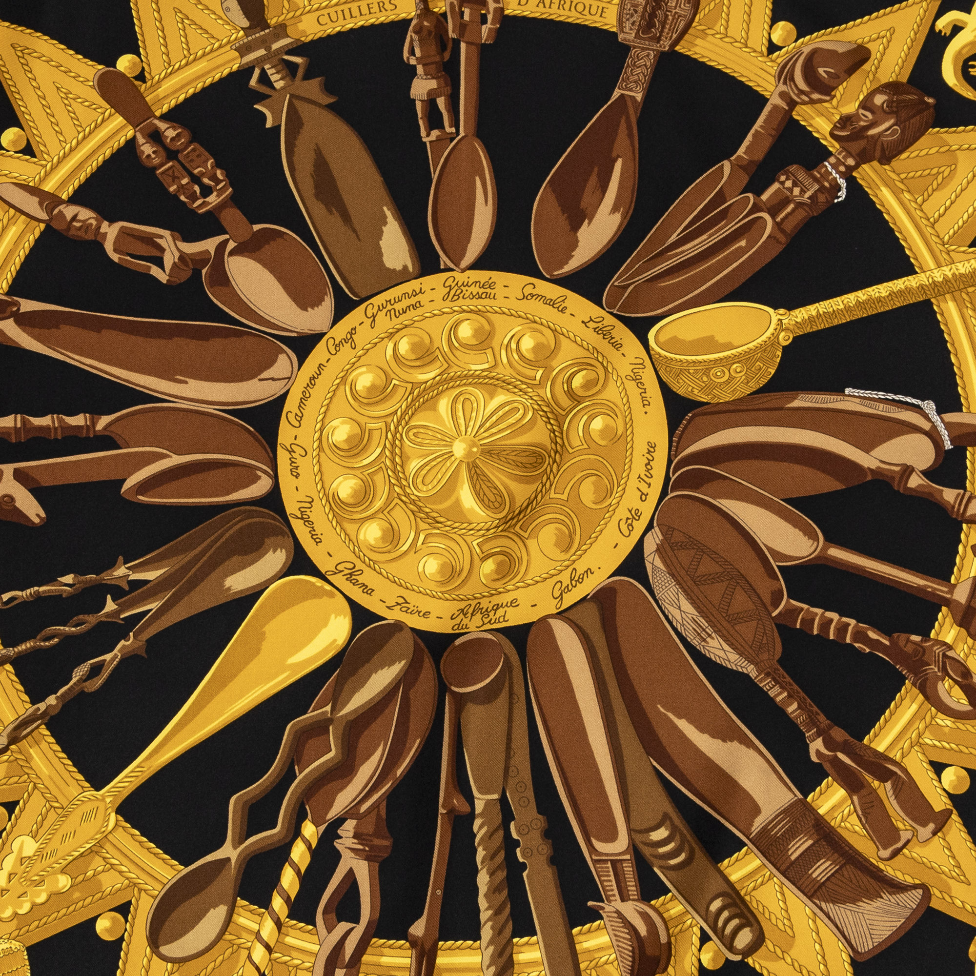 Description : Hermès Scarf Scarf in Black/Gold/Brown 100% Twill Silk and None hardware. The product is in Excellent Condition (A). Dimensions: 90 cm Size: None SKU: ABC6163 Serial number: Cuillers D'Afrique by Caty Latham Accessories Included: None Delivery: We have a 5 to 7 business days delivery policy, hassle-free and duties/tariffs included! BrandCo Paris finds rare and top condition items at great deals, they are worth your patience! Shop with confidence - All BrandCo Paris items are carefully selected and authenticated by our team of experts. All the items come with an authenticity certificate and packaging delivered by BrandCo Paris. Item Condition Grading Table N (Like New) AA (Perfect Condition) A (Excellent Condition) AB (Very Good Condition) B (Good/Fair)