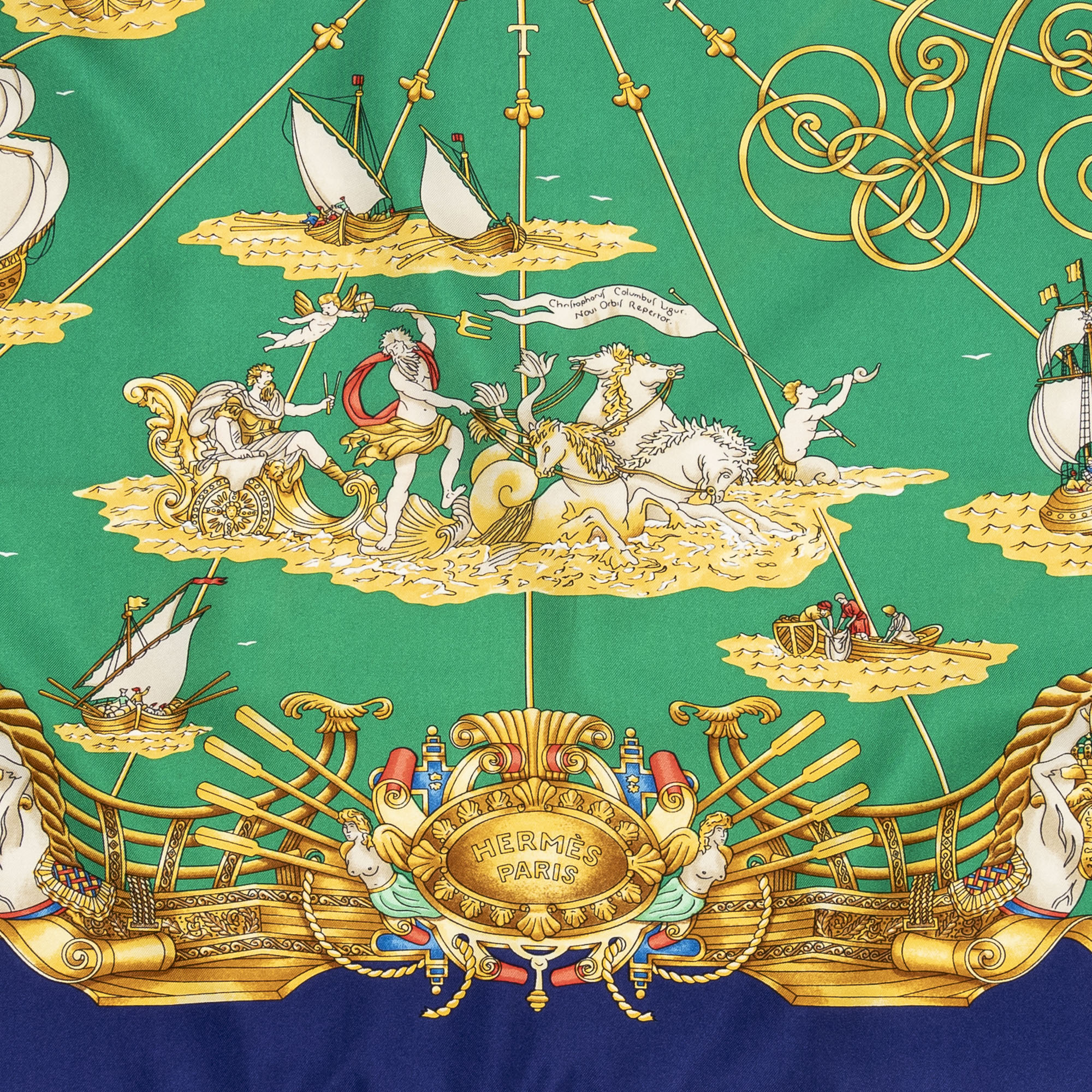 Hermès Scarf Scarf in Navy/Green/Gold 100% Twill Silk and None hardware. The product is in Perfect Condition (AA).