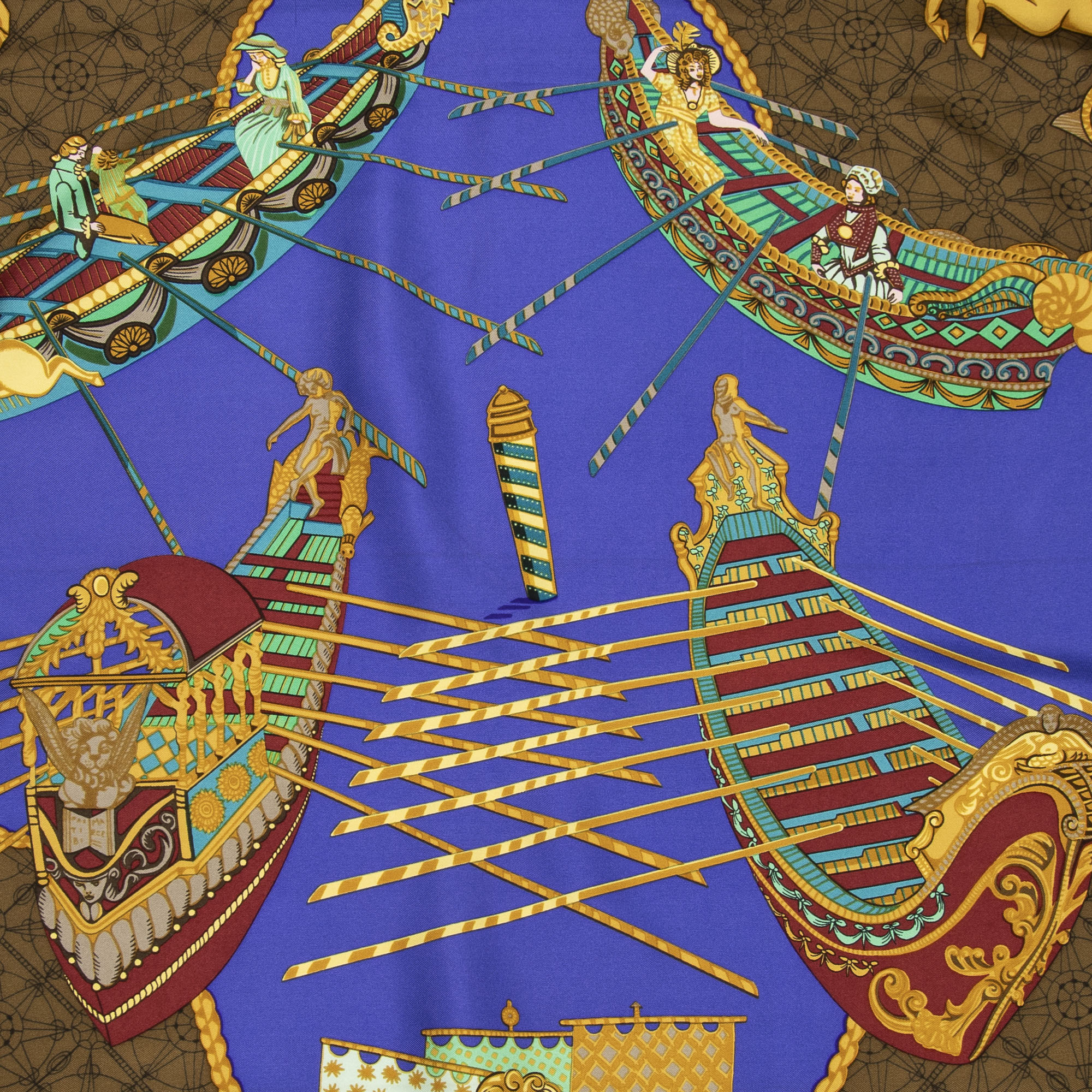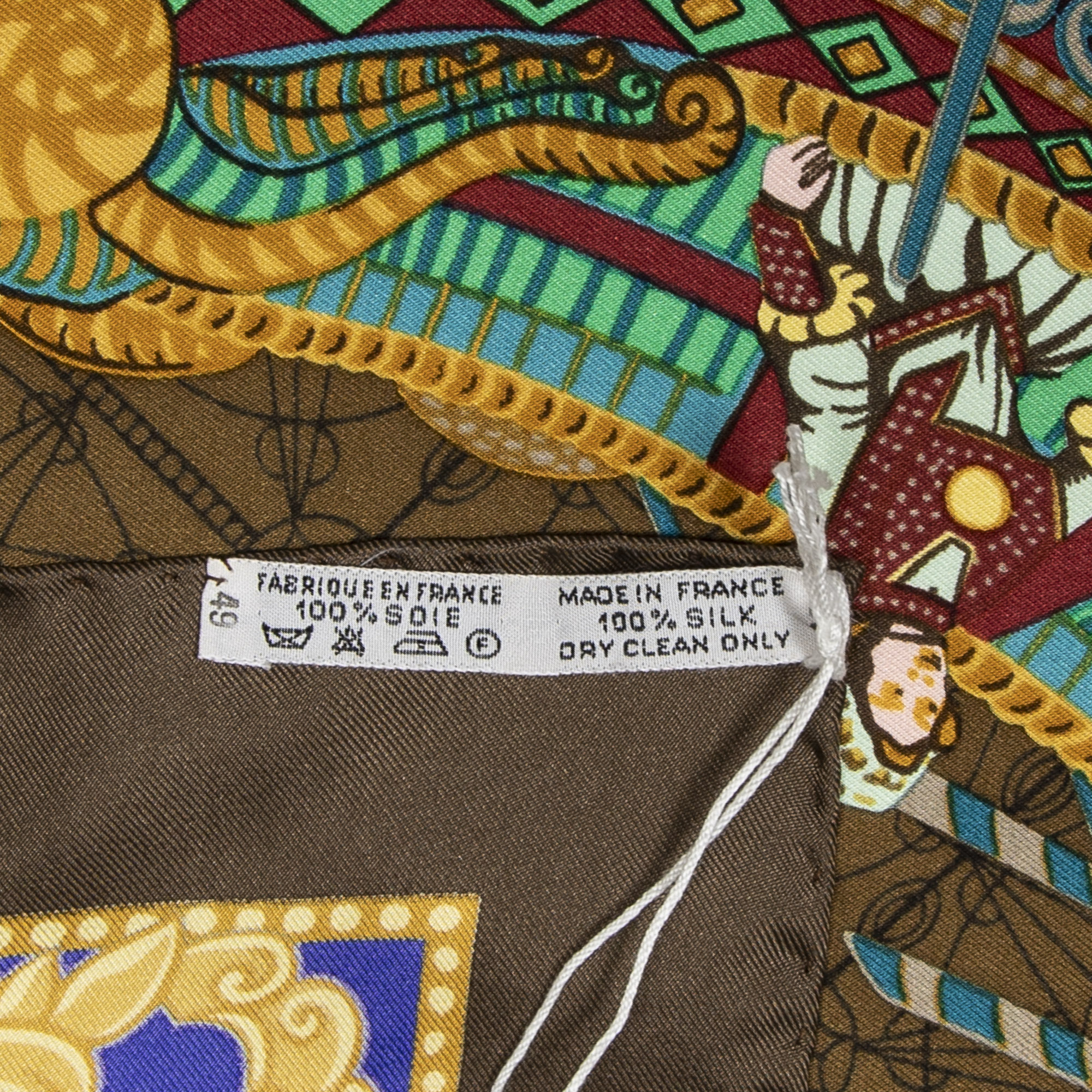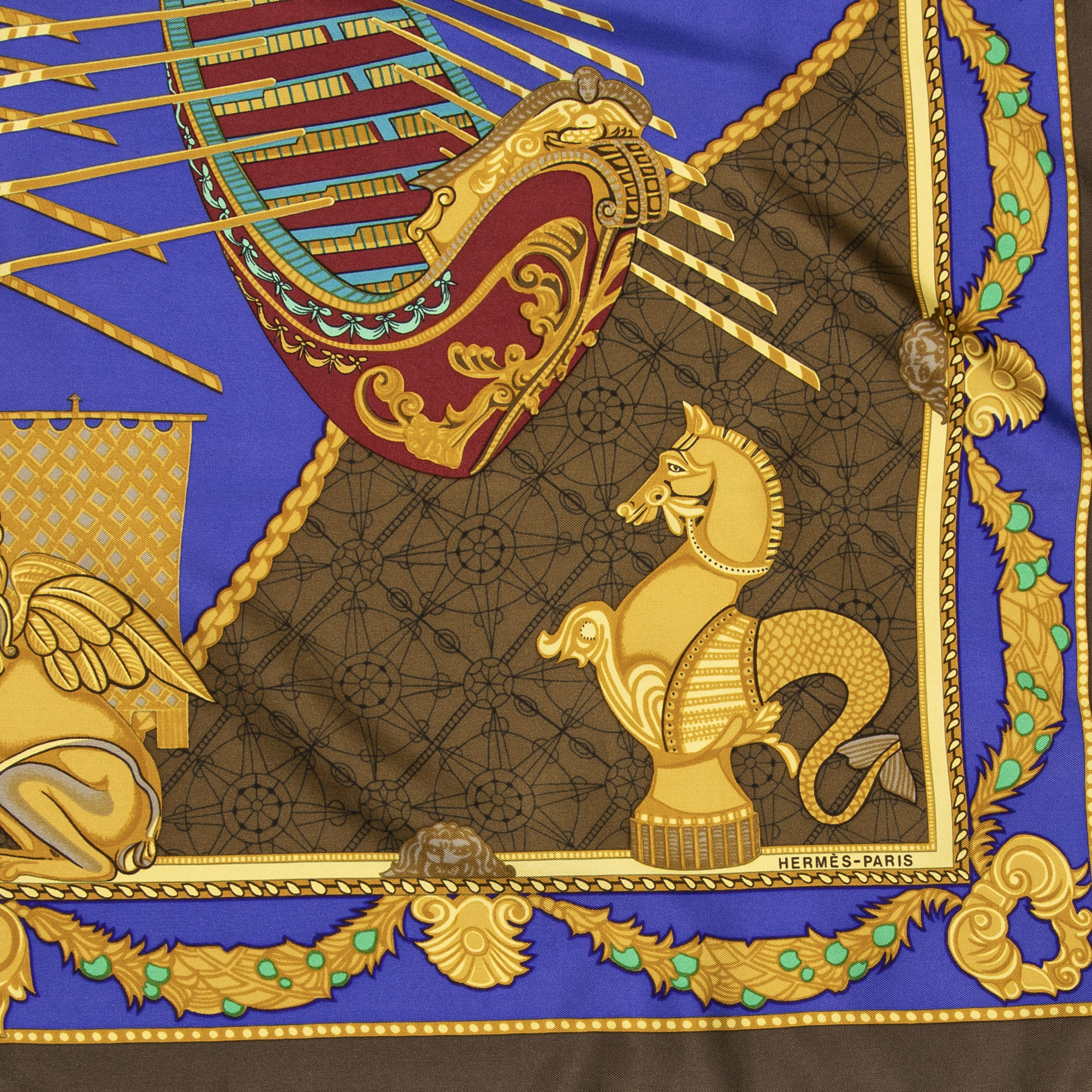 Hermès Scarf Scarf in Brown/Blue/Gold 100% Twill Silk and hardware. The product is in Perfect Condition (AA).