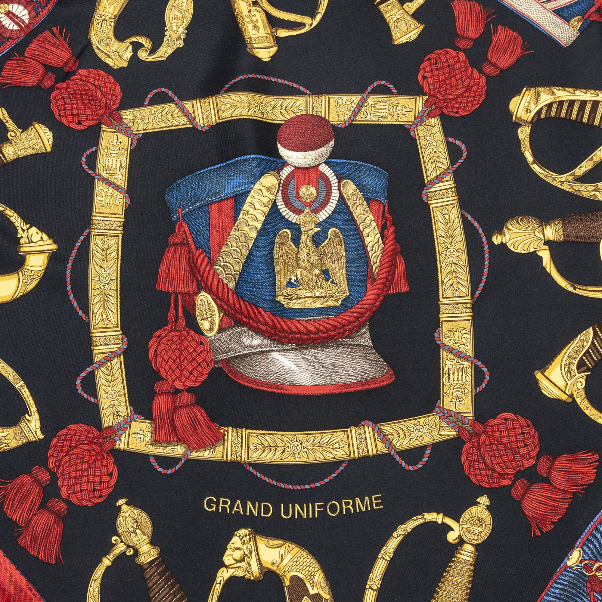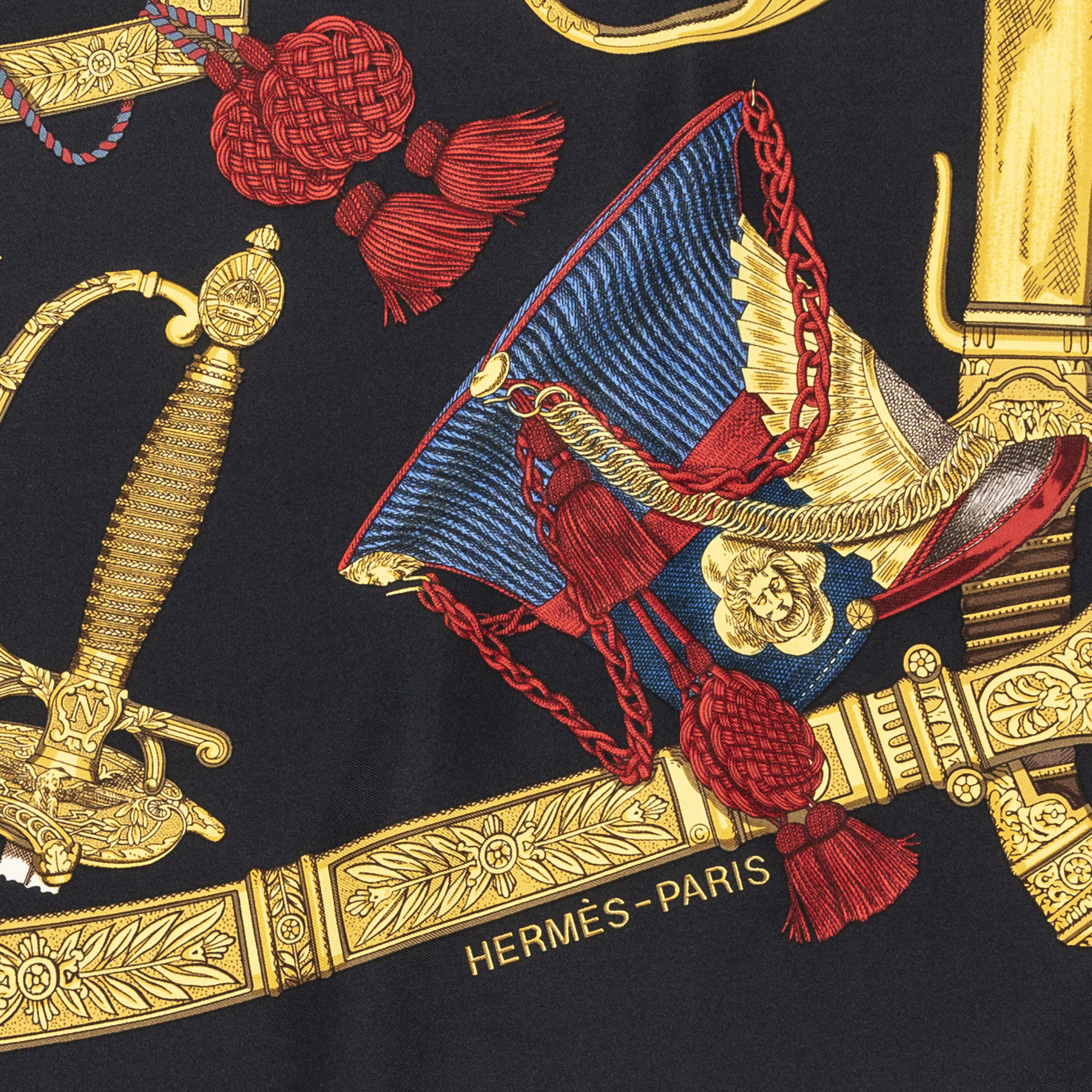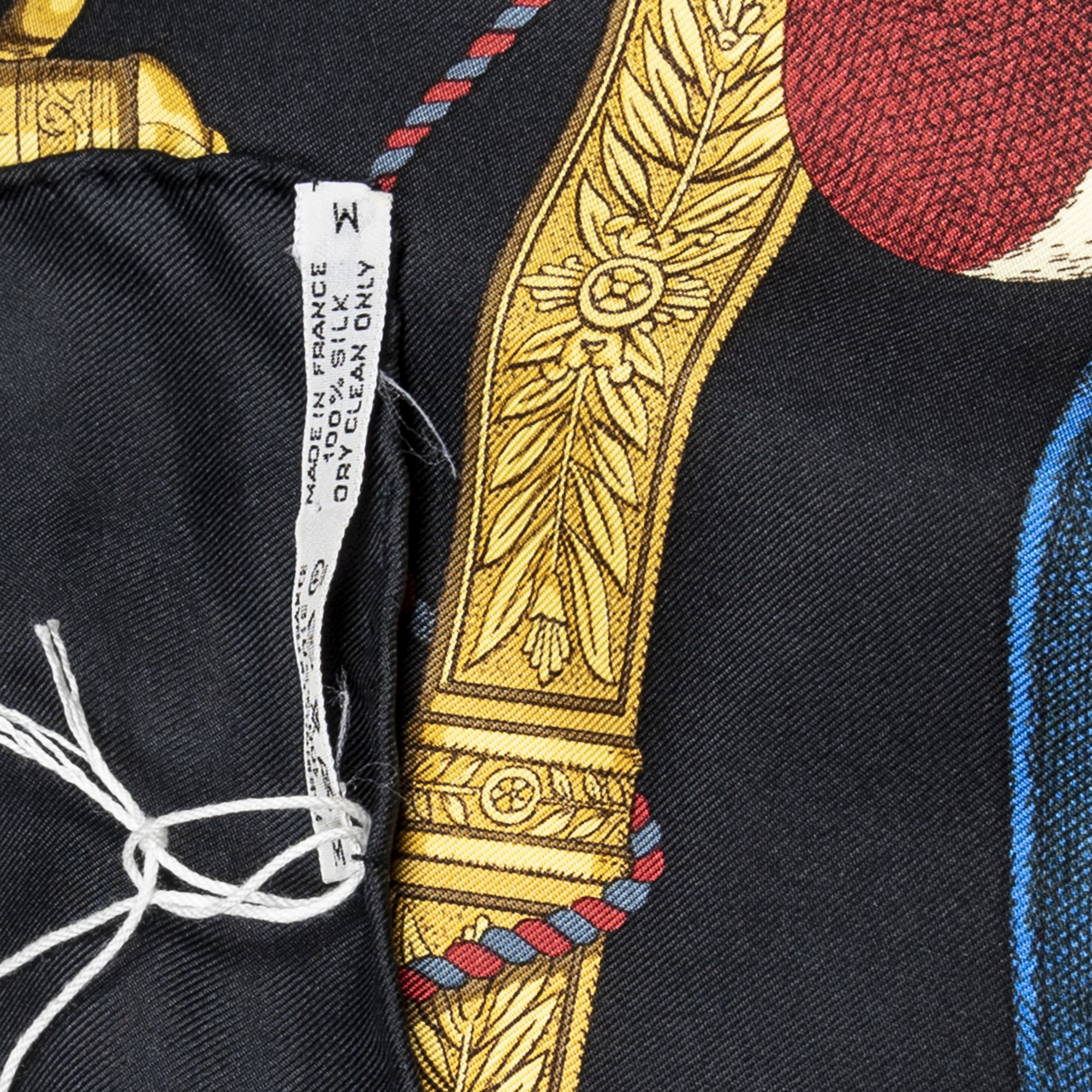 Hermès Scarf Scarf in Black/Red/Gold 100% Twill Silk and None hardware. The product is in Excellent Condition (A).