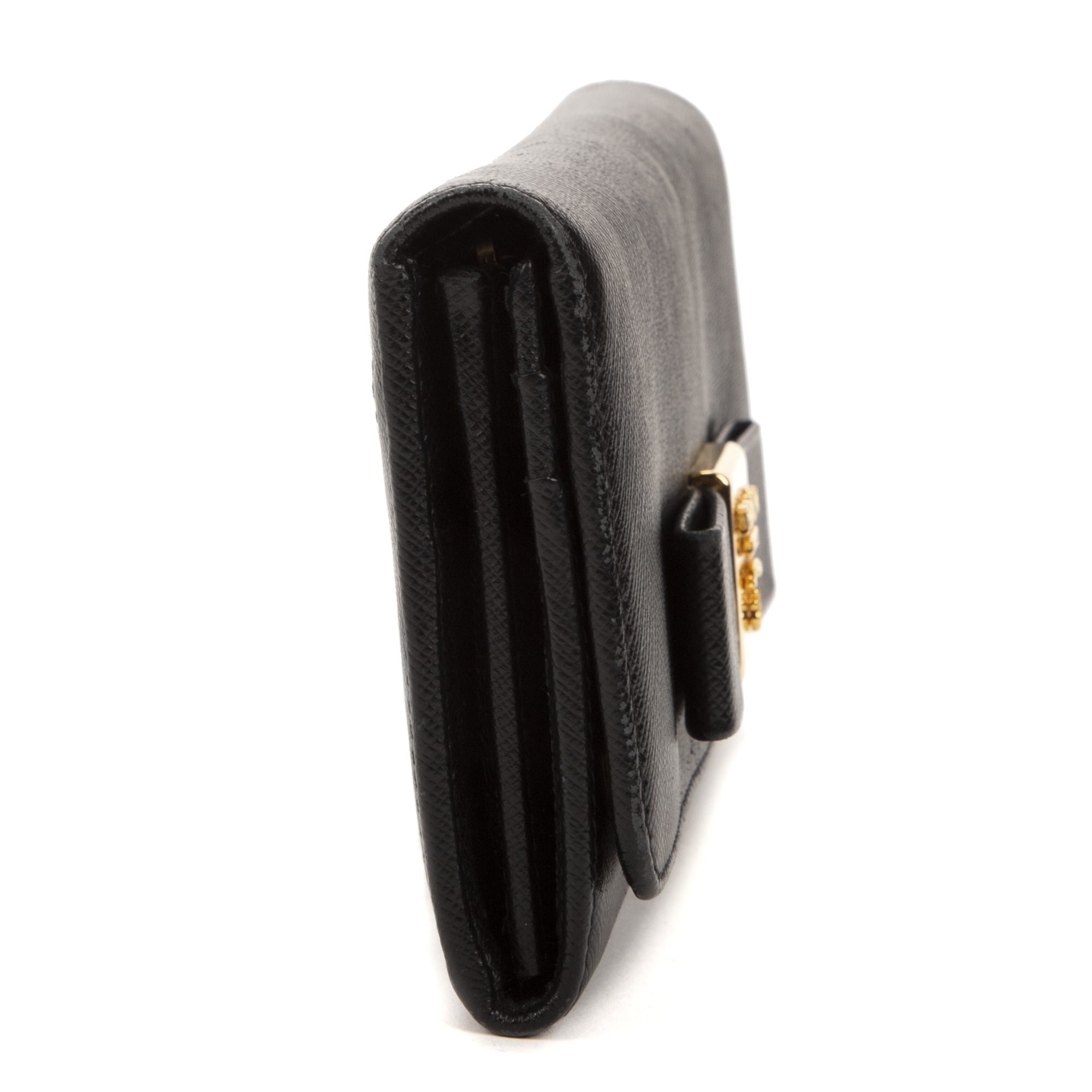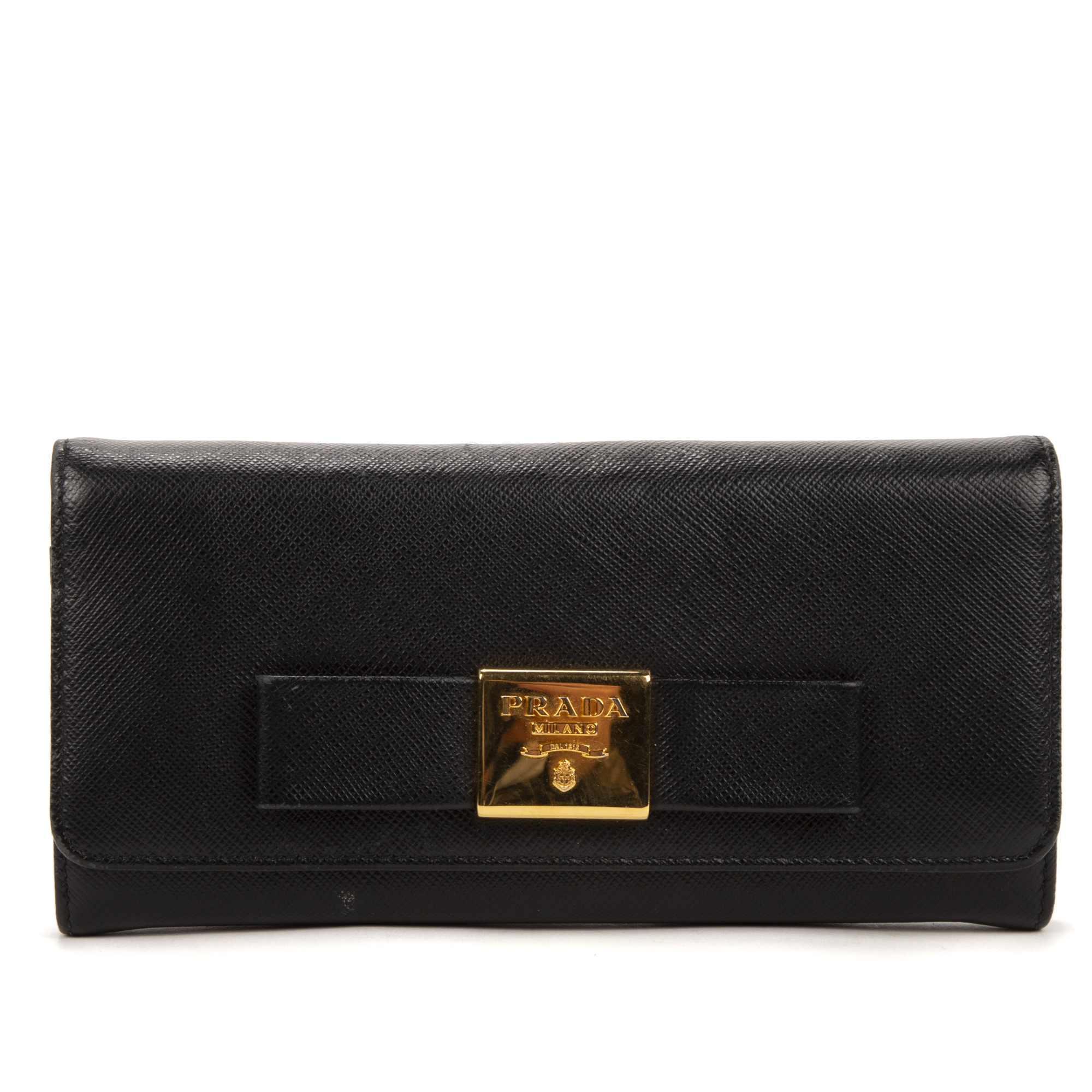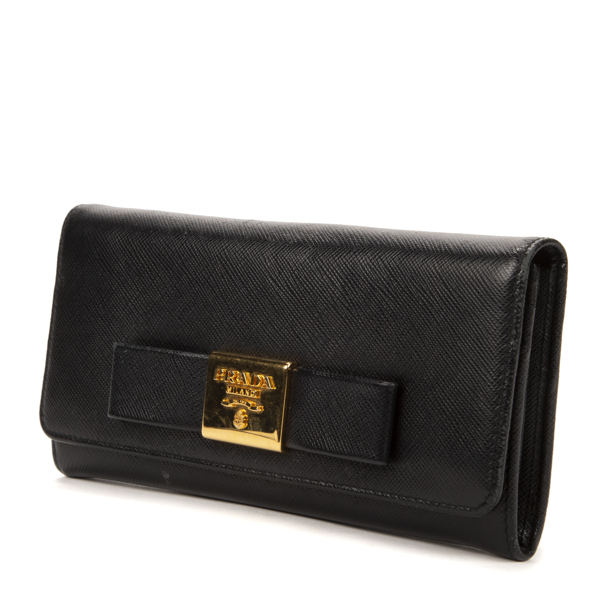 Prada Wallet Bow long wallet in Black Saffiano leather and Gold hardware. The product is in Perfect Condition (AA).