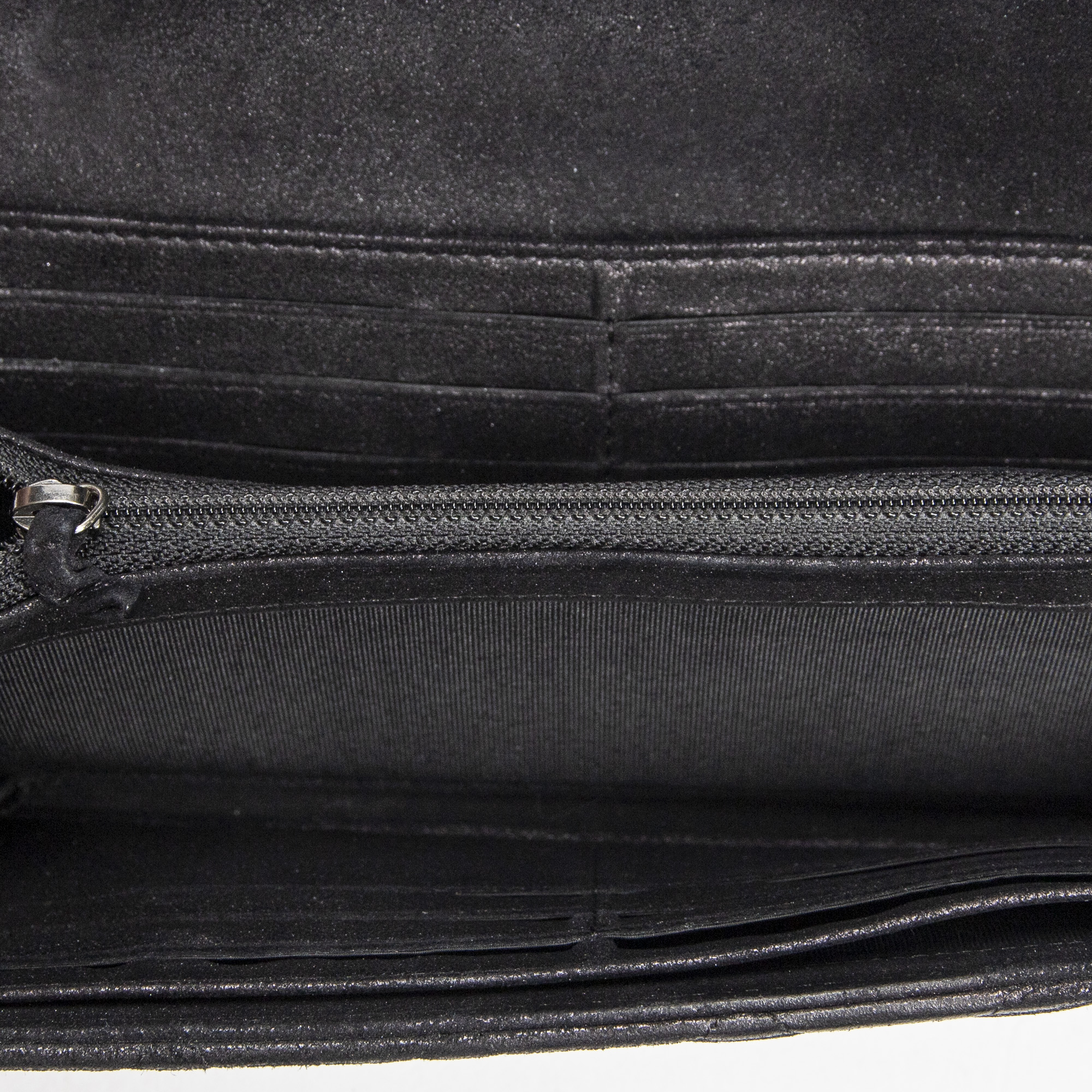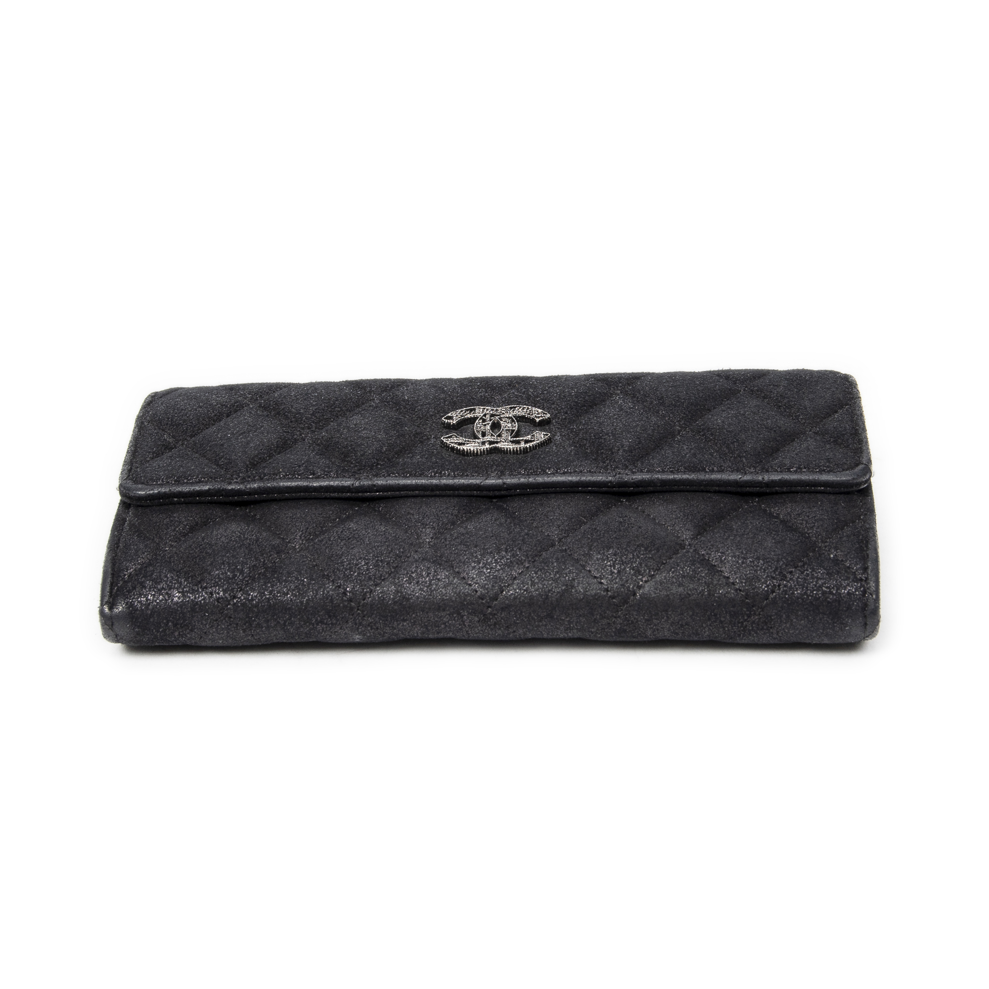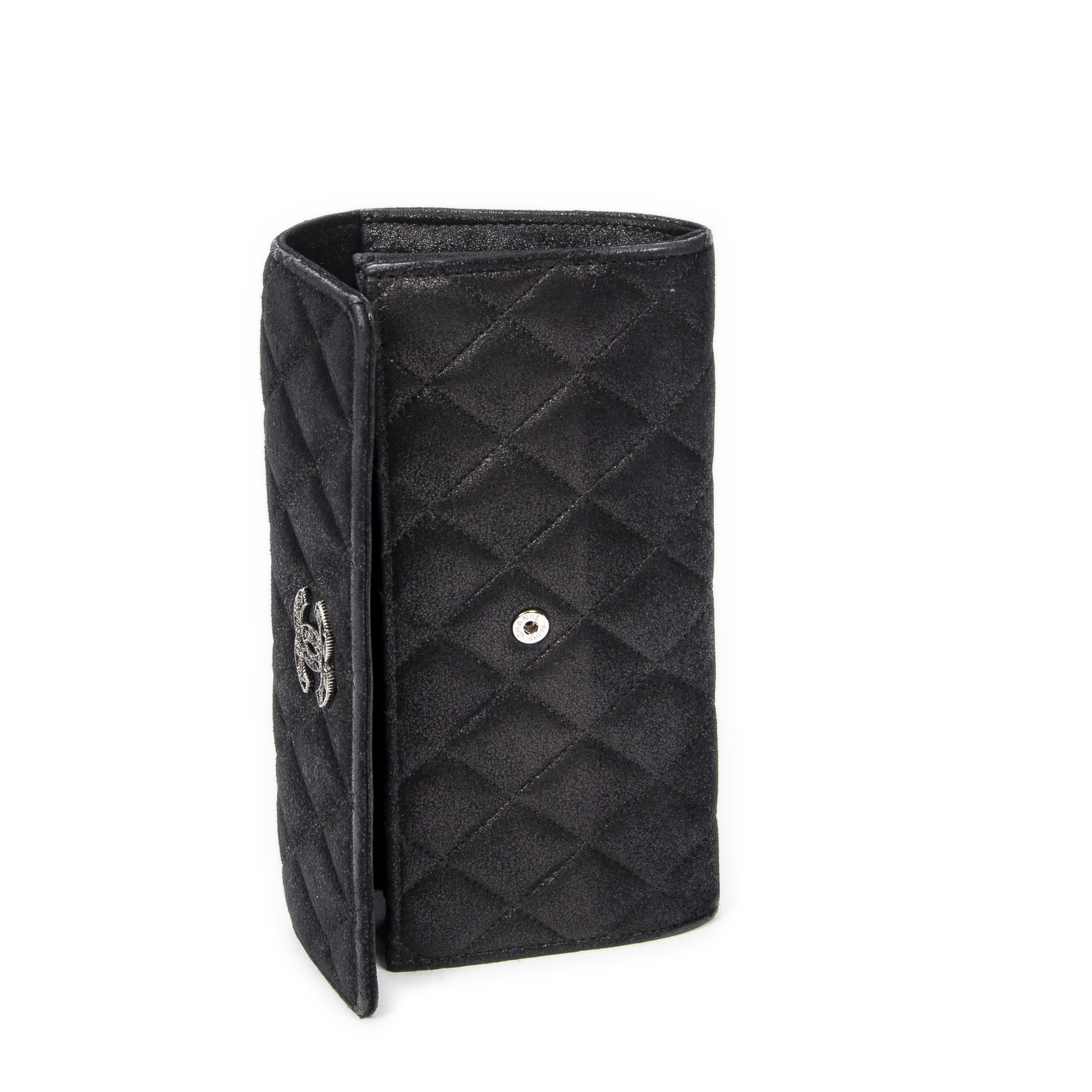 Chanel Wallet L Flap Wallet in Black Quilted Velvet Canvas and Silver hardware. The product is in Excellent Condition (A).