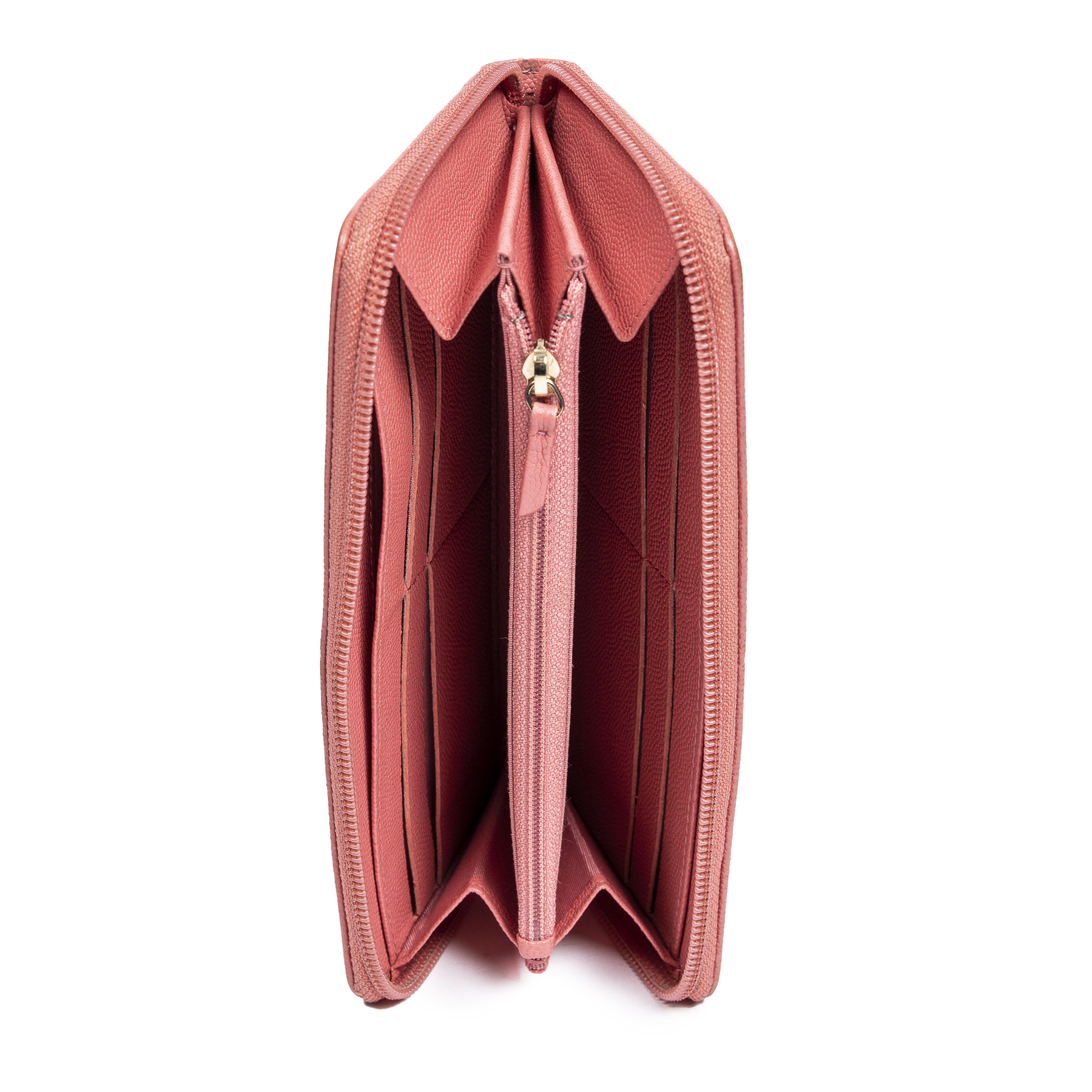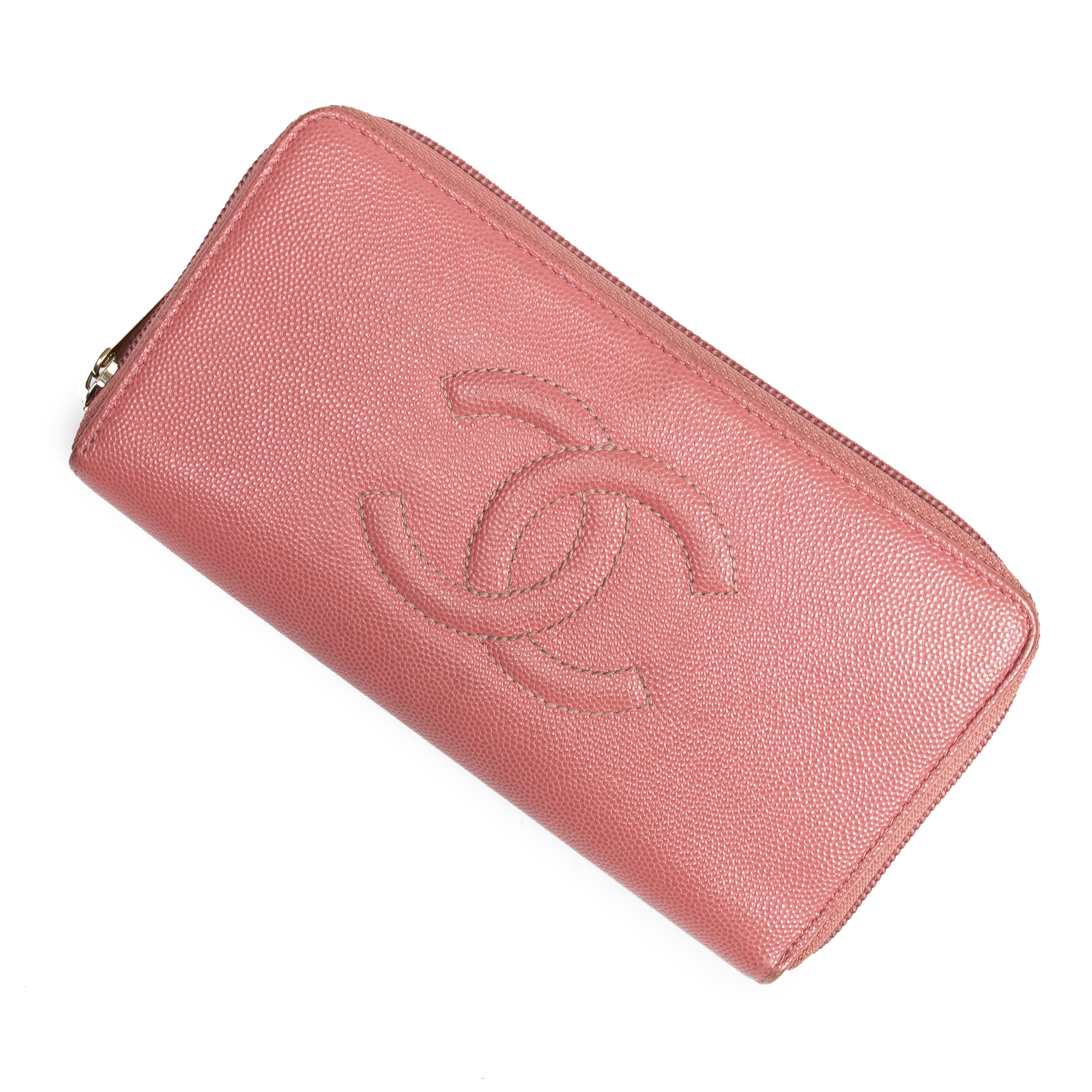Chanel Wallet Timeless CC Zip Around Long Wallet in Pink Caviar Leather and Gold hardware. The product is in Excellent Condition (A).