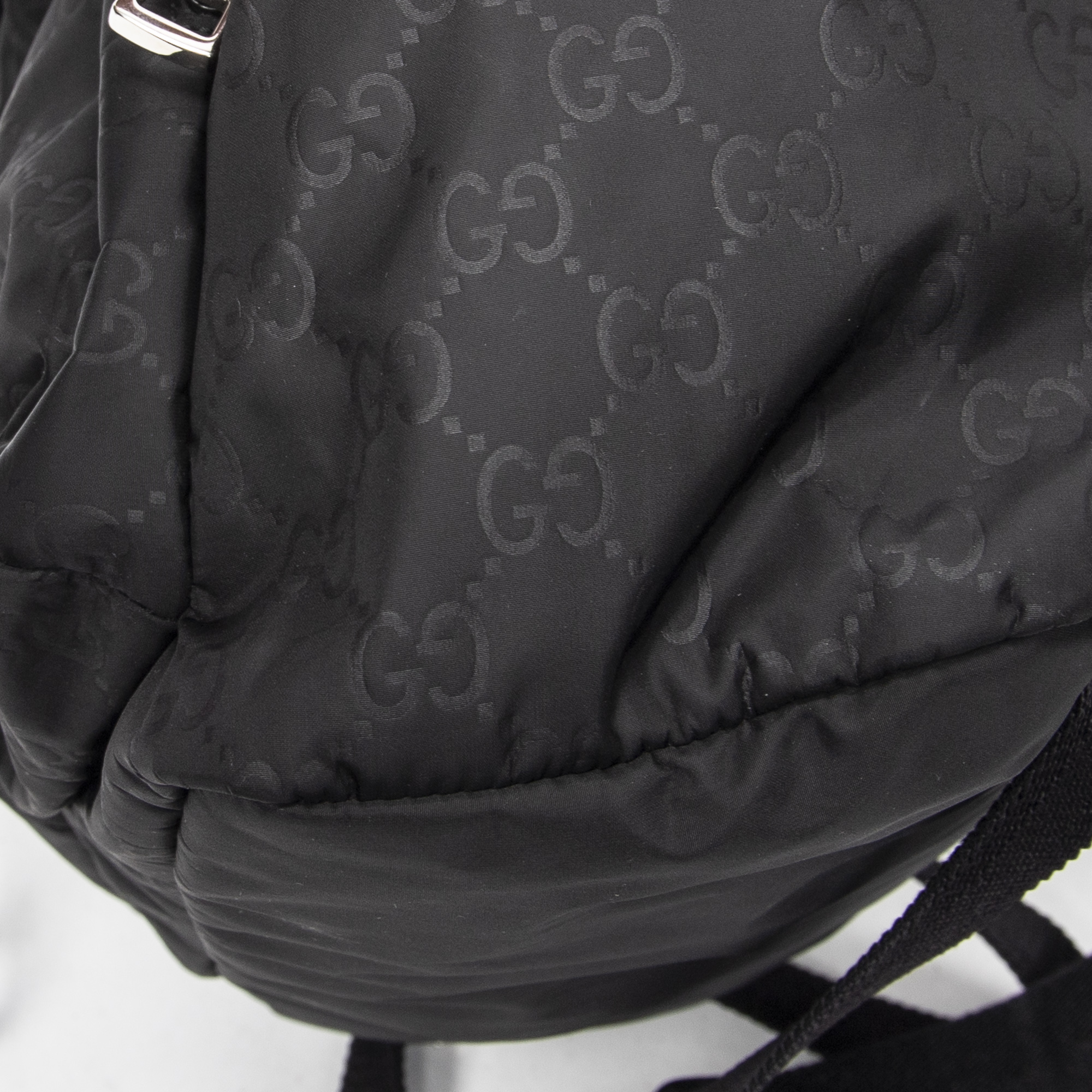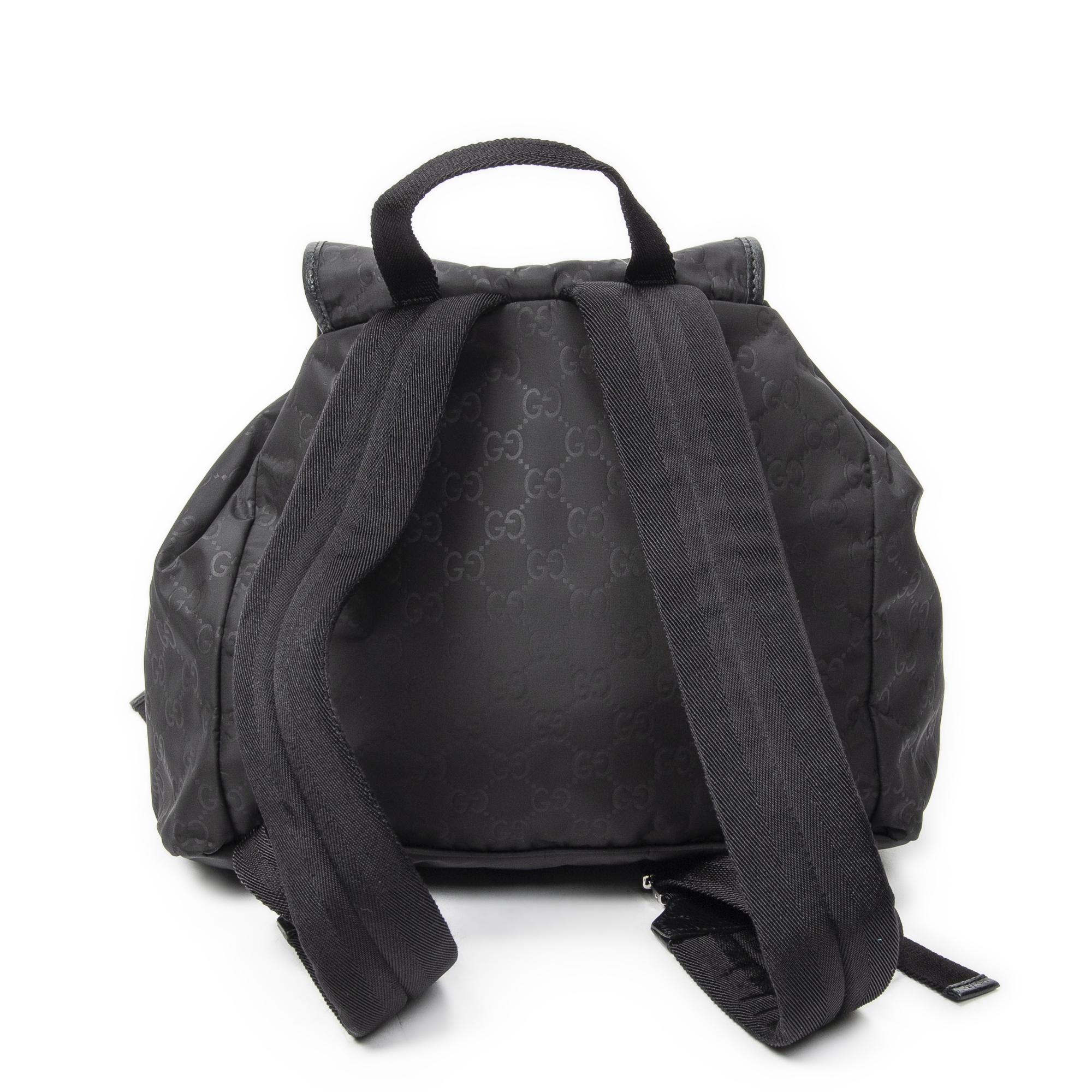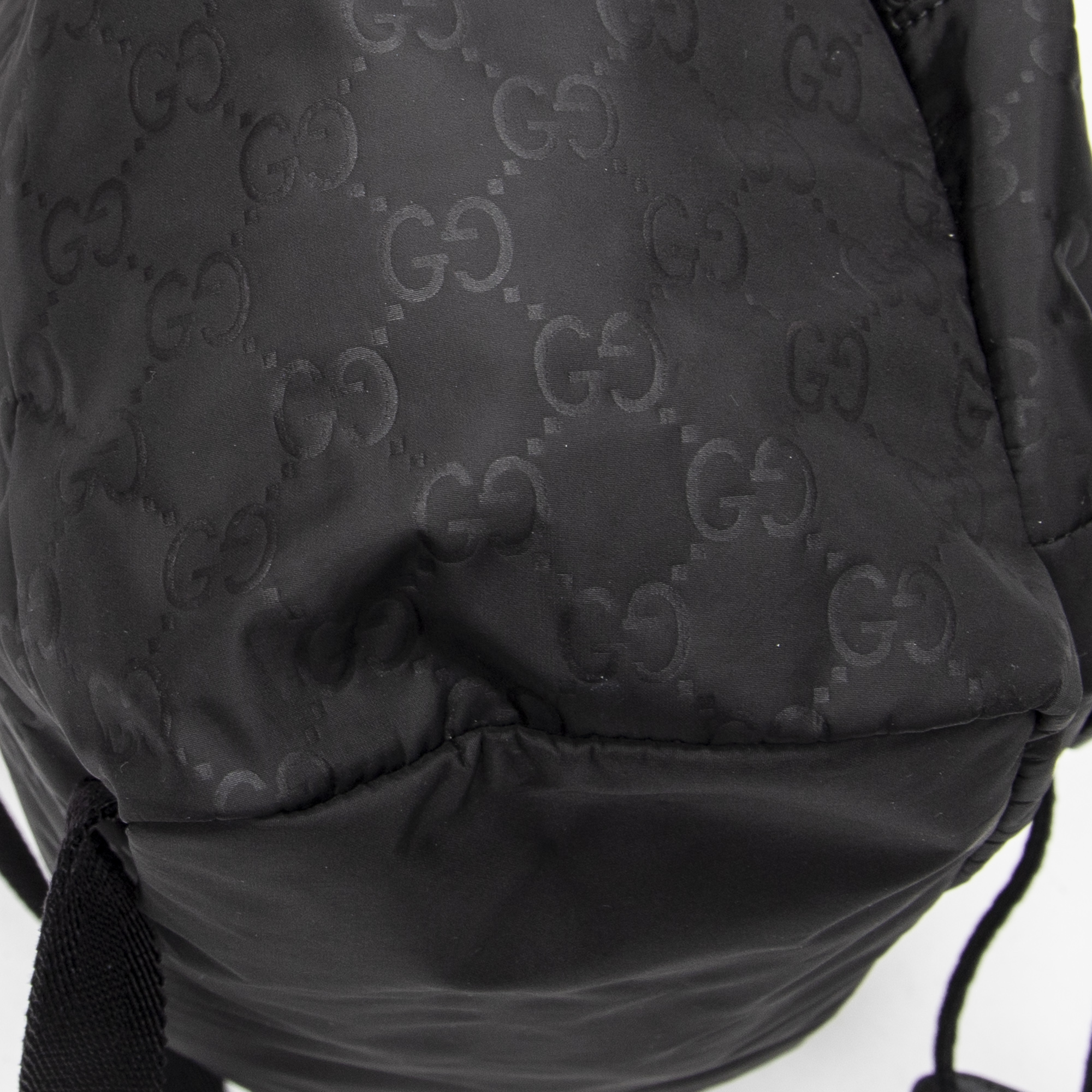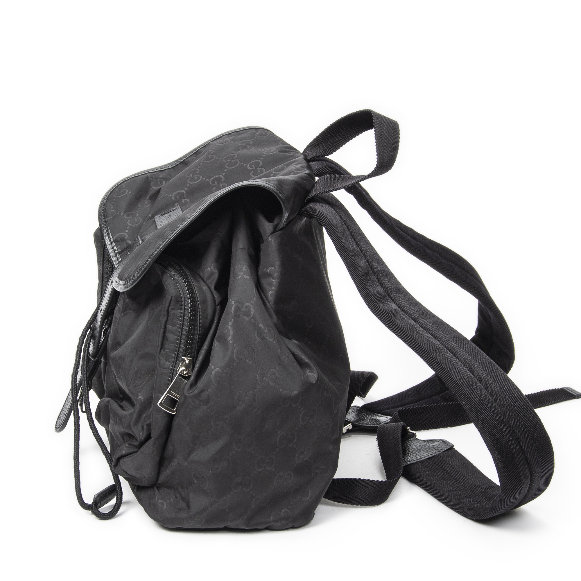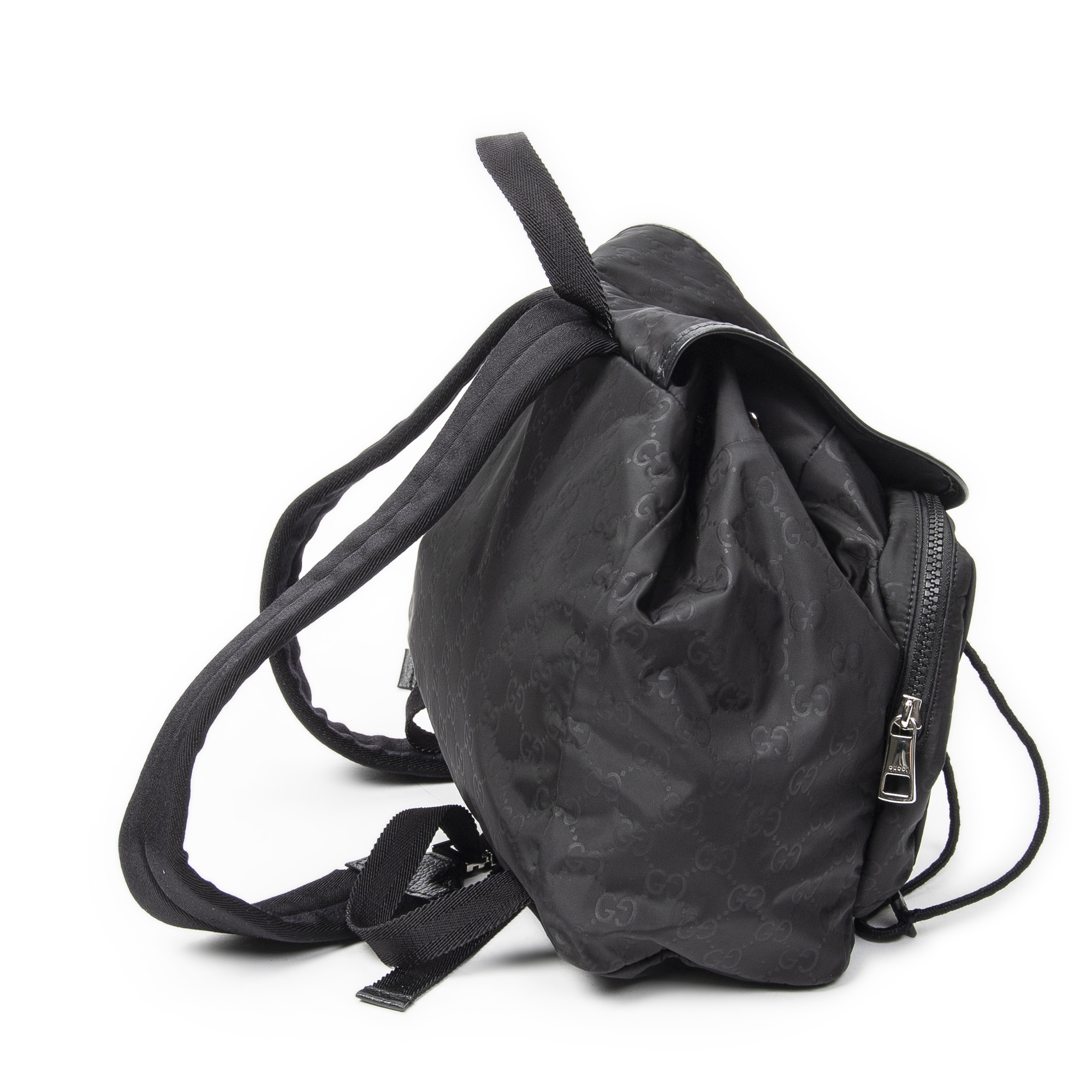 Gucci Backpack Double Pocket Drawstring Backpack in Black Monogrammed Nylon Canvas and Silver hardware. The product is in Excellent Condition (A).