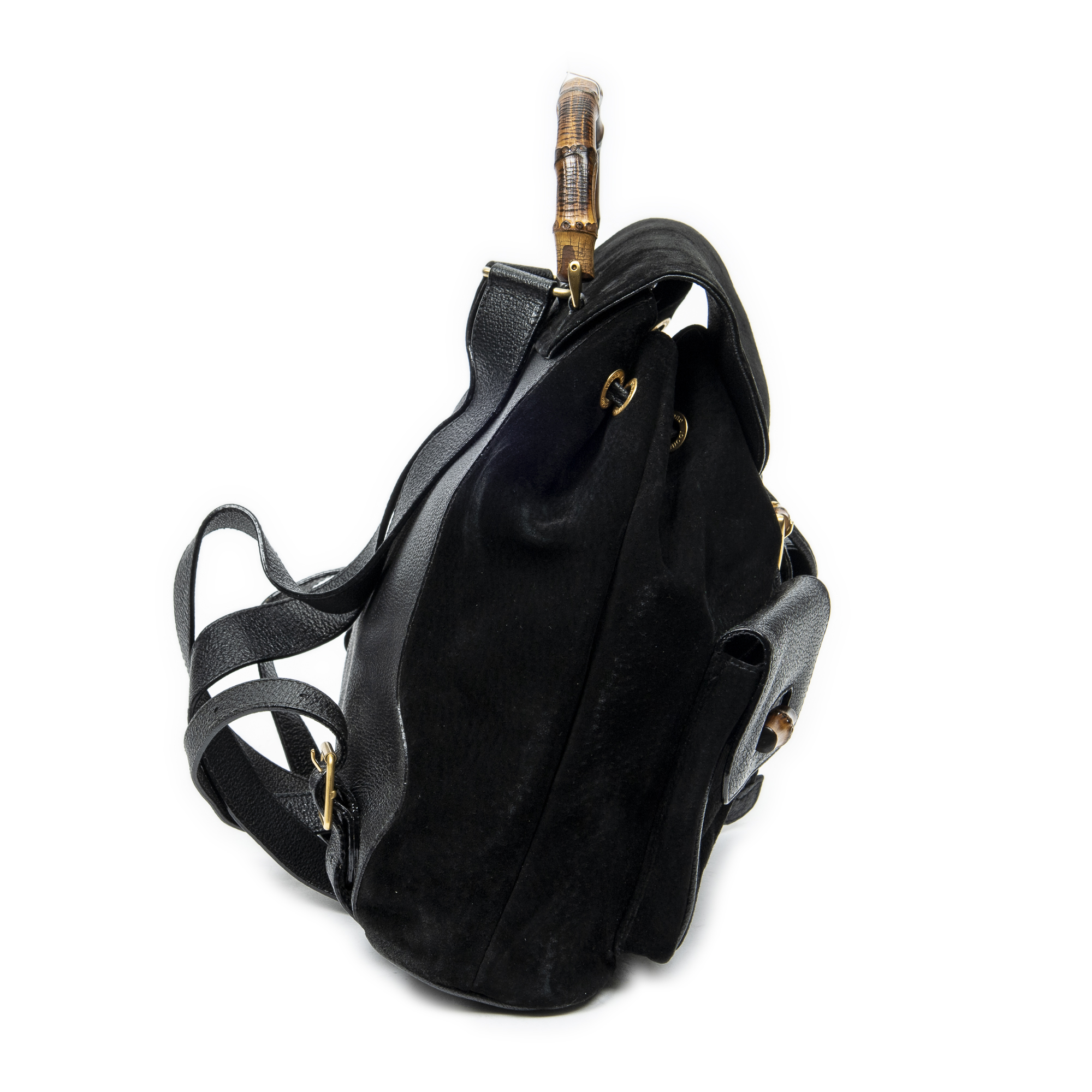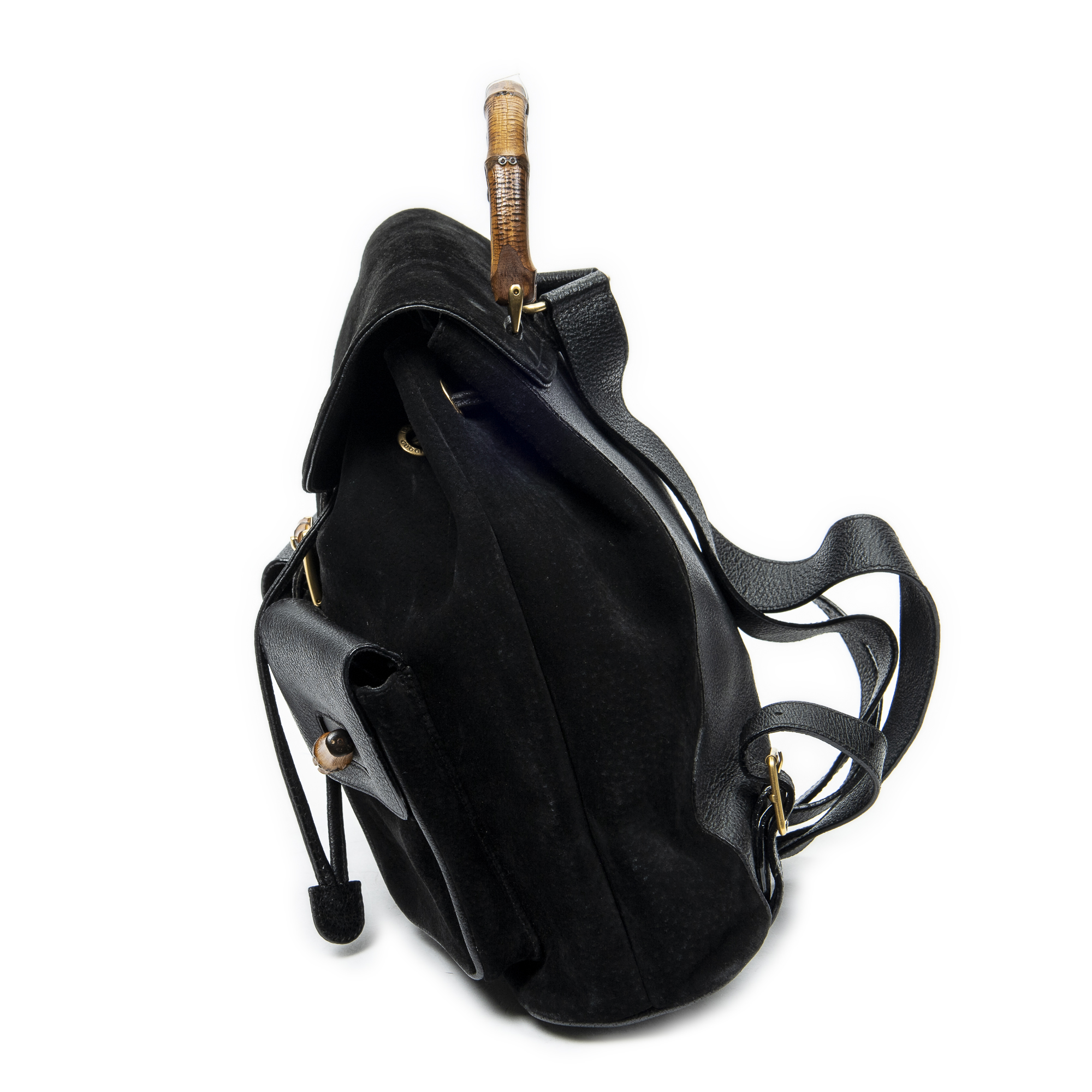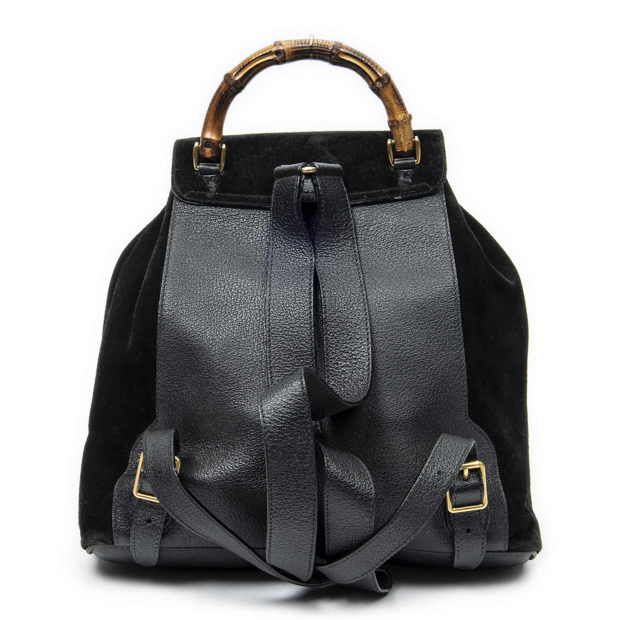 Gucci Backpack Large Bamboo Backpack in Black Suede Leather and Gold hardware. The product is in Very Good Condition (AB).