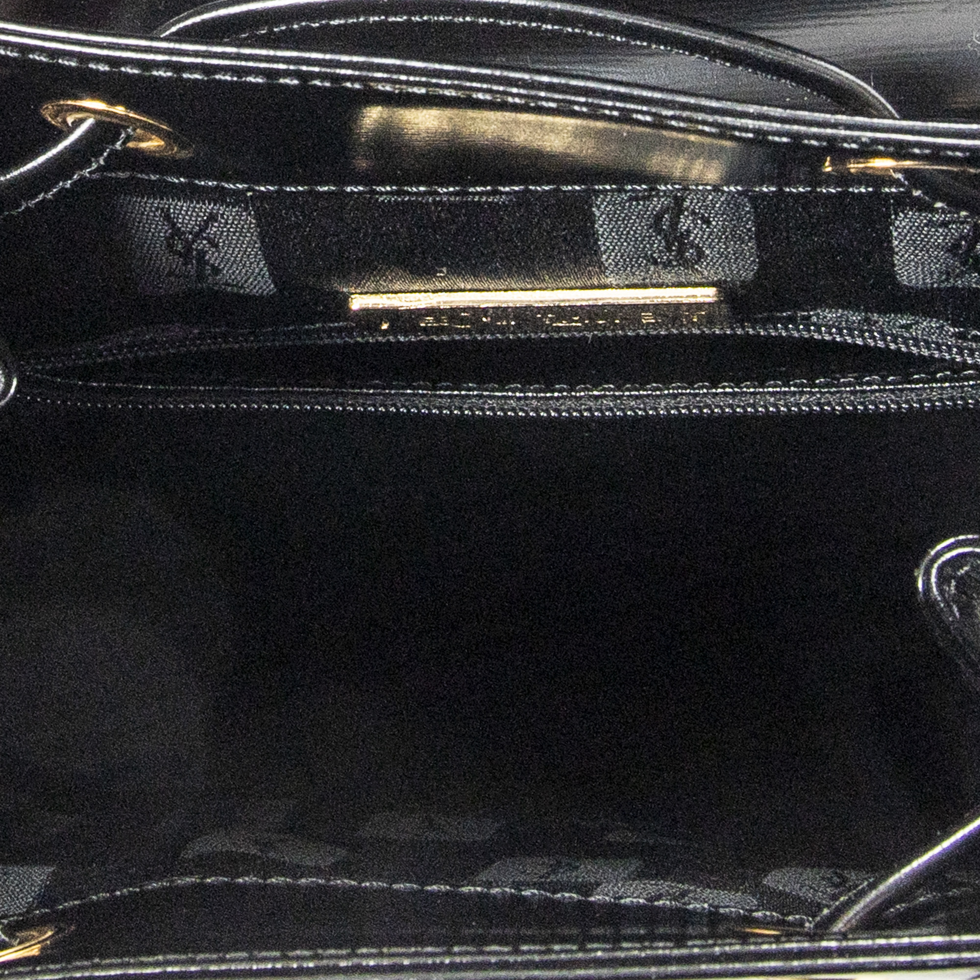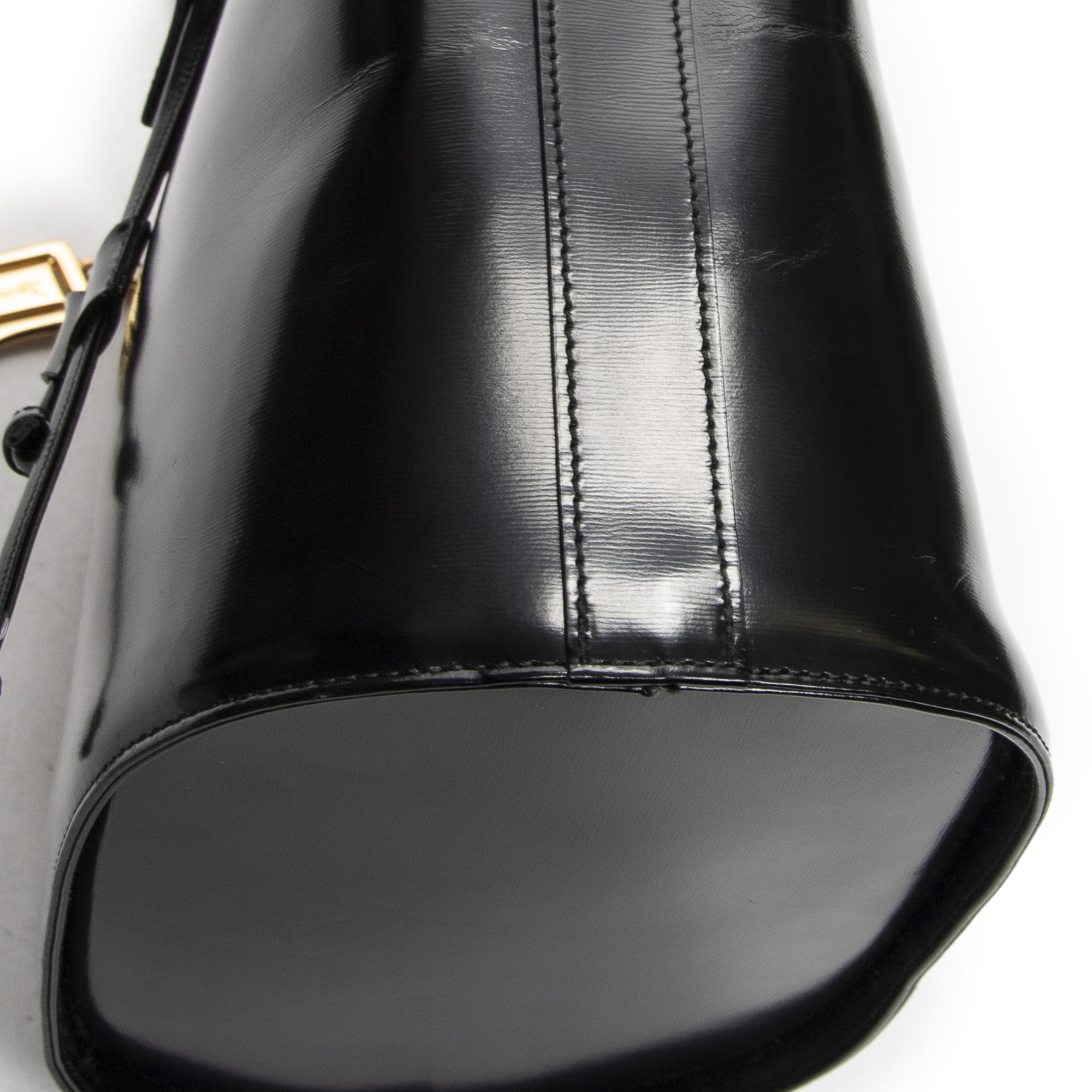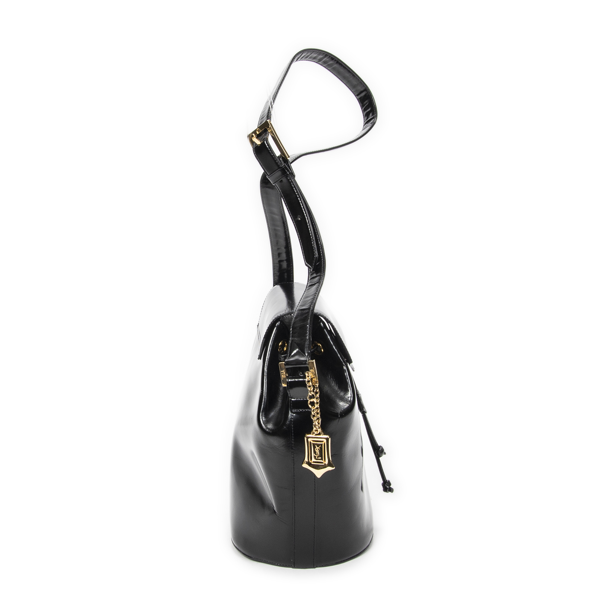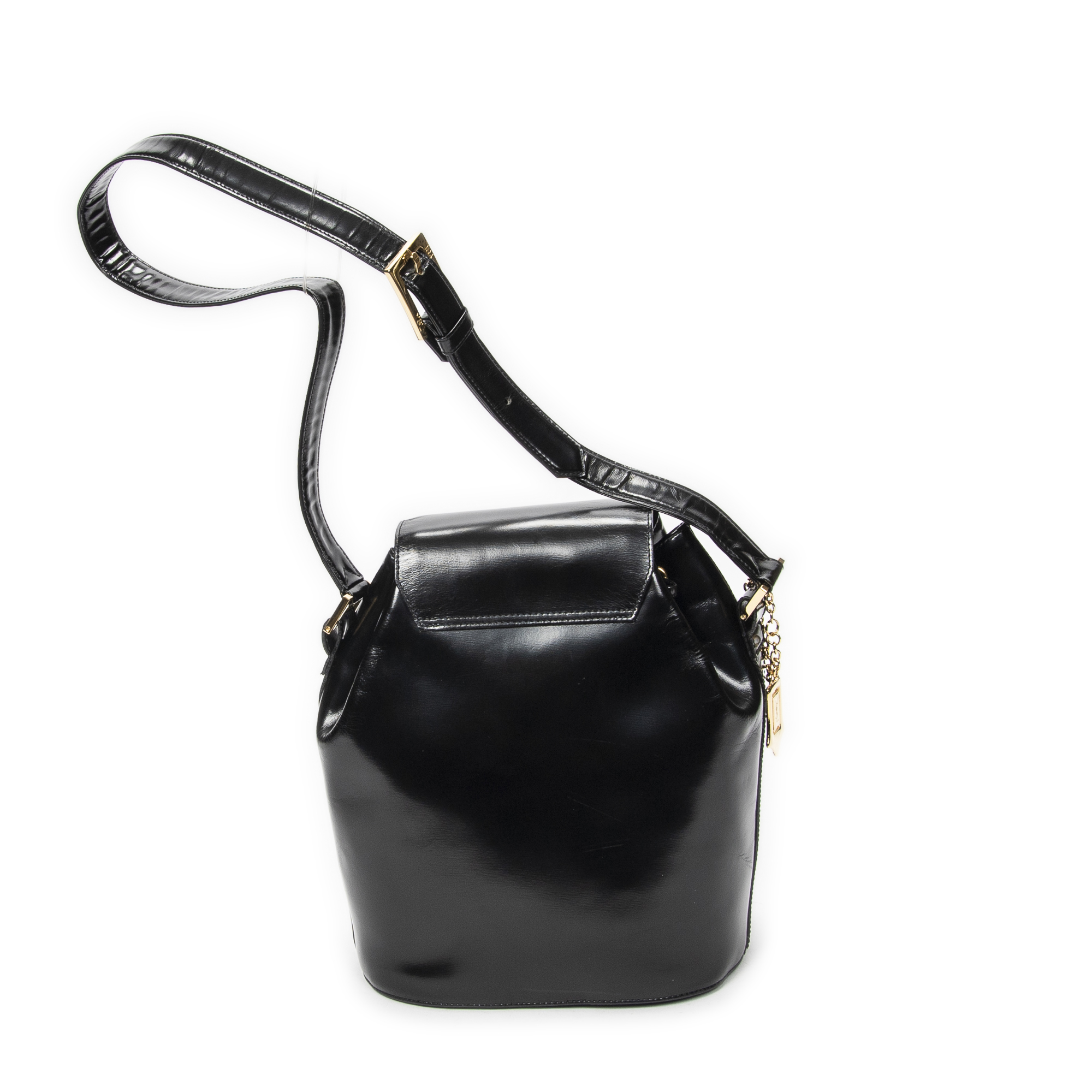 Yves Saint Laurent Backpack Logo Charm Drawstring Backpack in Black Smooth Leather and Gold hardware. The product is in Excellent Condition (A).