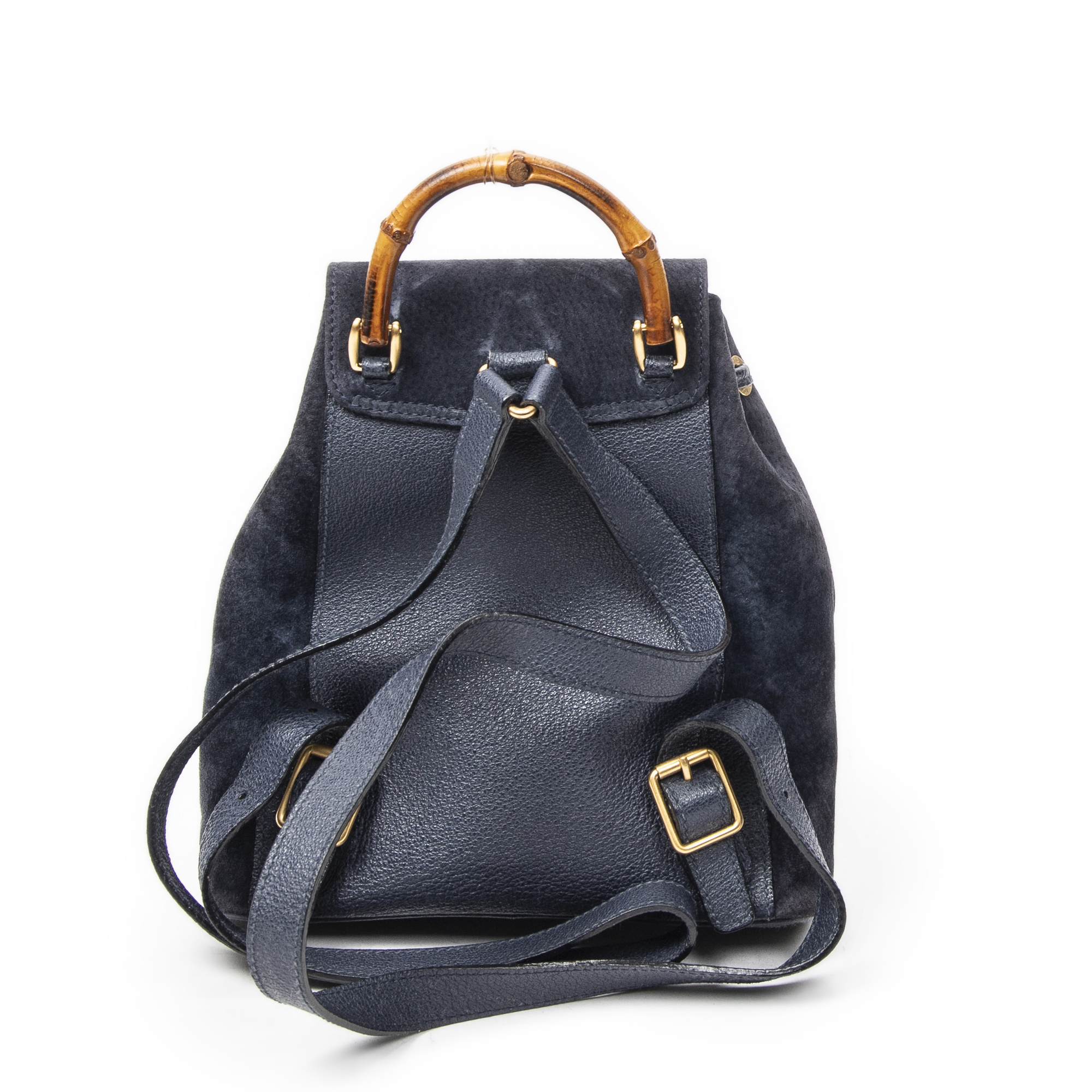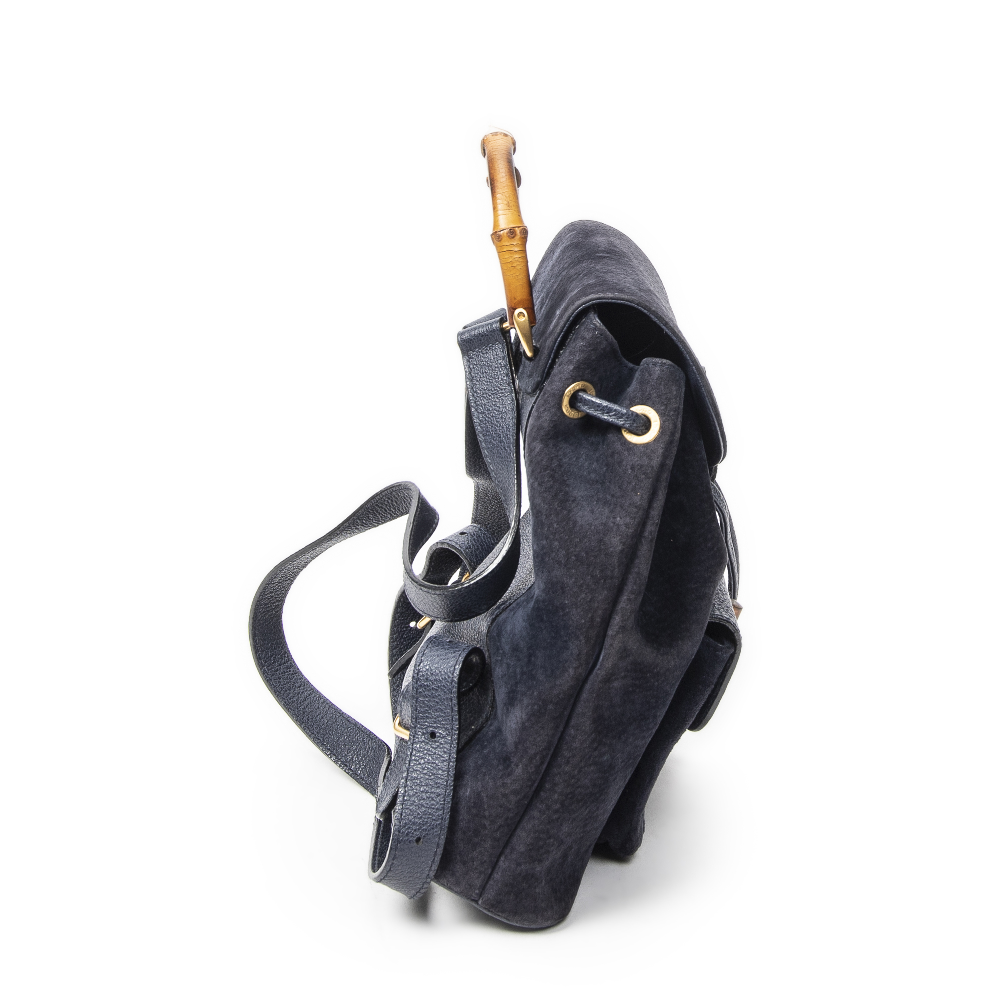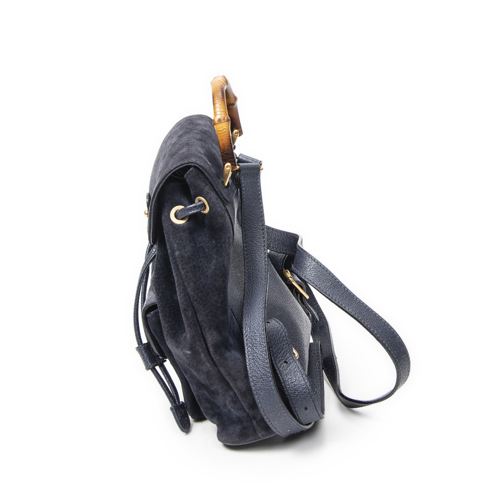 Gucci Backpack Mini Bamboo Backpack in Navy Suede Leather and Gold hardware. The product is in Very Good Condition (AB).