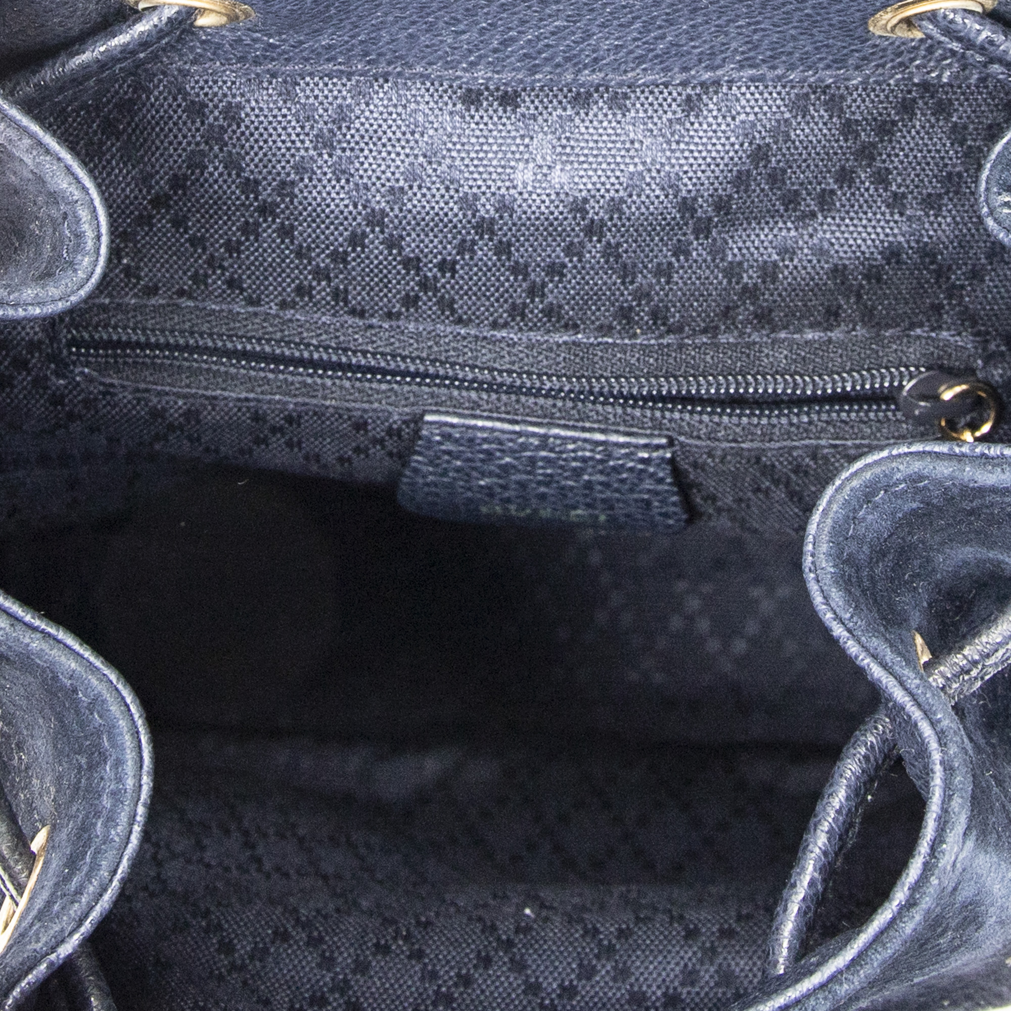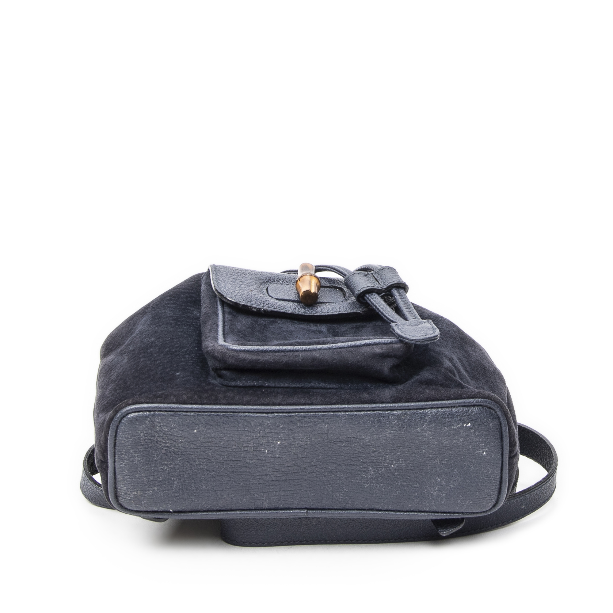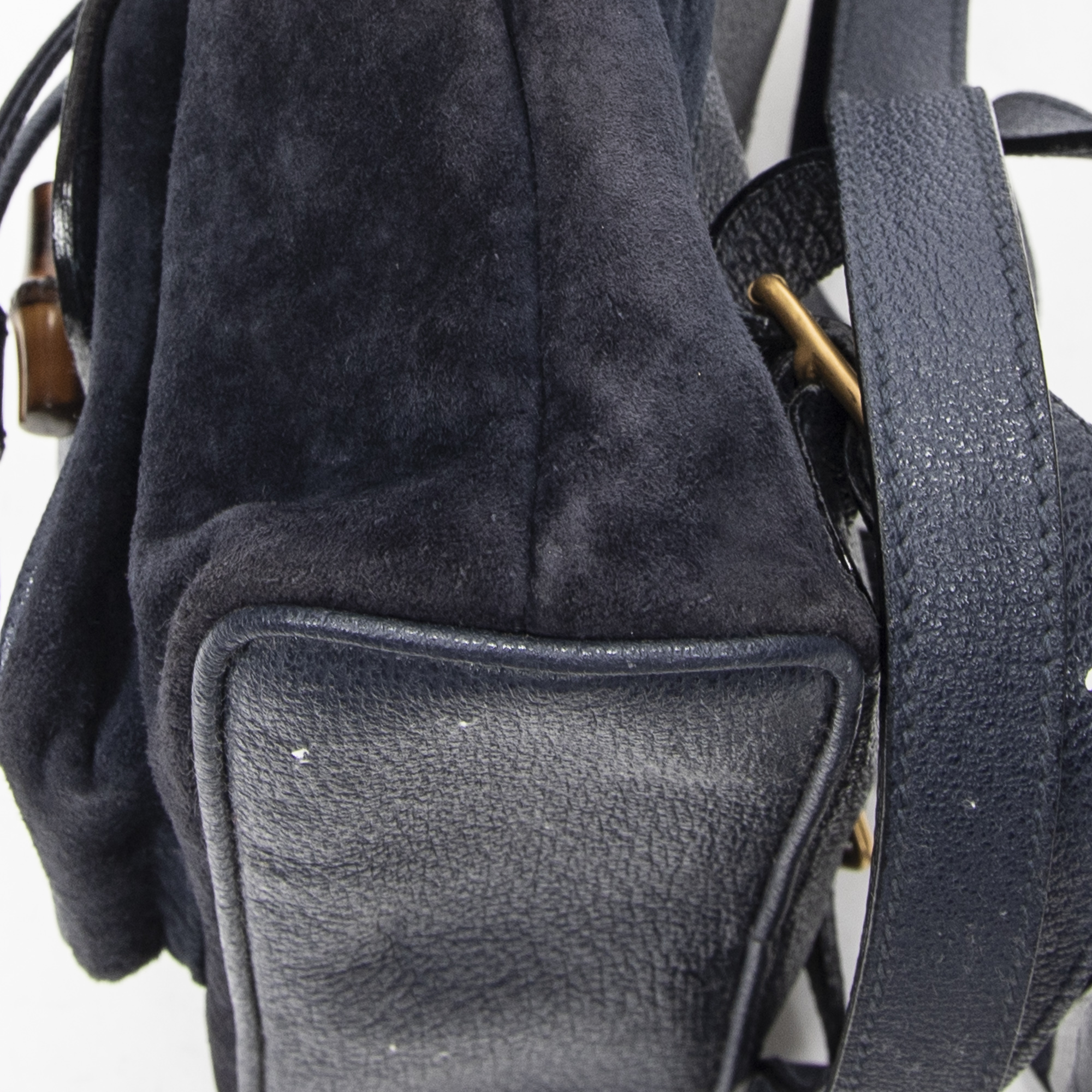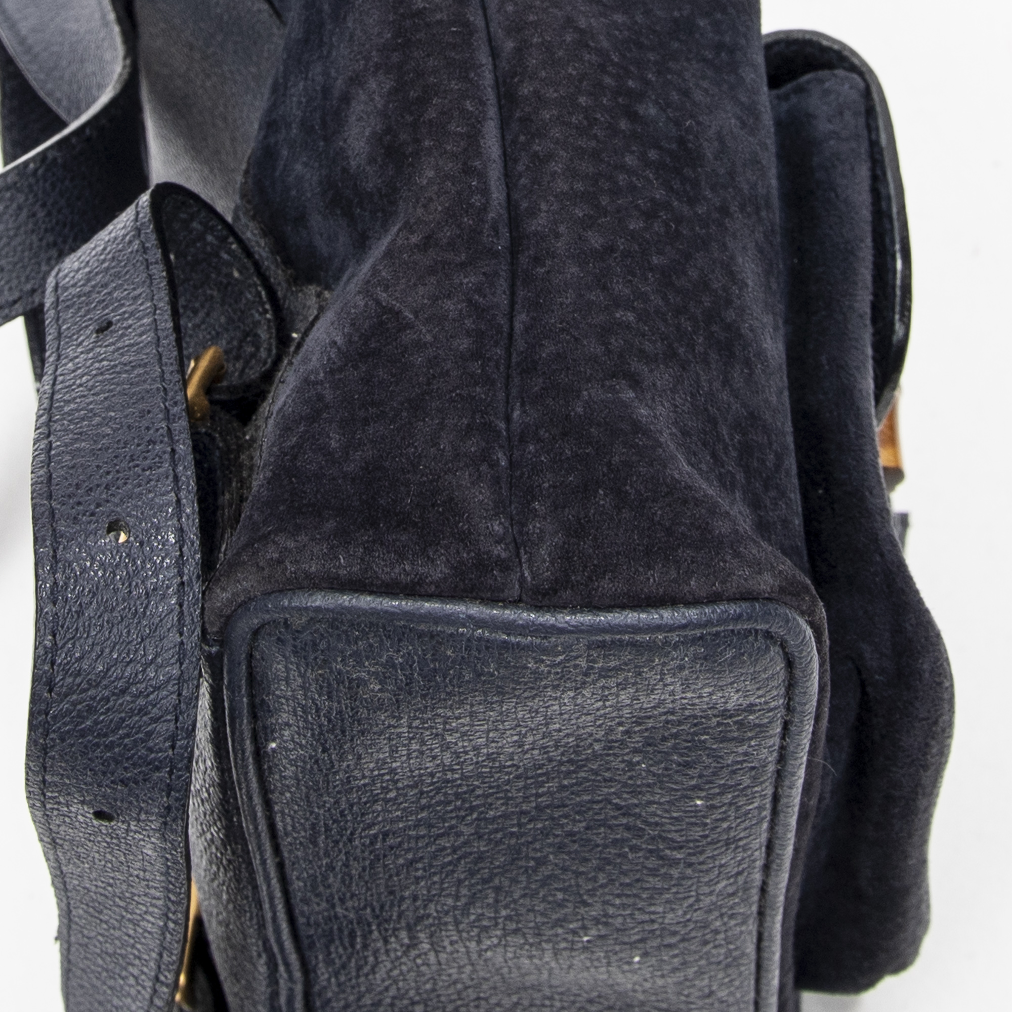Gucci Backpack Mini Bamboo Backpack in Navy Suede Leather and Gold hardware. The product is in Very Good Condition (AB).