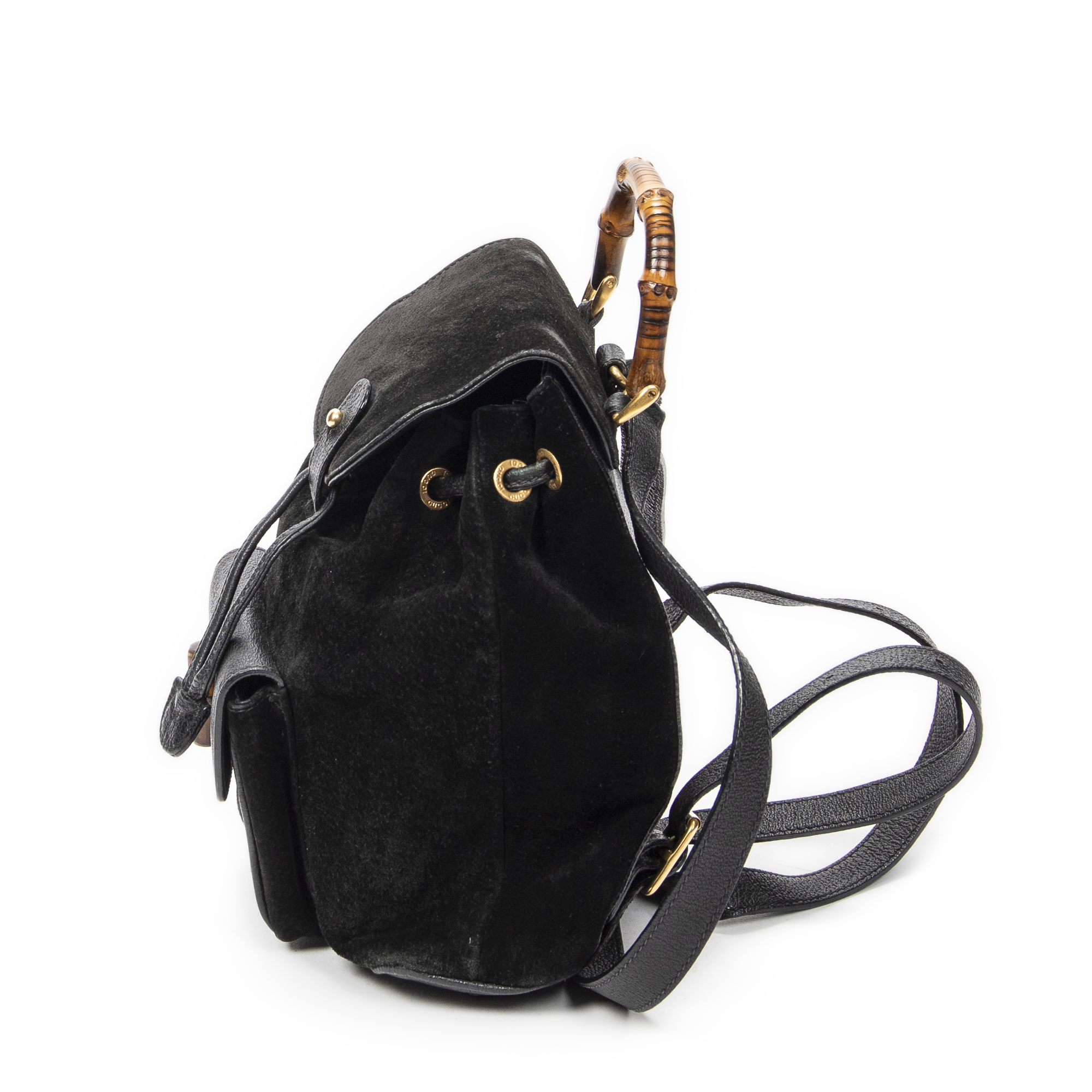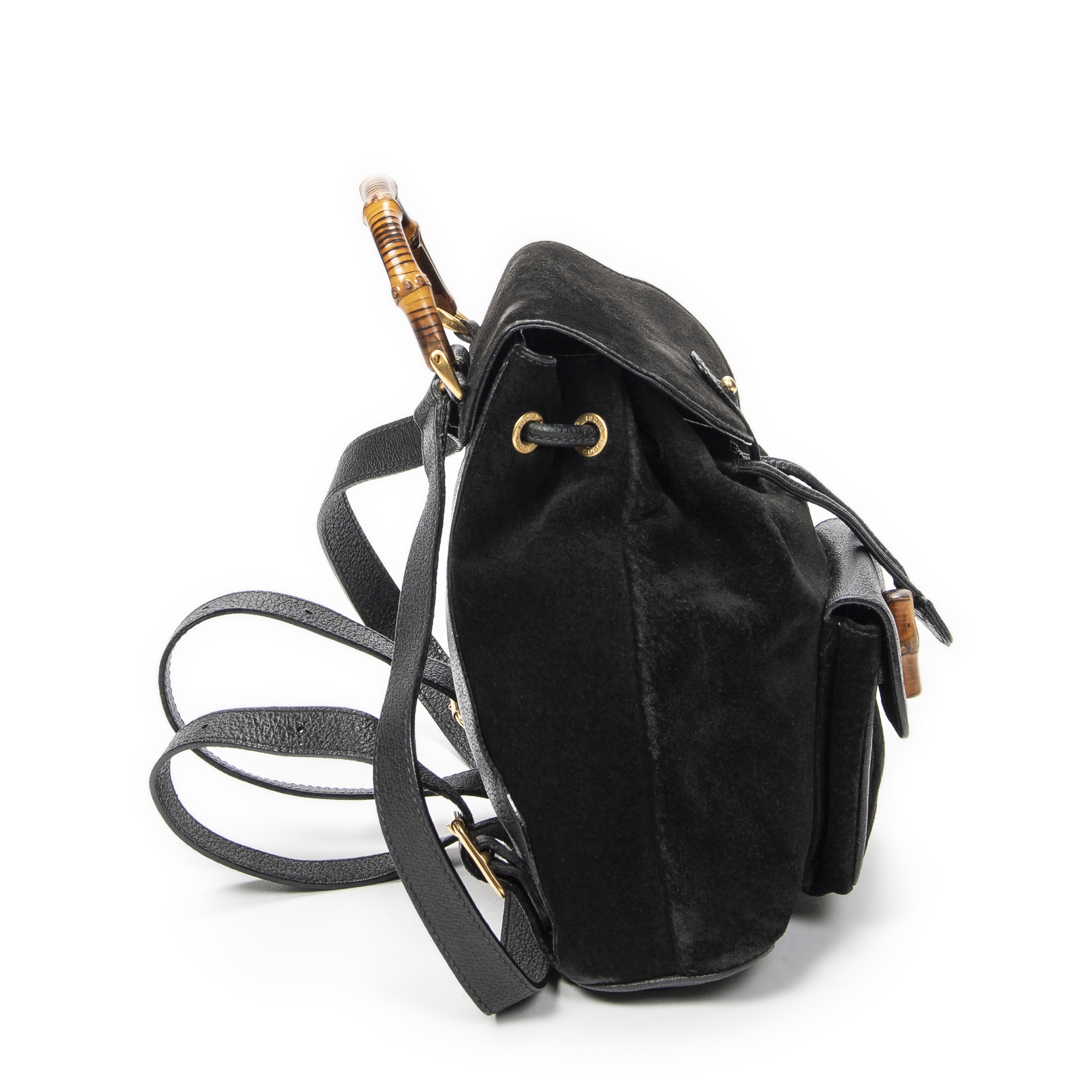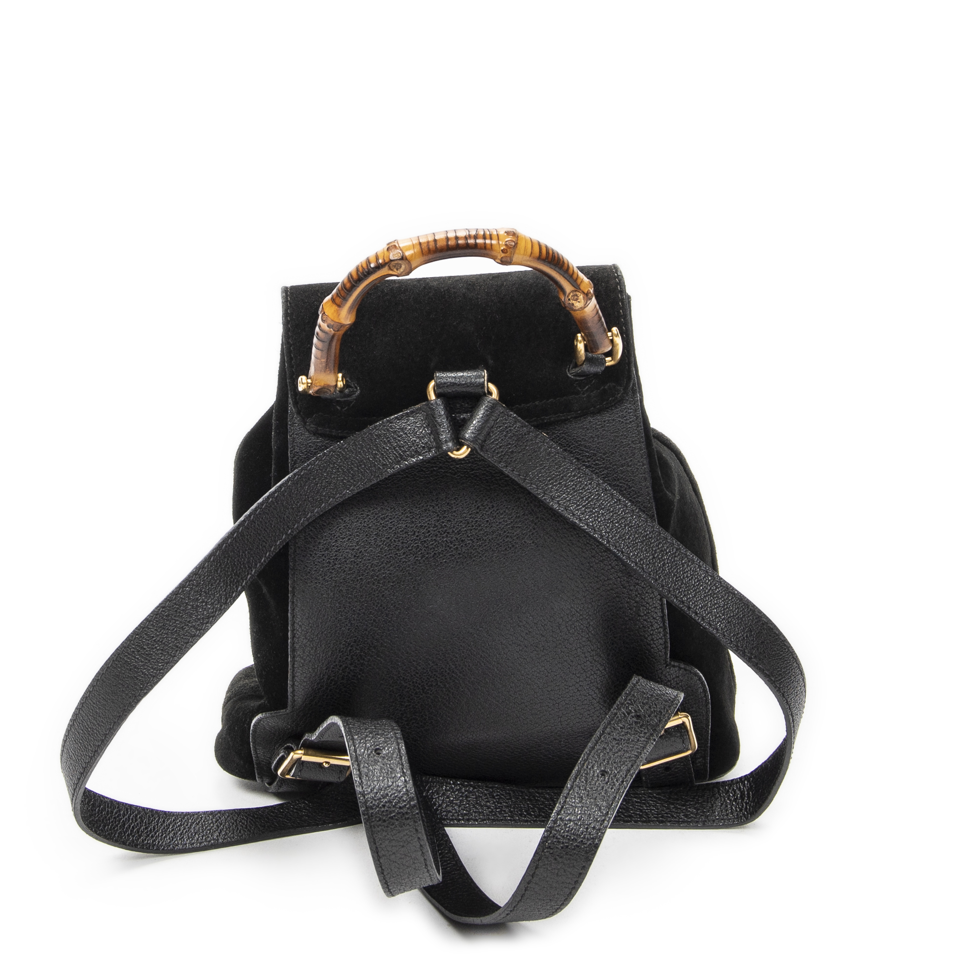 Gucci Backpack Mini Bamboo Backpack in Black Suede Leather and Gold hardware. The product is in Very Good Condition (AB).
