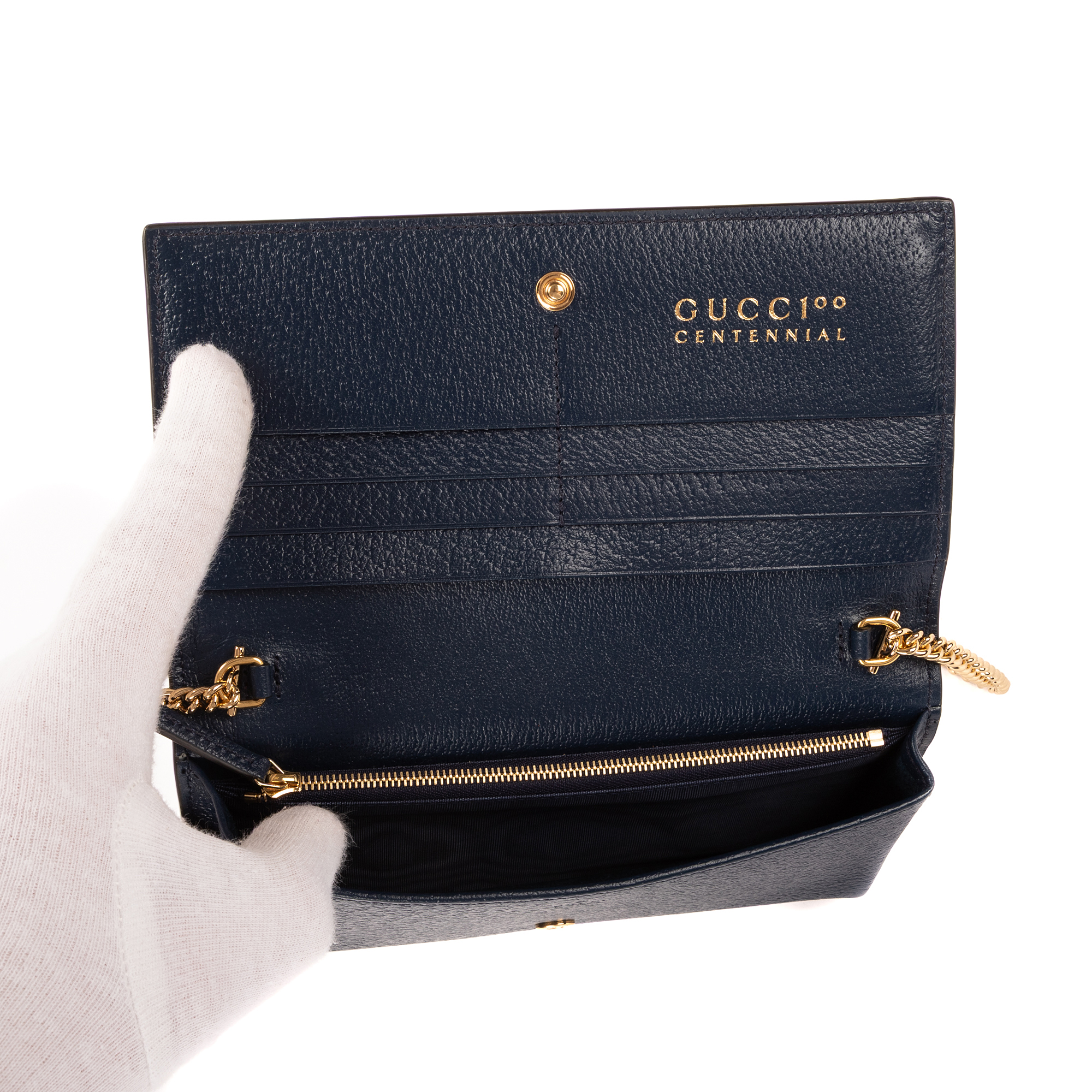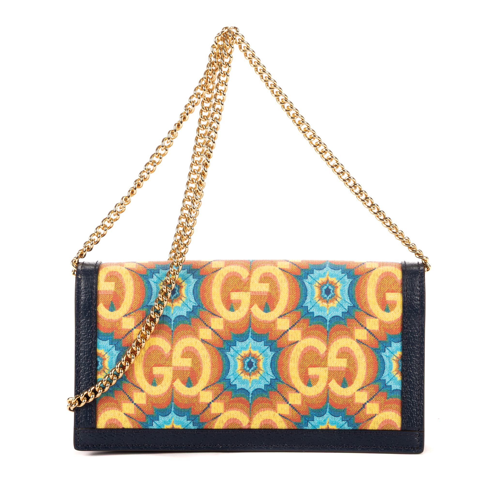 Gucci Crossbody 100th Anniversary Centennial GG Chain Wallet in Navy/Yellow Kaleidoscope Canvas and Gold hardware. The product is in Perfect Condition (AA).