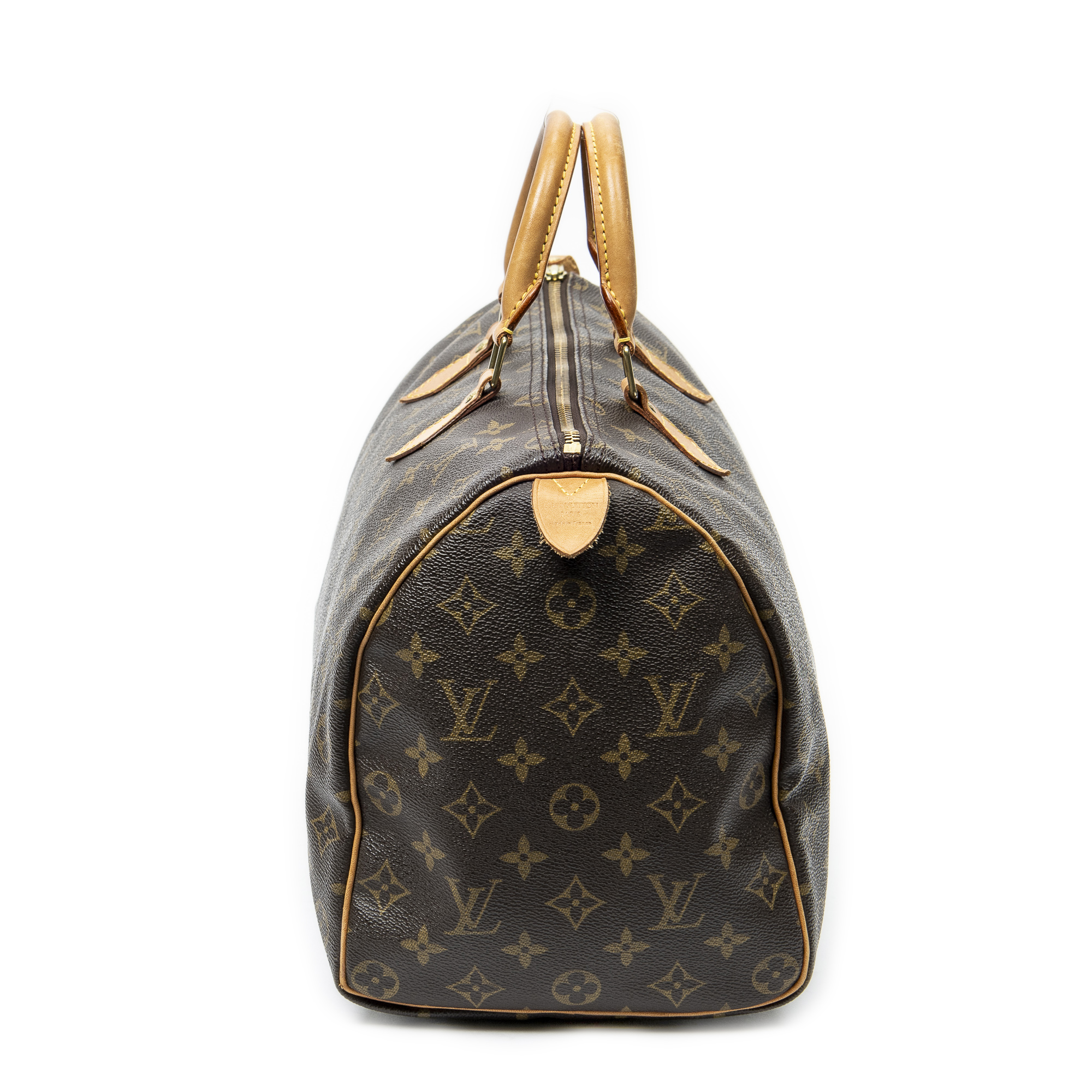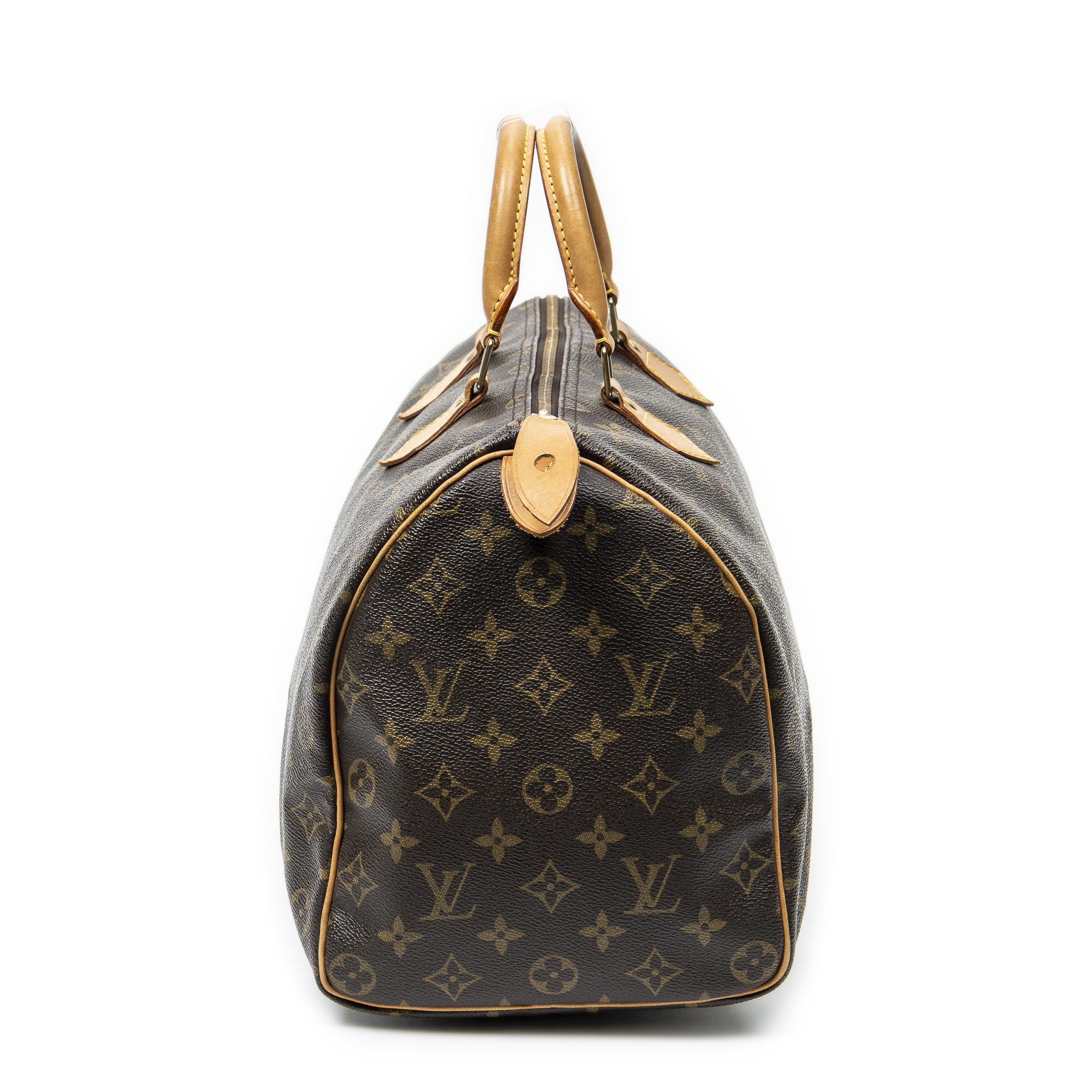 Louis Vuitton Handbag Speedy 35 in Brown Monogram Canvas and Golden Brass hardware. The product is in Very Good Condition (AB).