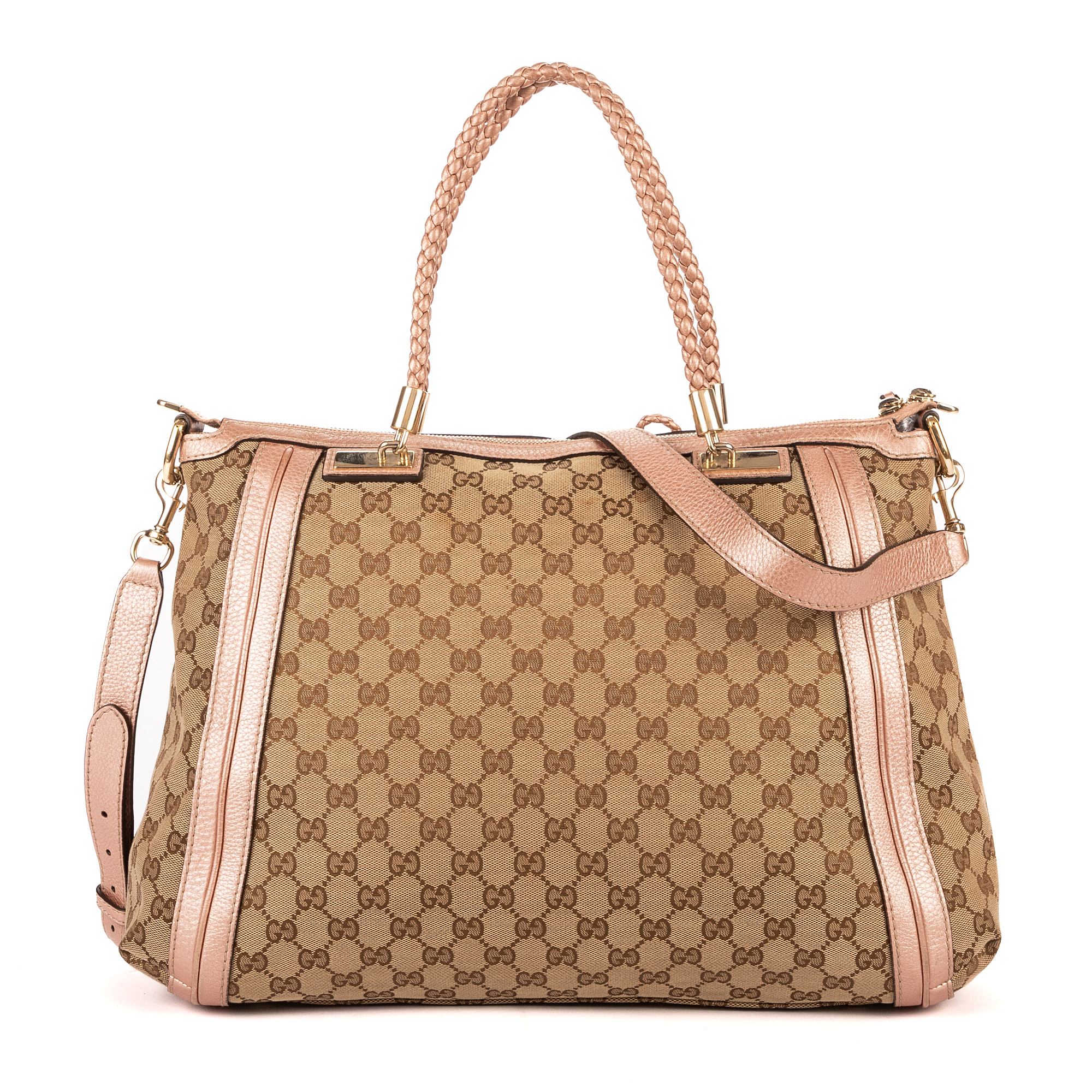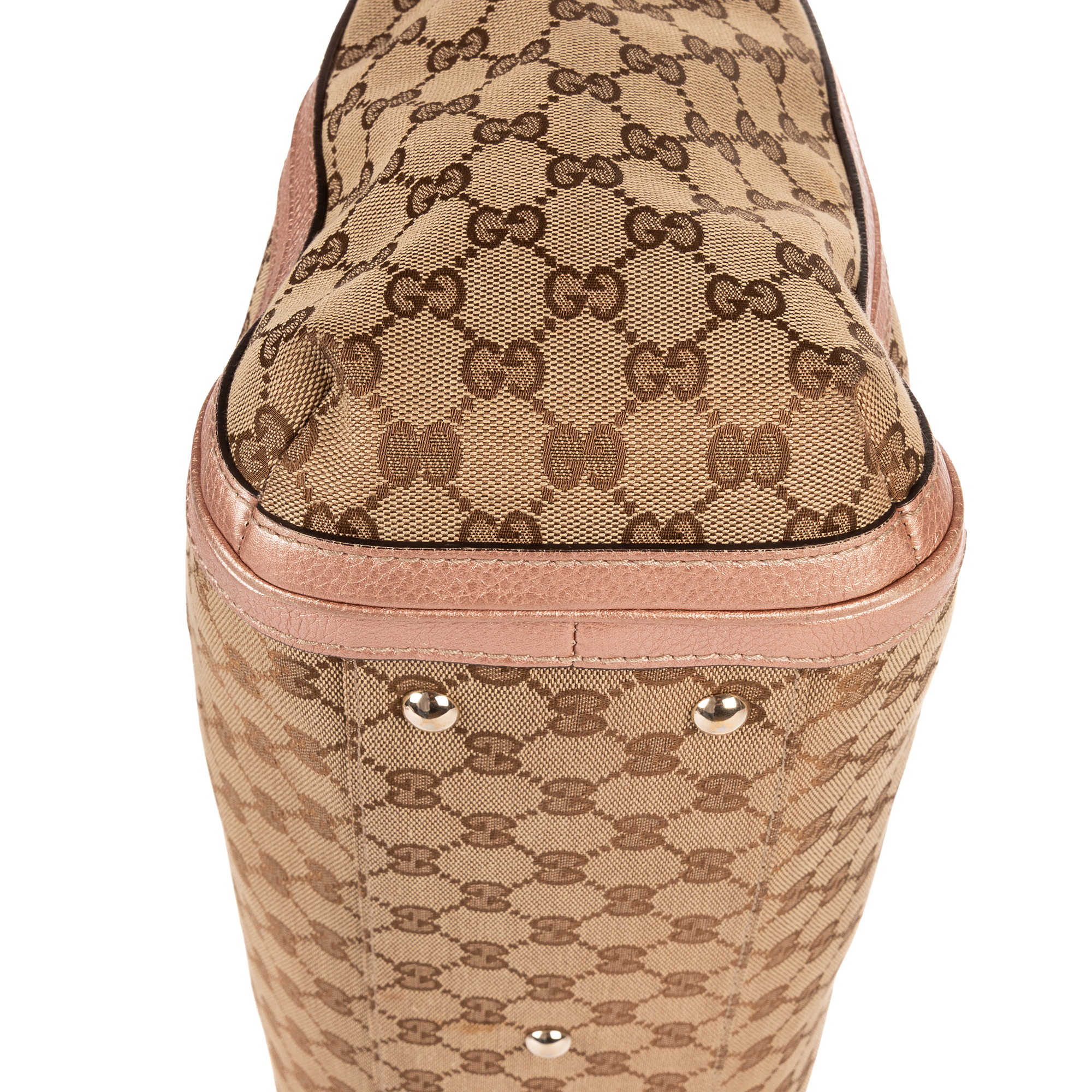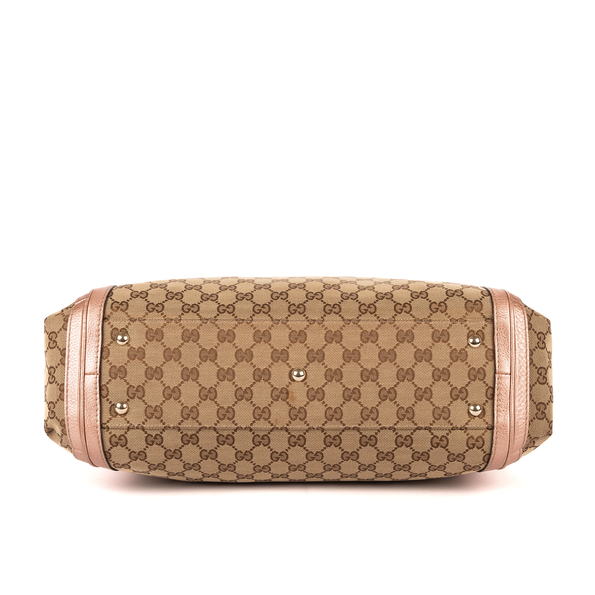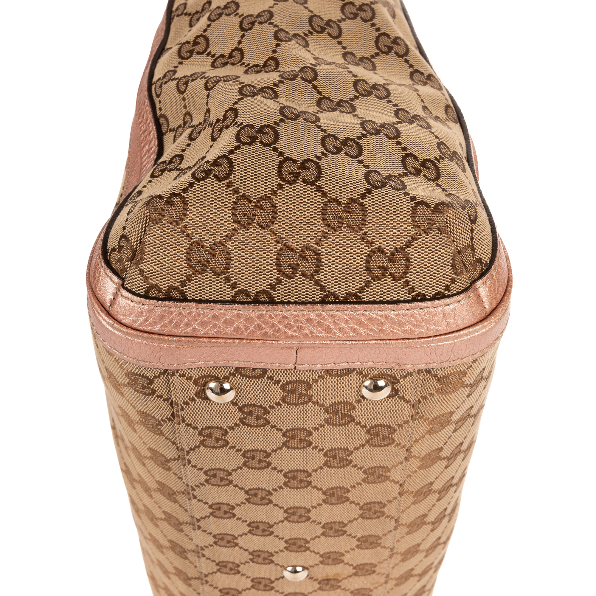 Gucci Handbag Bella Satchel in Light Pink/Beige GG Monogram Canvas and Champagne Gold hardware. The product is in Very Good Condition (AB).