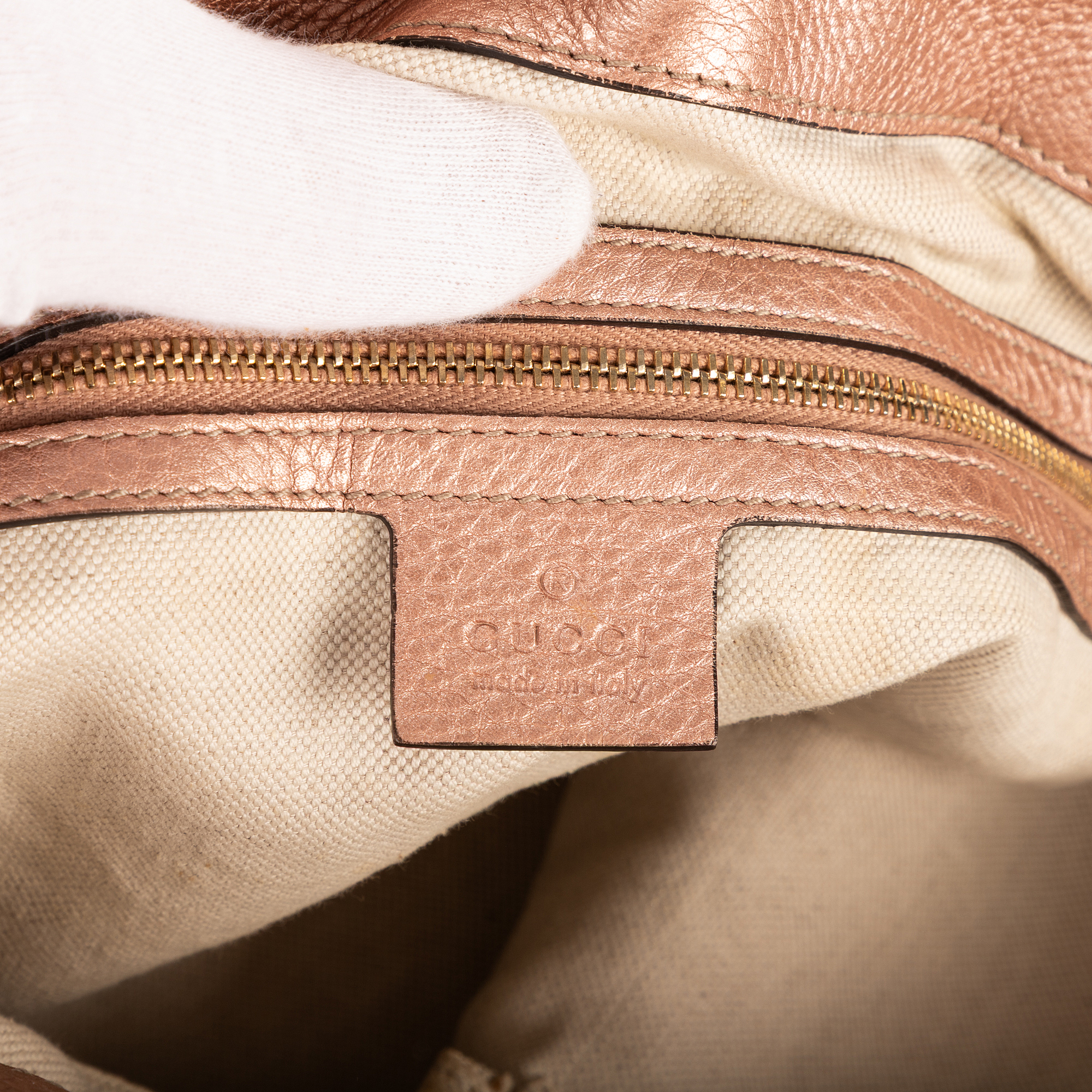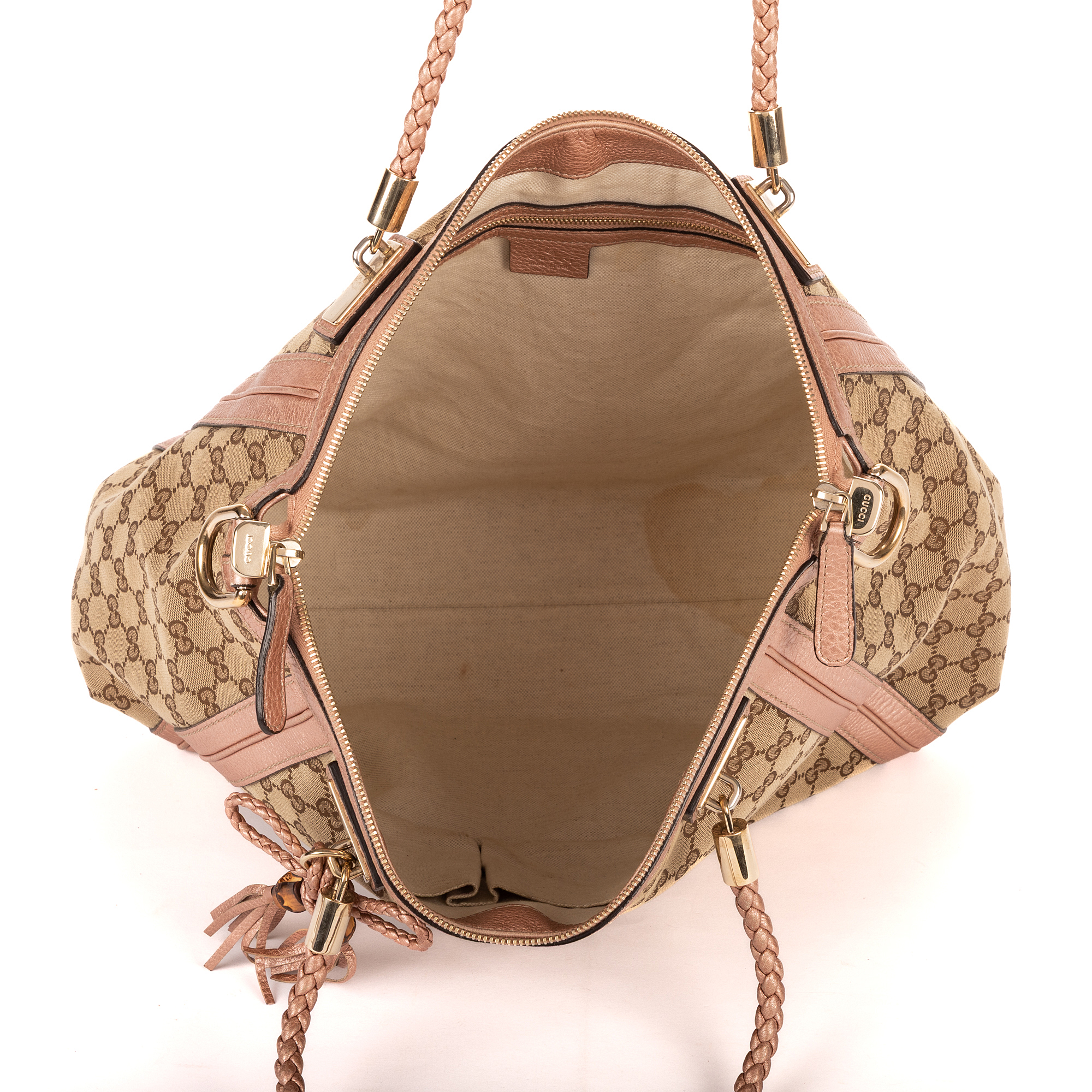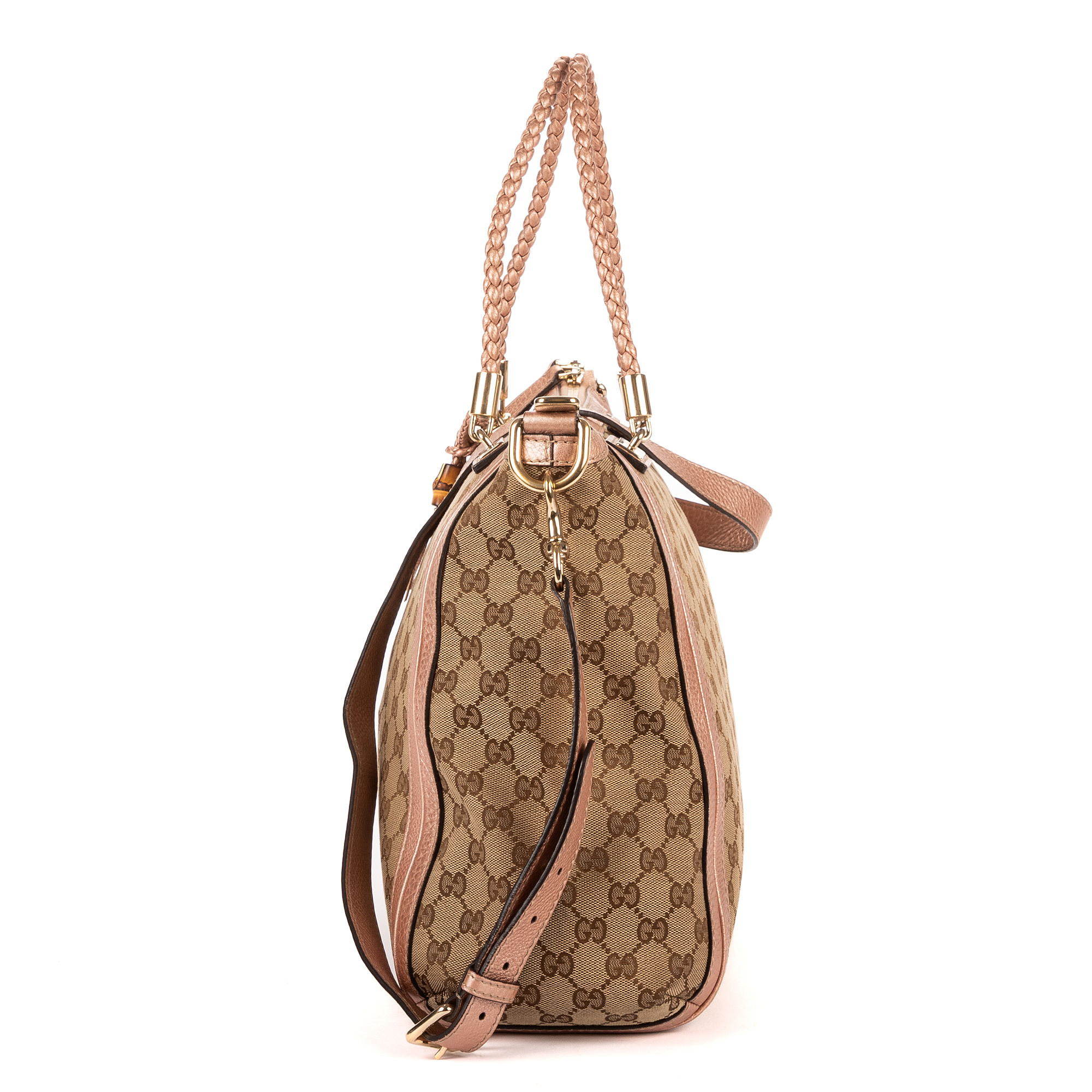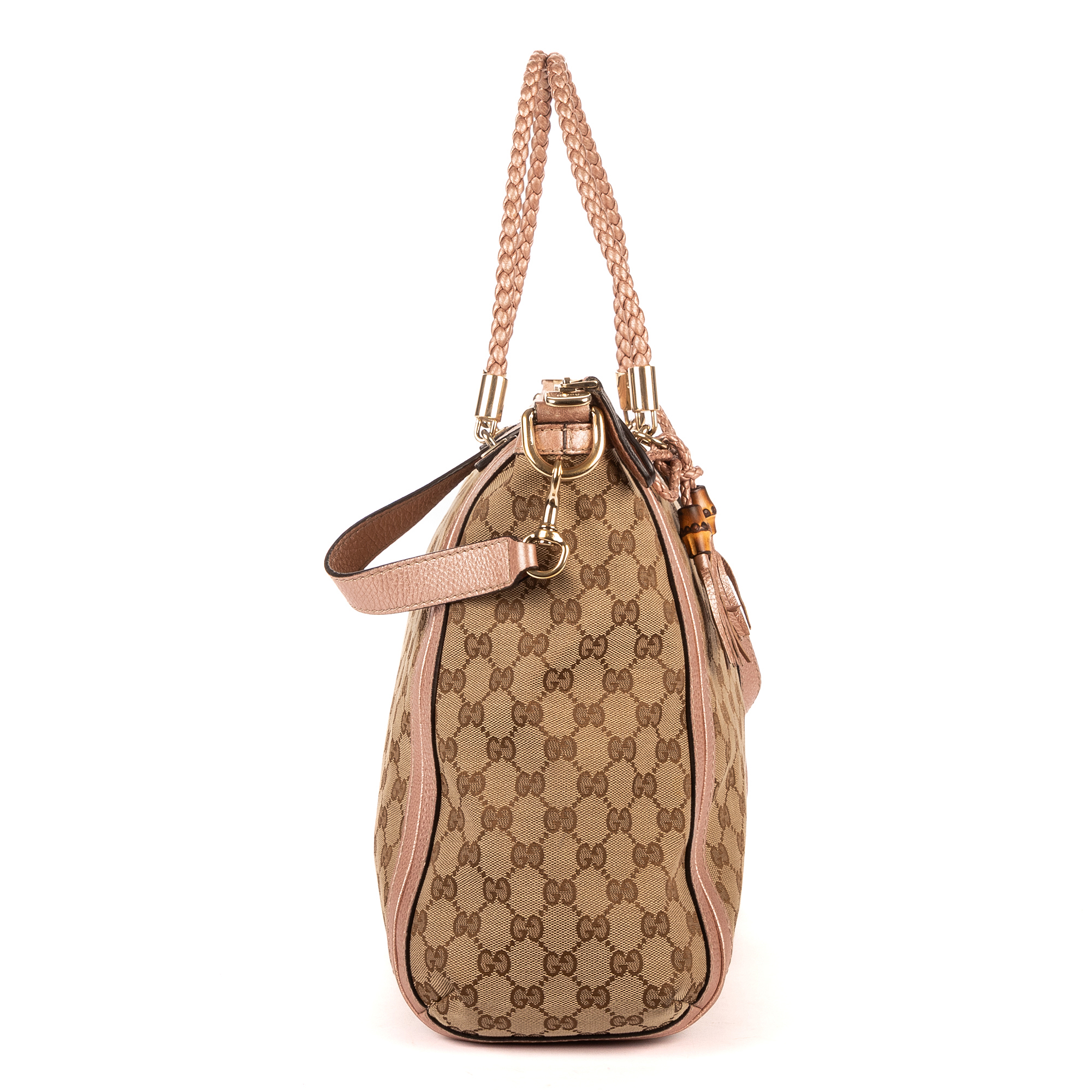 Gucci Handbag Bella Satchel in Light Pink/Beige GG Monogram Canvas and Champagne Gold hardware. The product is in Very Good Condition (AB).