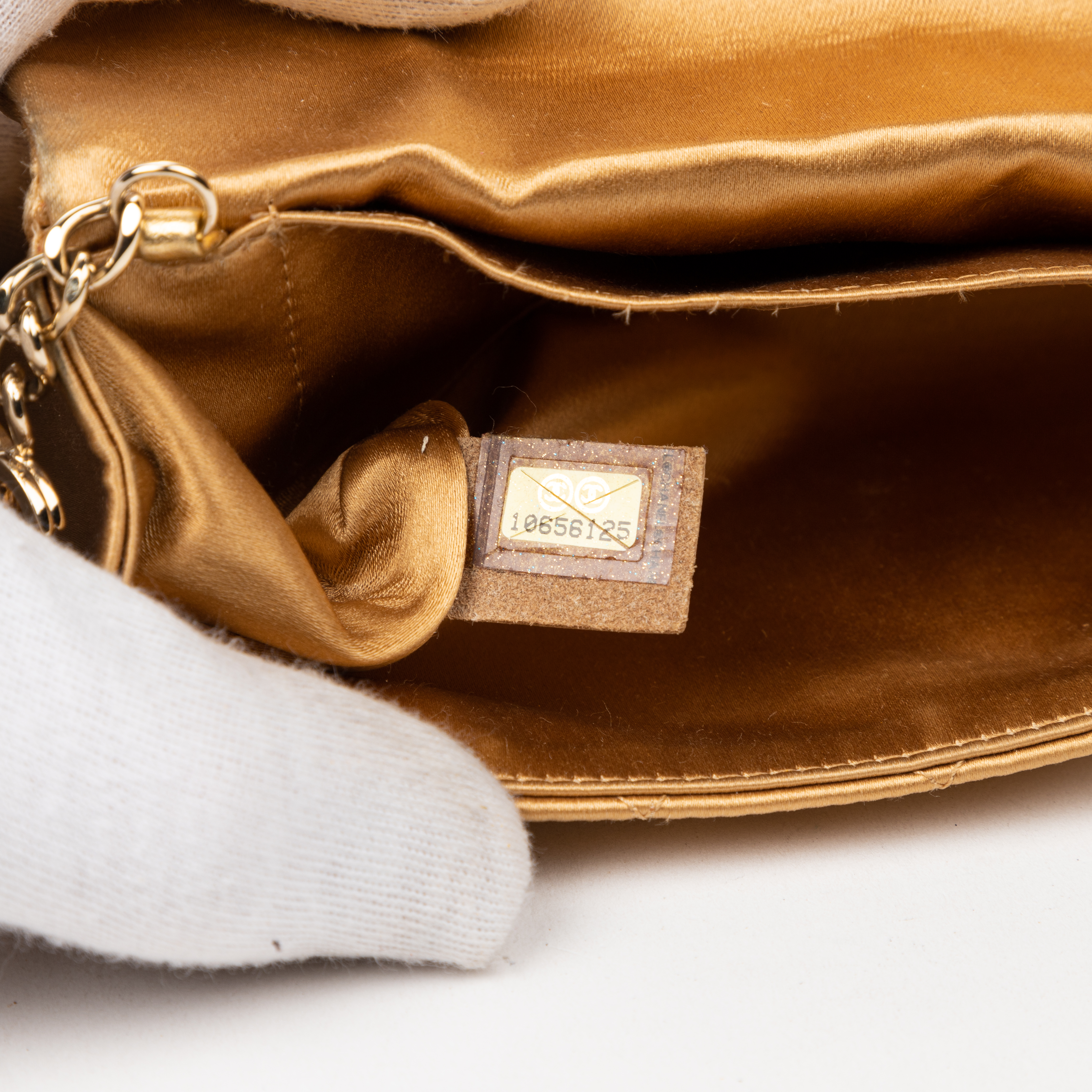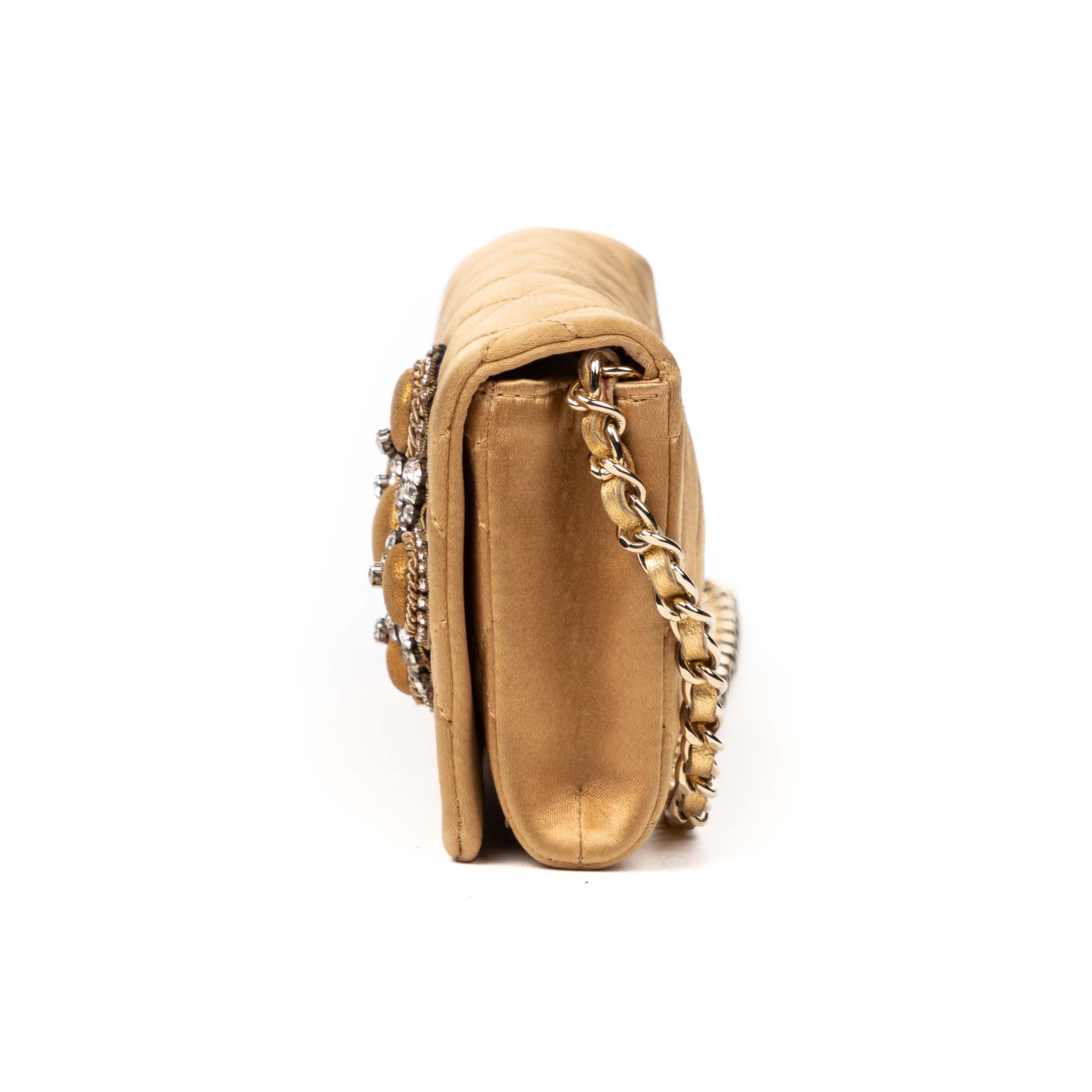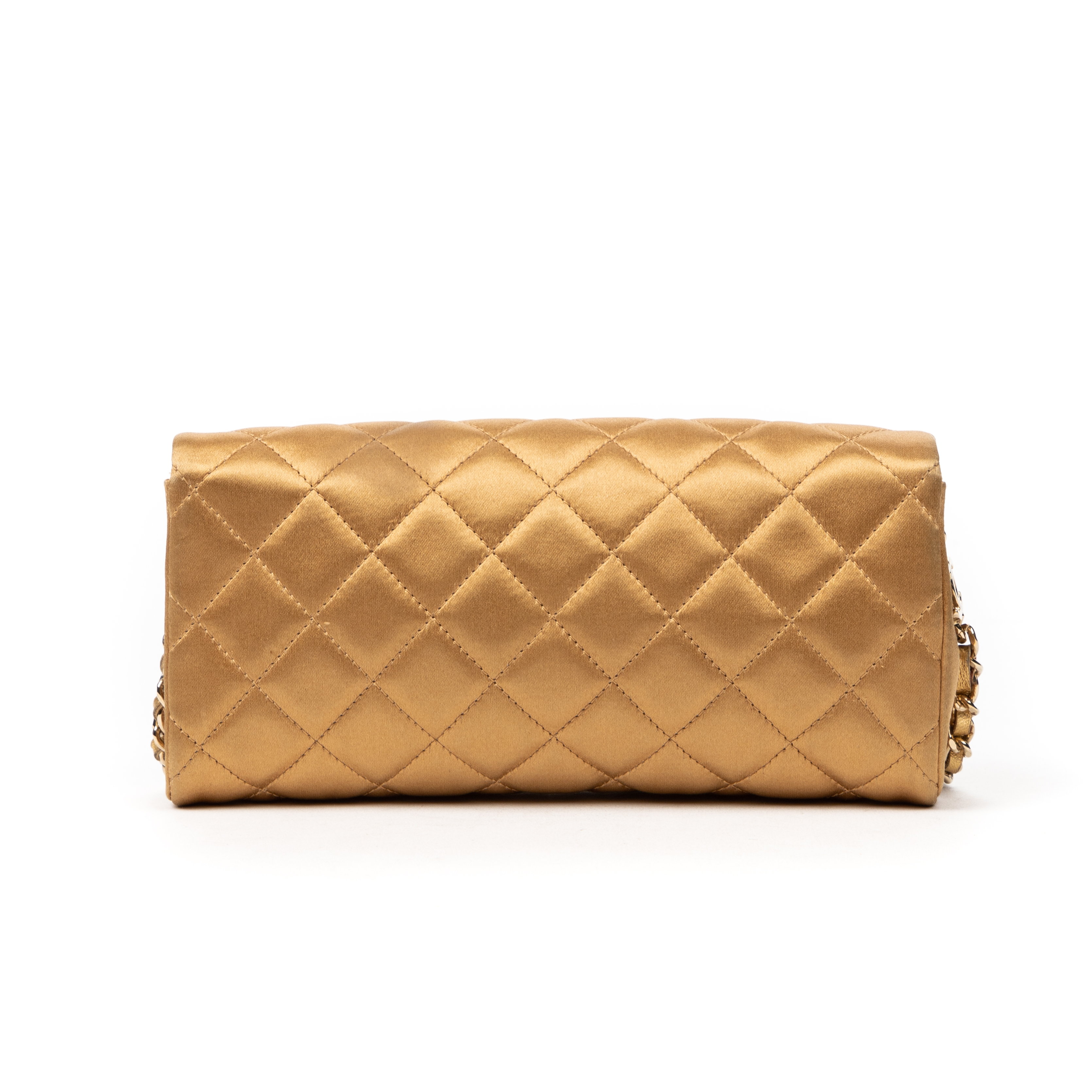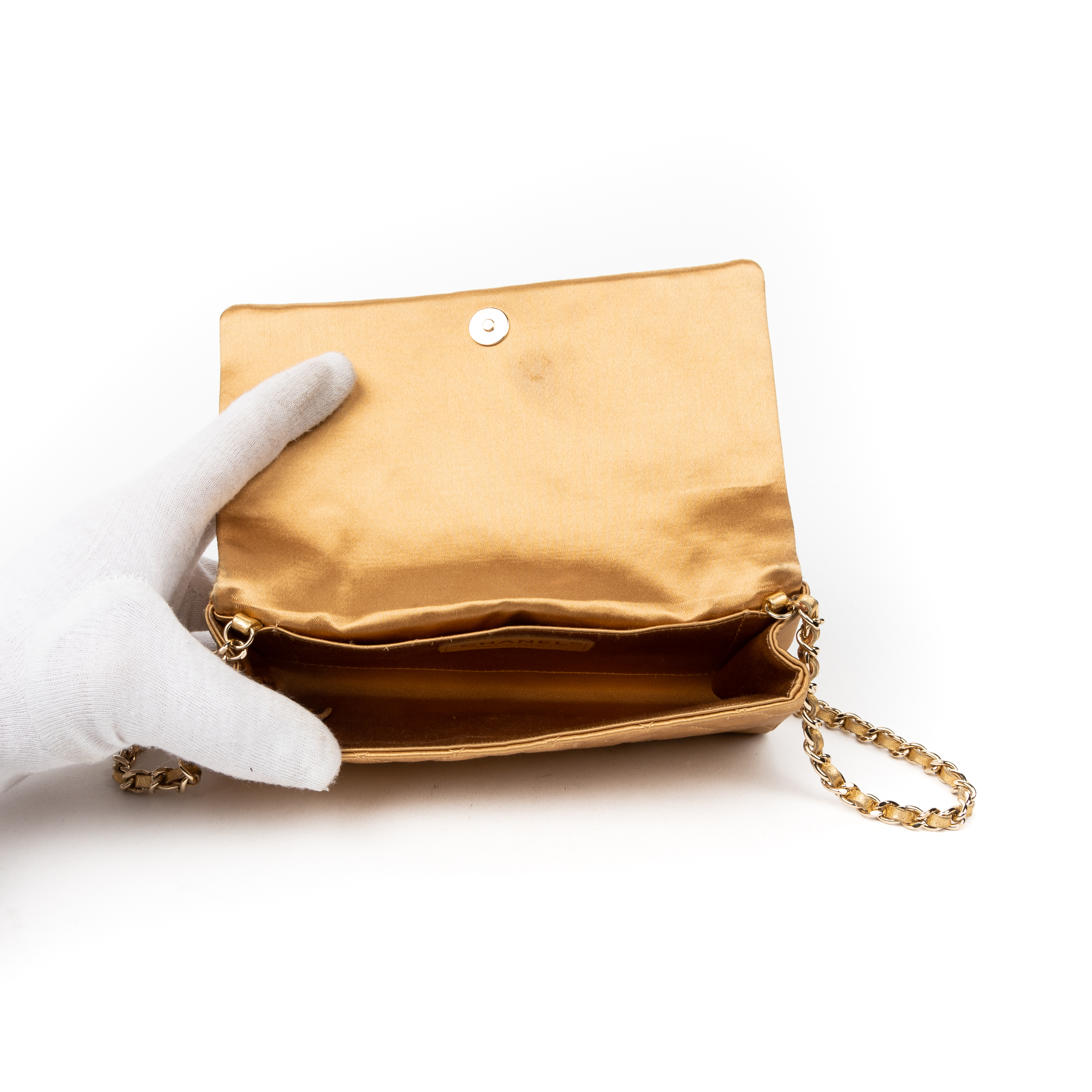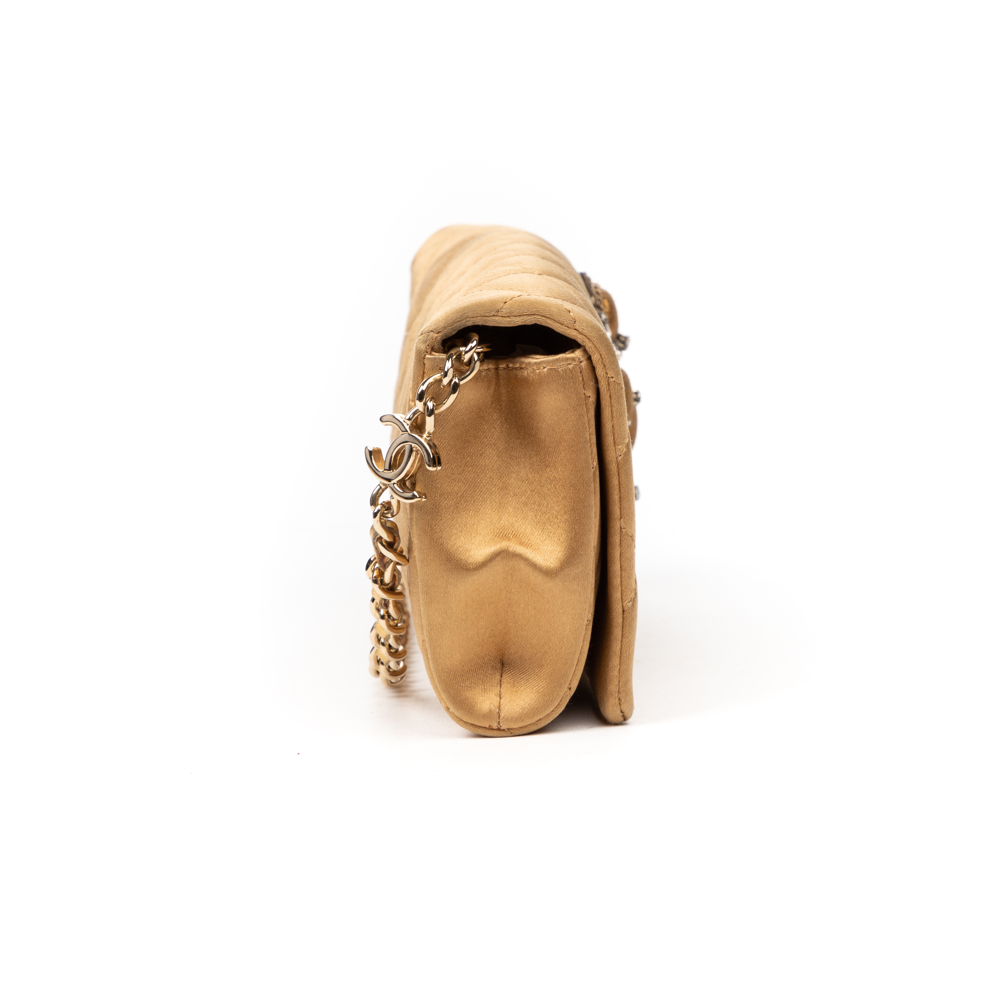 Chanel Handbag Camellia Wallet on Chain in Beige Satin Canvas and Gold hardware. The product is in Excellent Condition (A).